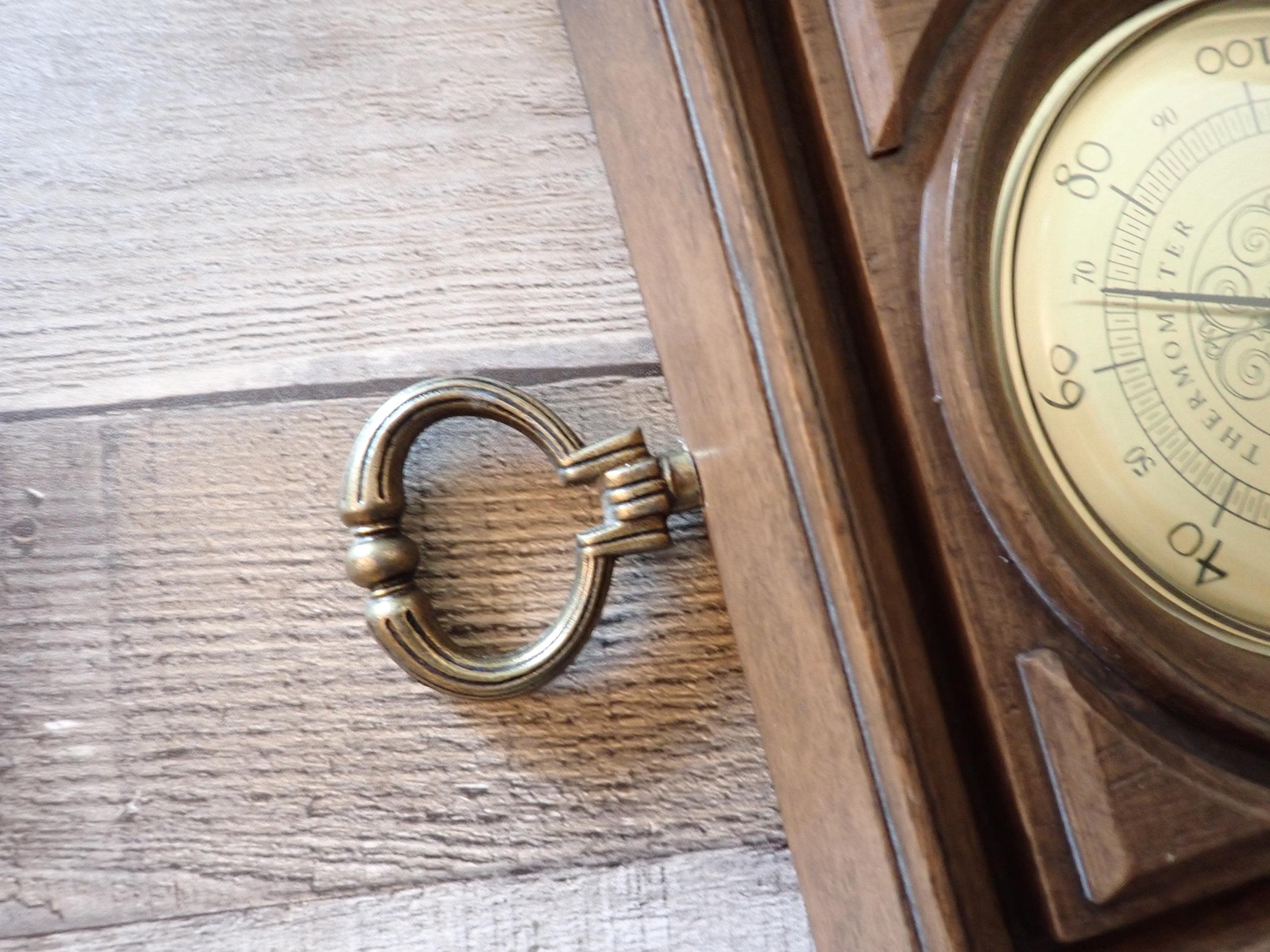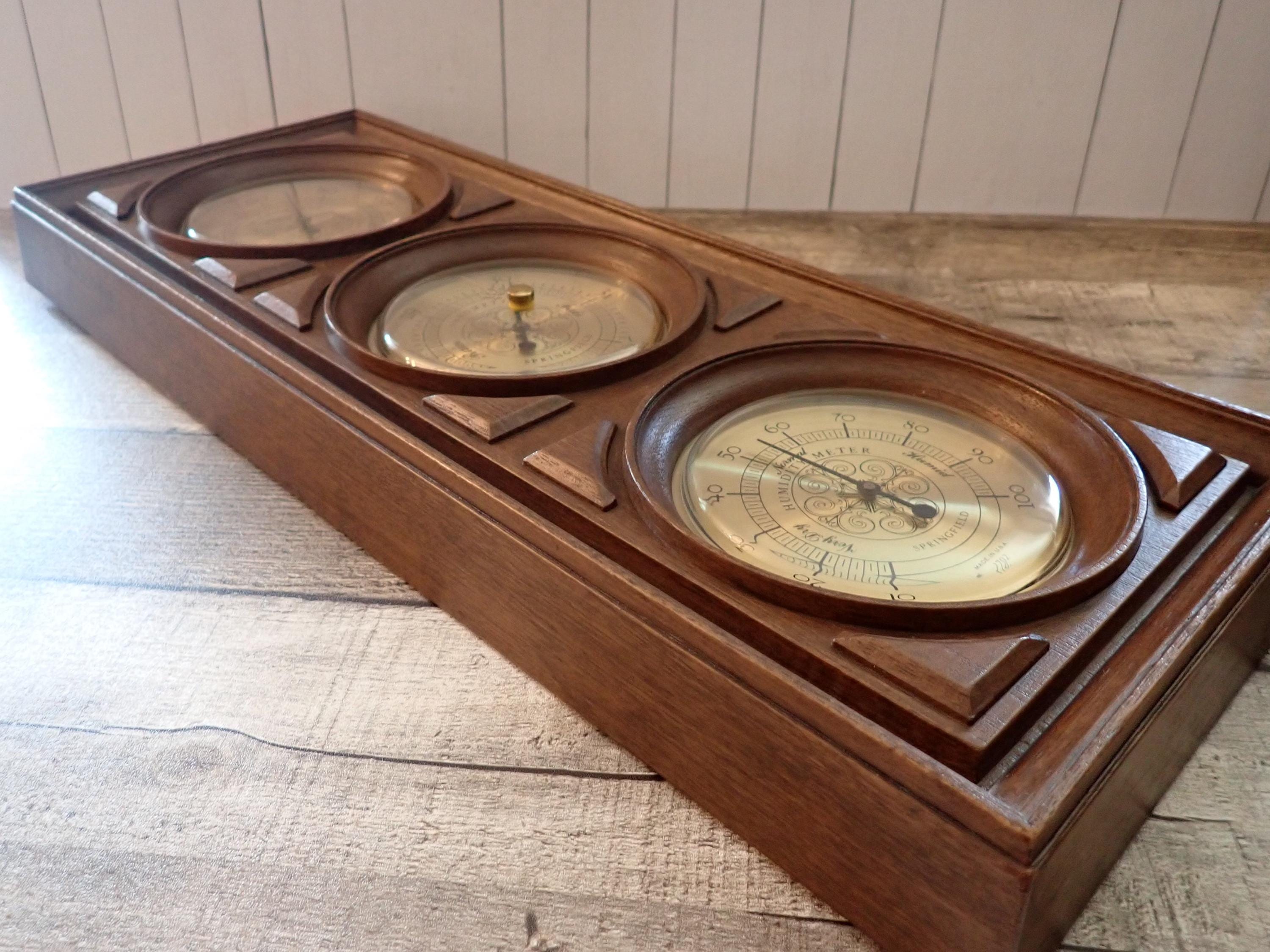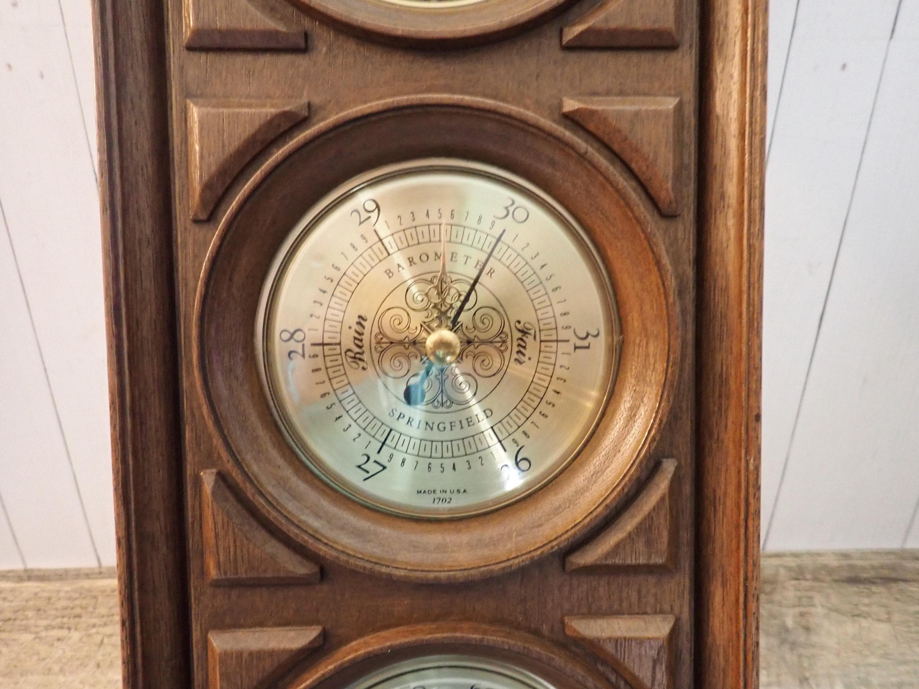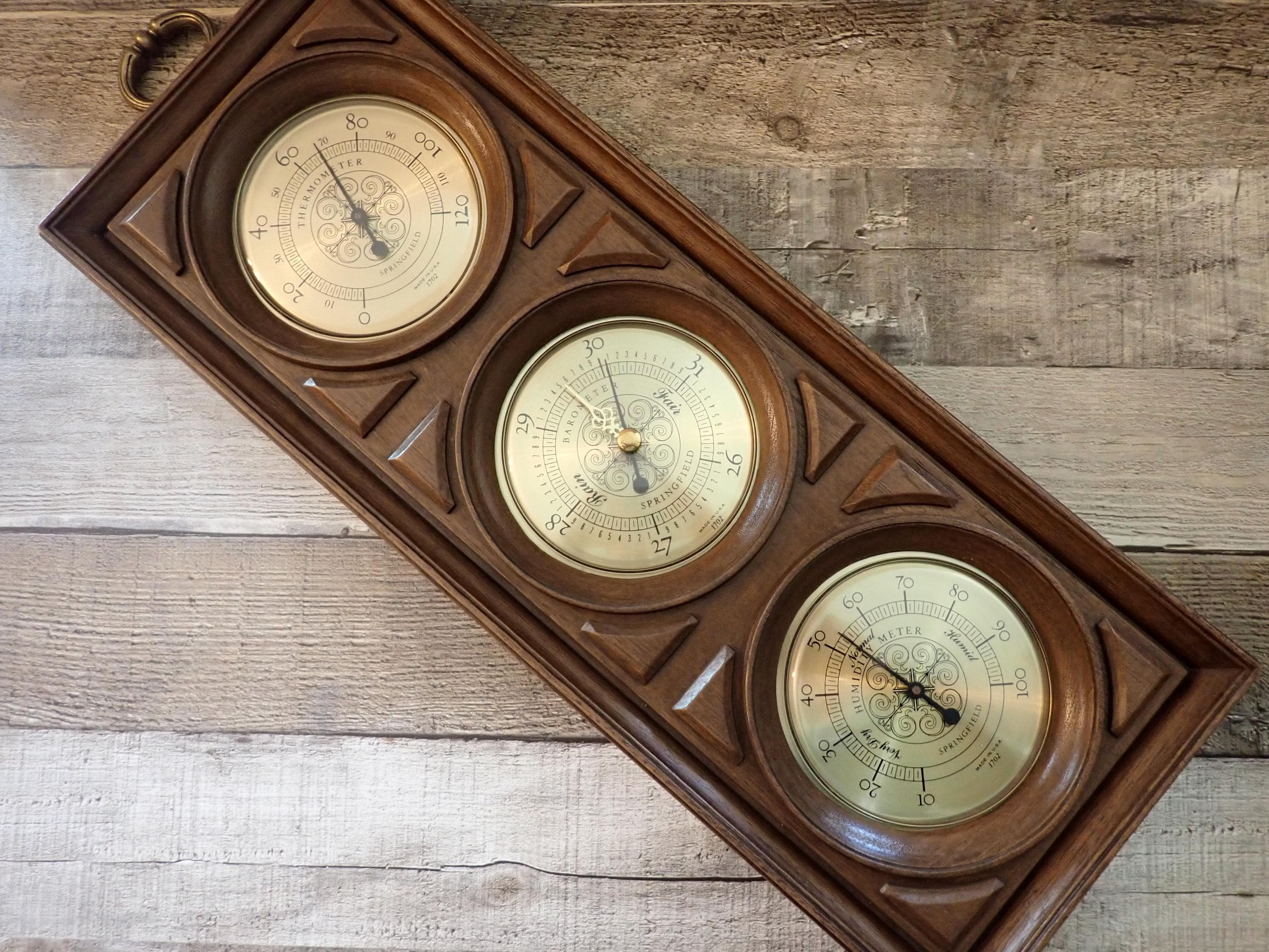 This wall hanging weather station is a plastic piece that looks like carved wood. It is 18" long and 7" wide. There are 3 gold-colored gauges on the piece - a thermometer, a barometer, and a humidity gauge. The gauges all appear to be in working order and measuring correctly. The weather station is in very nice condition with no damage.