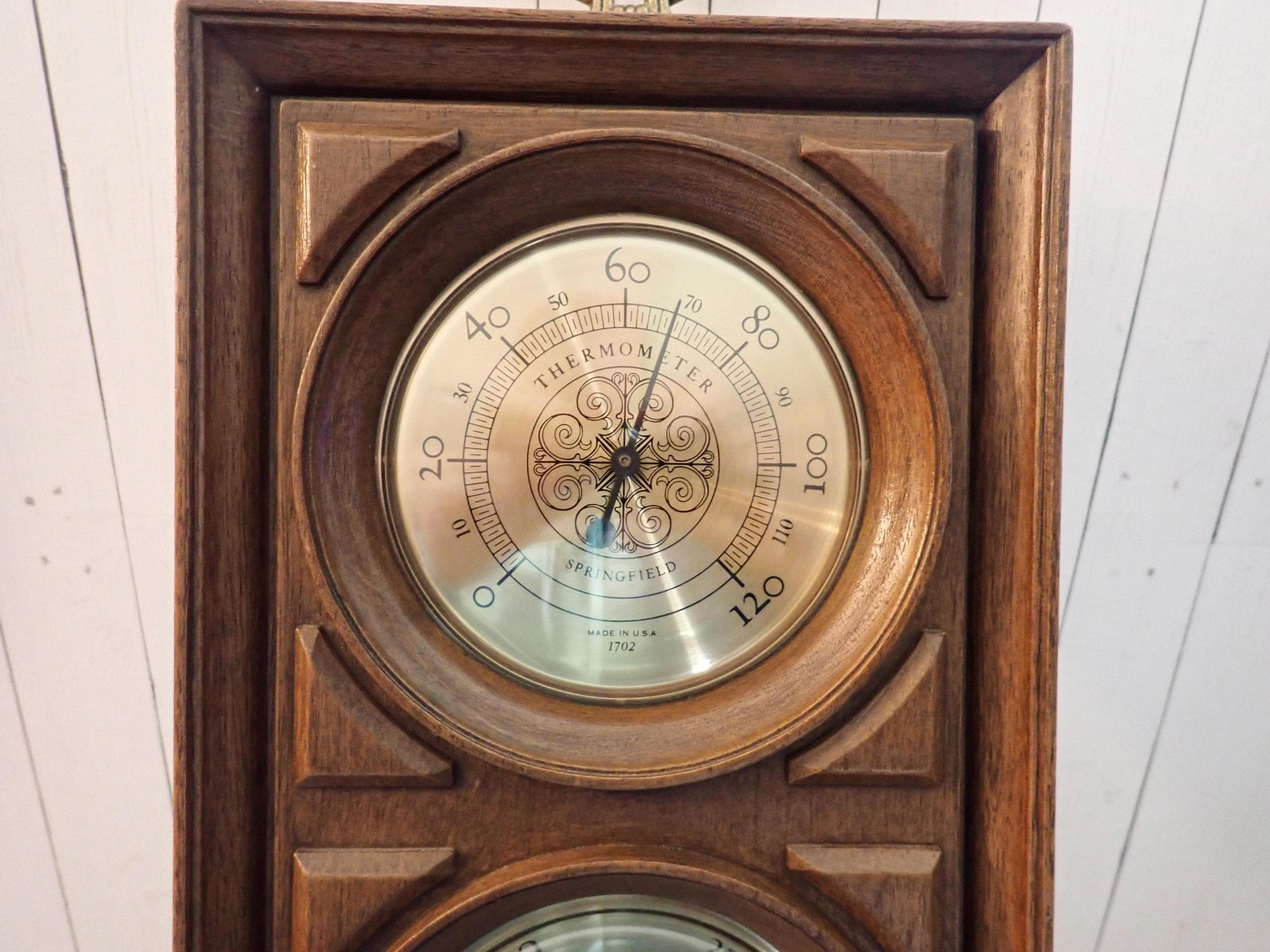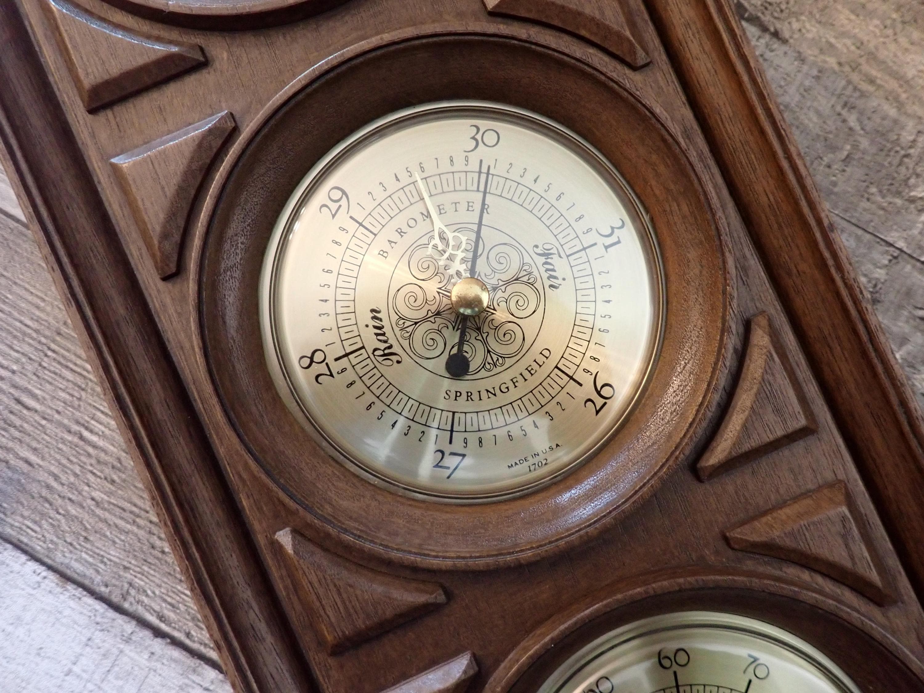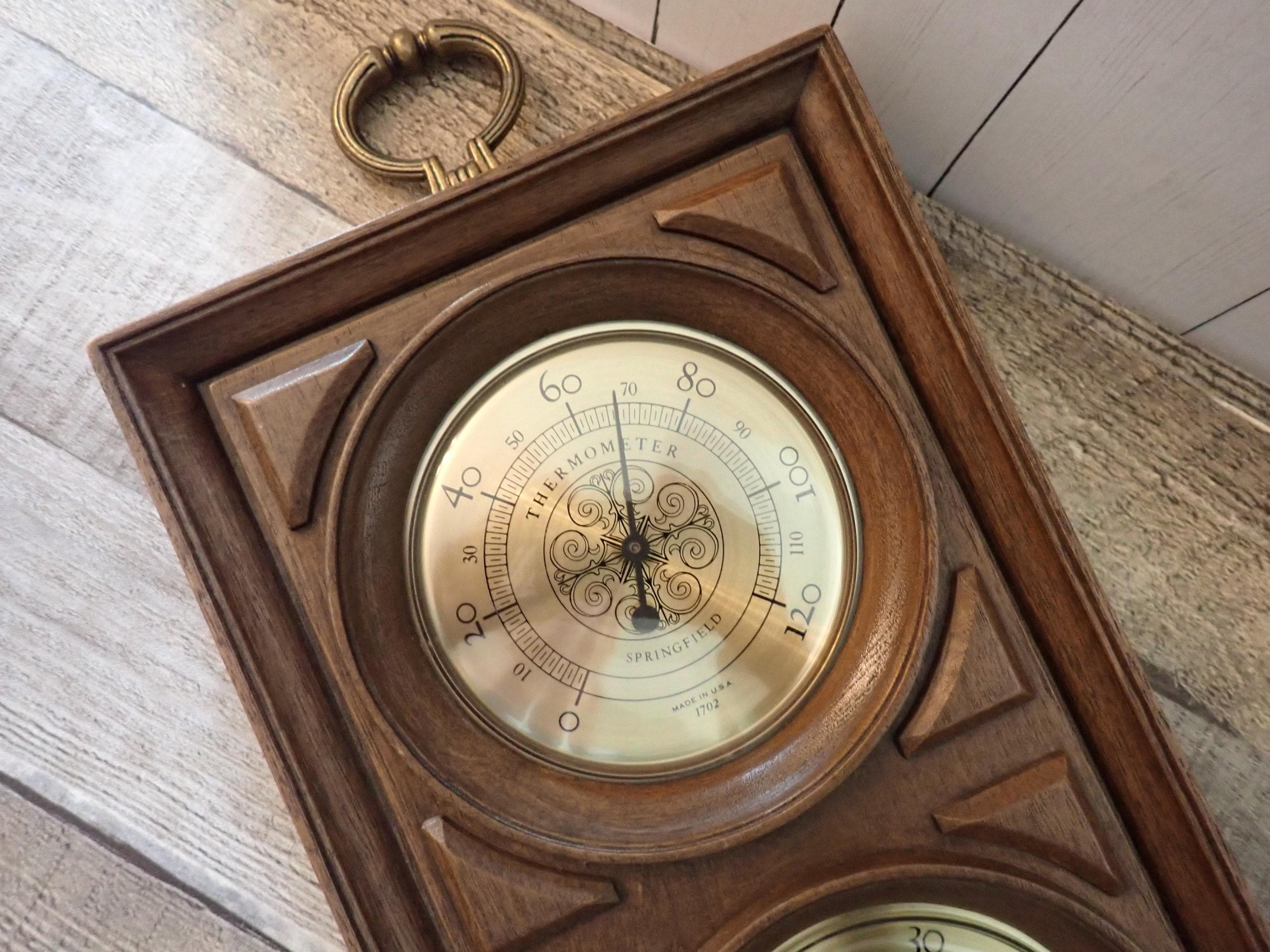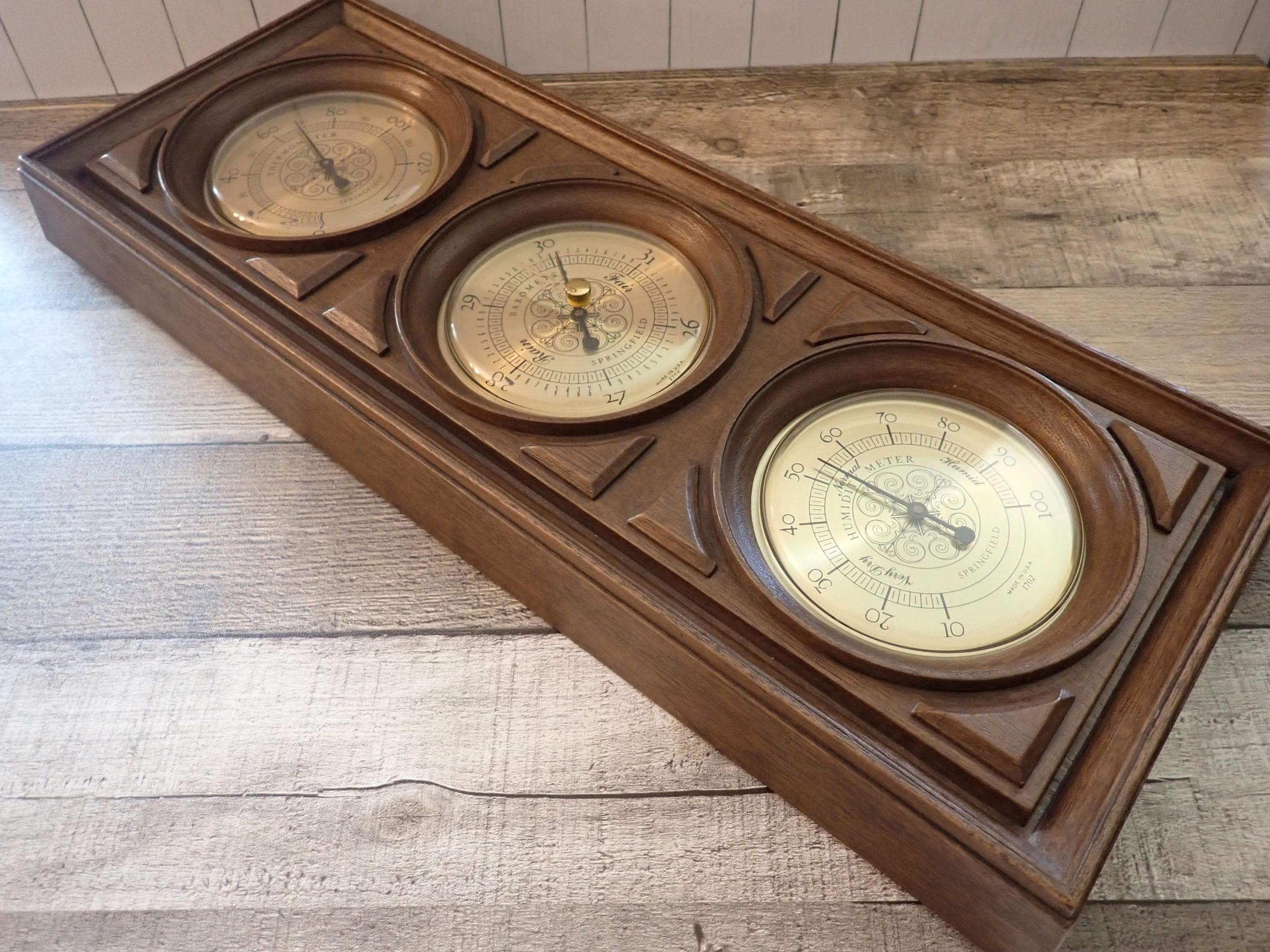 This wall hanging weather station is a plastic piece that looks like carved wood. It is 18" long and 7" wide. There are 3 gold-colored gauges on the piece - a thermometer, a barometer, and a humidity gauge. The gauges all appear to be in working order and measuring correctly. The weather station is in very nice condition with no damage.