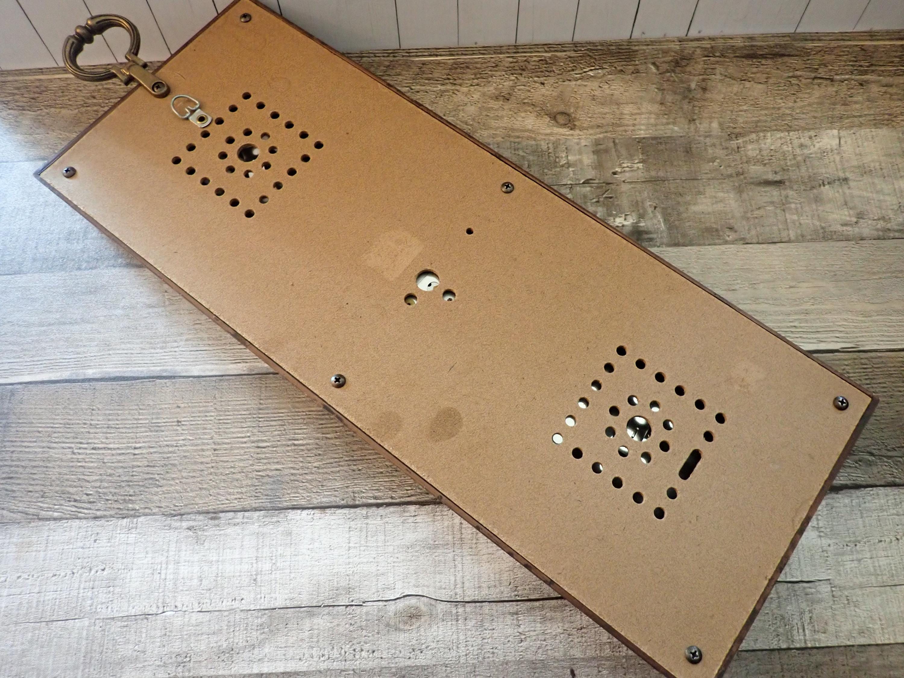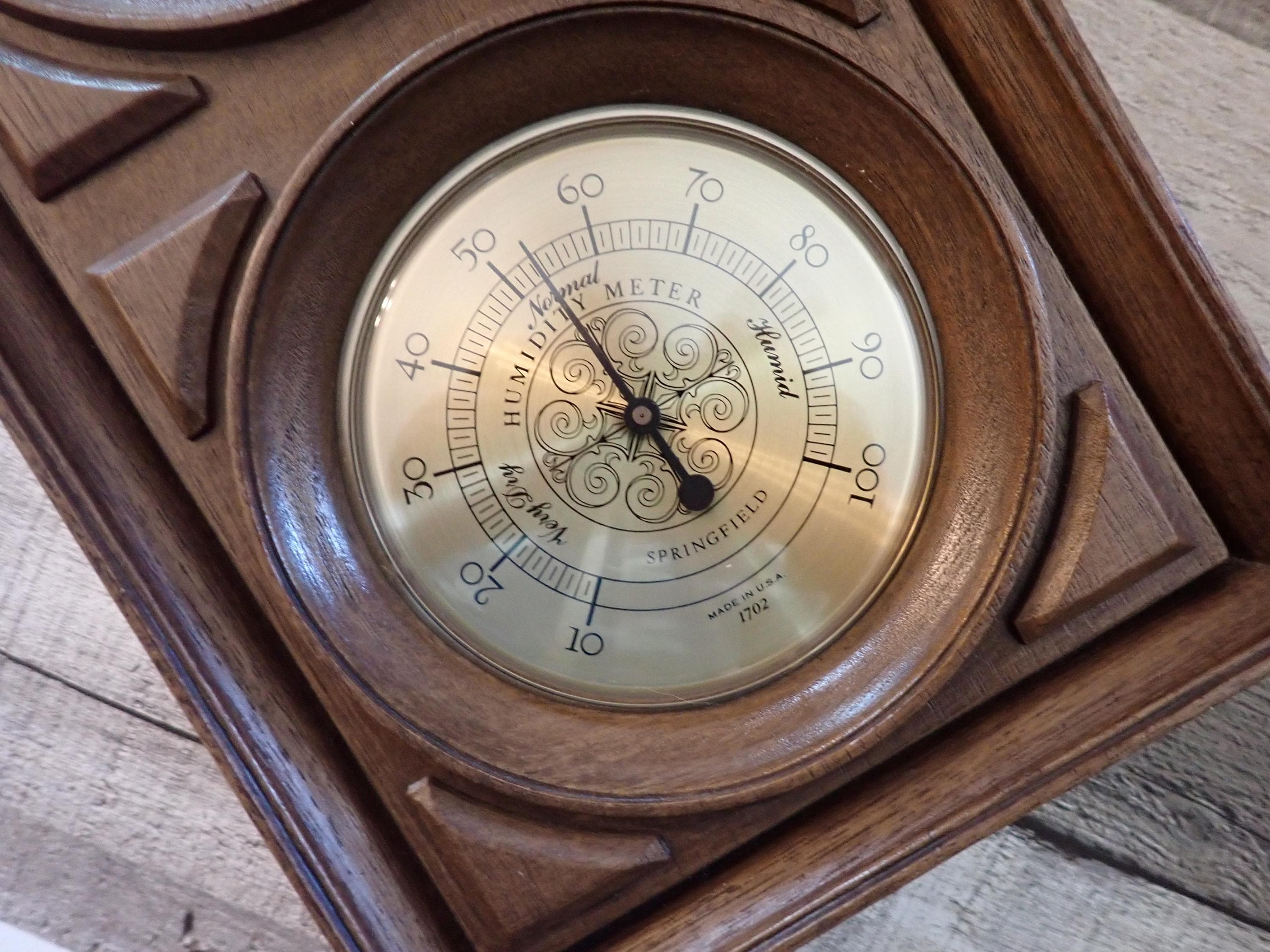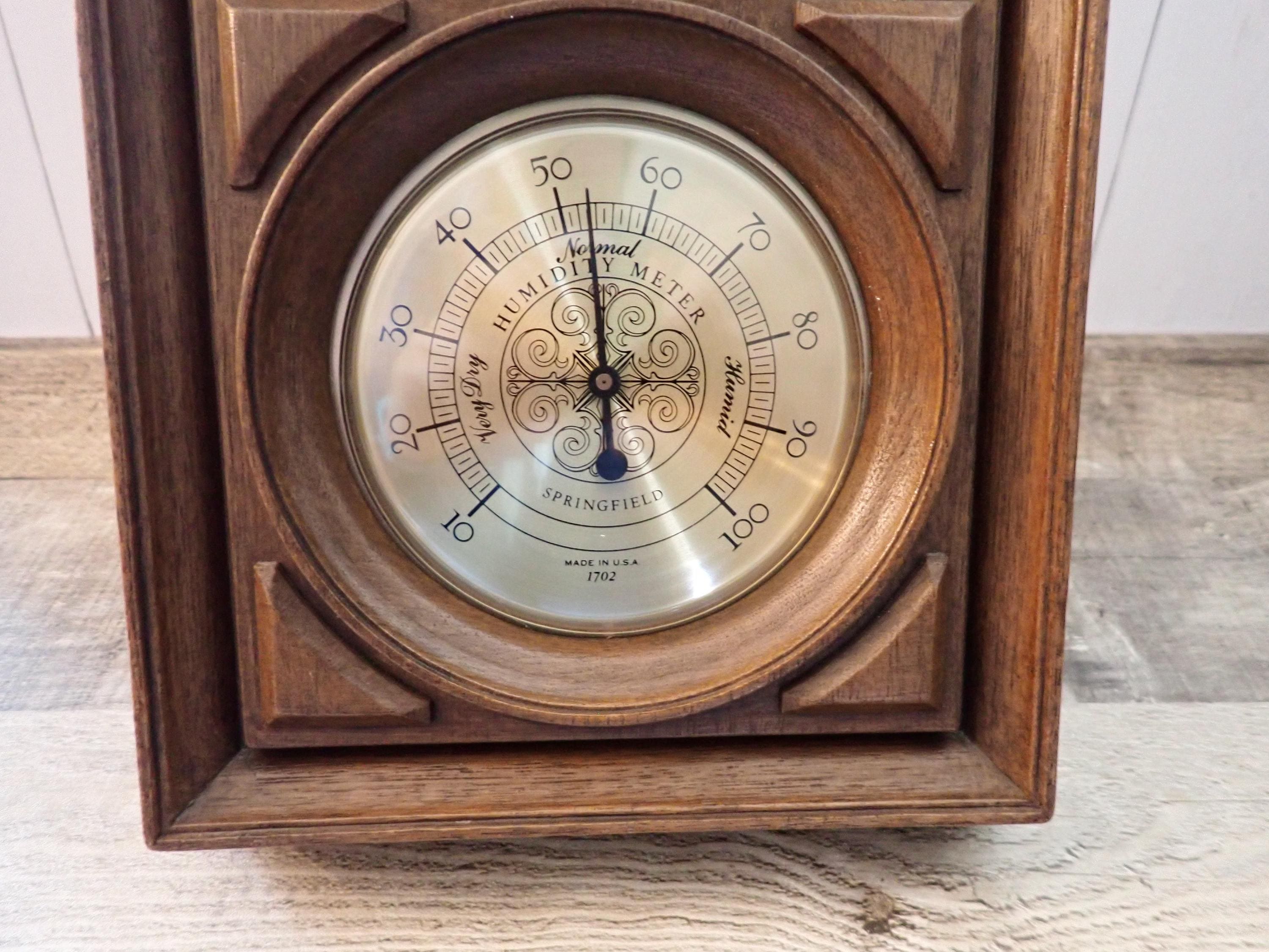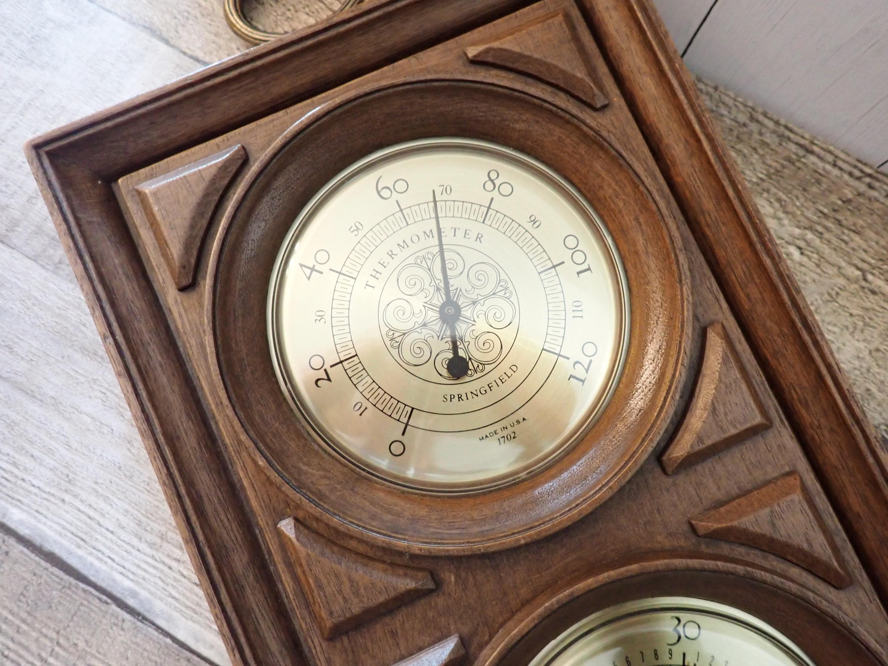 This wall hanging weather station is a plastic piece that looks like carved wood. It is 18" long and 7" wide. There are 3 gold-colored gauges on the piece - a thermometer, a barometer, and a humidity gauge. The gauges all appear to be in working order and measuring correctly. The weather station is in very nice condition with no damage.
