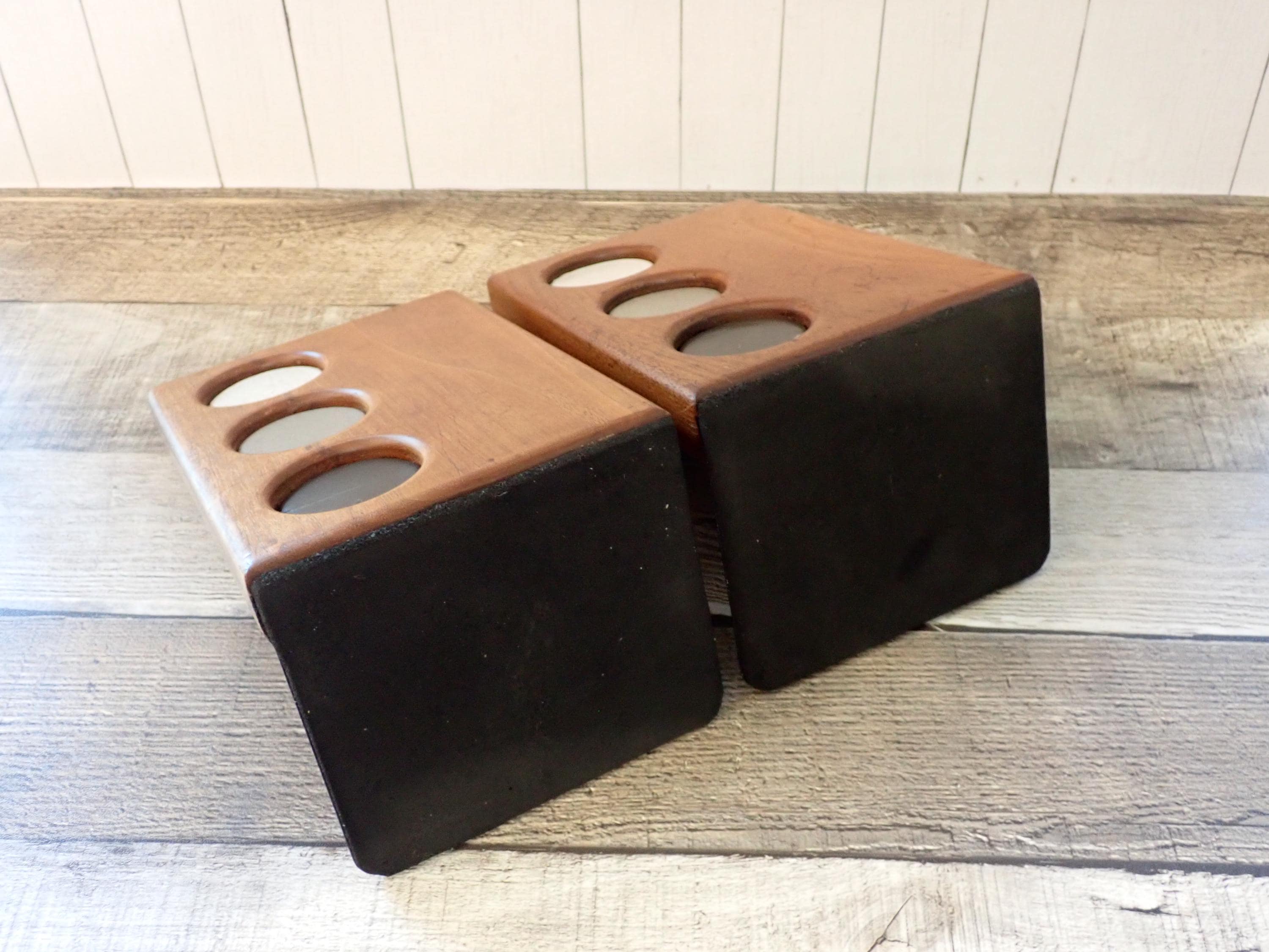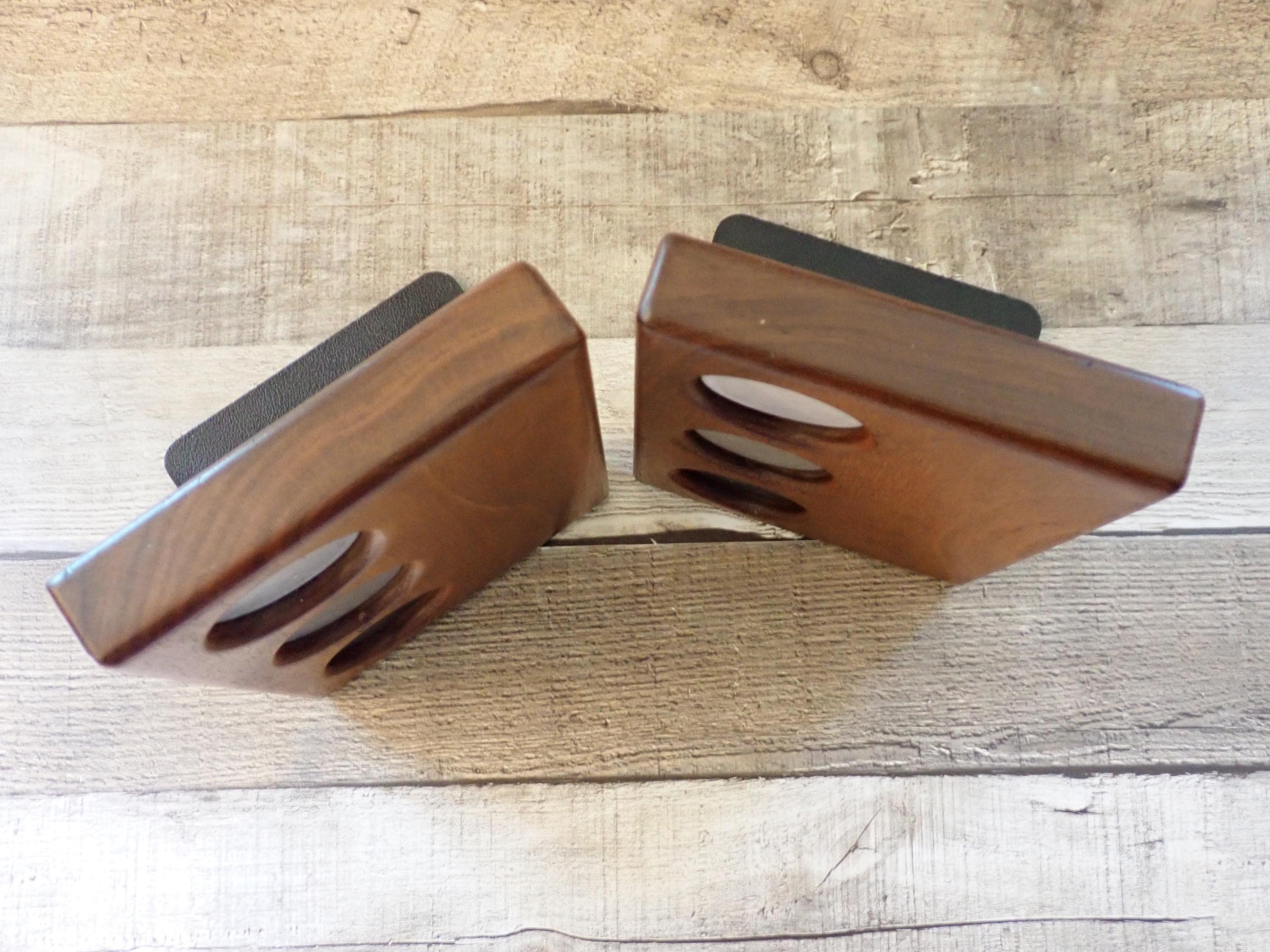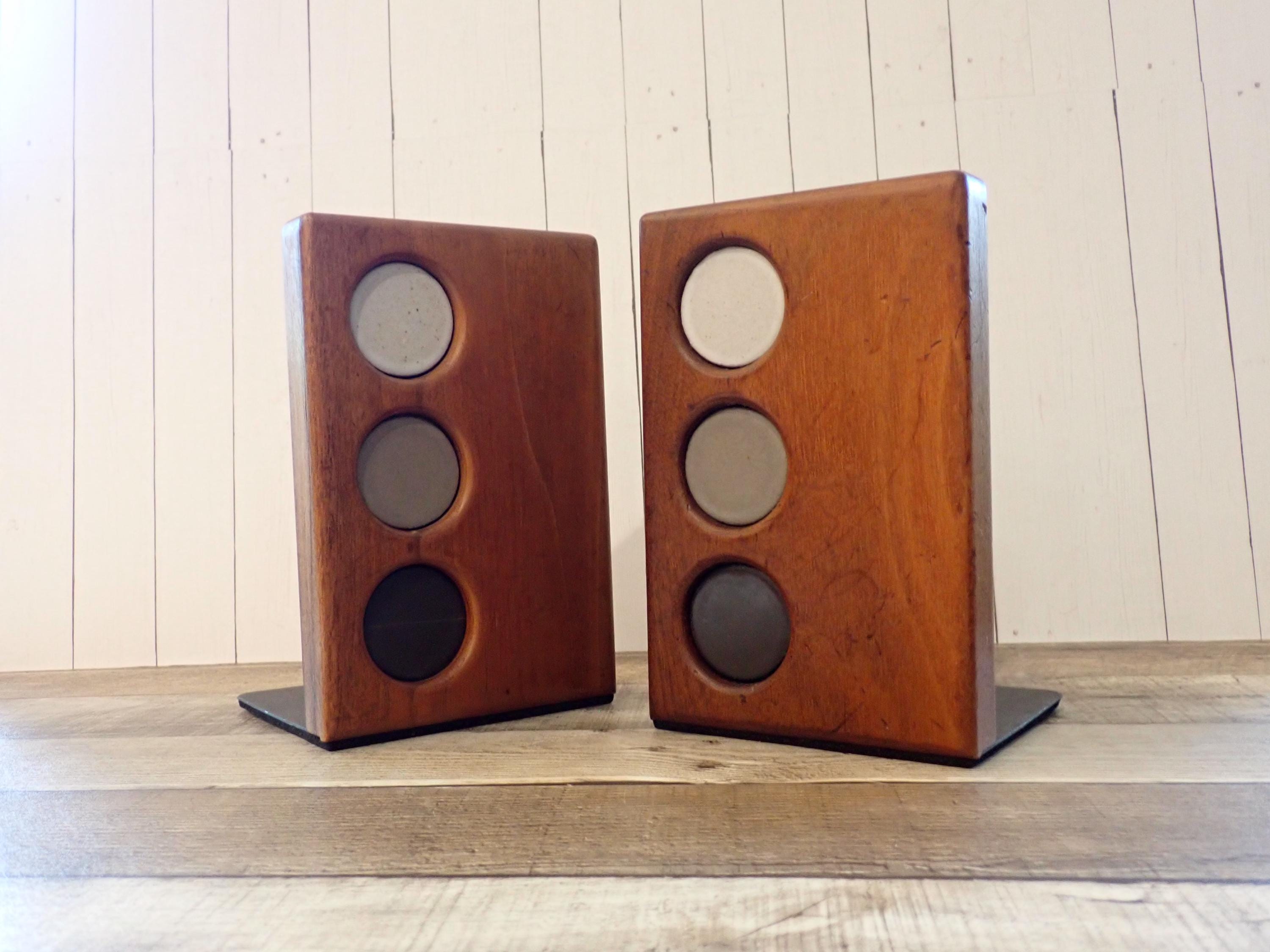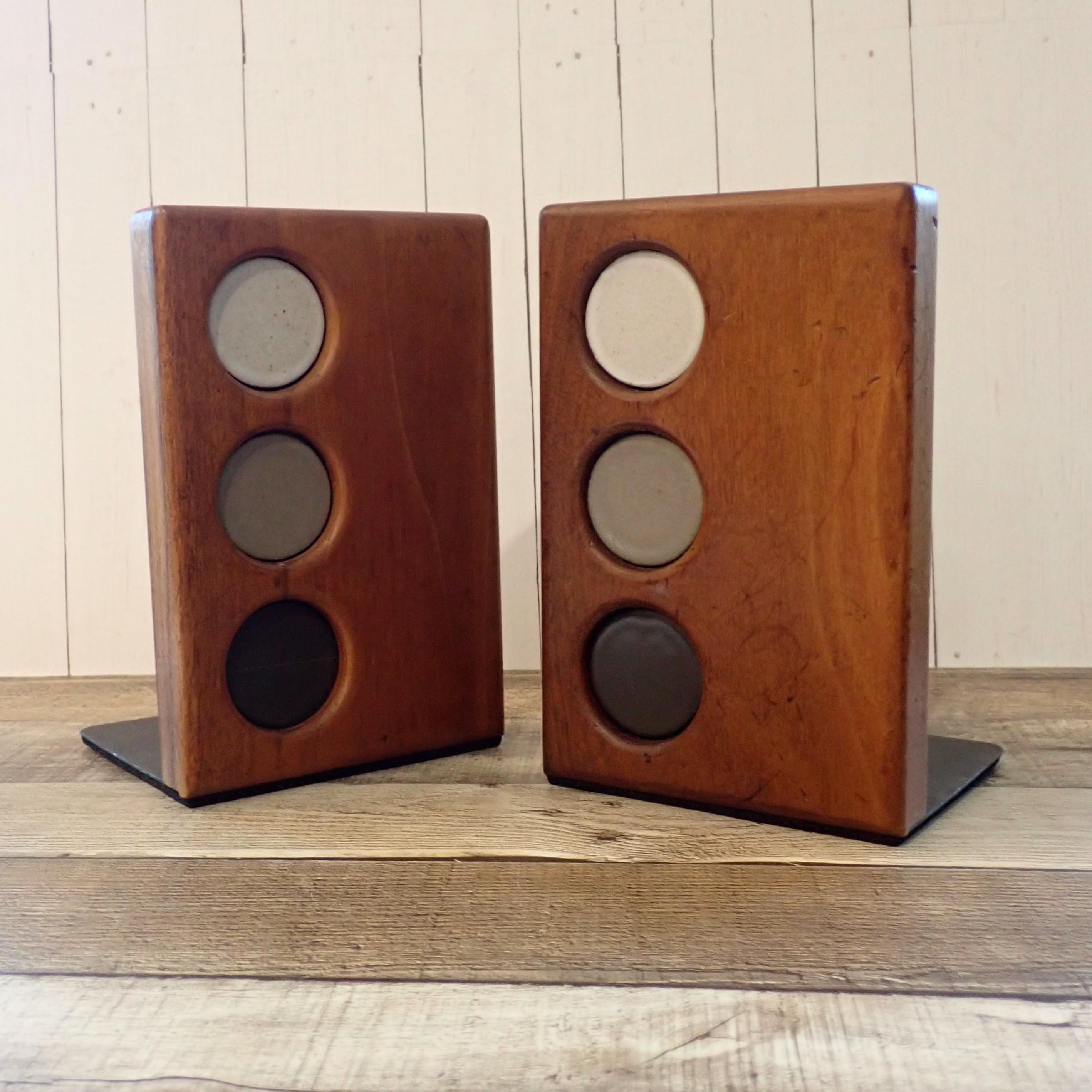 This pair of walnut and ceramic bookends were designed by Jane and Gordon Martz for Marshall Studios of Indiana. They are made of a 1" thick x 5" wide x 7.5" high piece of solid walnut with a row of 3 round ceramic tiles in complimentary gray colors. The overall dimensions are 5" wide x 7.5" high x 4.5" deep base plate. The bookends are in nice condition, however one of them does have a crack in one of the round ceramic tiles - this is shown in detail in the last 2 photos. The wood is in nice condition but does have some light scratches here and there. The foam bottoms are intact for protection.