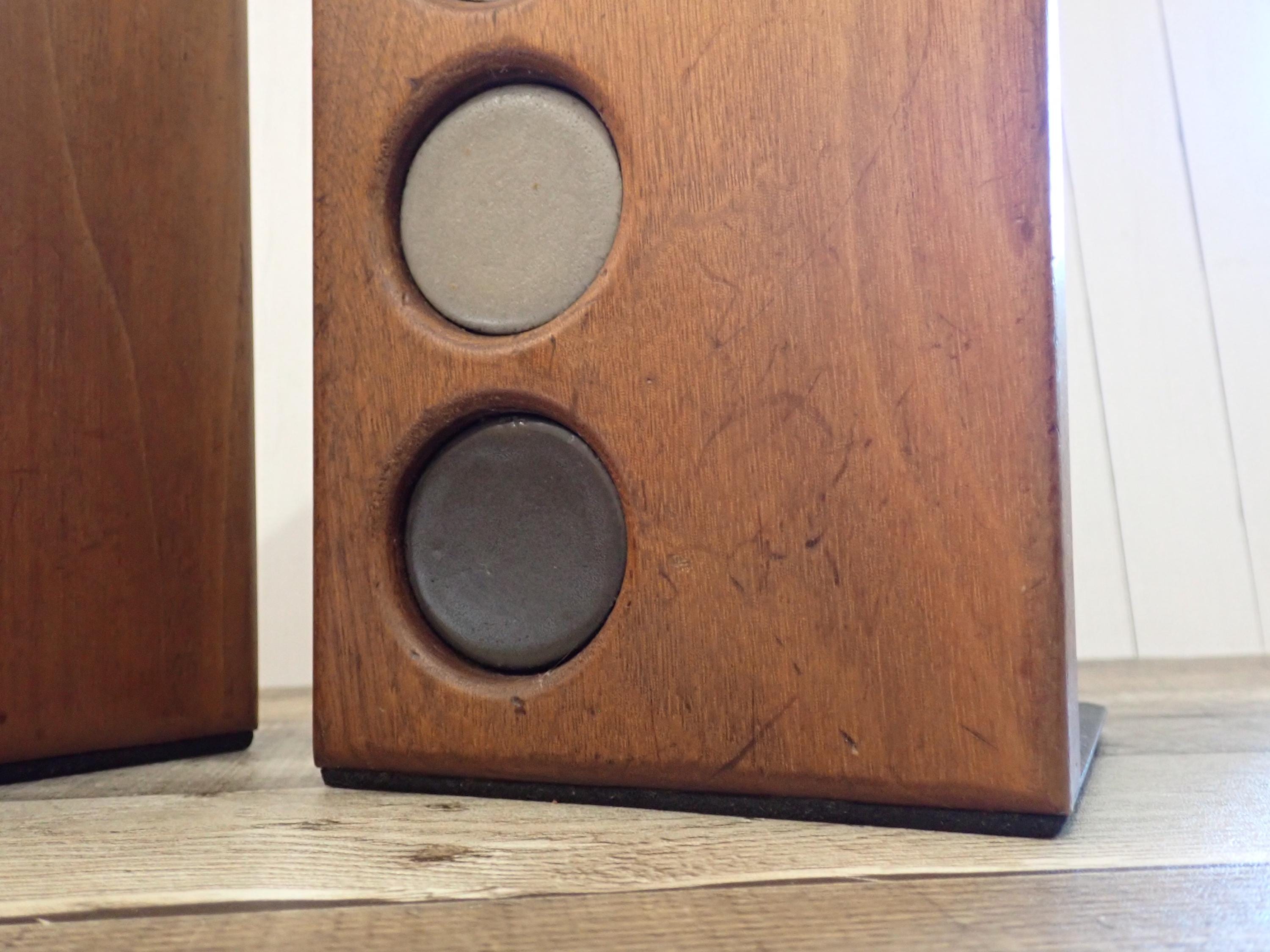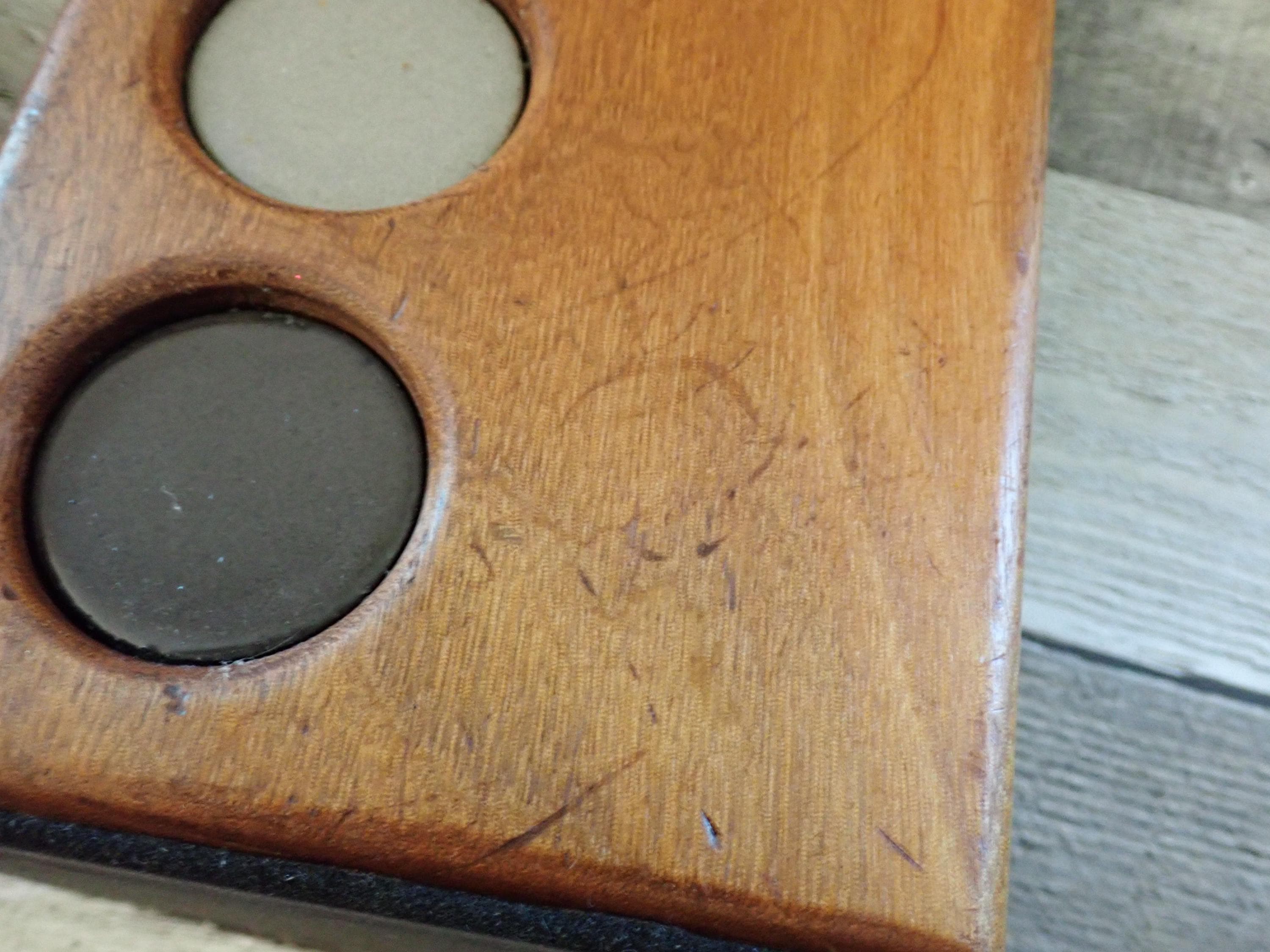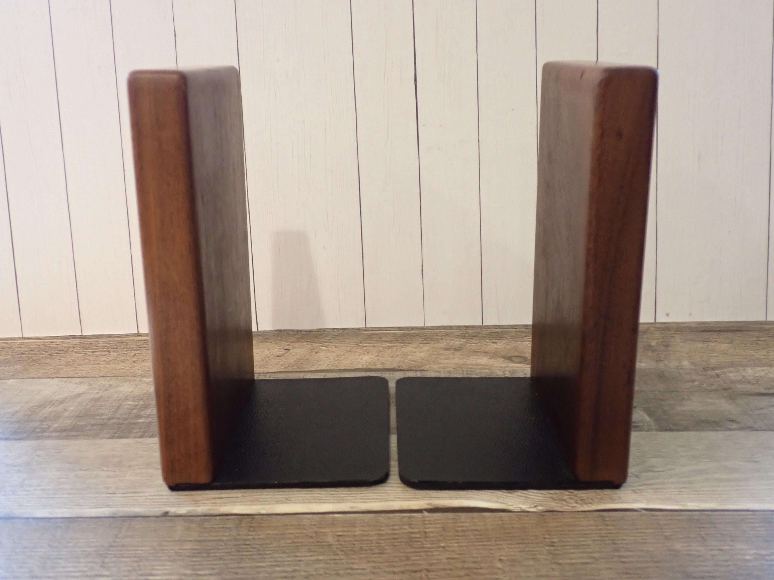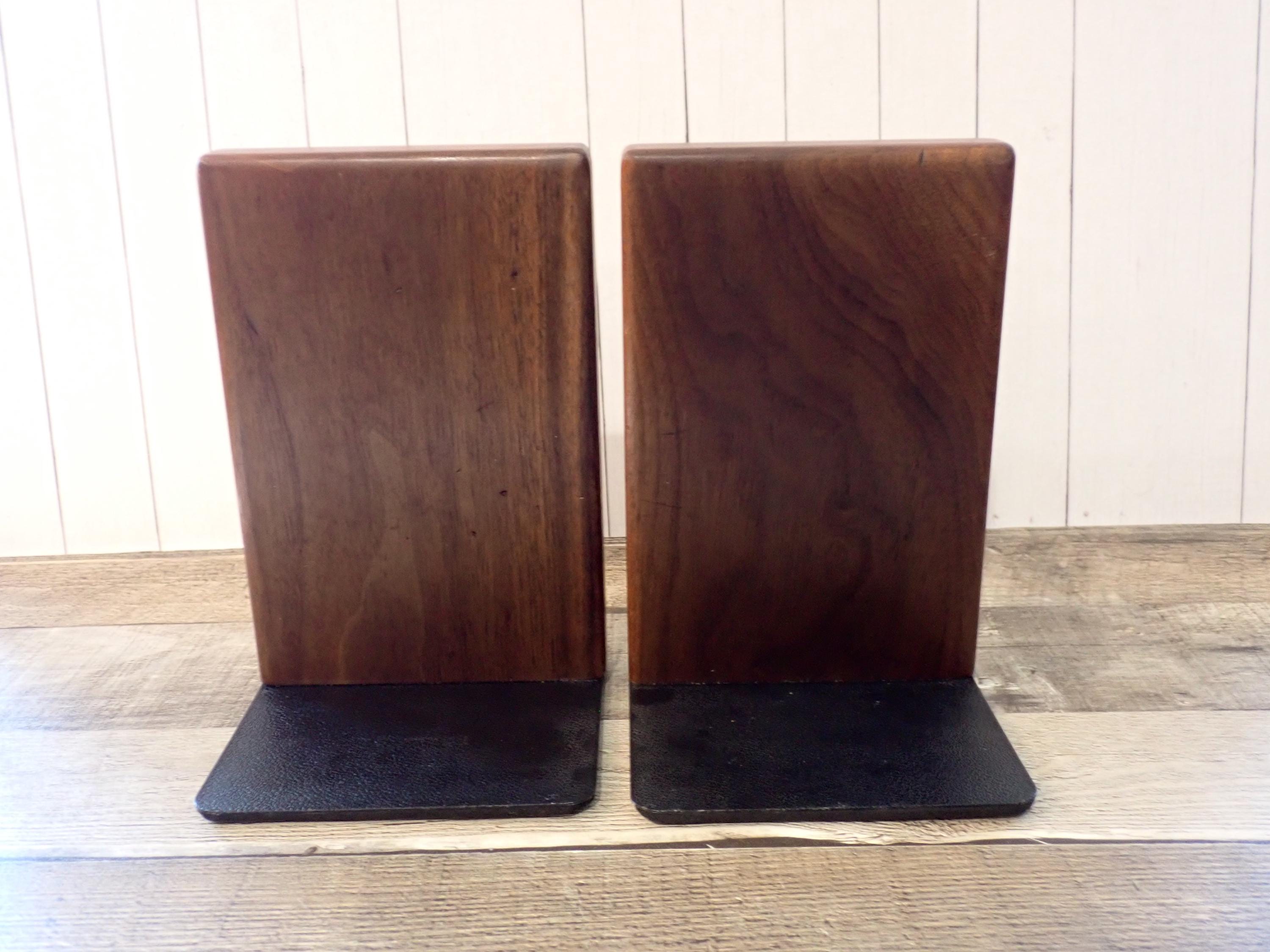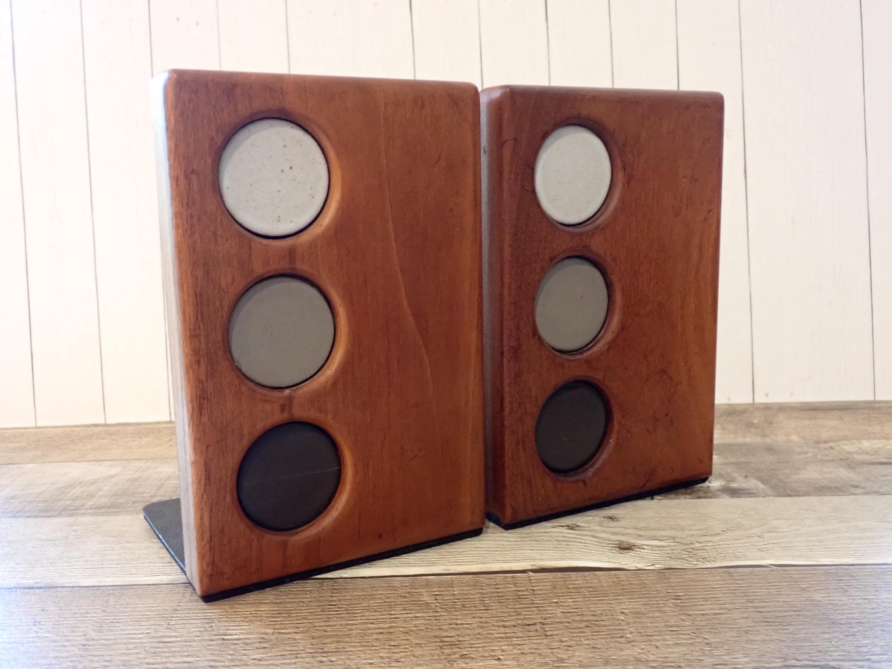 This pair of walnut and ceramic bookends were designed by Jane and Gordon Martz for Marshall Studios of Indiana. They are made of a 1" thick x 5" wide x 7.5" high piece of solid walnut with a row of 3 round ceramic tiles in complimentary gray colors. The overall dimensions are 5" wide x 7.5" high x 4.5" deep base plate. The bookends are in nice condition, however one of them does have a crack in one of the round ceramic tiles - this is shown in detail in the last 2 photos. The wood is in nice condition but does have some light scratches here and there. The foam bottoms are intact for protection.