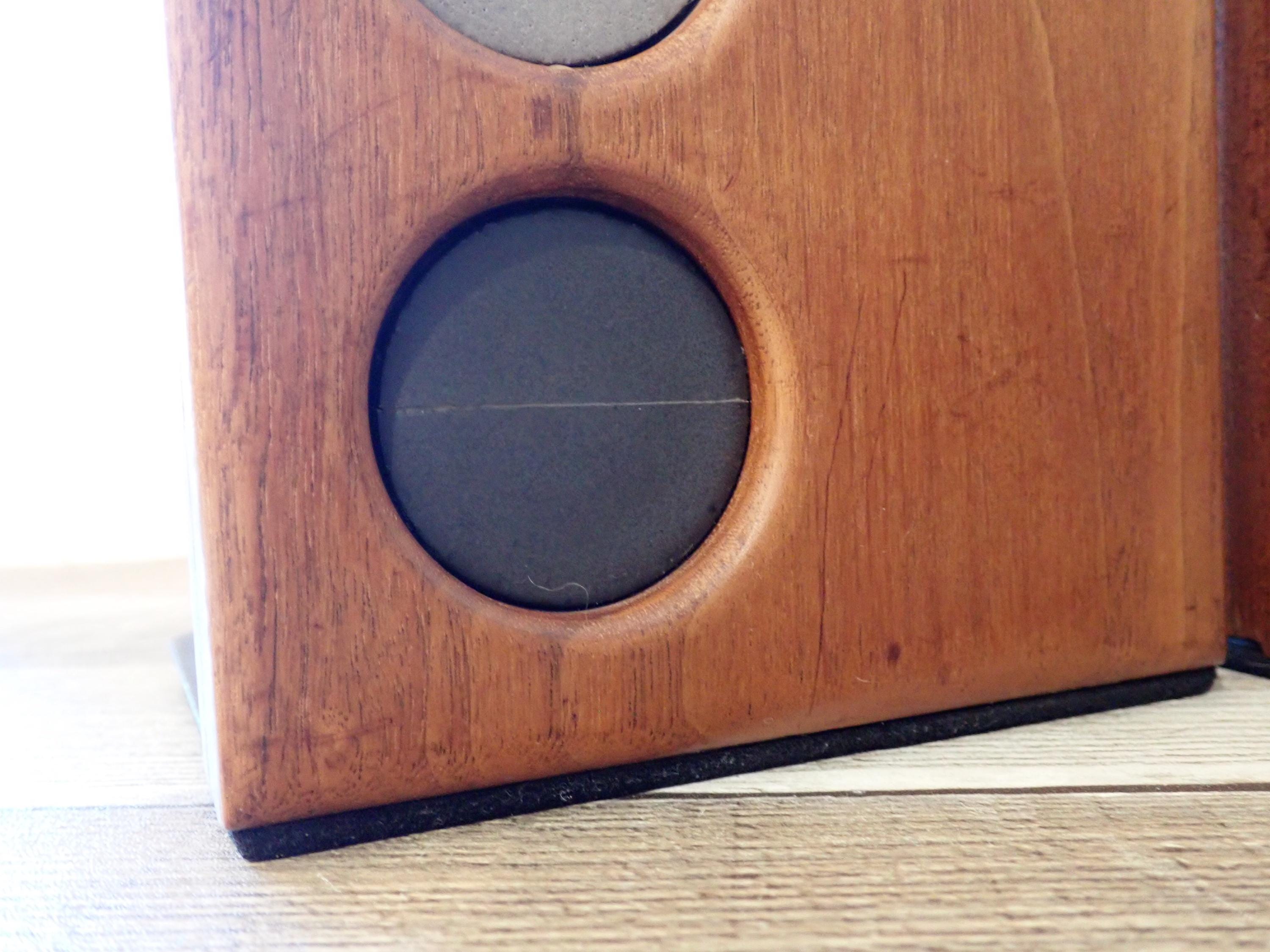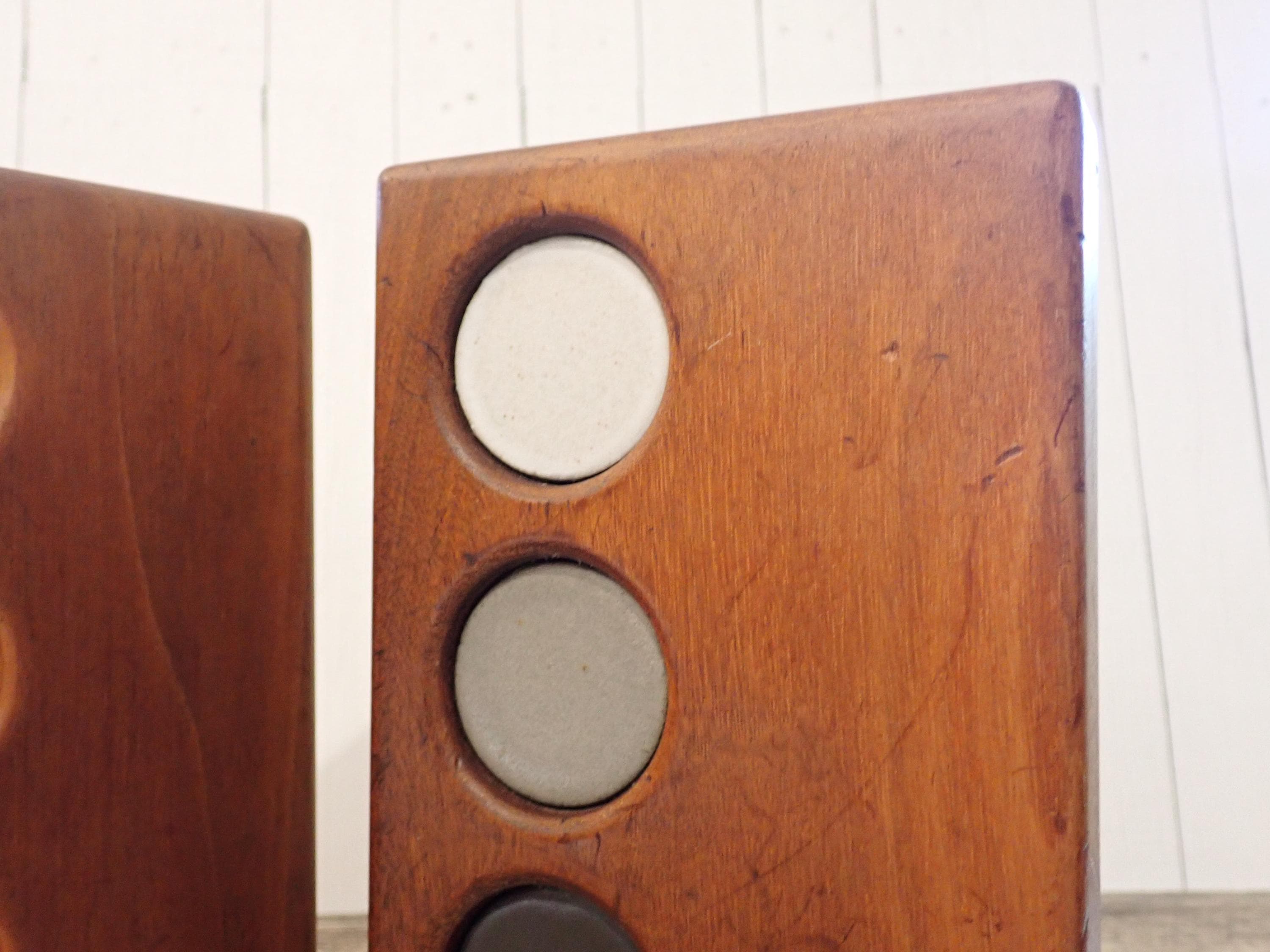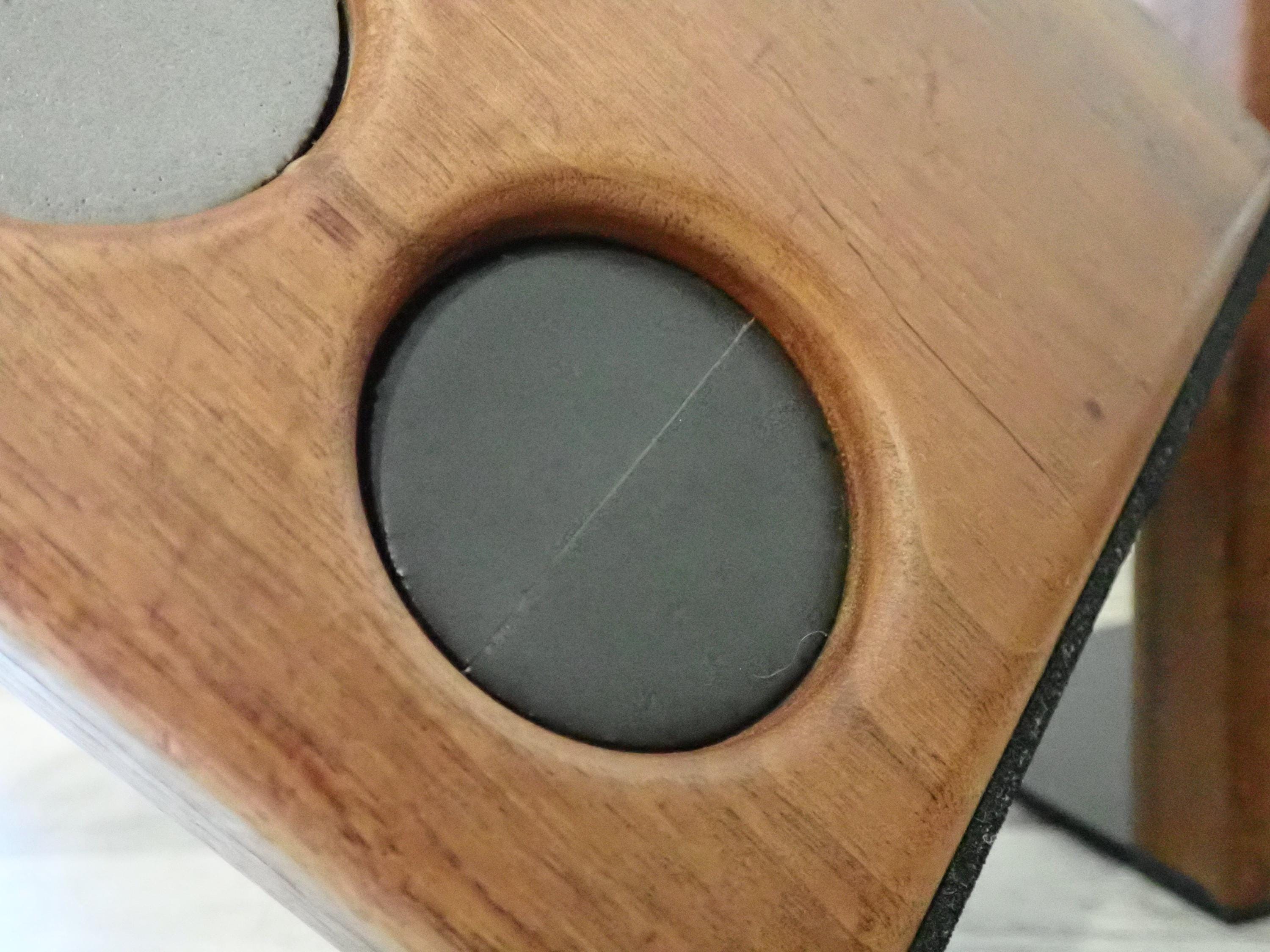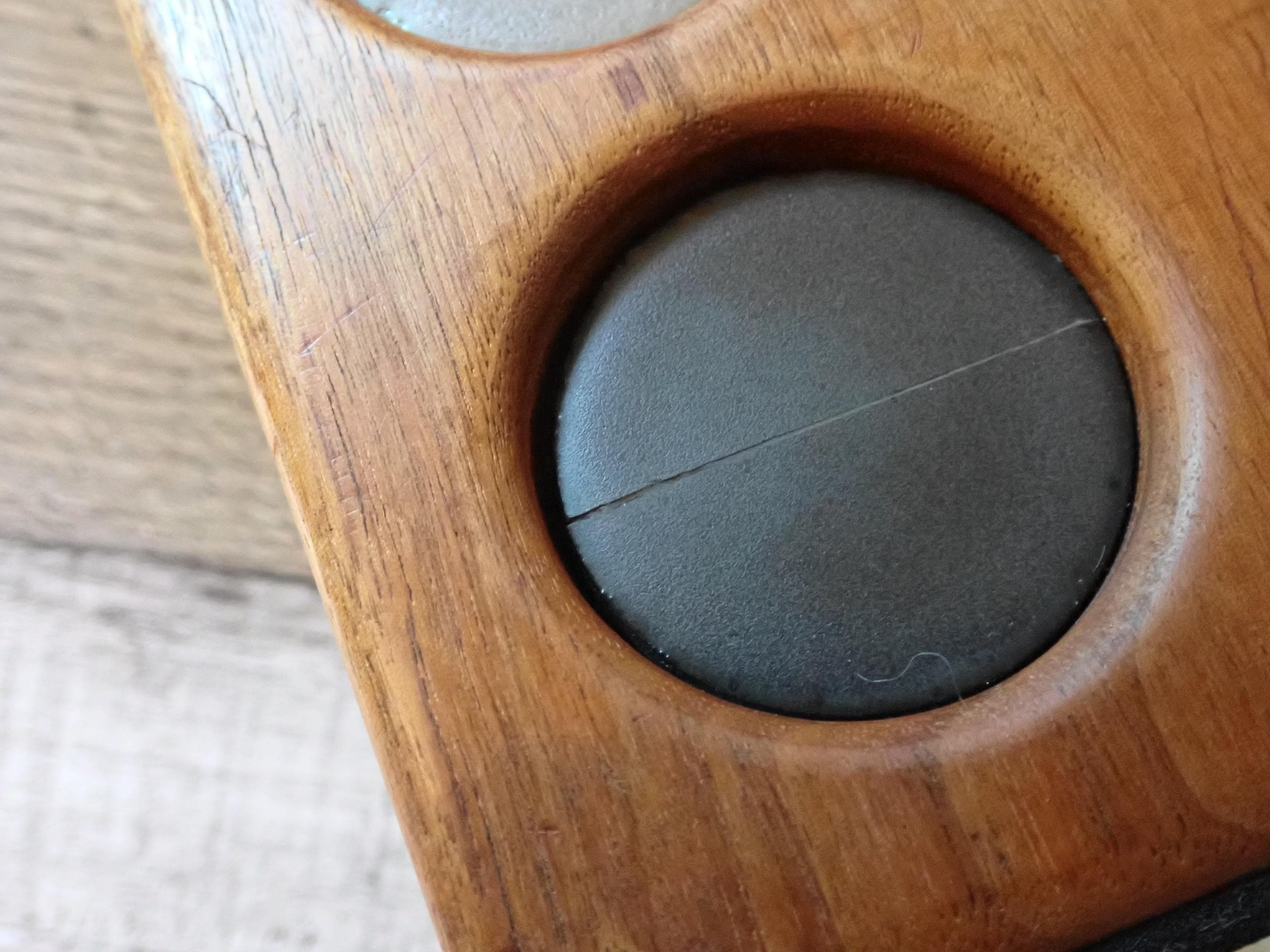 This pair of walnut and ceramic bookends were designed by Jane and Gordon Martz for Marshall Studios of Indiana. They are made of a 1" thick x 5" wide x 7.5" high piece of solid walnut with a row of 3 round ceramic tiles in complimentary gray colors. The overall dimensions are 5" wide x 7.5" high x 4.5" deep base plate. The bookends are in nice condition, however one of them does have a crack in one of the round ceramic tiles - this is shown in detail in the last 2 photos. The wood is in nice condition but does have some light scratches here and there. The foam bottoms are intact for protection.