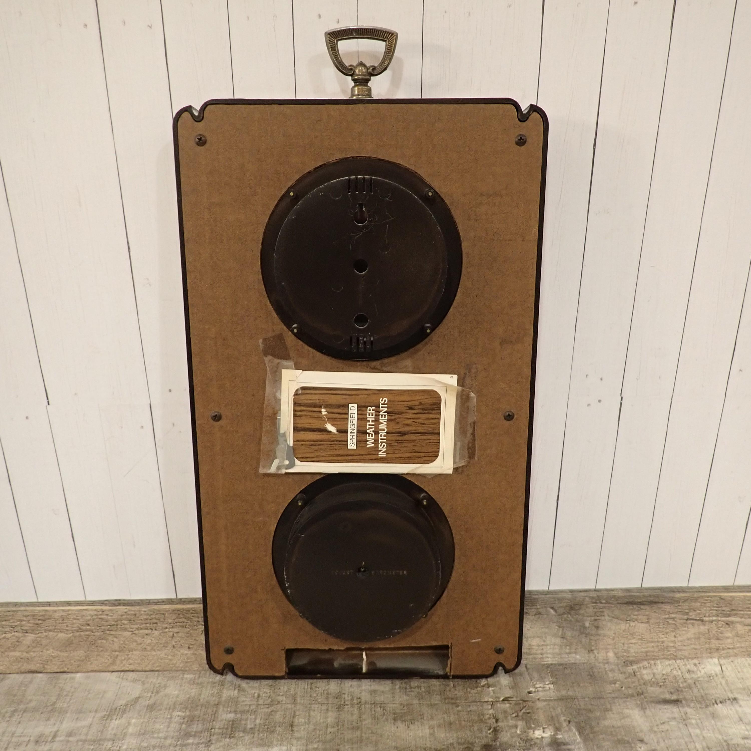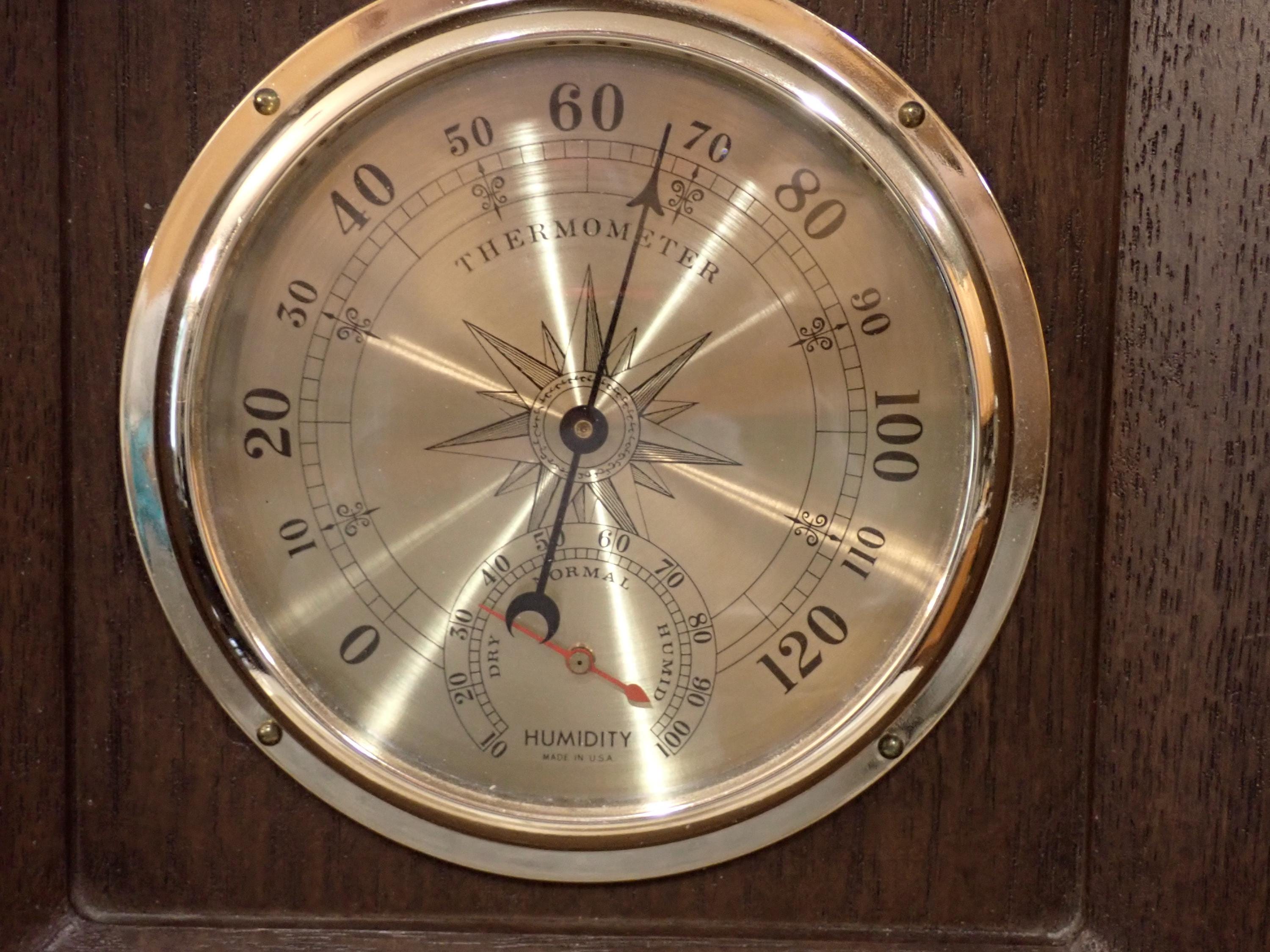 This wall hanging weather station is a plastic piece that looks like carved wood. It is 19" long and 10" wide. There are 2 gold-colored gauges on the piece - a thermometer (with a humidity gauge inset) and a barometer. The gauges all appear to be in working order and measuring correctly. The weather station is in very nice condition with no damage.
