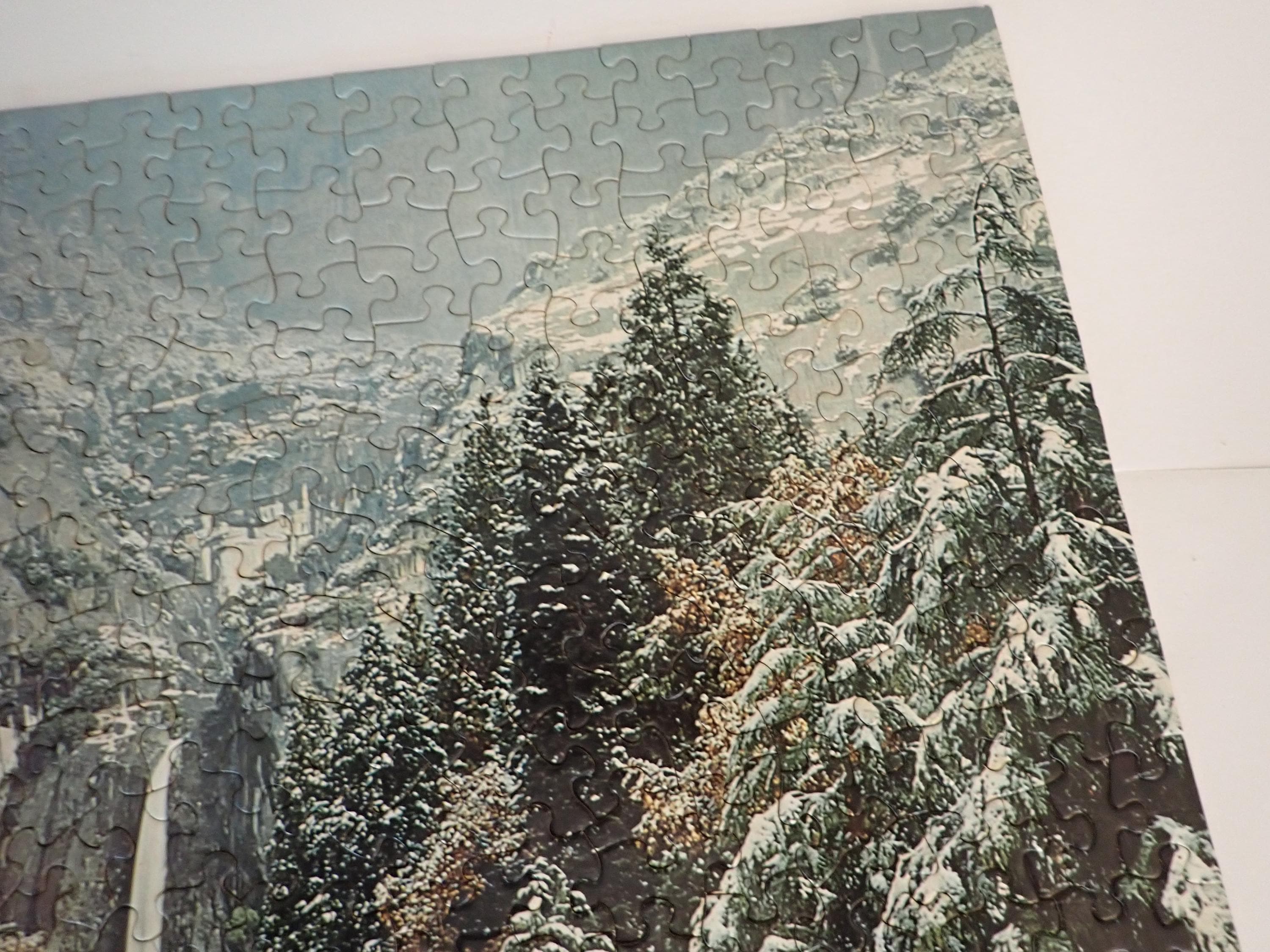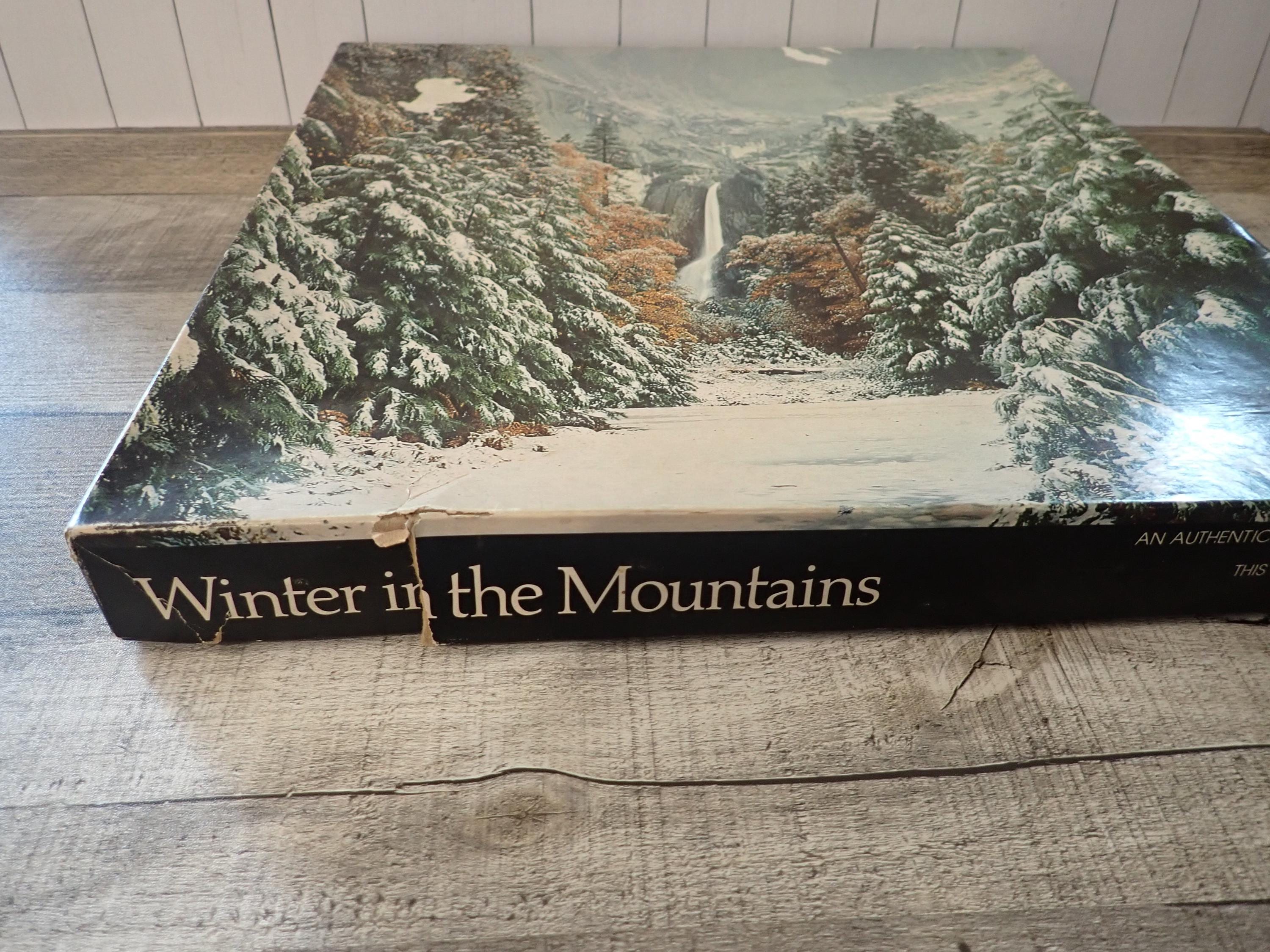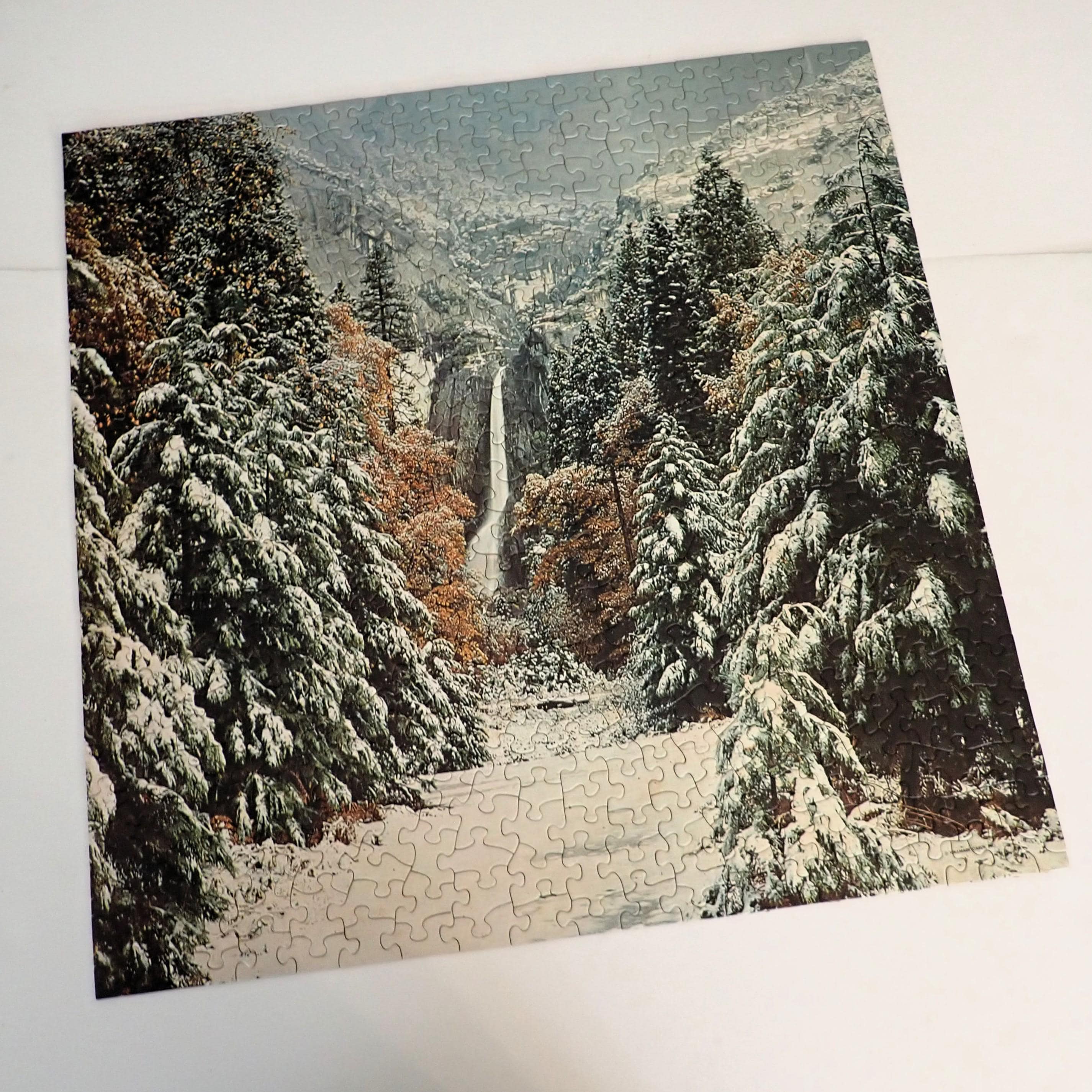 This Springbok jigsaw puzzle is titled Winter in the Mountains and is a 500 piece puzzle and includes the original box. The puzzle features a scene of Yosemite Falls in the winter. The finished puzzle measures 20" x 20". The puzzle is in very good condition with no missing pieces. The pieces are in very good shape with very little peeling or splitting of the layers. The box does have light wear and tape residue on some edges, as well as a couple of areas on the cover of the box where some of the picture is missing/torn.