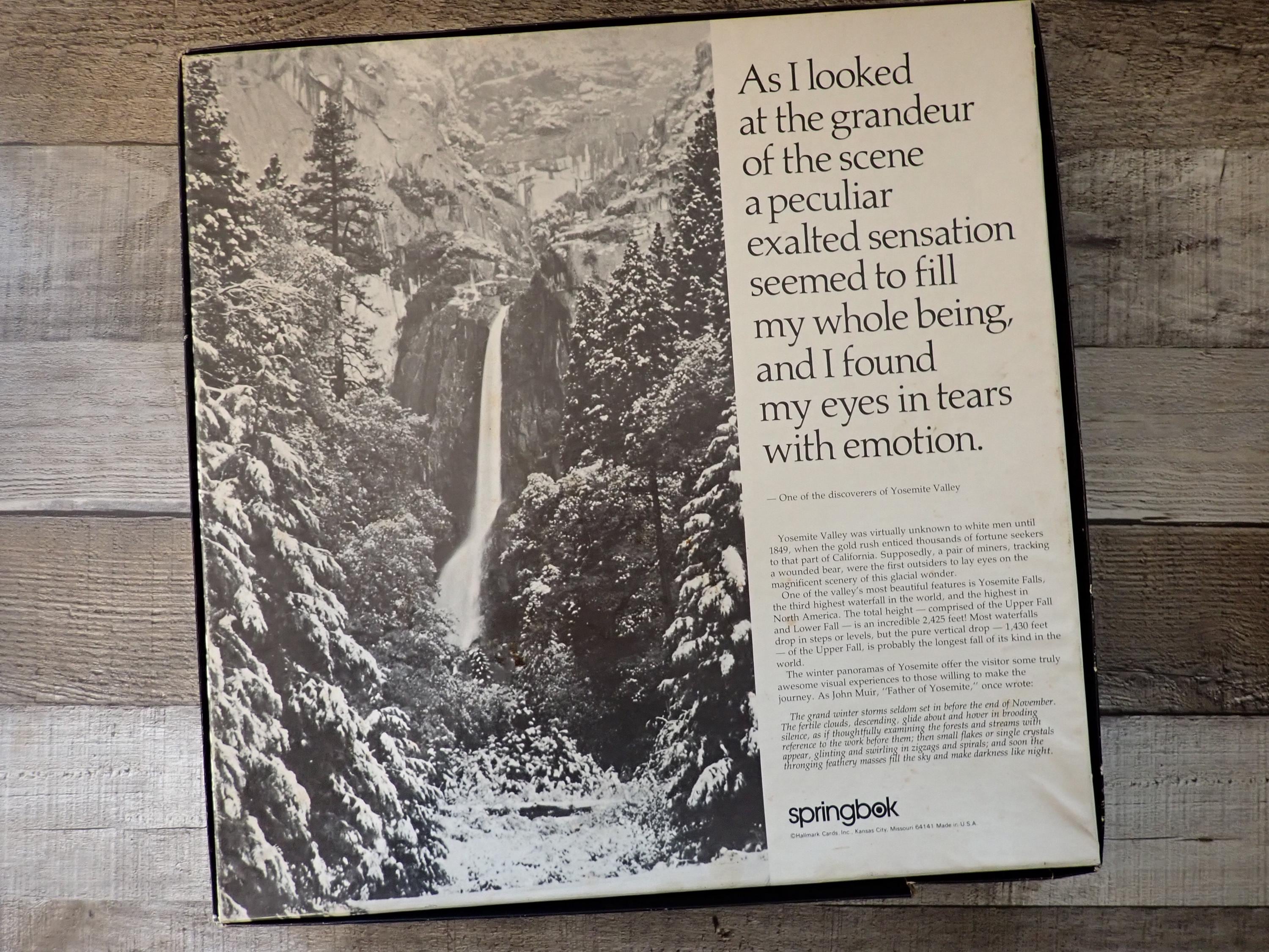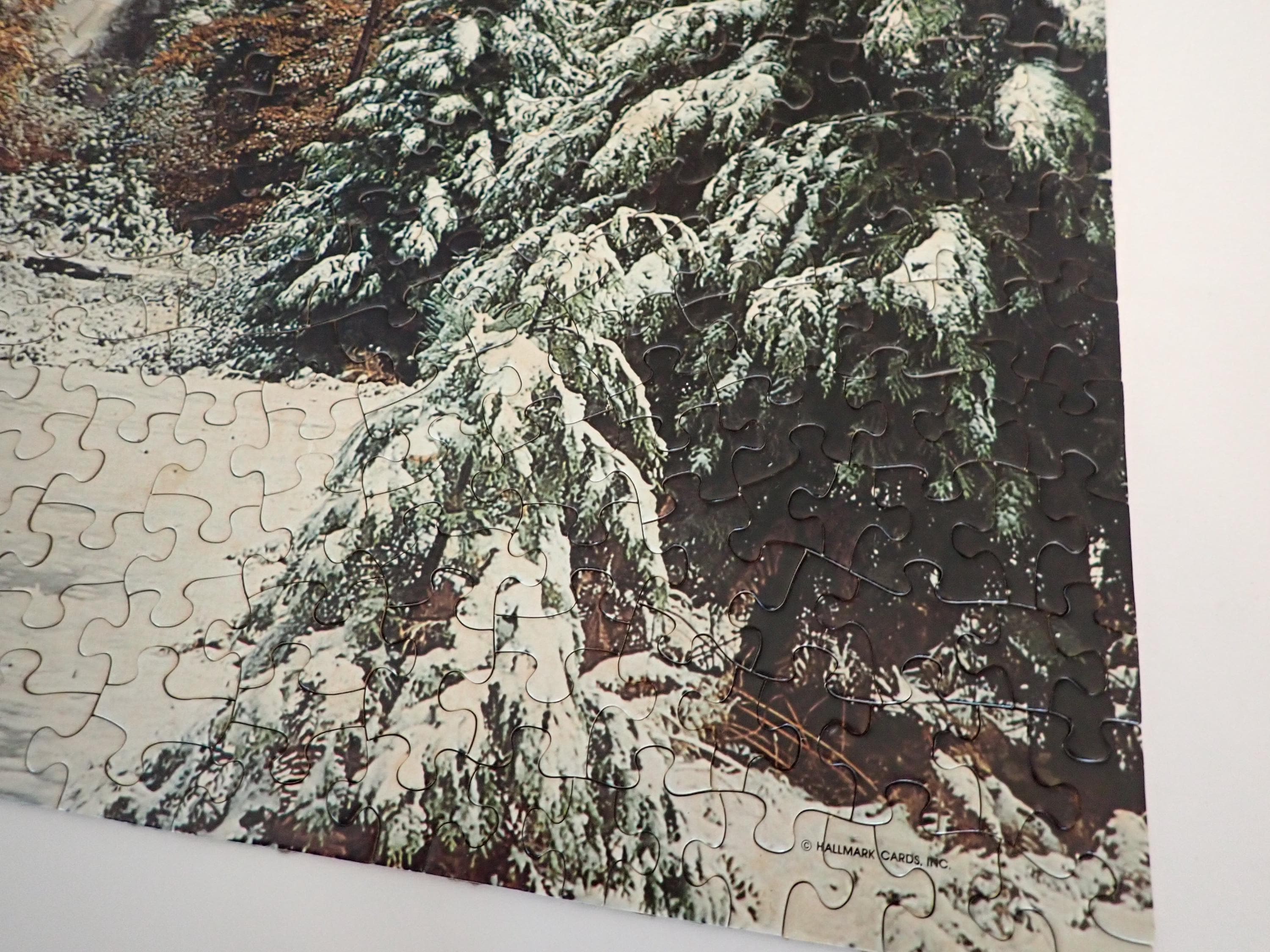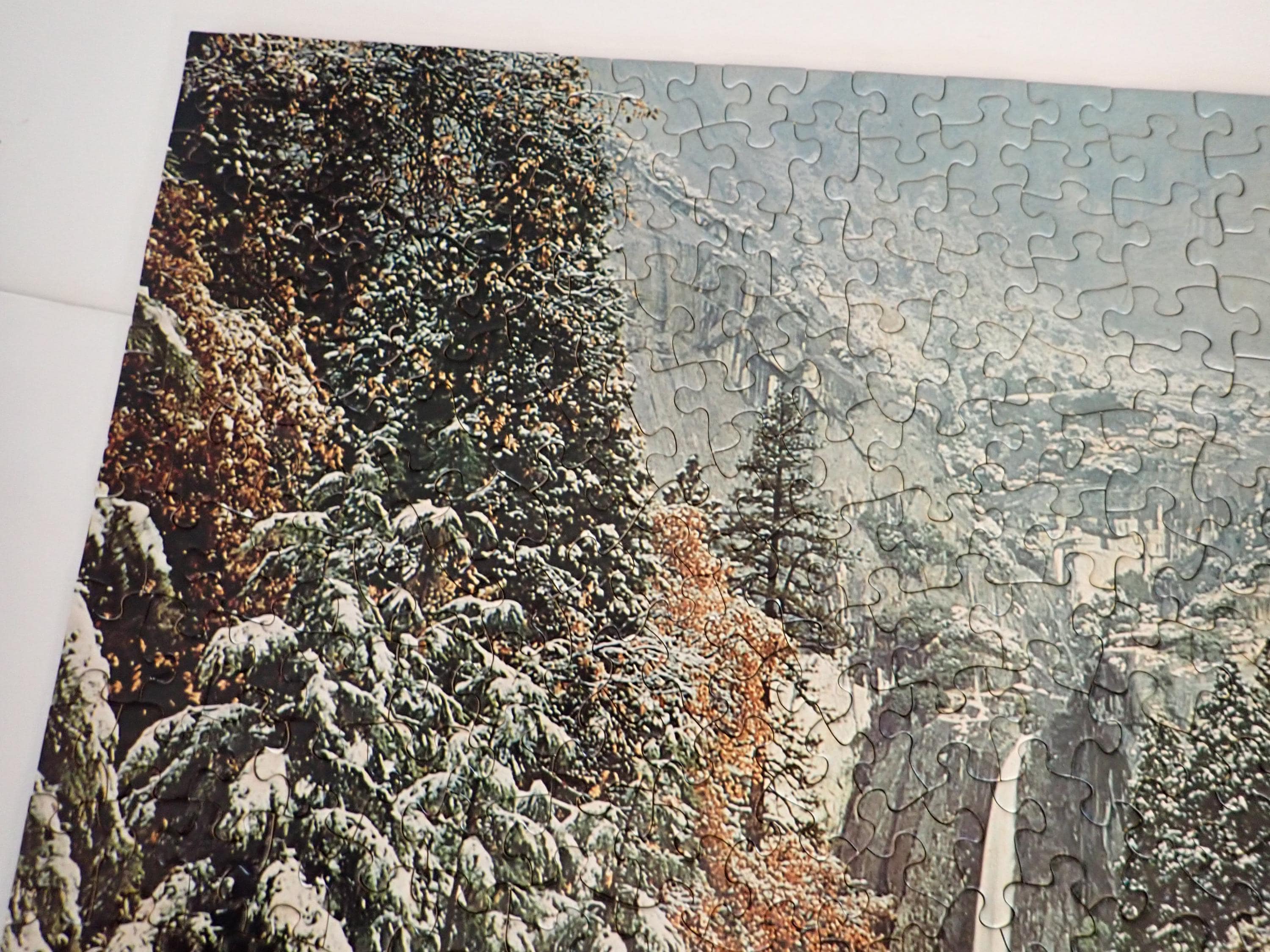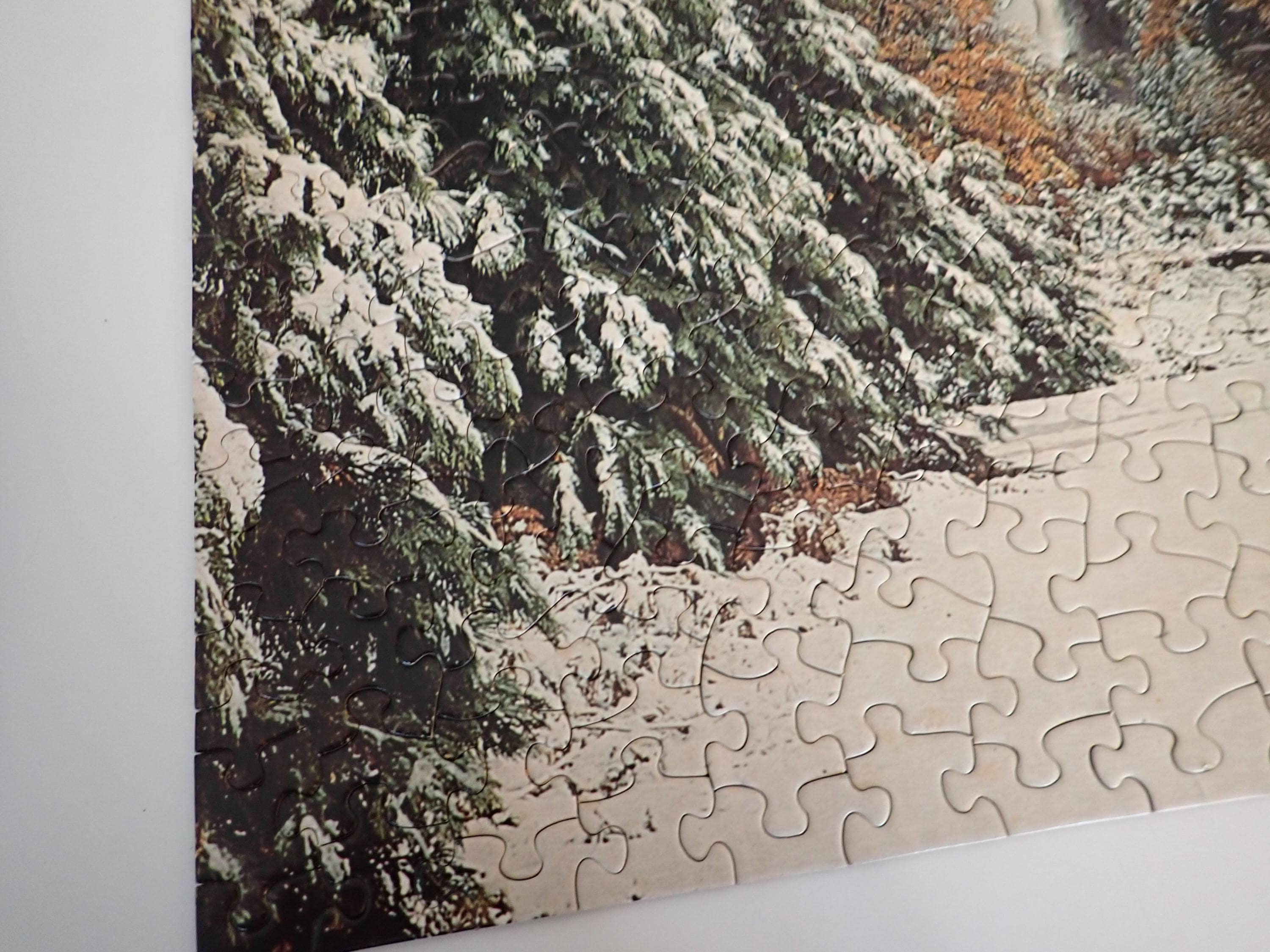This Springbok jigsaw puzzle is titled Winter in the Mountains and is a 500 piece puzzle and includes the original box. The puzzle features a scene of Yosemite Falls in the winter. The finished puzzle measures 20" x 20". The puzzle is in very good condition with no missing pieces. The pieces are in very good shape with very little peeling or splitting of the layers. The box does have light wear and tape residue on some edges, as well as a couple of areas on the cover of the box where some of the picture is missing/torn.