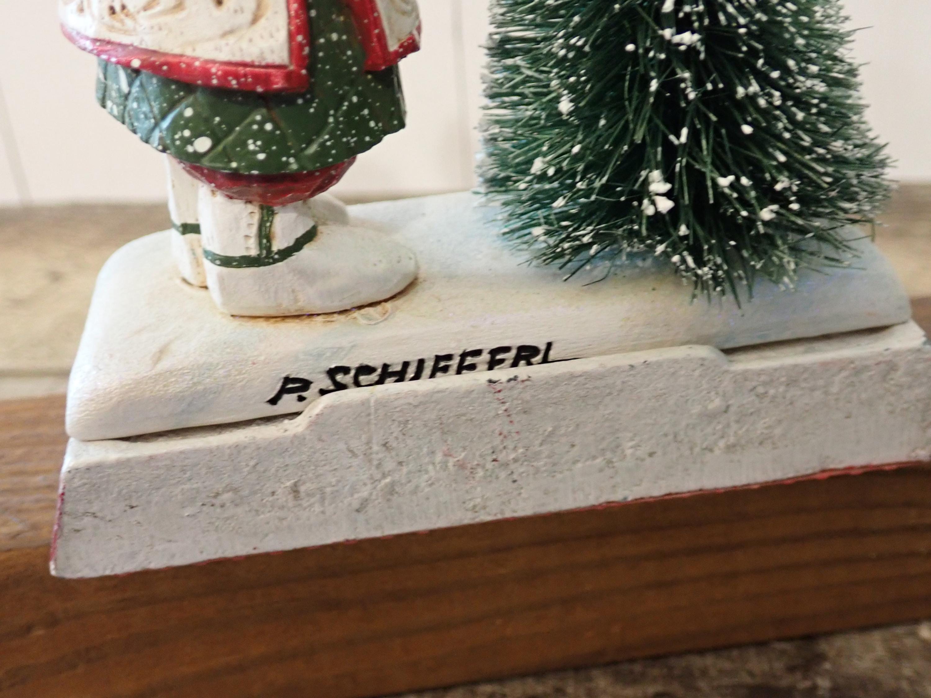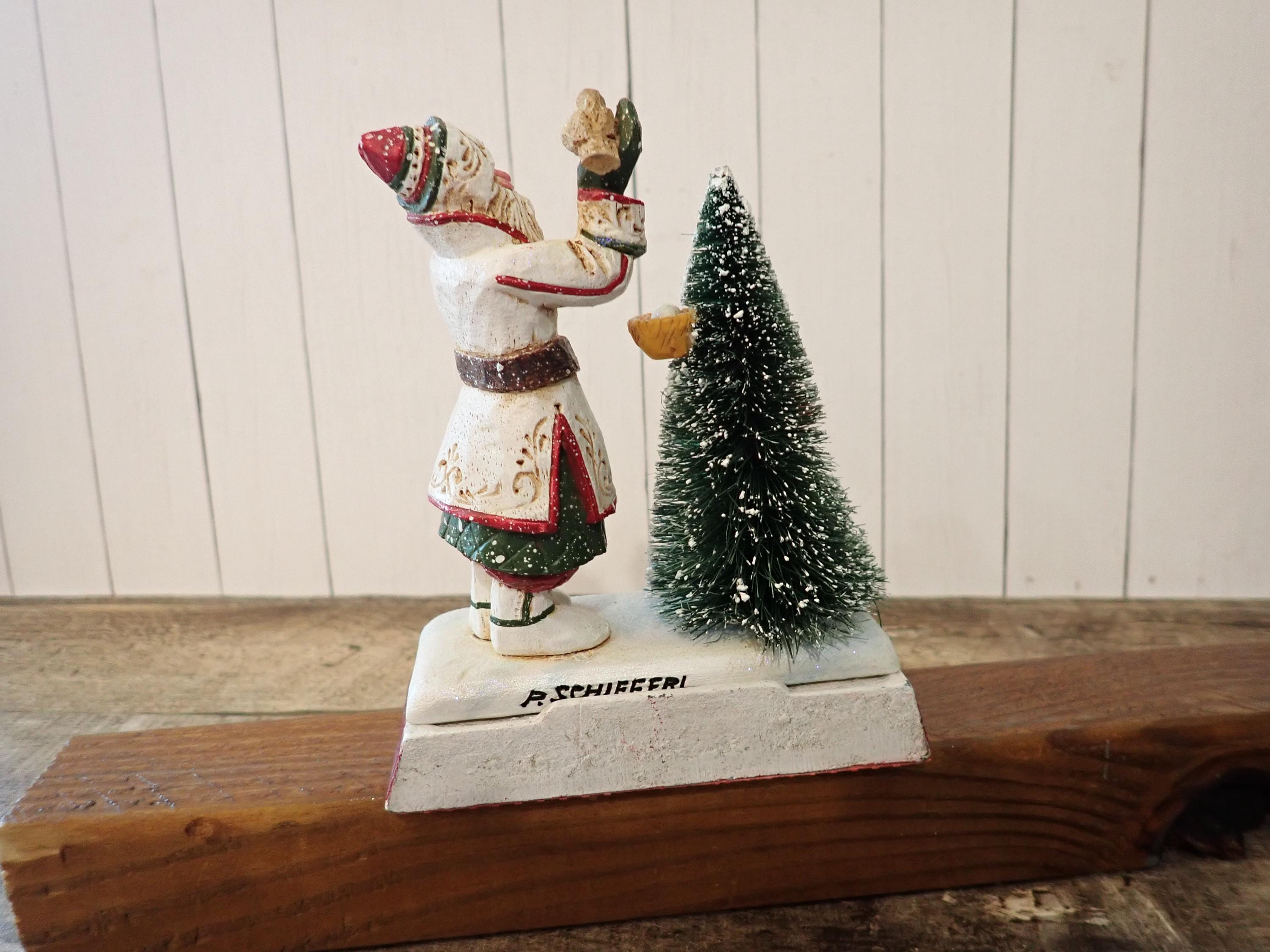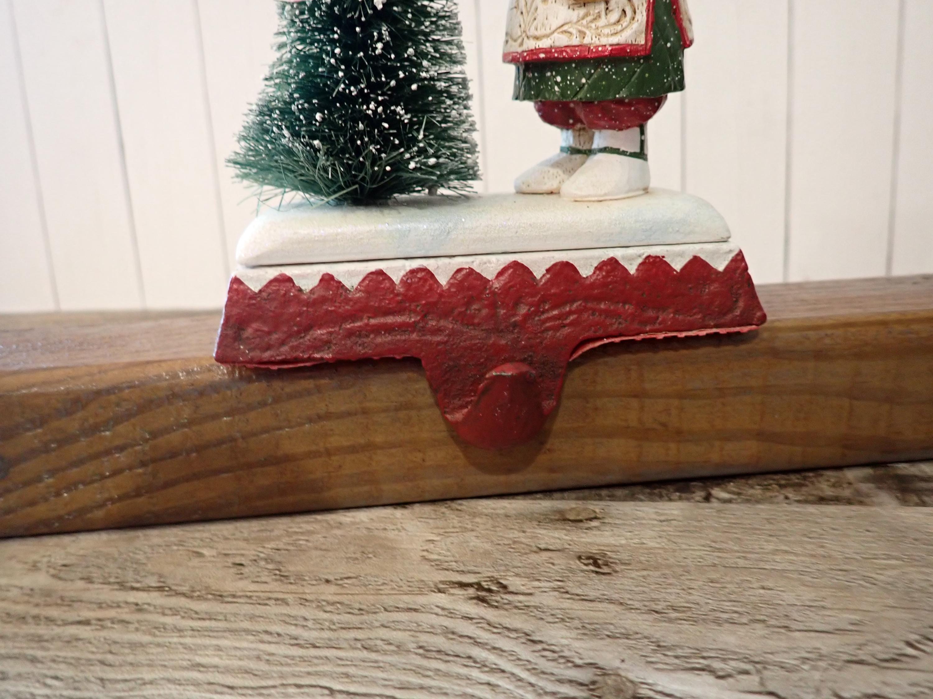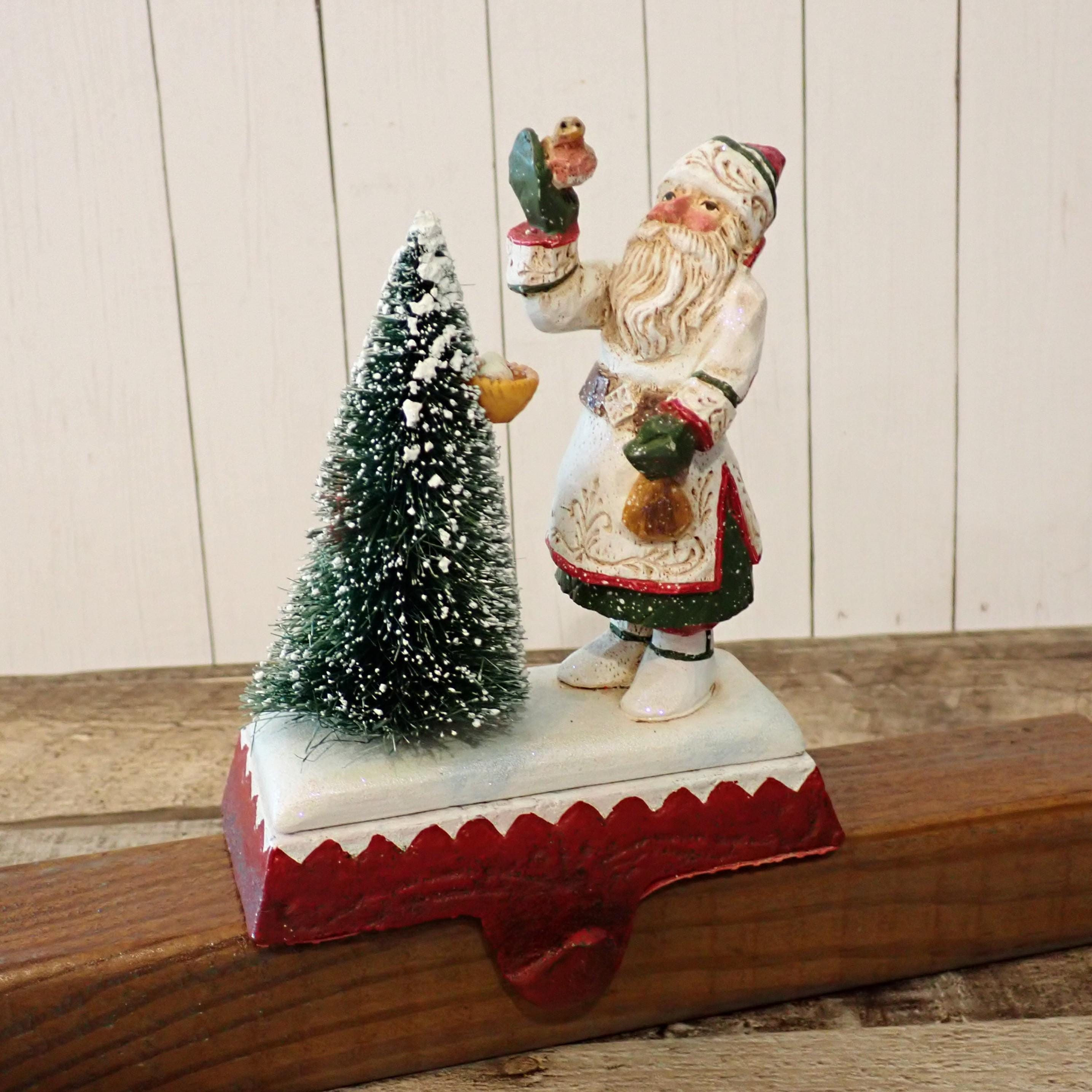 This Santa and tree stocking hanger 5" tall and 4.25" wide. The base is cast iron piece and the Santa figurine is a resin piece. The Santa figurine holds a bird in his hand and stands next to a tree with a birds nest. The hanger has a metal hook on the front for hanging a stocking. The back of the piece is marked SCHIFFERL. The stocking hanger is in very nice condition with no chips, cracks or damage.