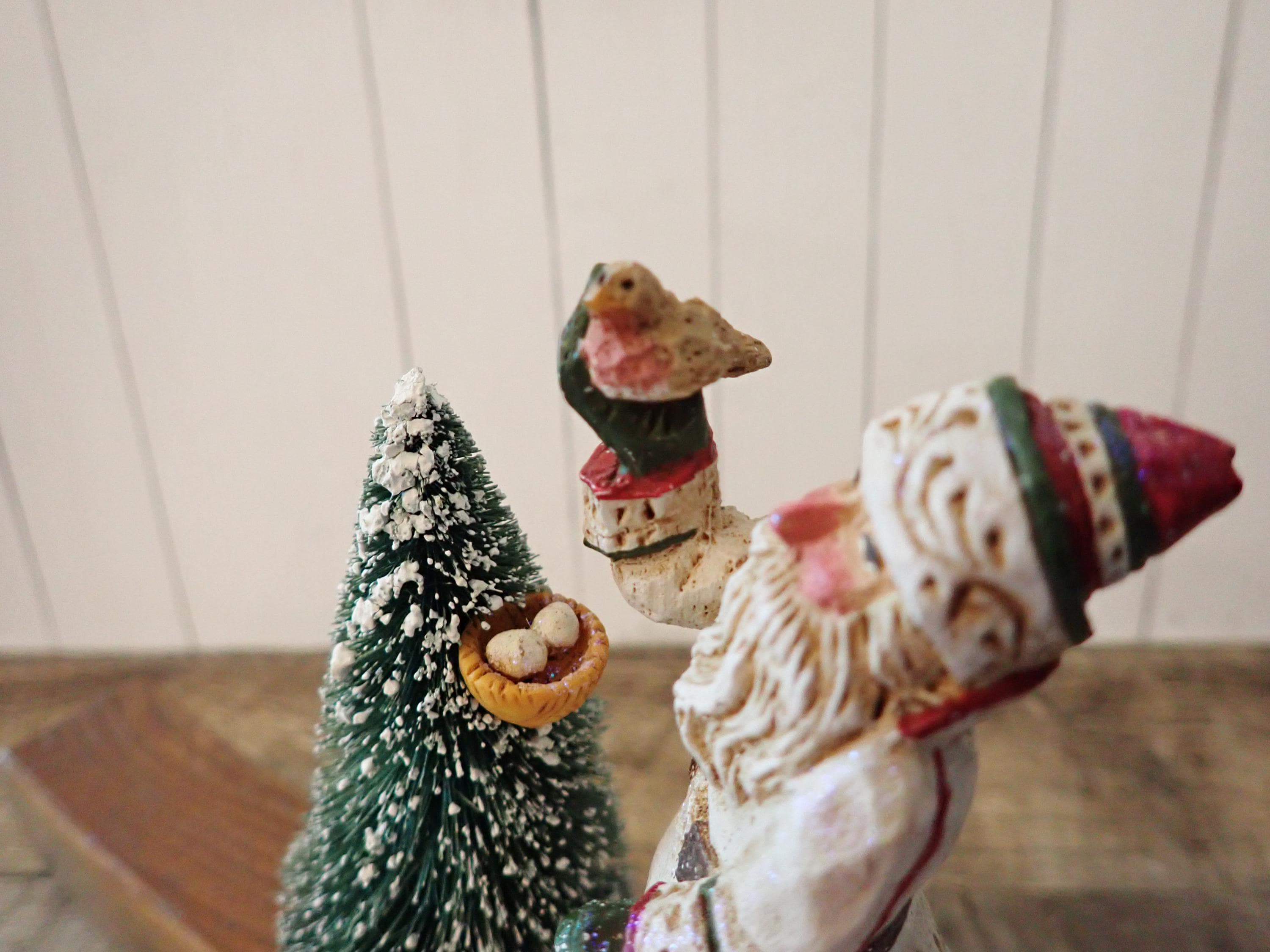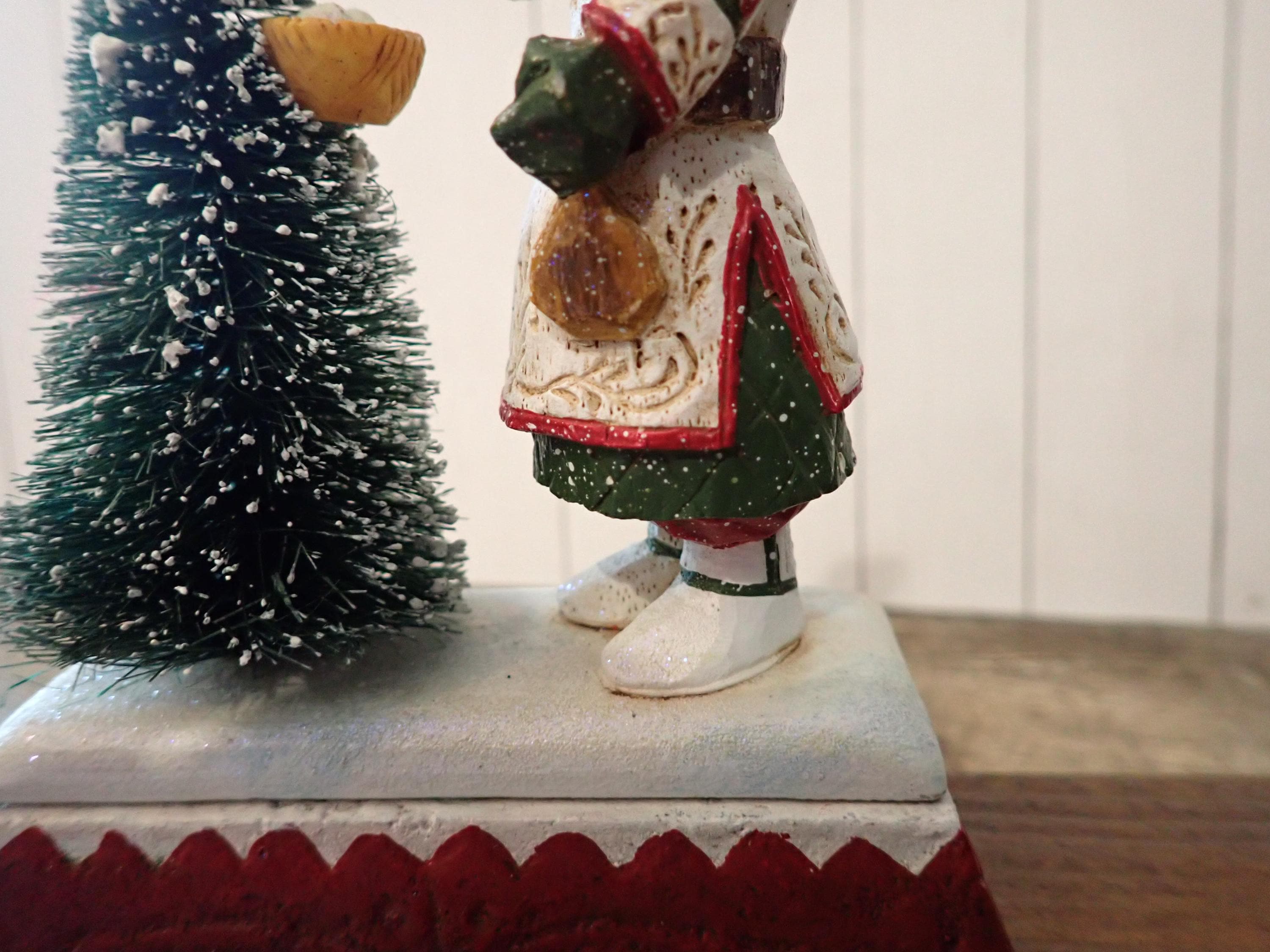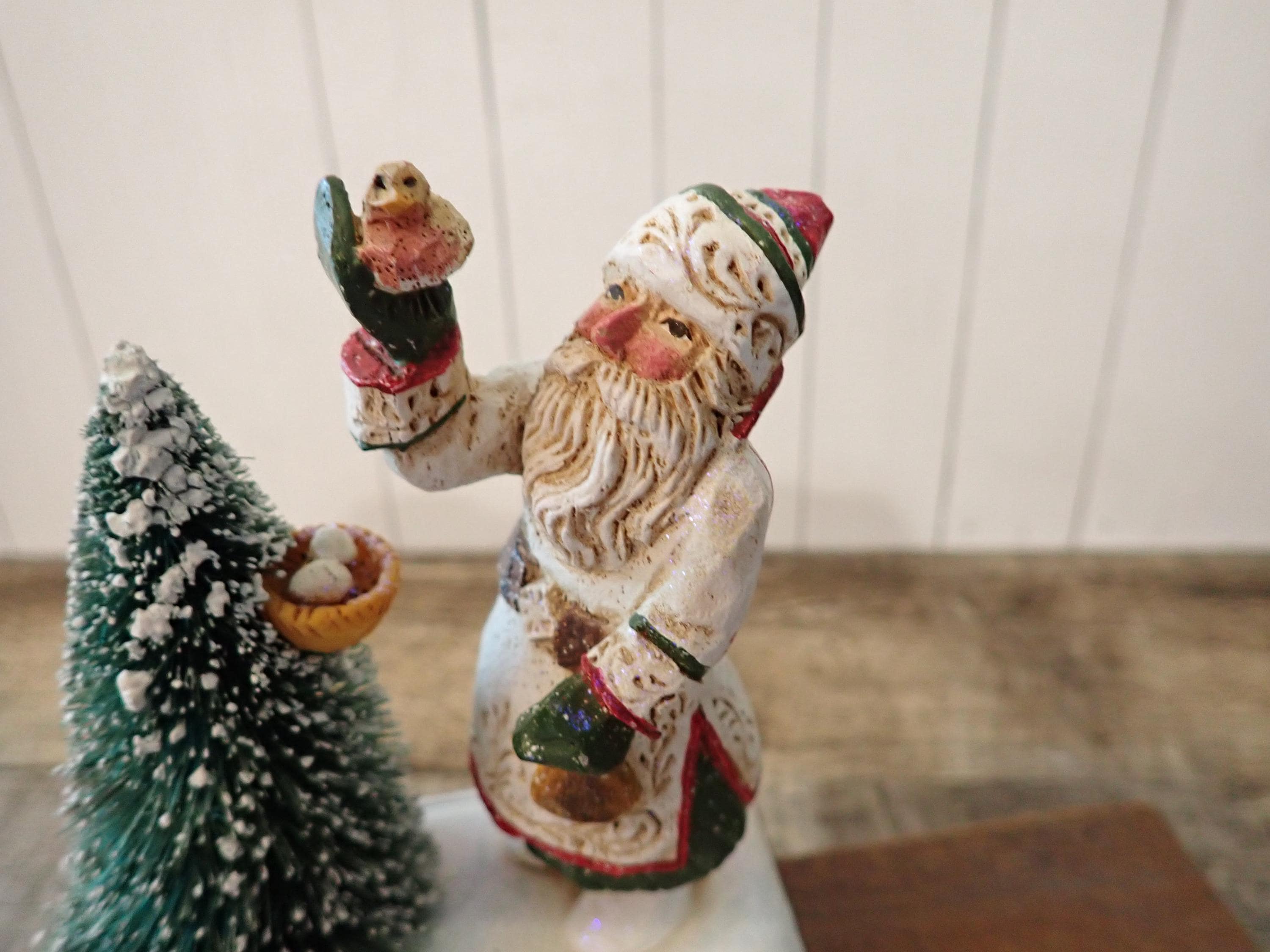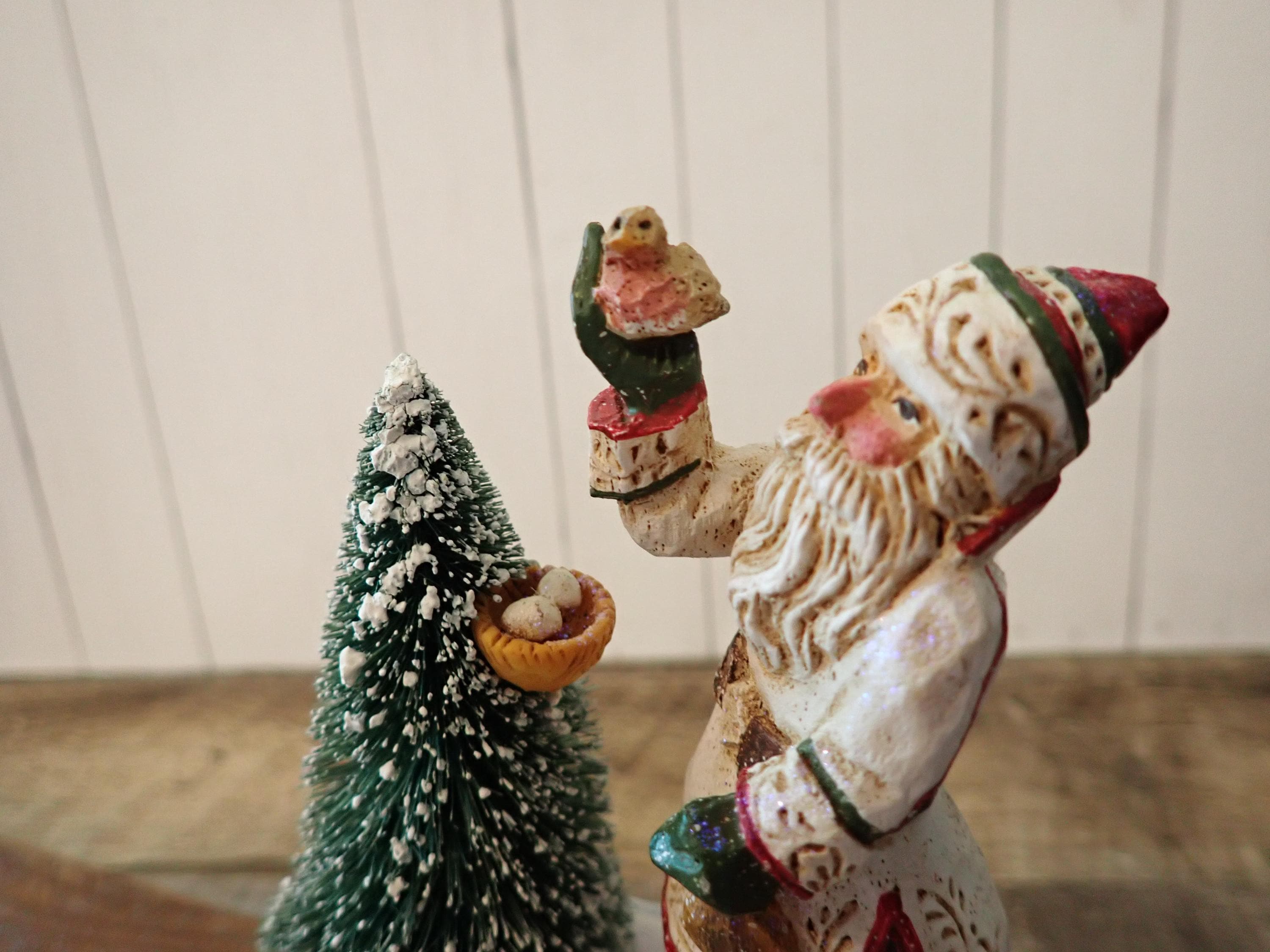 This Santa and tree stocking hanger 5" tall and 4.25" wide. The base is cast iron piece and the Santa figurine is a resin piece. The Santa figurine holds a bird in his hand and stands next to a tree with a birds nest. The hanger has a metal hook on the front for hanging a stocking. The back of the piece is marked SCHIFFERL. The stocking hanger is in very nice condition with no chips, cracks or damage.