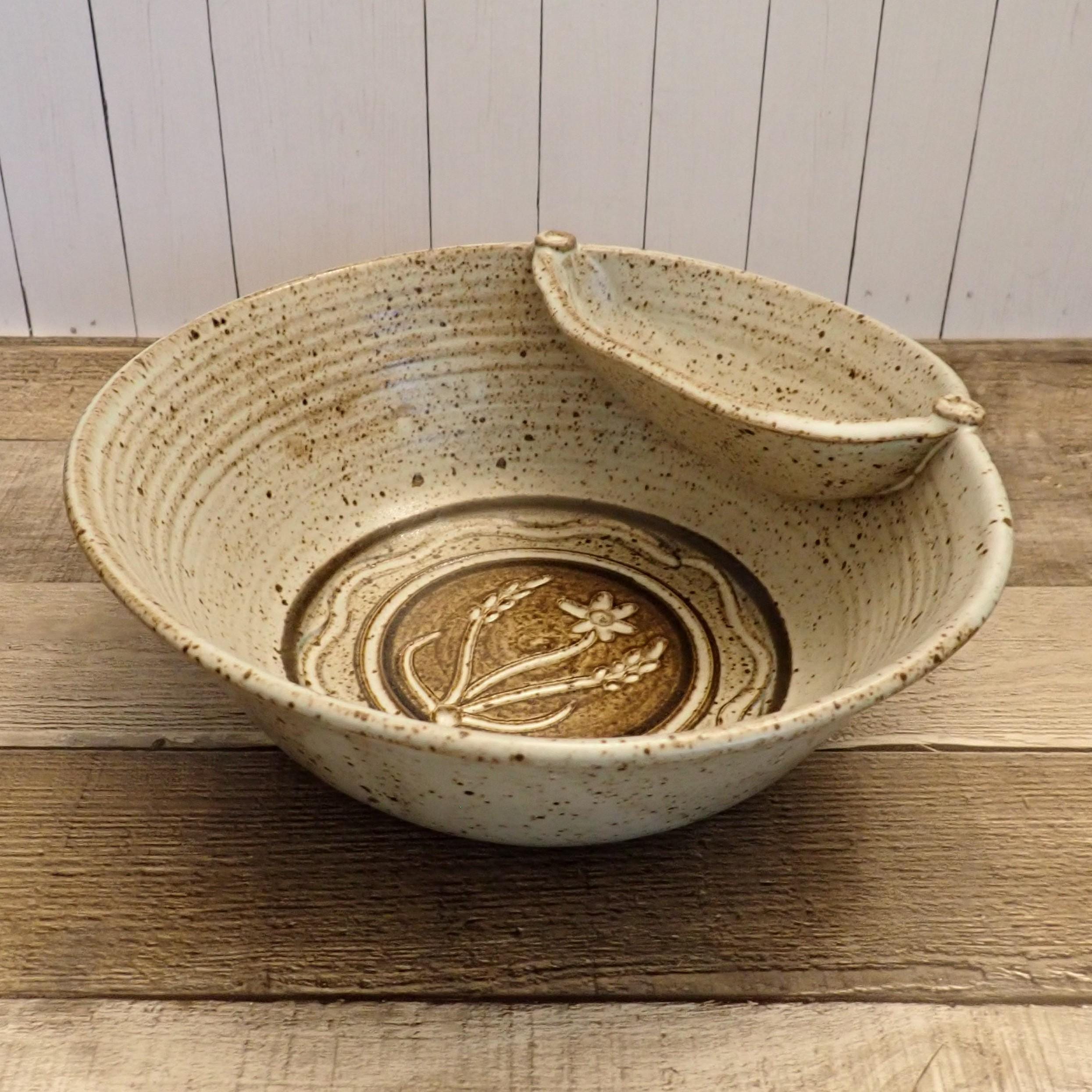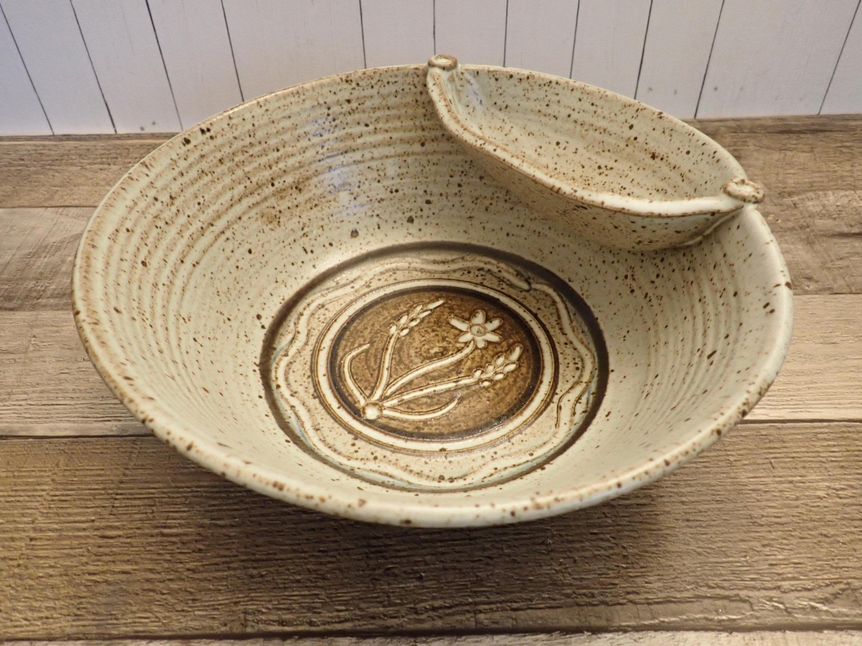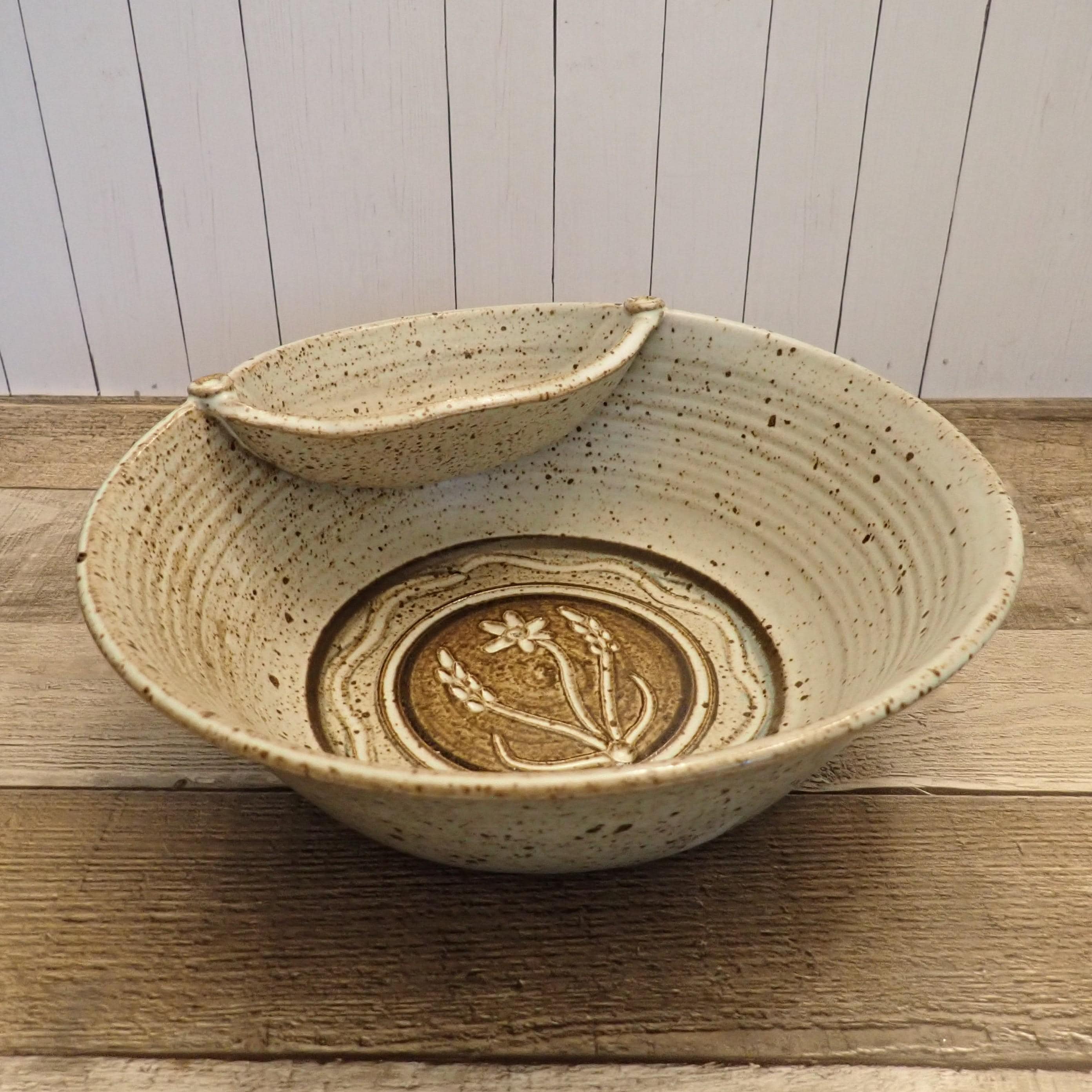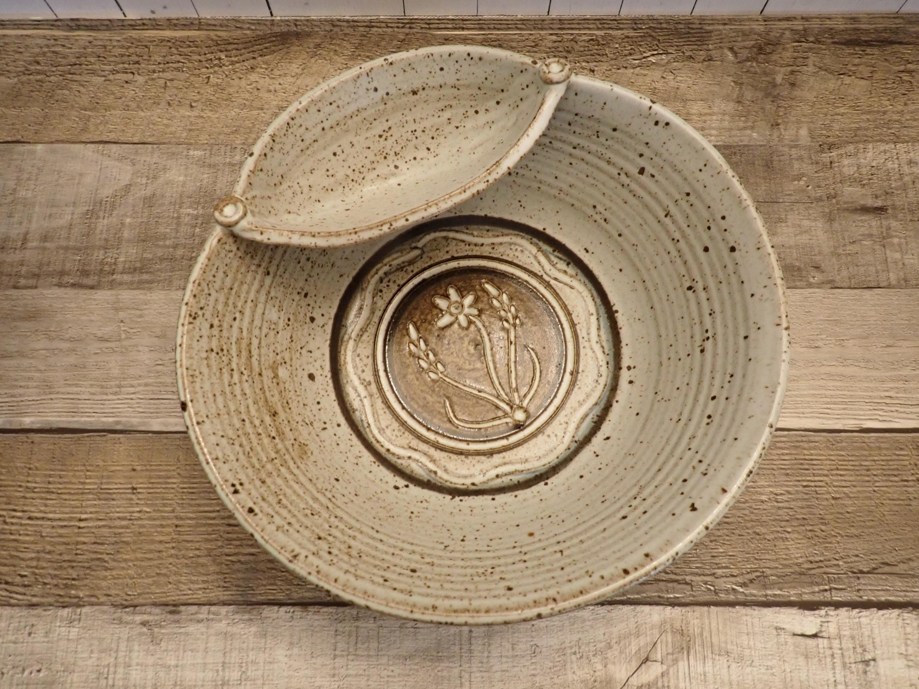 This lovely pottery chip and dip bowl is 10" in diameter and 3.5" high at the rim. It is a light gray pottery piece and is decorated with a brown and black etched flower design in the center of the bowl. There is a an area for dip along the edge of the bowl. There are no makers marks on the bowl. The bowl is in very good condition with no chips or cracks.