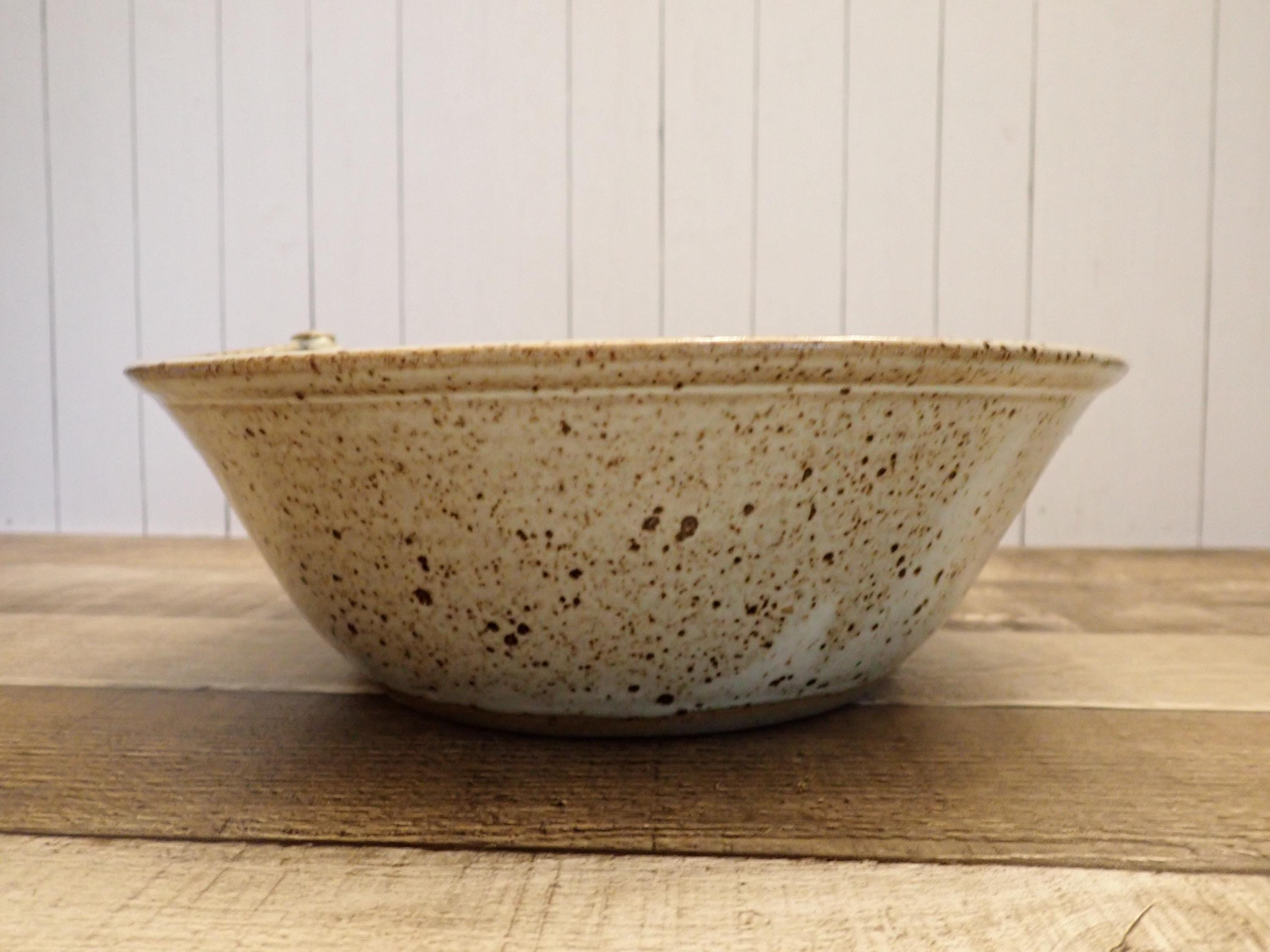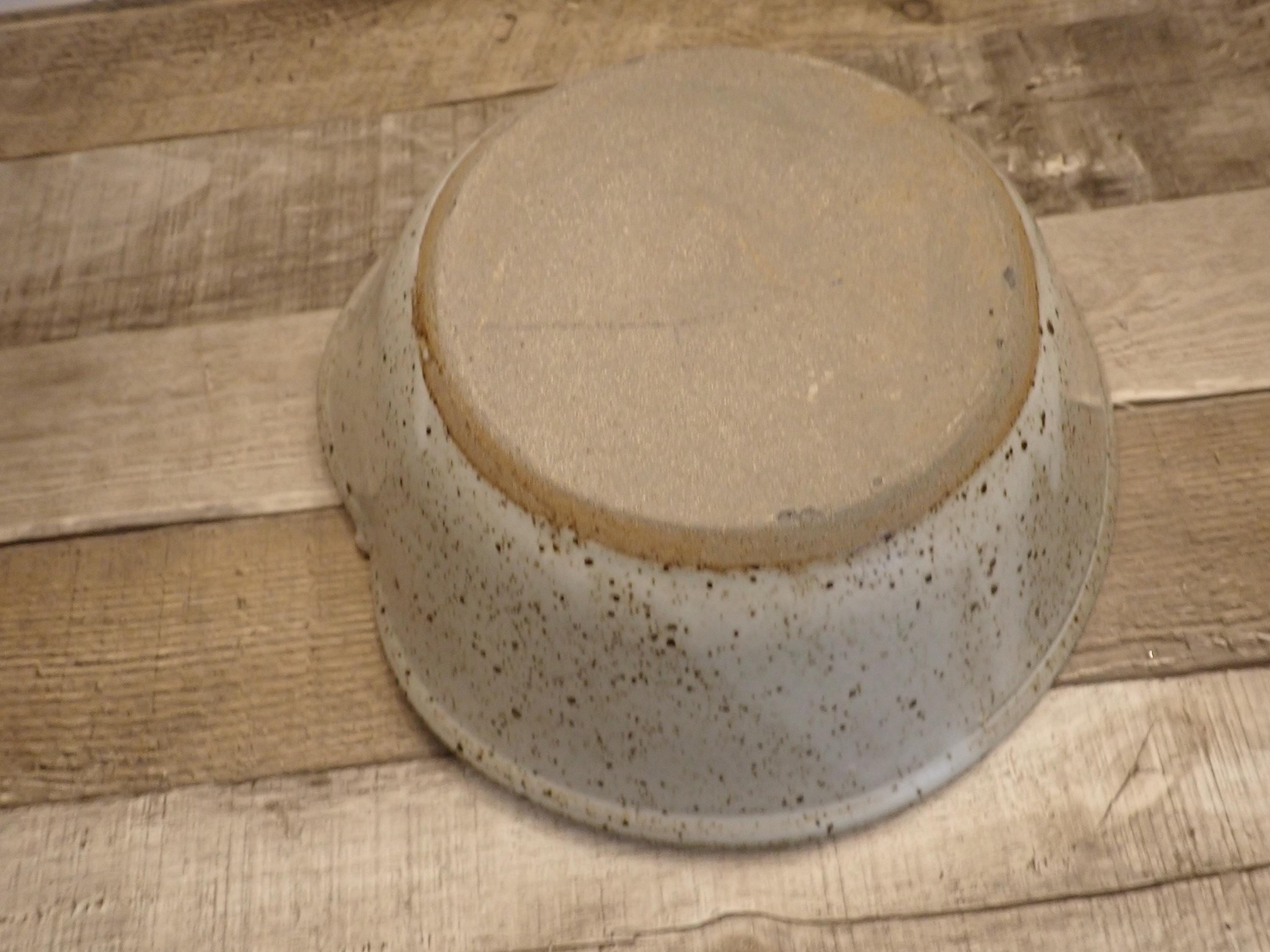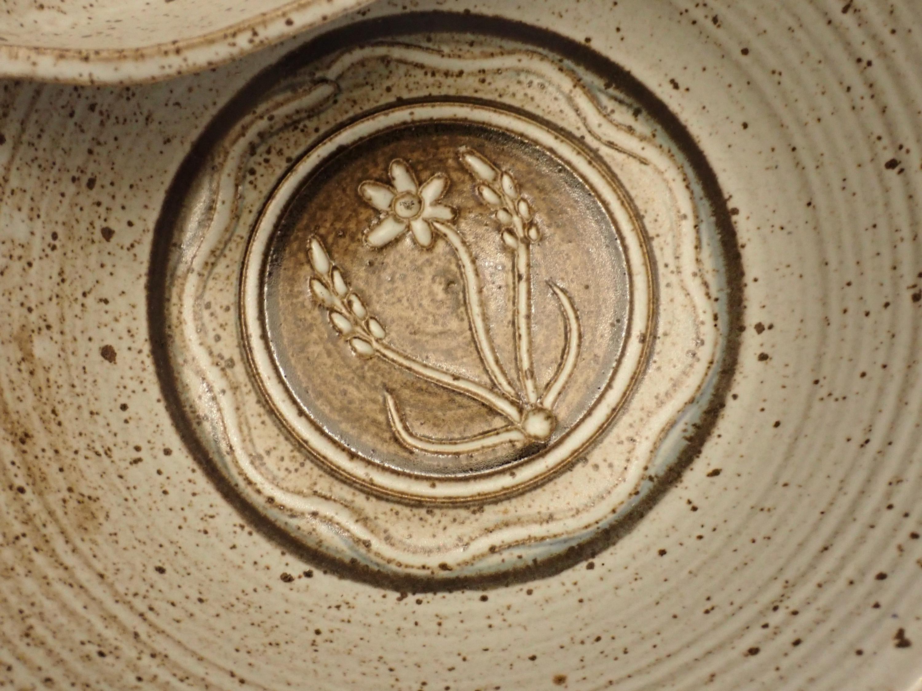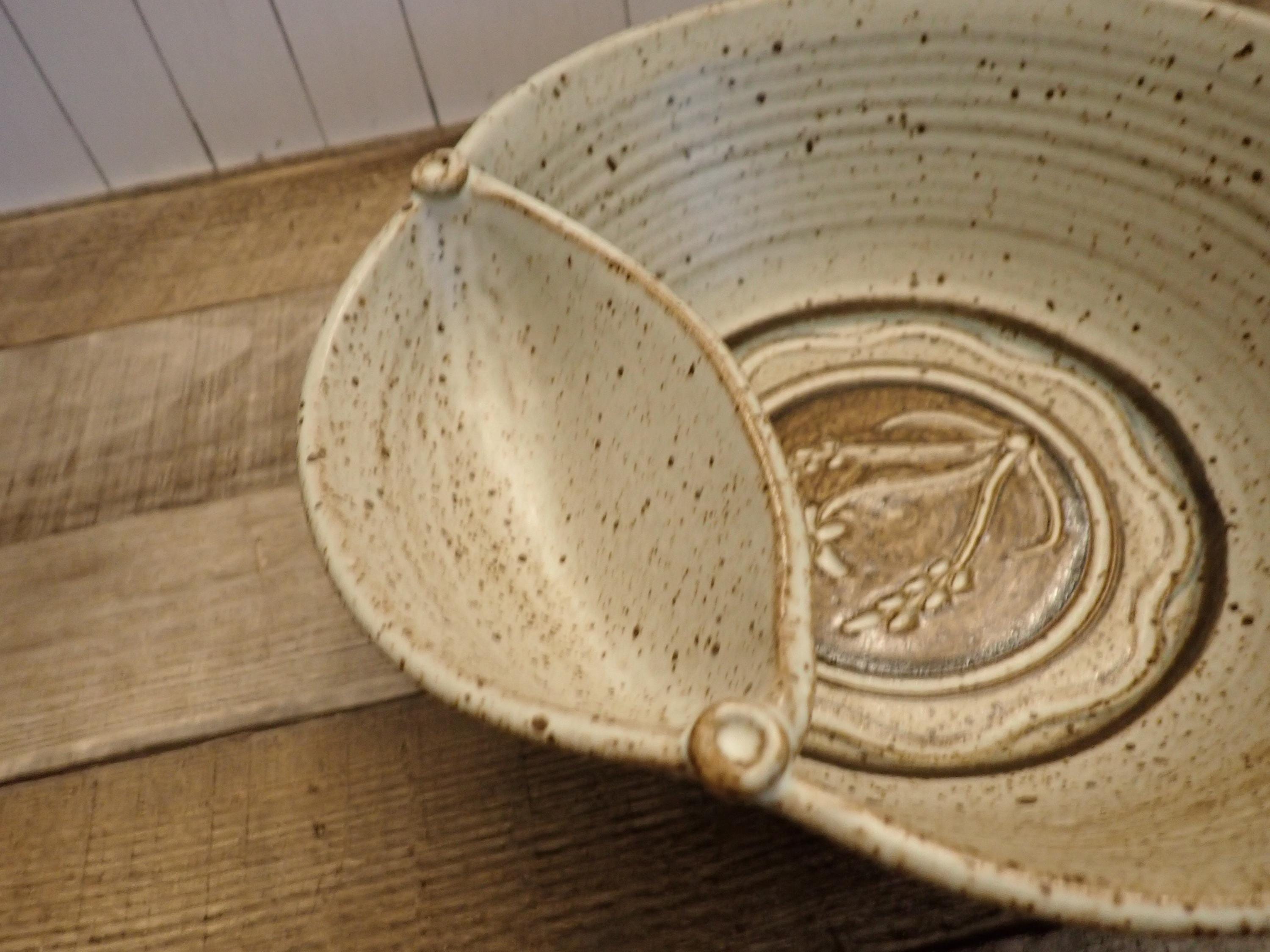 This lovely pottery chip and dip bowl is 10" in diameter and 3.5" high at the rim. It is a light gray pottery piece and is decorated with a brown and black etched flower design in the center of the bowl. There is a an area for dip along the edge of the bowl. There are no makers marks on the bowl. The bowl is in very good condition with no chips or cracks.