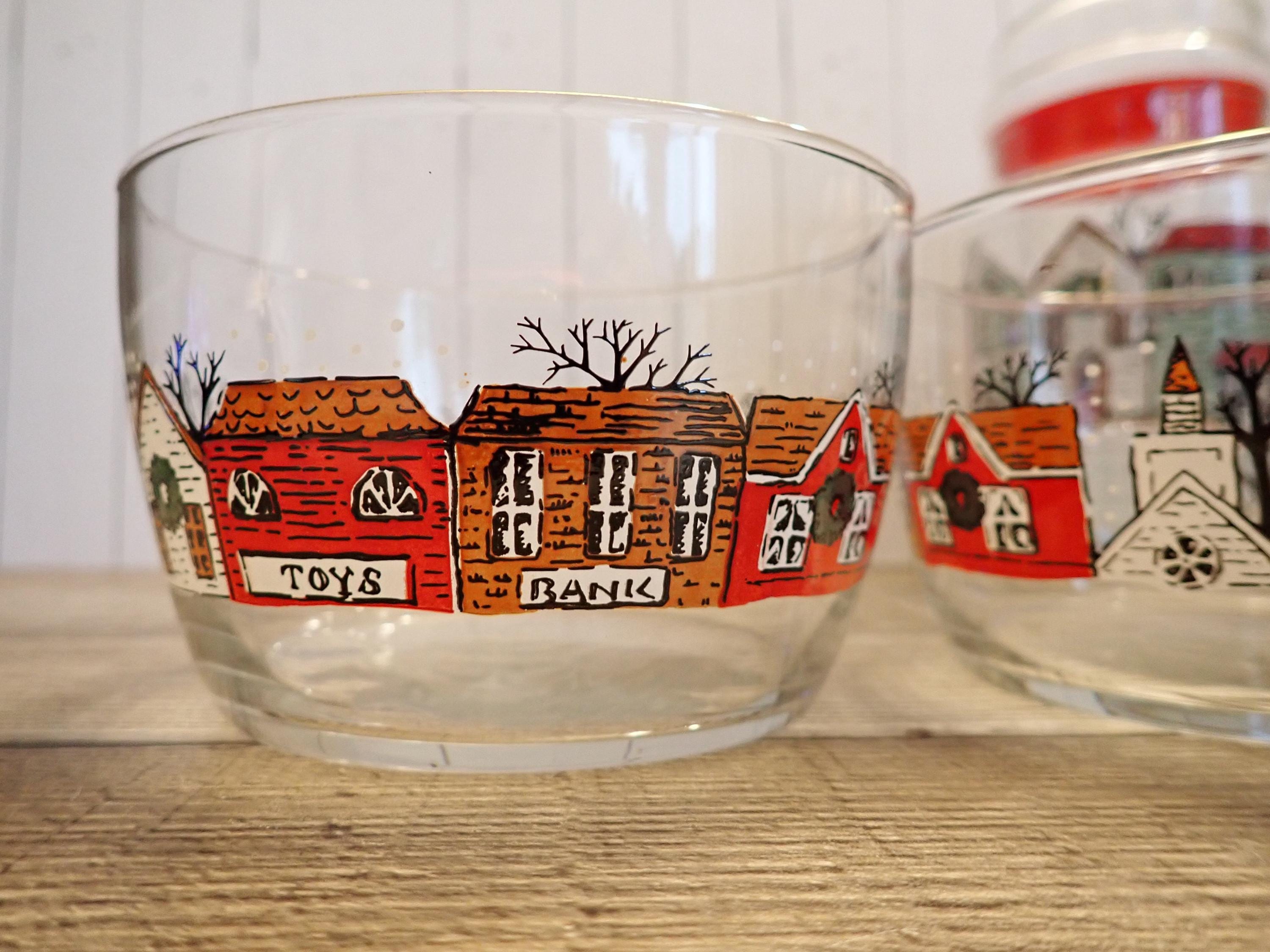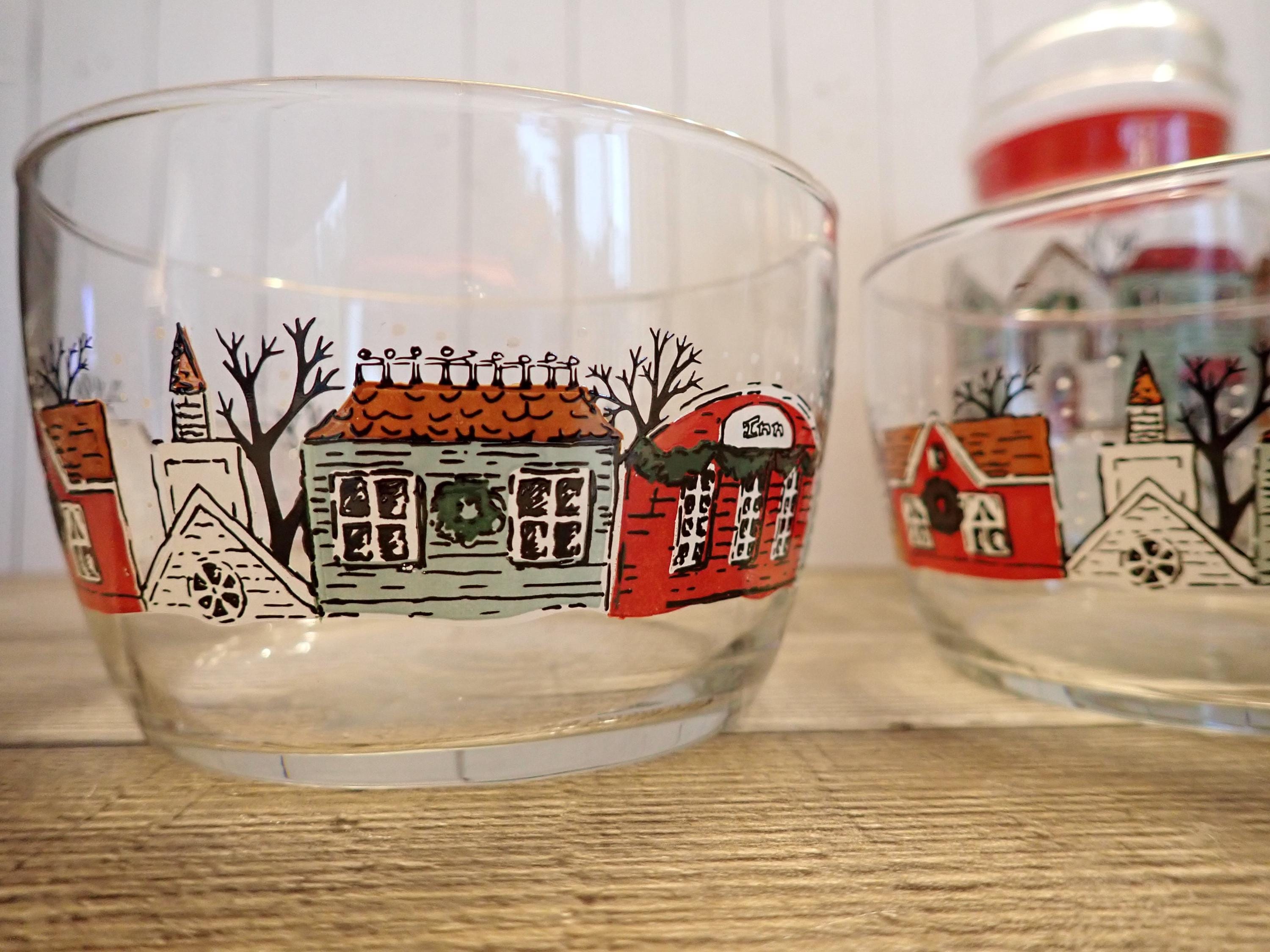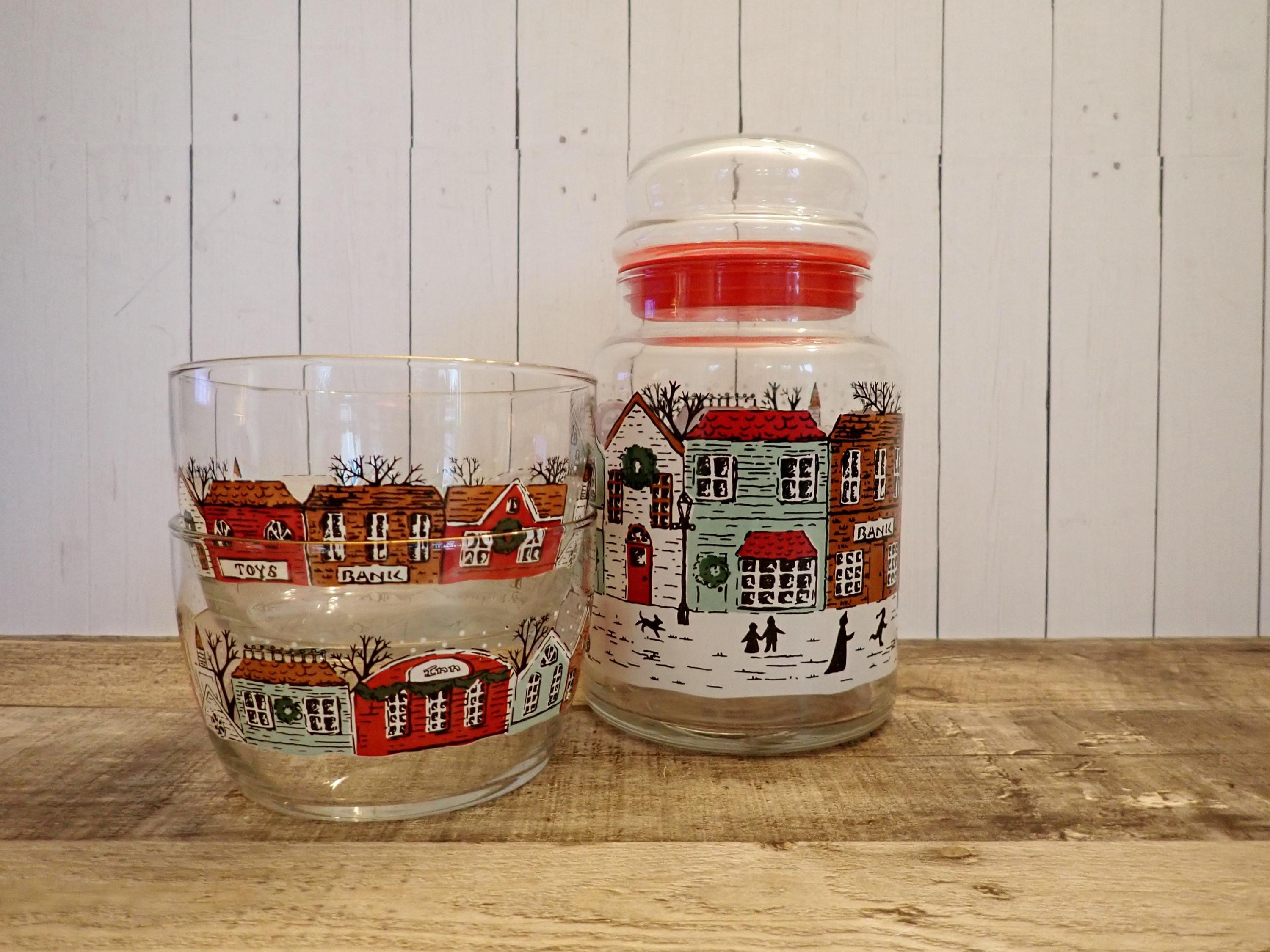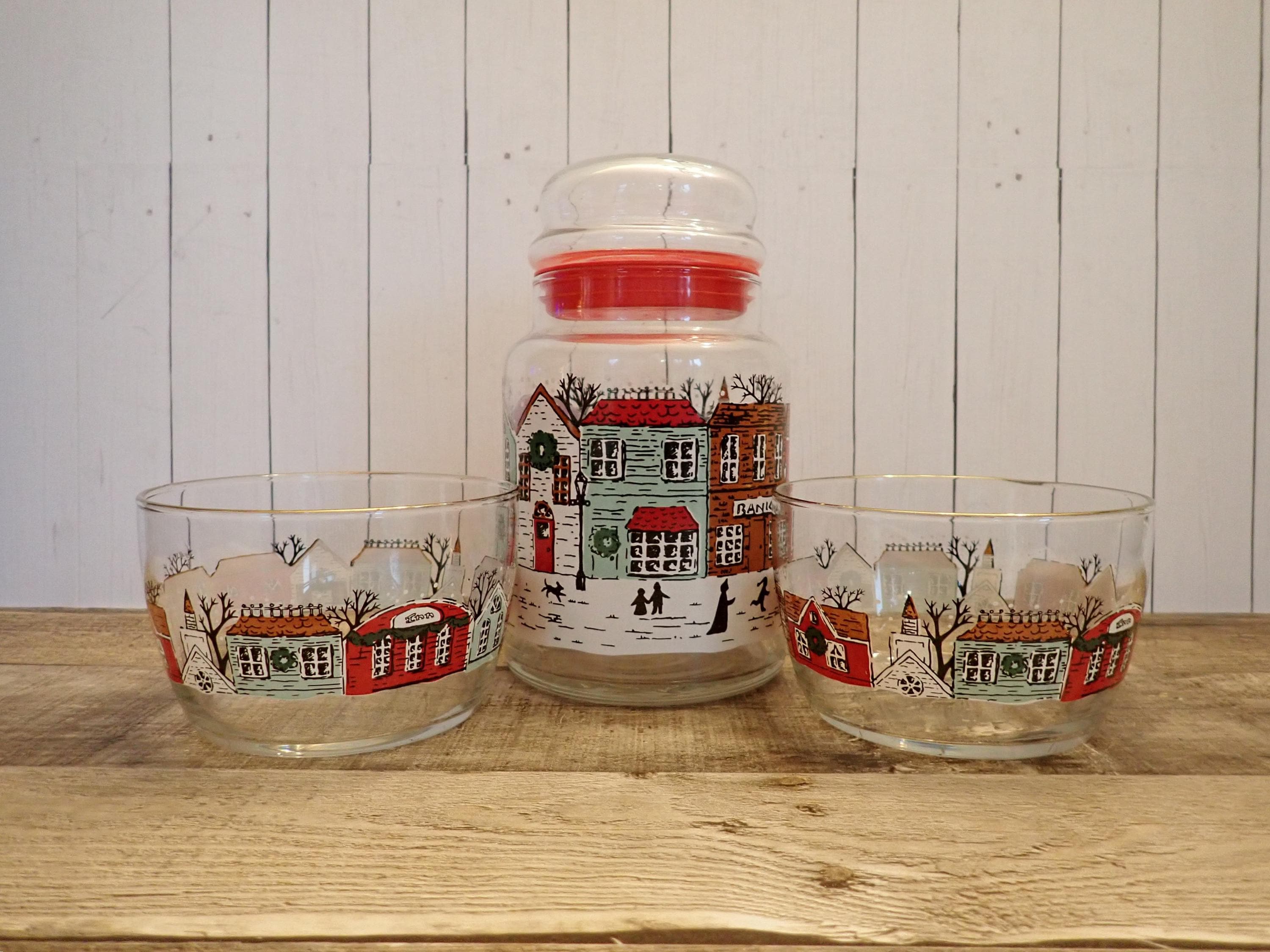 This fun glass canister and bowl set includes a matching canister and 2 candy bowls. The glass canister is 4" in diameter and 7" tall with the lid on. The canister is a clear glass and has a red, green, and brown winter village scene around the canister. The candy bowls are 4.25" in diameter and 3" tall and have the same village pattern. The canister lid has a red plastic seal around the bottom for a snug fit. The canister and bowls are all in very good condition with no chips or cracks. All of the graphics are bright and clear. Great little canister and bowl set for Christmas candy!