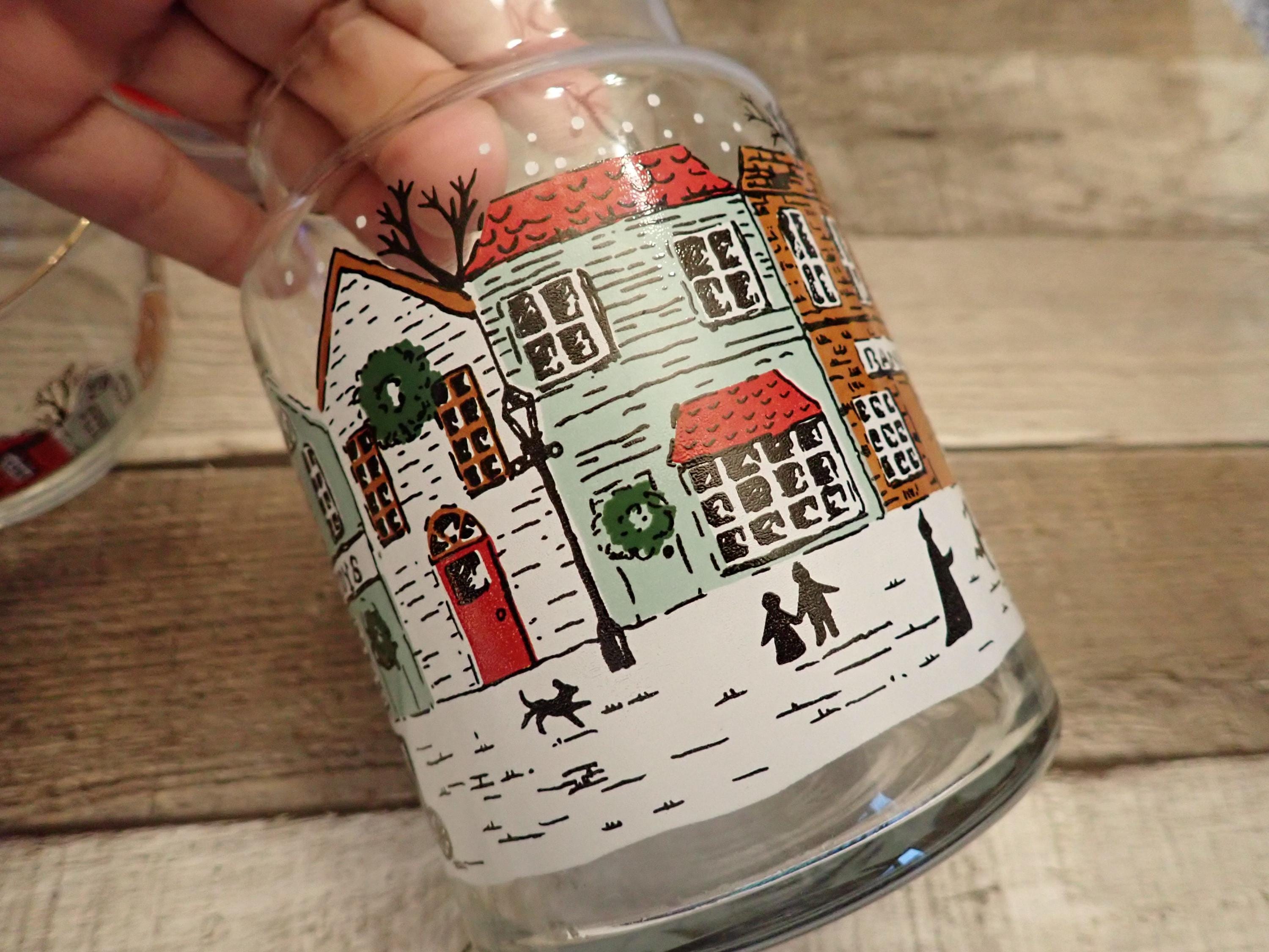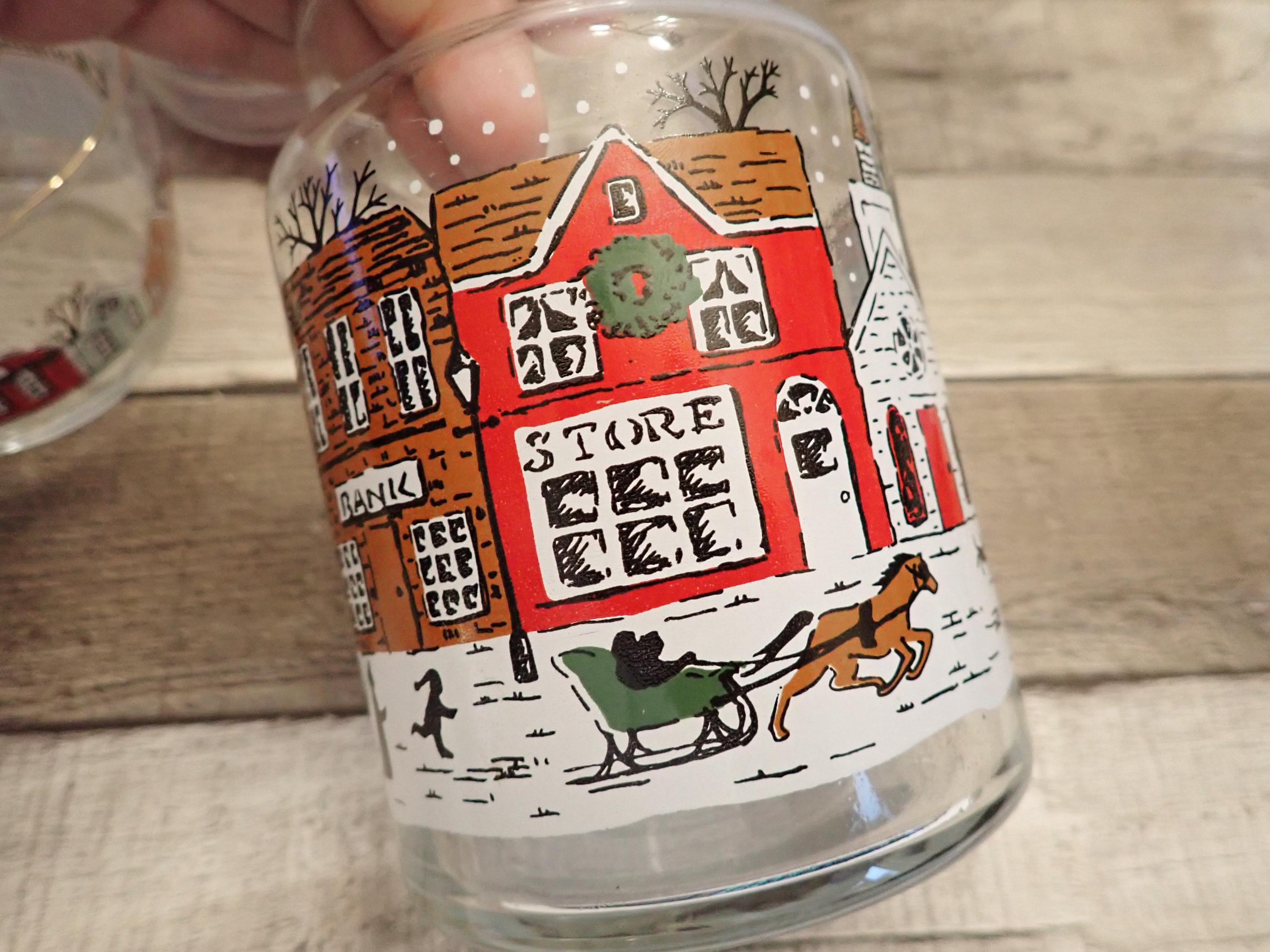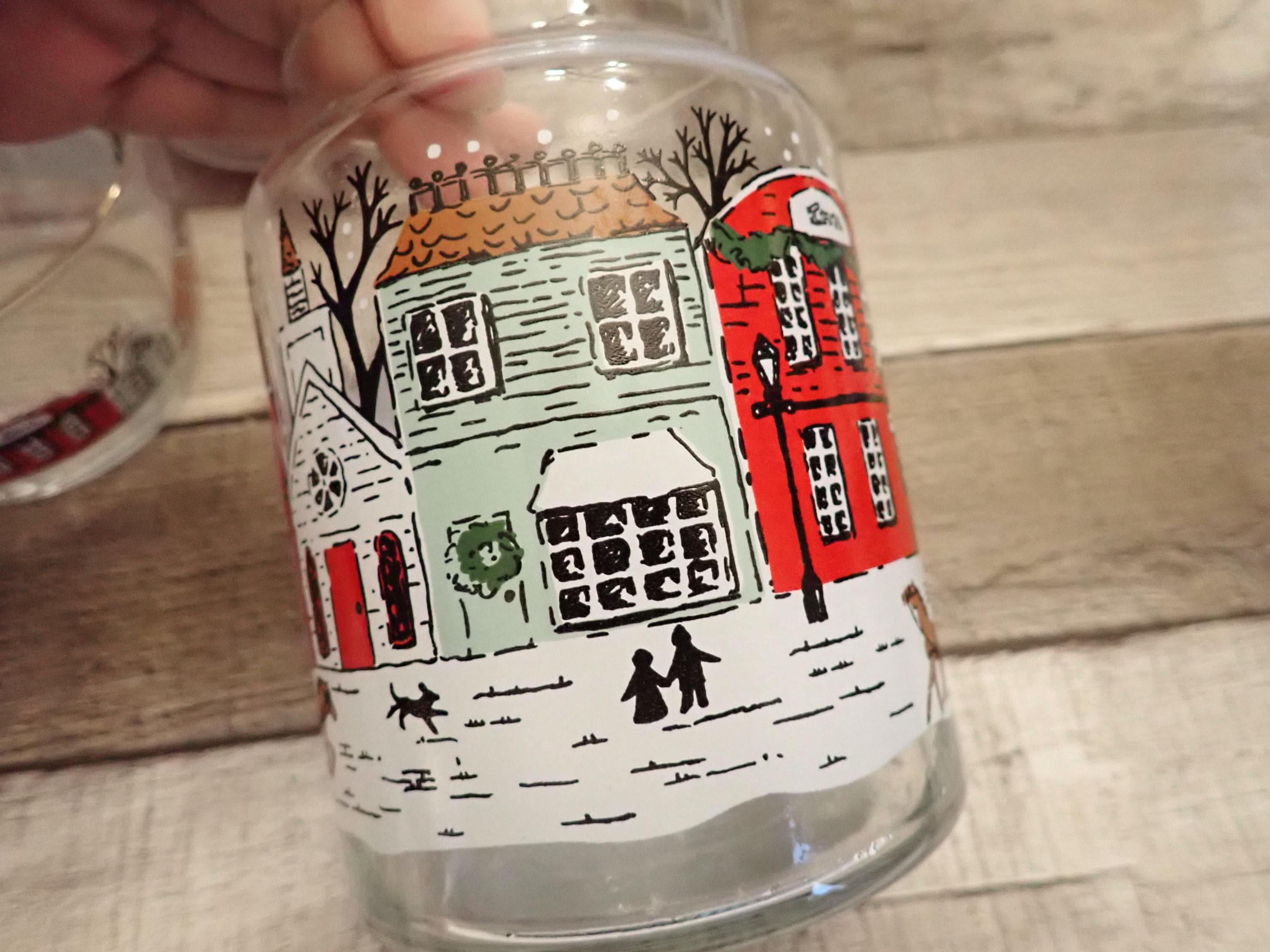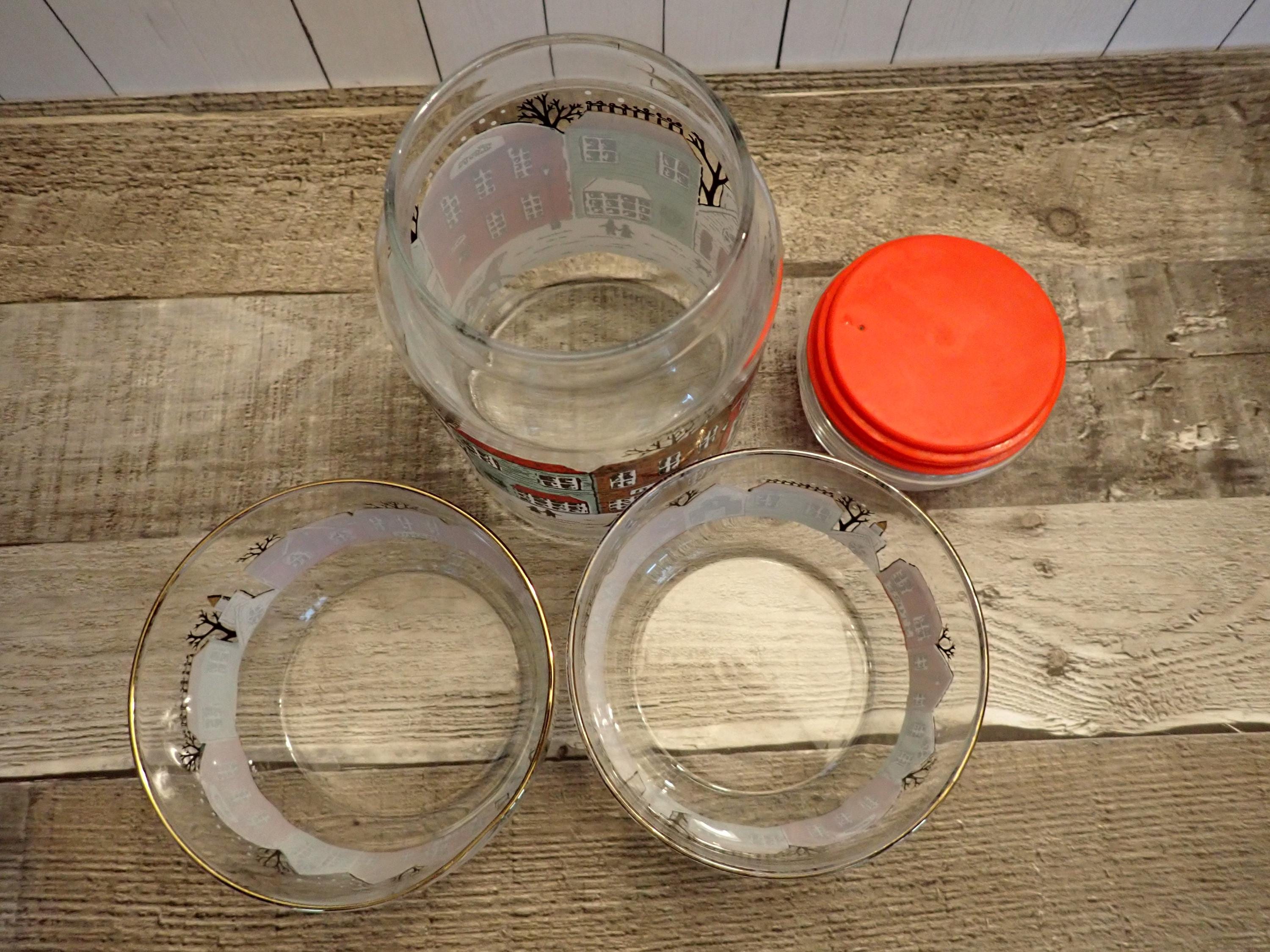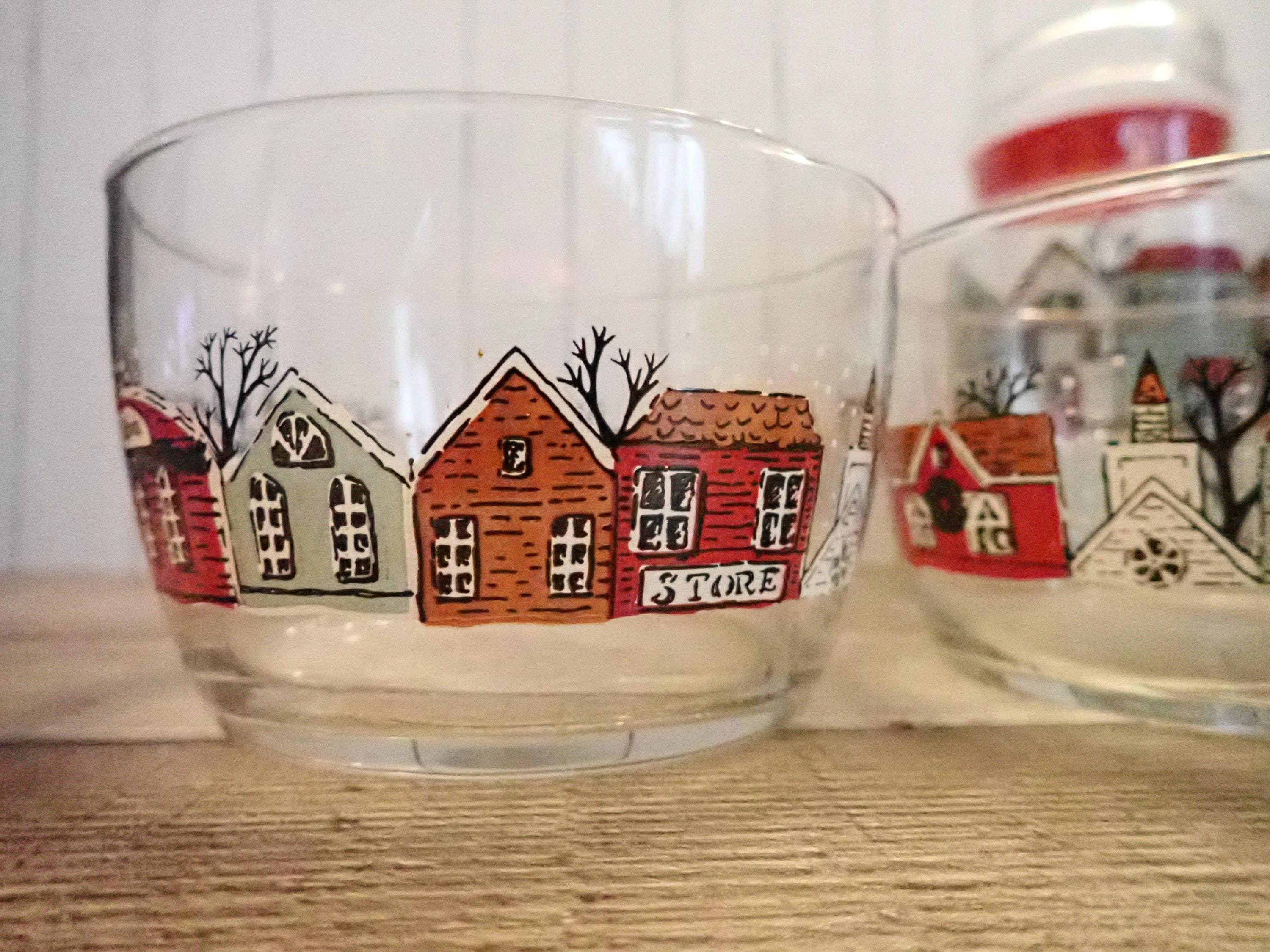 This fun glass canister and bowl set includes a matching canister and 2 candy bowls. The glass canister is 4" in diameter and 7" tall with the lid on. The canister is a clear glass and has a red, green, and brown winter village scene around the canister. The candy bowls are 4.25" in diameter and 3" tall and have the same village pattern. The canister lid has a red plastic seal around the bottom for a snug fit. The canister and bowls are all in very good condition with no chips or cracks. All of the graphics are bright and clear. Great little canister and bowl set for Christmas candy!