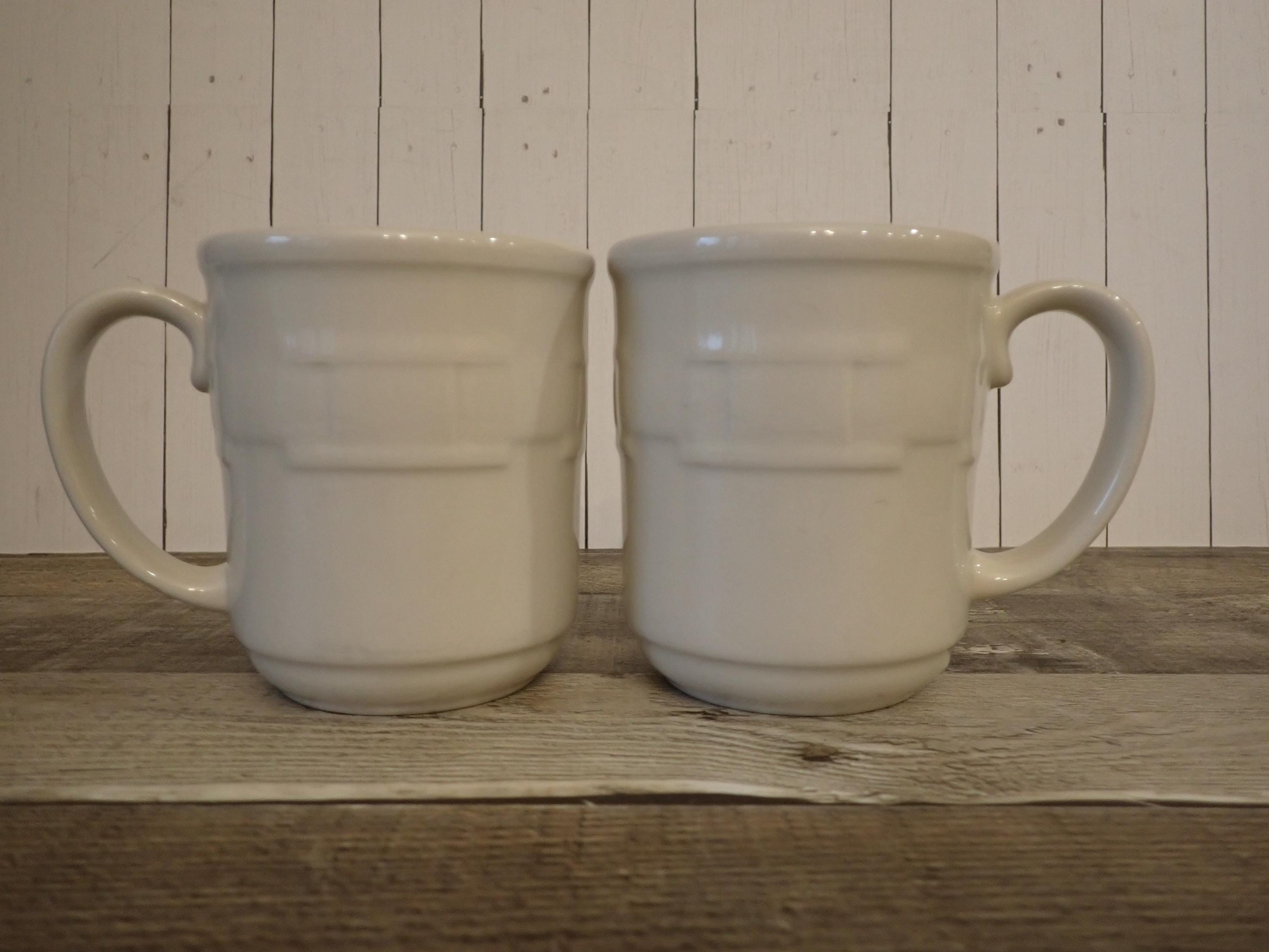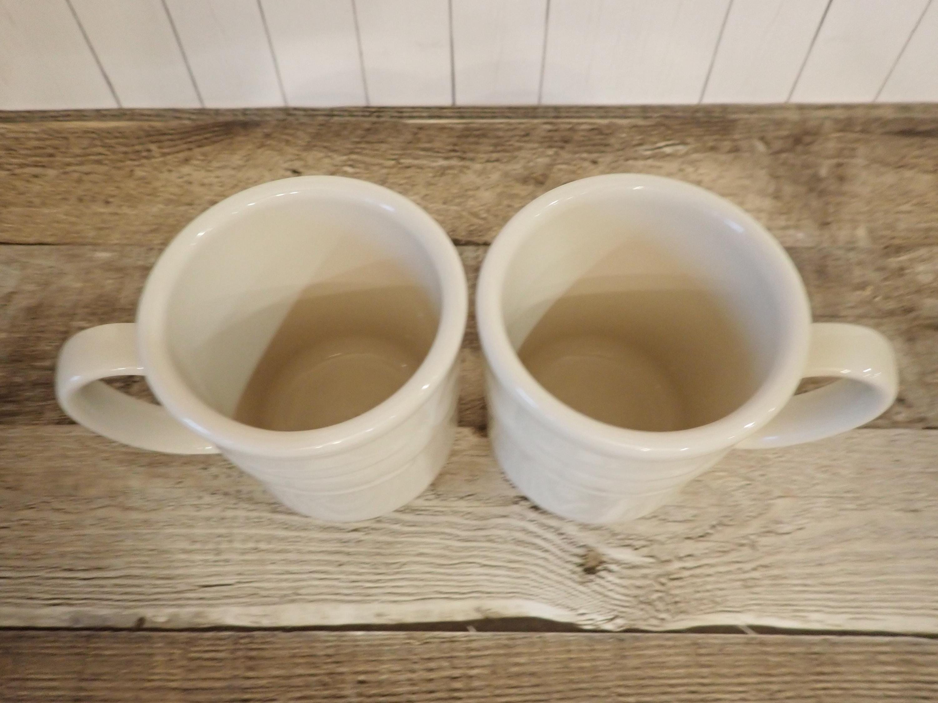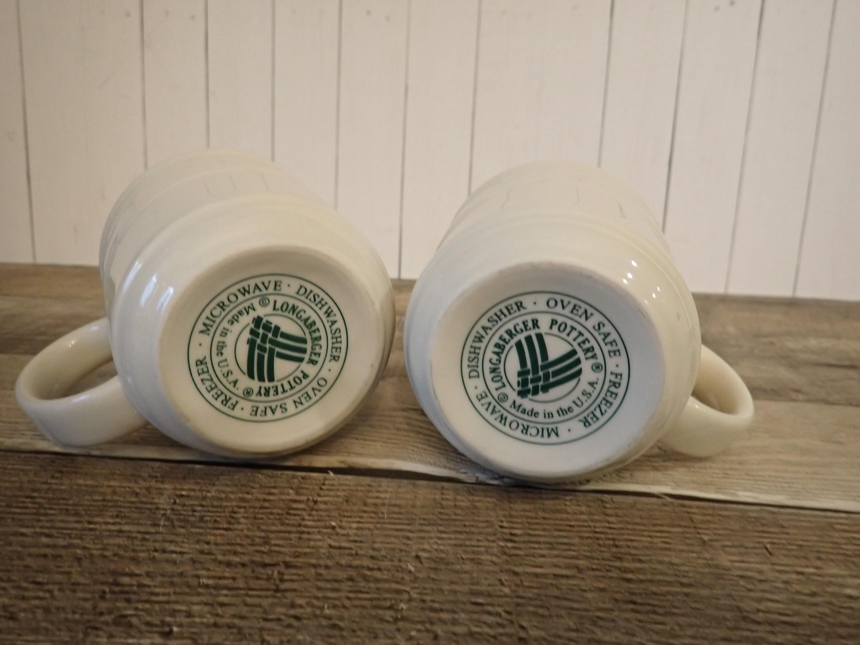 This set of 2 white mugs by Longaberger Pottery are in the Woven Traditions Ivory pattern. They are the 12 oz mugs and are 4" tall and 3.5" in diameter. The mug is white with a woven textured design and small green flower accents. The bottom is marked: LONGABERGER POTTERY / MADE IN USA / DISHWASHER OVEN SAFE FREEZER MICROWAVE. Both mugs are in very good condition with no chips or cracks.