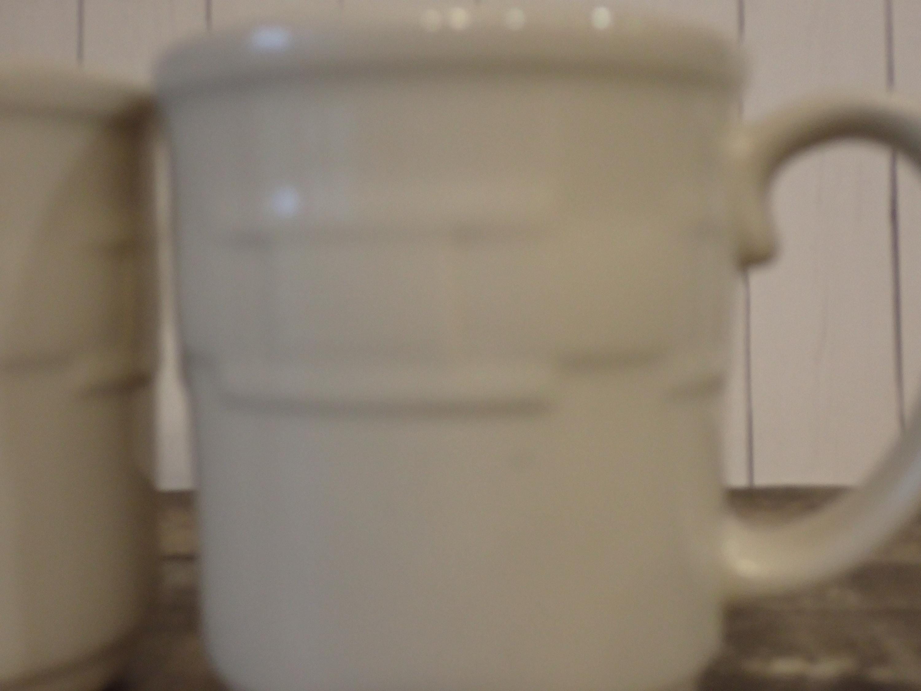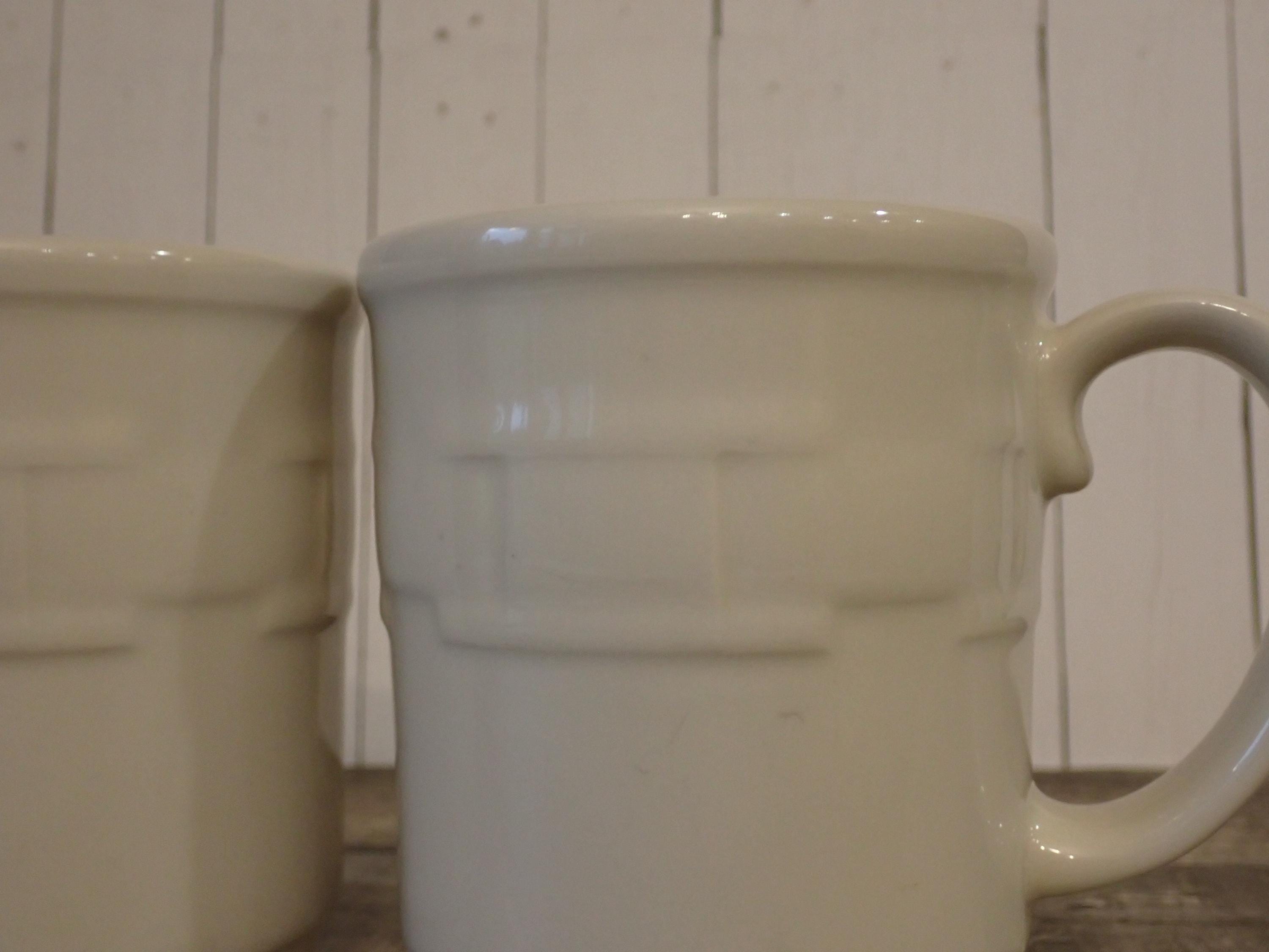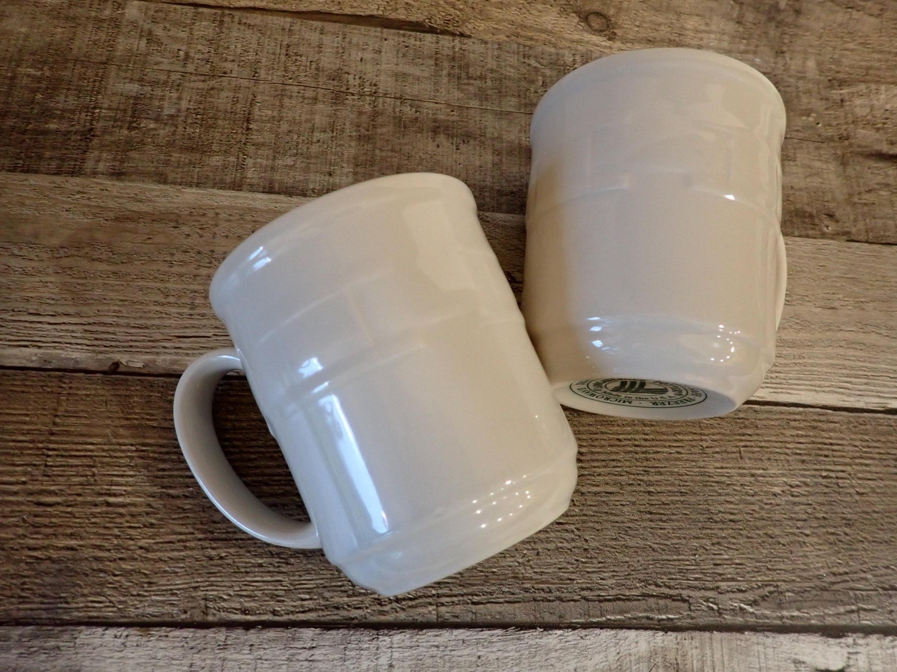 This set of 2 white mugs by Longaberger Pottery are in the Woven Traditions Ivory pattern. They are the 12 oz mugs and are 4" tall and 3.5" in diameter. The mug is white with a woven textured design and small green flower accents. The bottom is marked: LONGABERGER POTTERY / MADE IN USA / DISHWASHER OVEN SAFE FREEZER MICROWAVE. Both mugs are in very good condition with no chips or cracks.