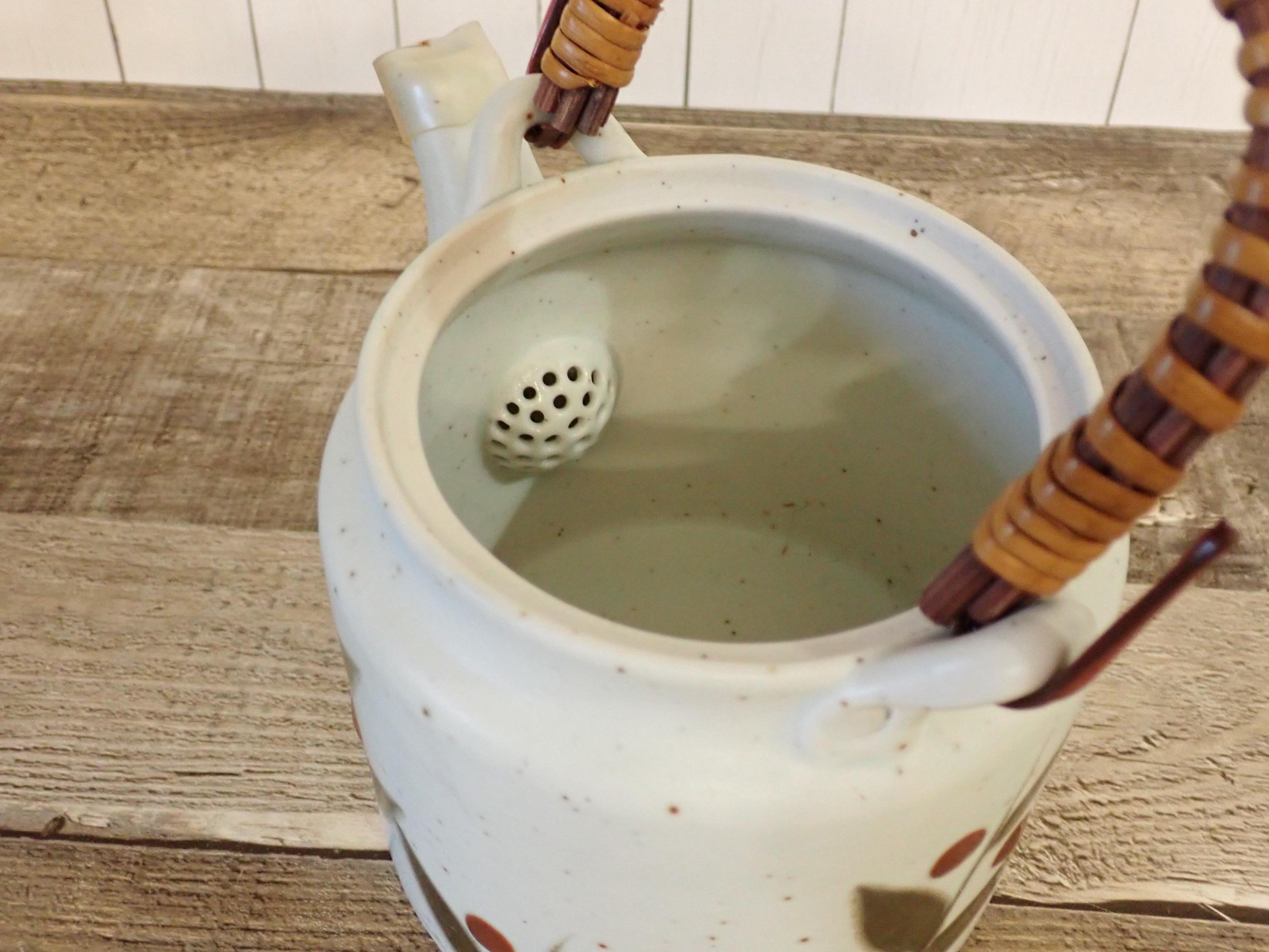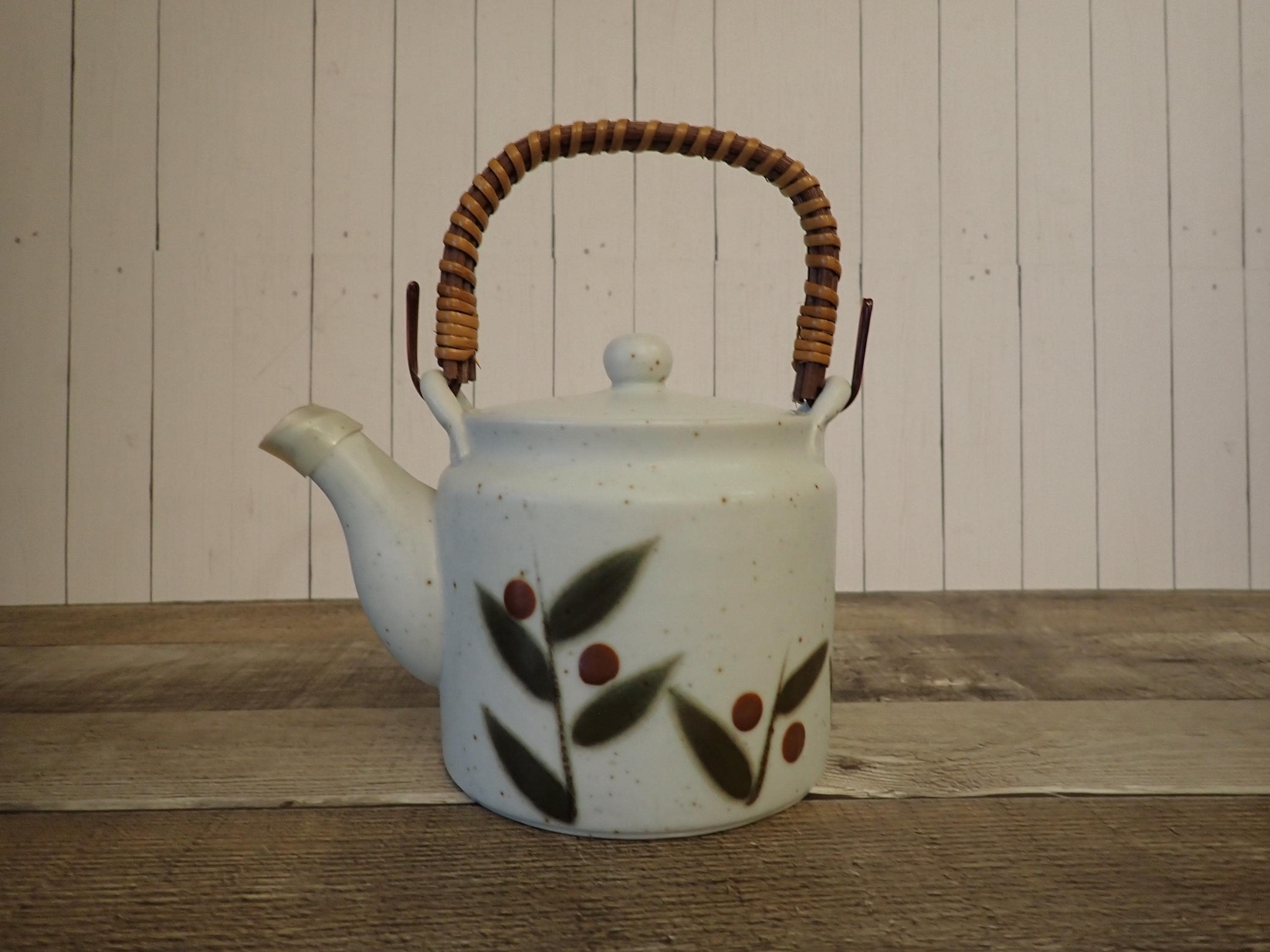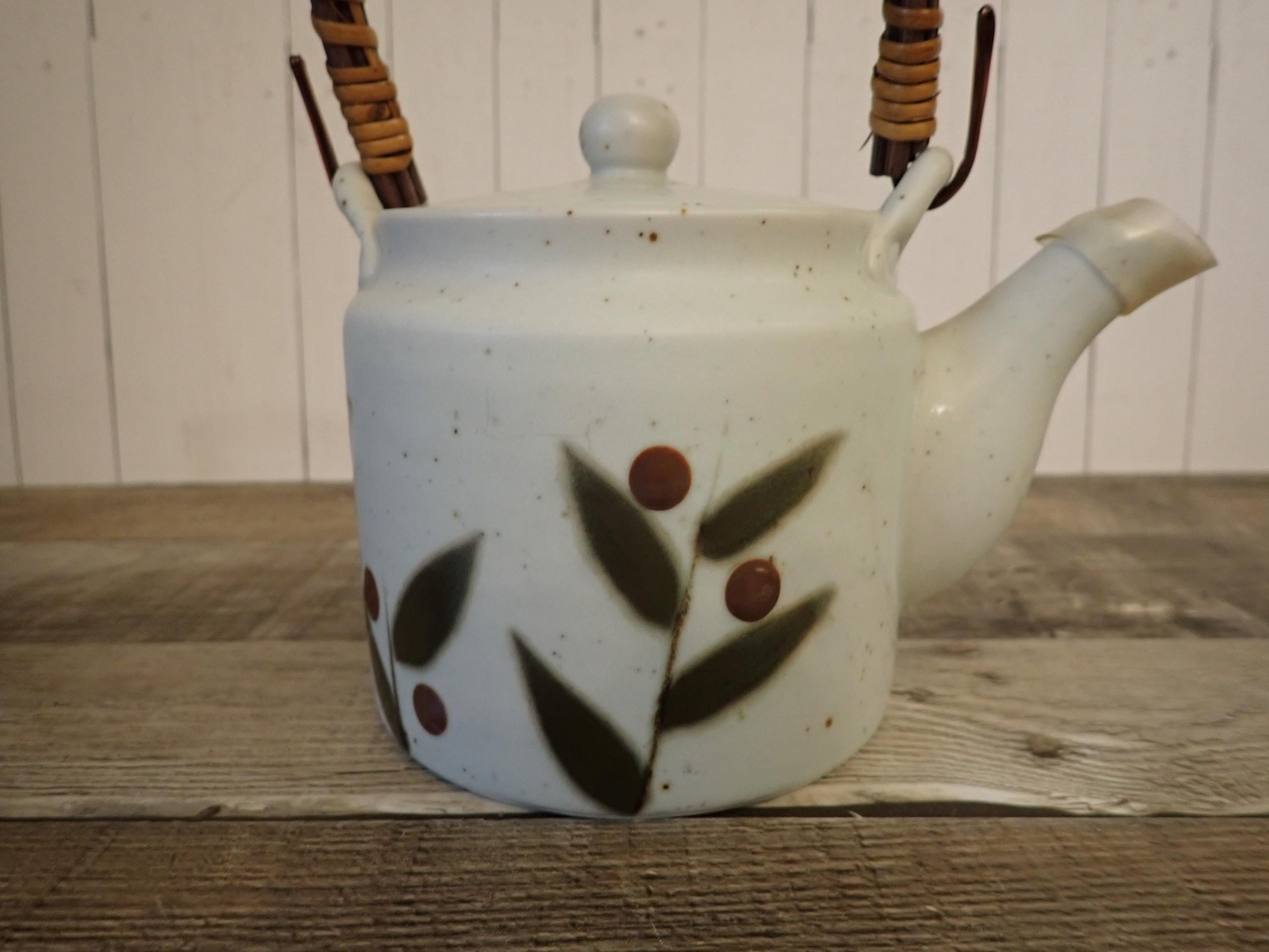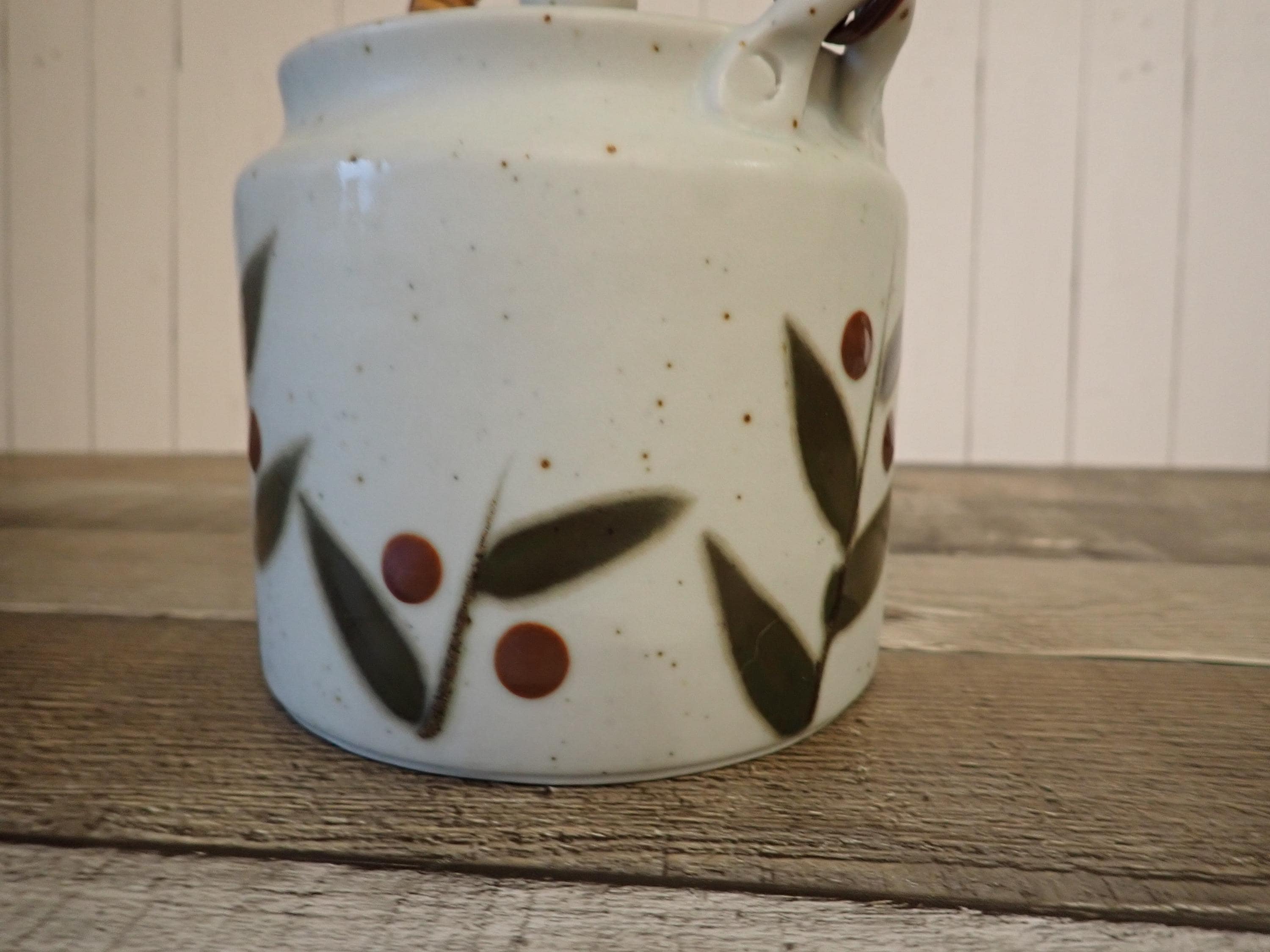 This stoneware teapot by Otagiri is in the Bittersweet pattern. The teapot is 4.5" tall (8" tall with the handle) and is 4.75" in diameter. It is a gray stoneware piece with green leaves and red berries around the teapot. The teapot has it's original lid, and has a metal handle that is wrapped in wicker. The tip of the spout has an original rubber sleeve to protect against chipping. The teapot is in very good condition with no chips or cracks, and the inside of the pot is very clean with no staining.