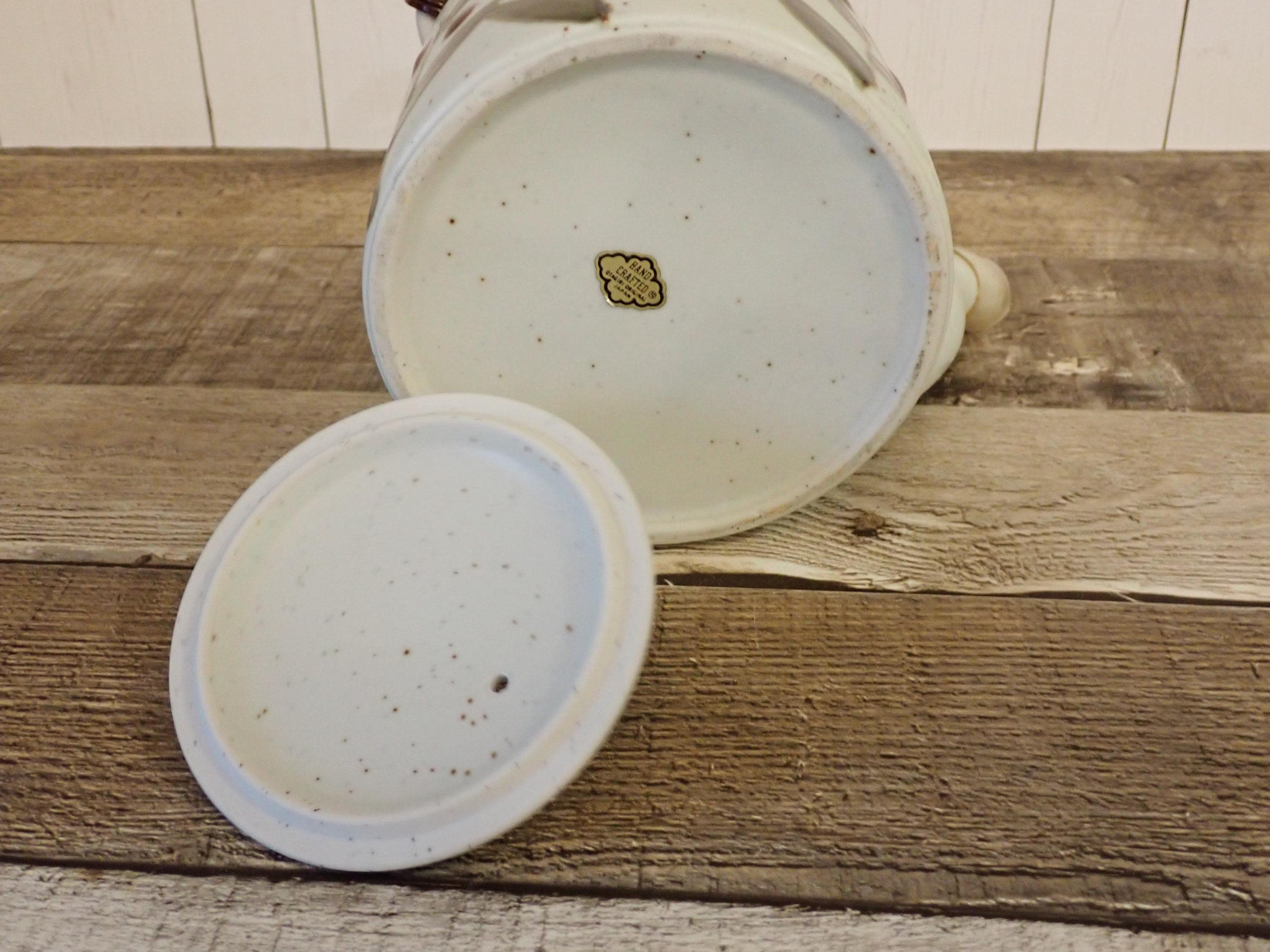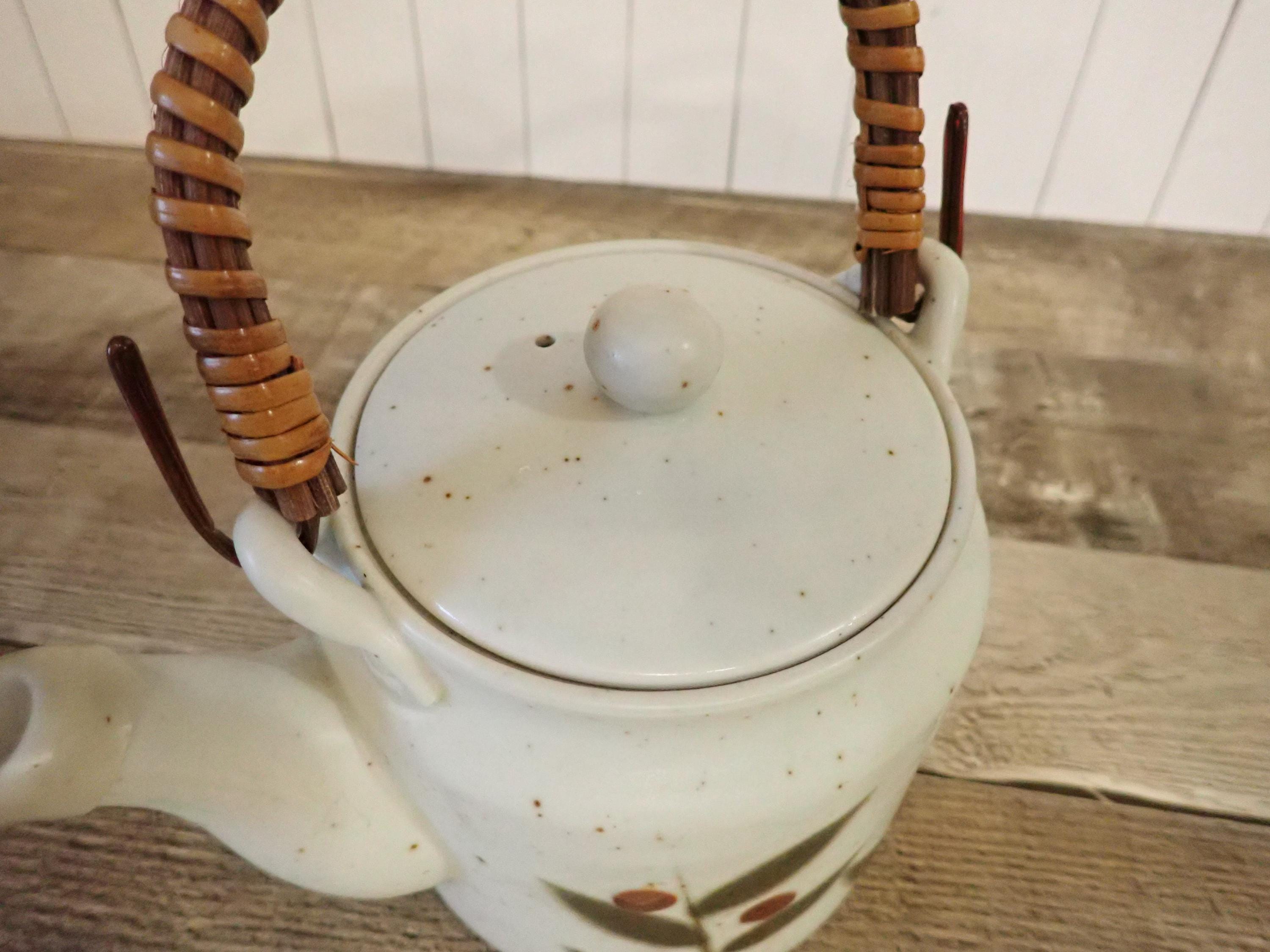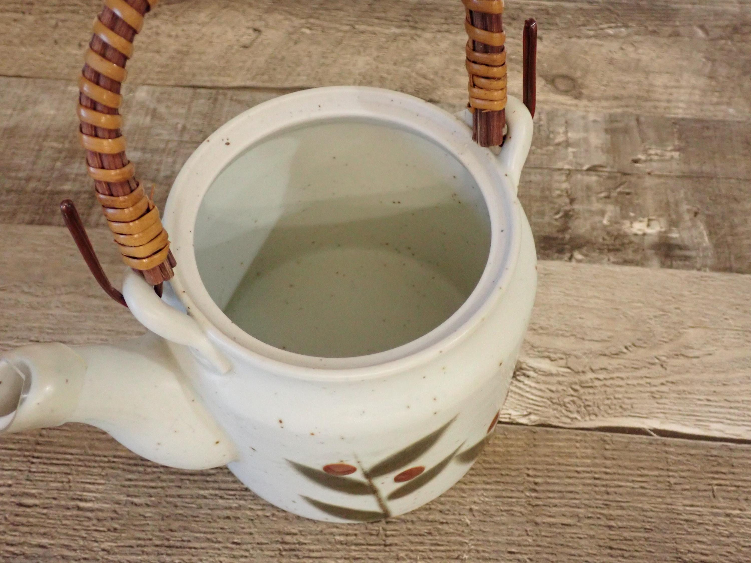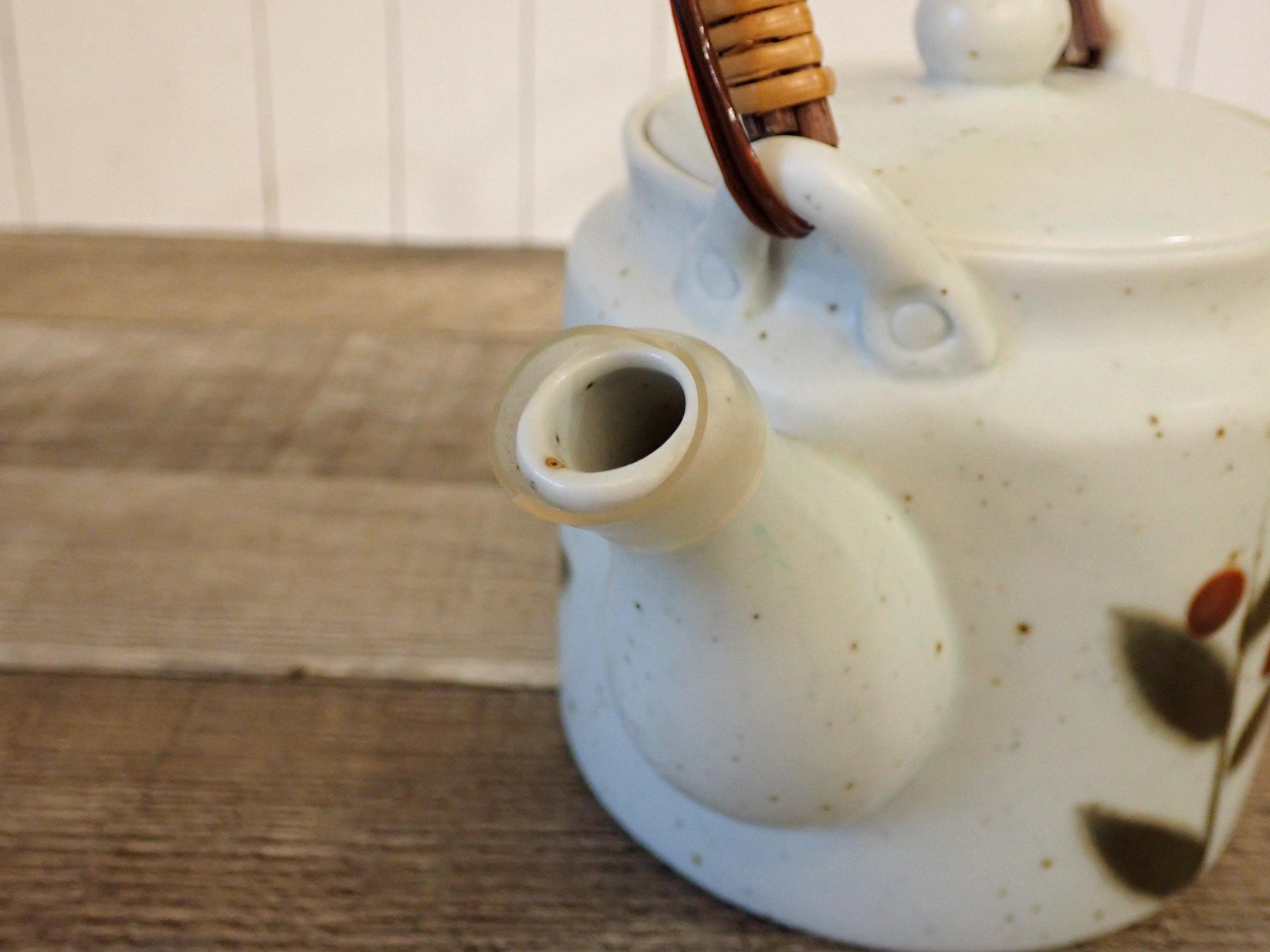 This stoneware teapot by Otagiri is in the Bittersweet pattern. The teapot is 4.5" tall (8" tall with the handle) and is 4.75" in diameter. It is a gray stoneware piece with green leaves and red berries around the teapot. The teapot has it's original lid, and has a metal handle that is wrapped in wicker. The tip of the spout has an original rubber sleeve to protect against chipping. The teapot is in very good condition with no chips or cracks, and the inside of the pot is very clean with no staining.