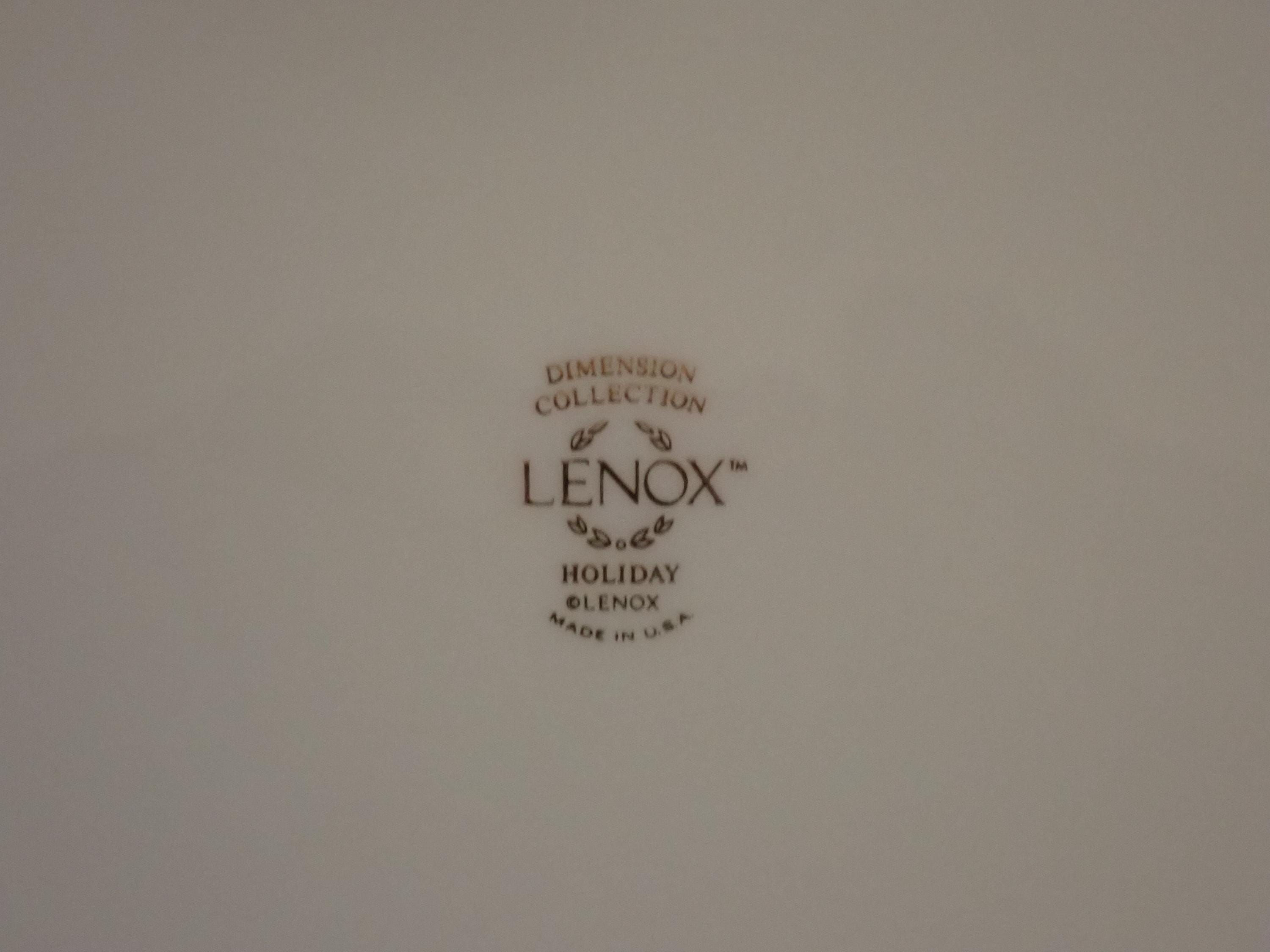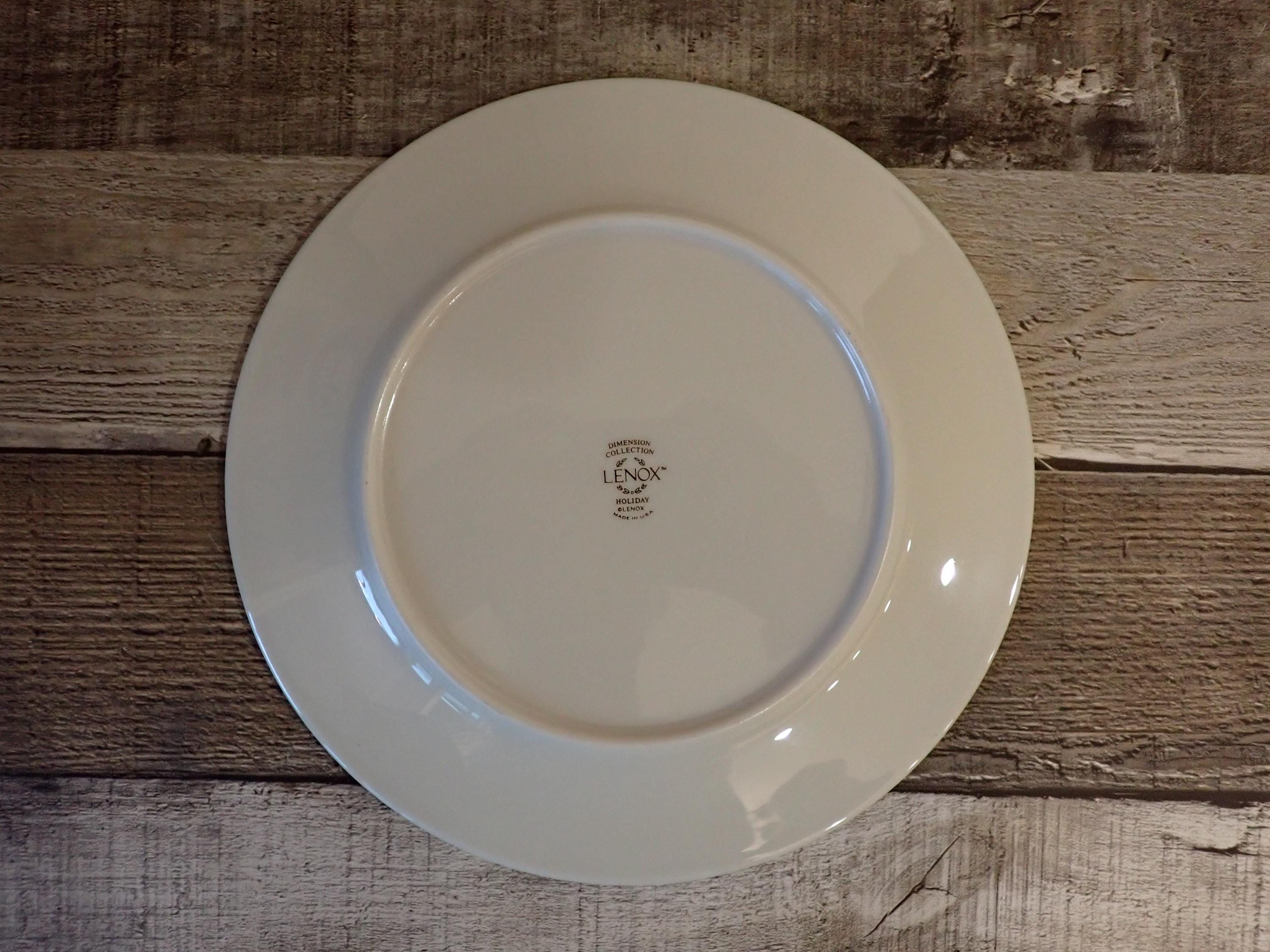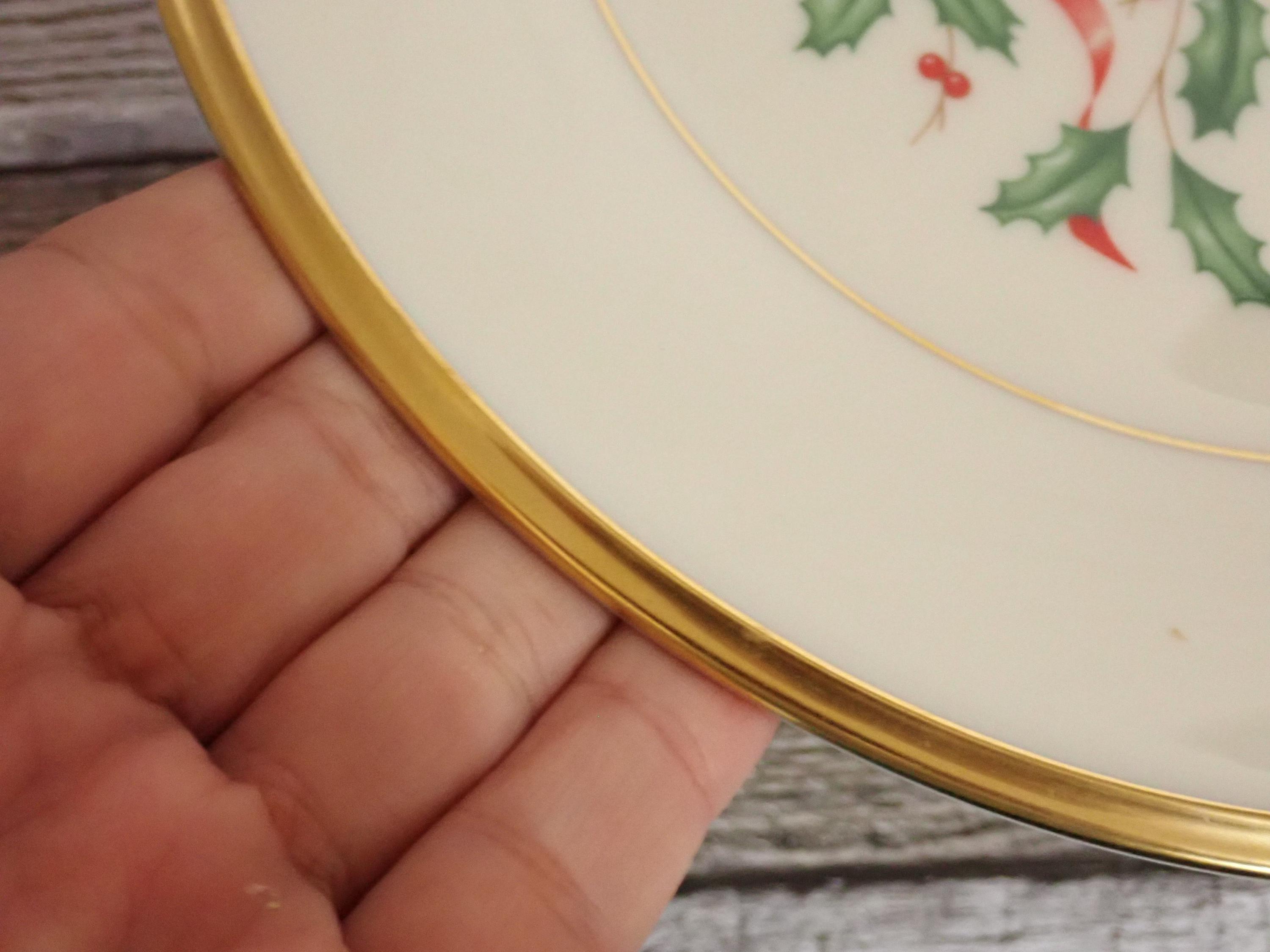 This set of 6 plates by Lenox are in the Holiday Gold - Red Ribbon Accent pattern and are a cream-colored ceramic with green holly and red berries, and a red ribbon. There is a gold band around the rim and down the handle. The plates are 8" in diameter. They are marked DIMENSION COLLECTION / LENOX / HOLIDAY / MADE IN USA on the bottoms. All 6 plates are in excellent condition with no chips or cracks and no visible surface scratches. The graphics are bright and clear. There are 2 sets of 6 plates available if you are looking for a set of 12.