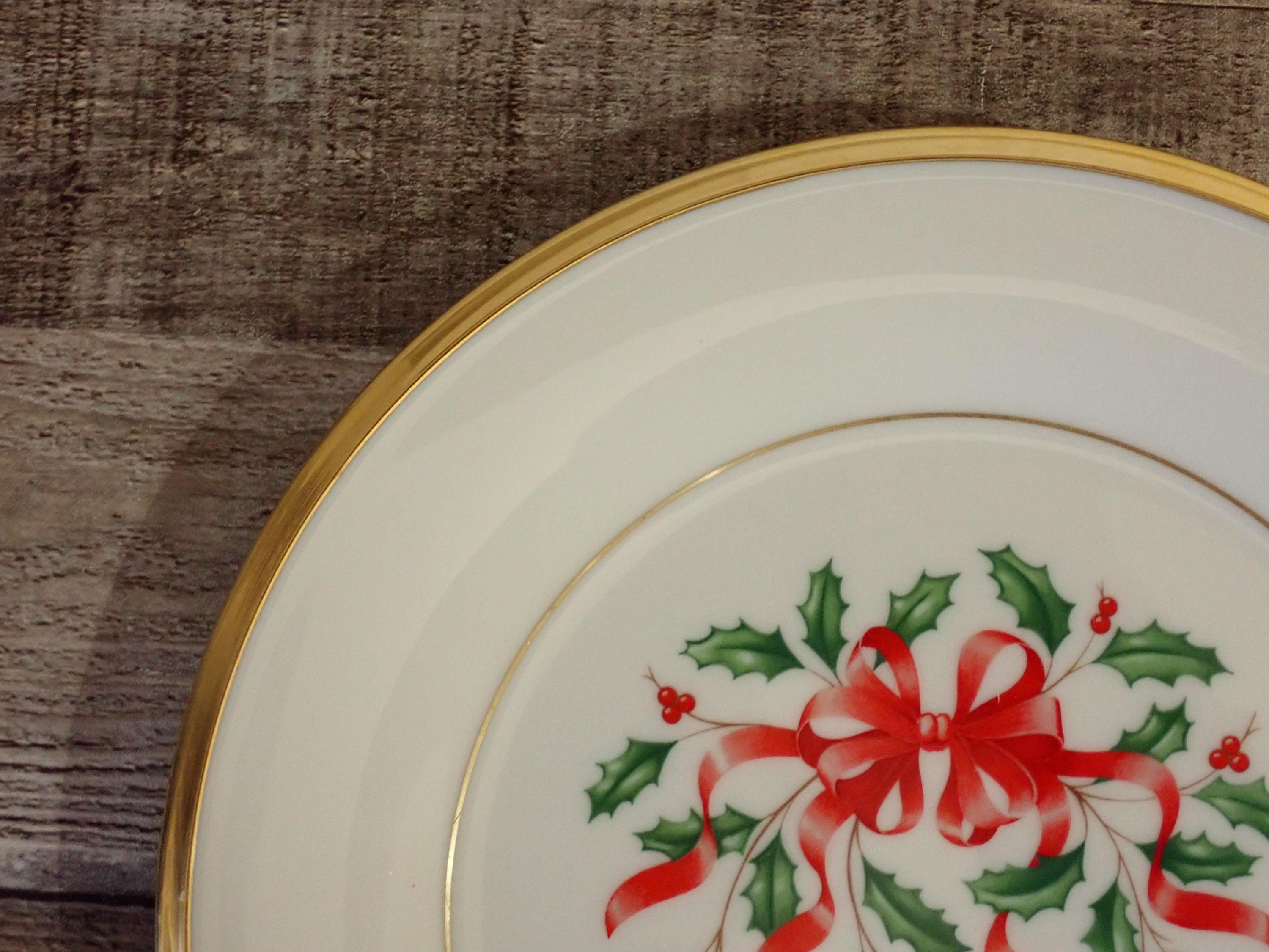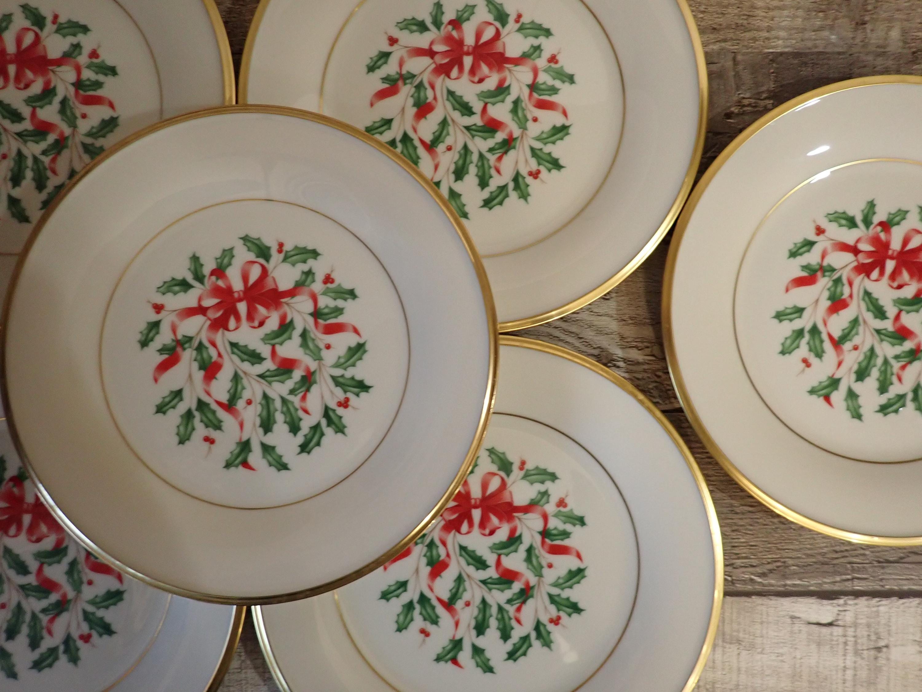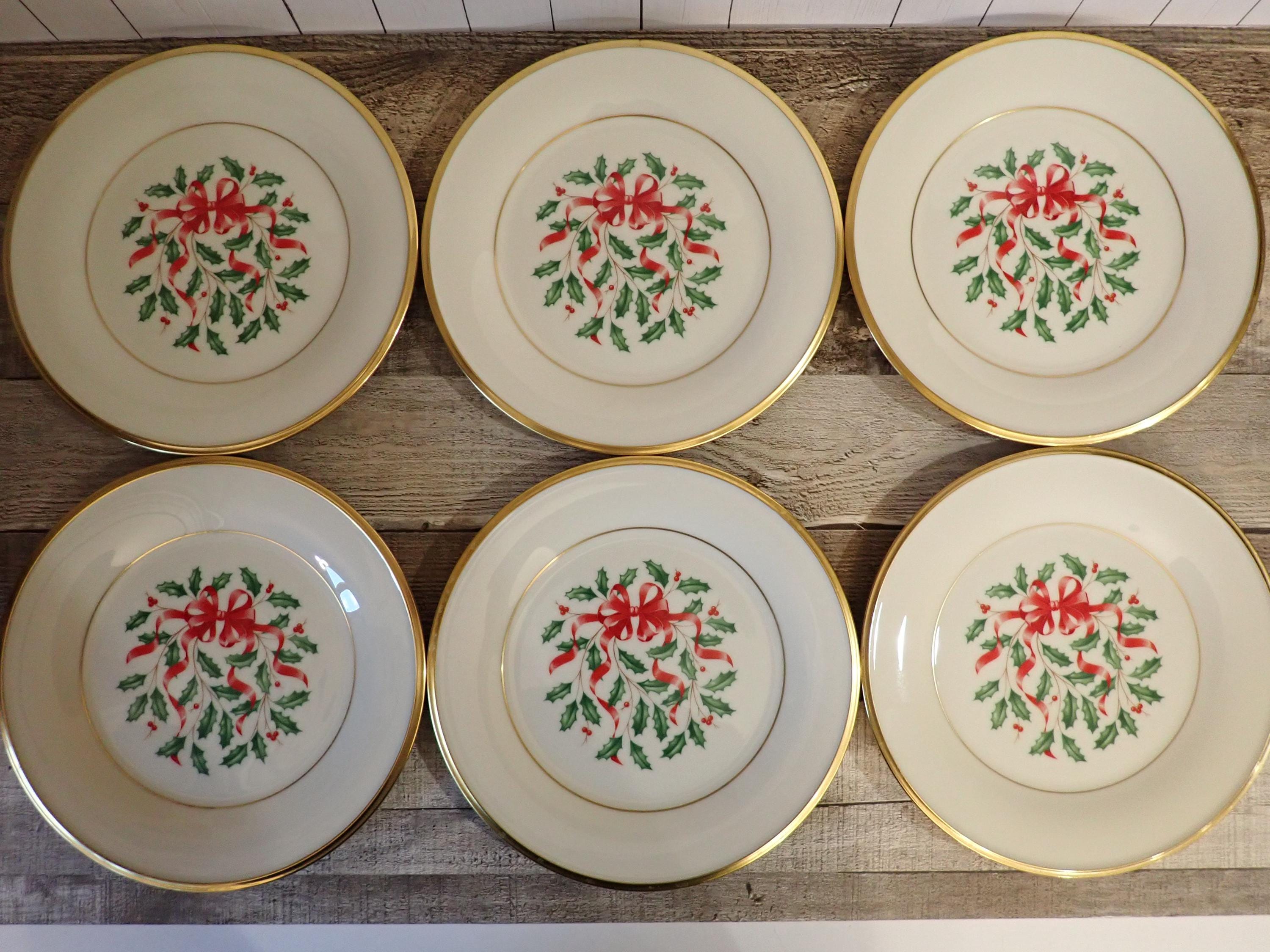This set of 6 plates by Lenox are in the Holiday Gold - Red Ribbon Accent pattern and are a cream-colored ceramic with green holly and red berries, and a red ribbon. There is a gold band around the rim and down the handle. The plates are 8" in diameter. They are marked DIMENSION COLLECTION / LENOX / HOLIDAY / MADE IN USA on the bottoms. All 6 plates are in excellent condition with no chips or cracks and no visible surface scratches. The graphics are bright and clear. There are 2 sets of 6 plates available if you are looking for a set of 12.