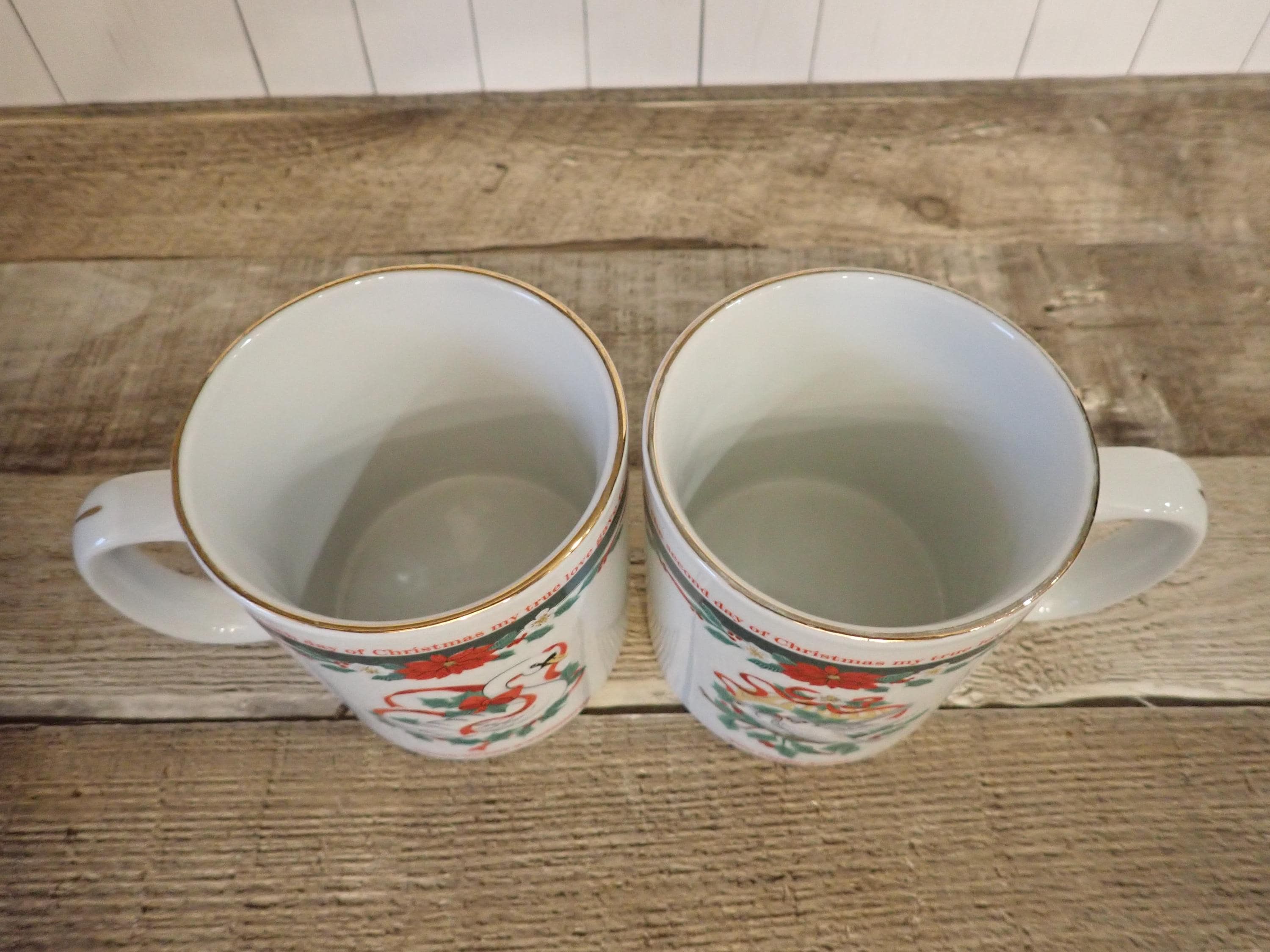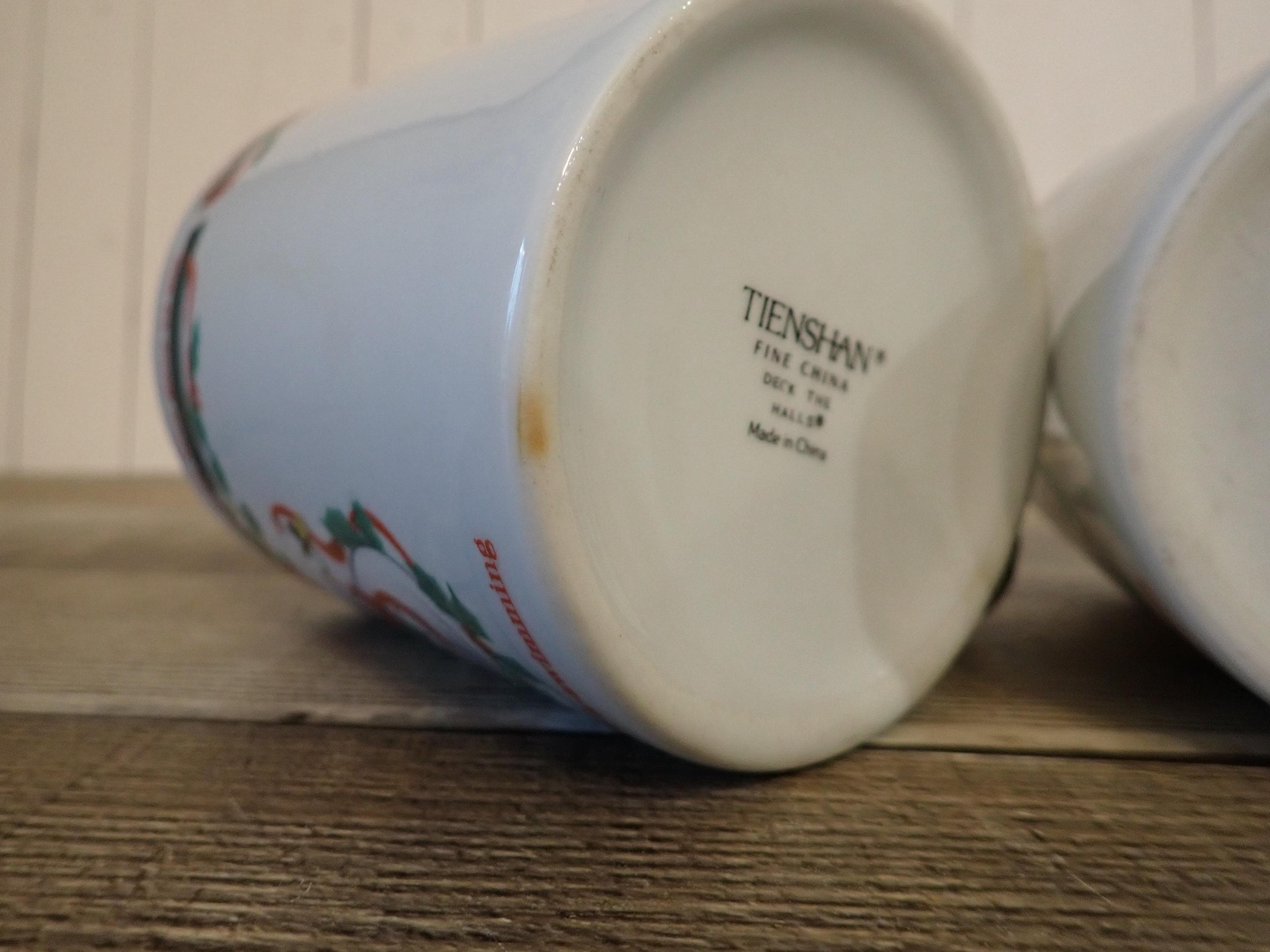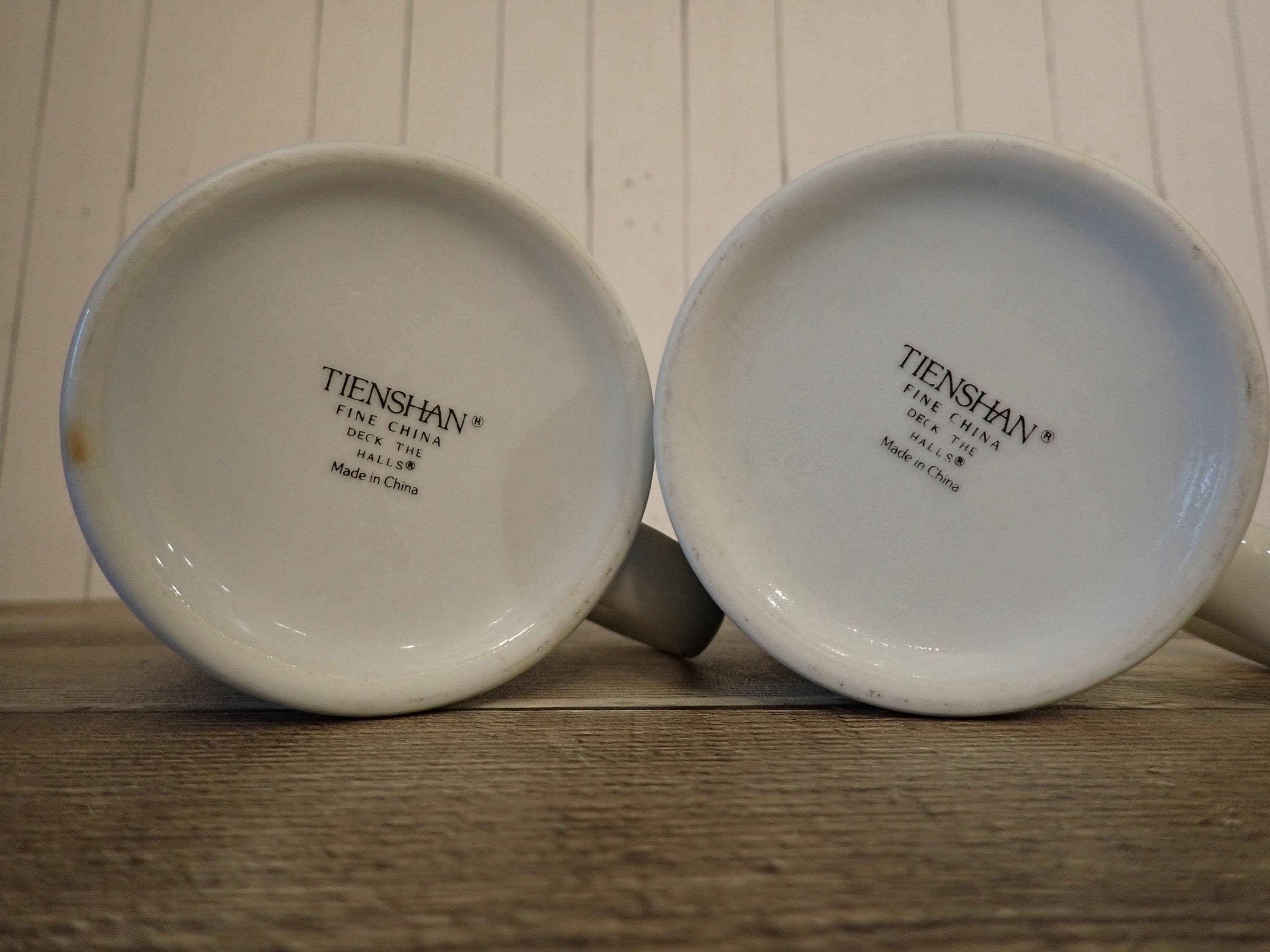These set of 2 mugs by Tienshan are in the Deck the Halls pattern and are two of the Twelve Days of Christmas mugs - the second and seventh day mugs. Each mug is 4 tall and 3.5" in diameter, and are a white ceramic with a red poinsettia and green holly leaf design around the rim. One mug shows two turtle doves and the other has a swan for the 7 swans a swimming. The bottoms are marked: TIENSHAN / FINE CHINA / DECK THE HALLS / Made in China. Both mugs are in very good condition with no chips or cracks, however one mug dos have a rust stain along the bottom edge as shown in the last photo.