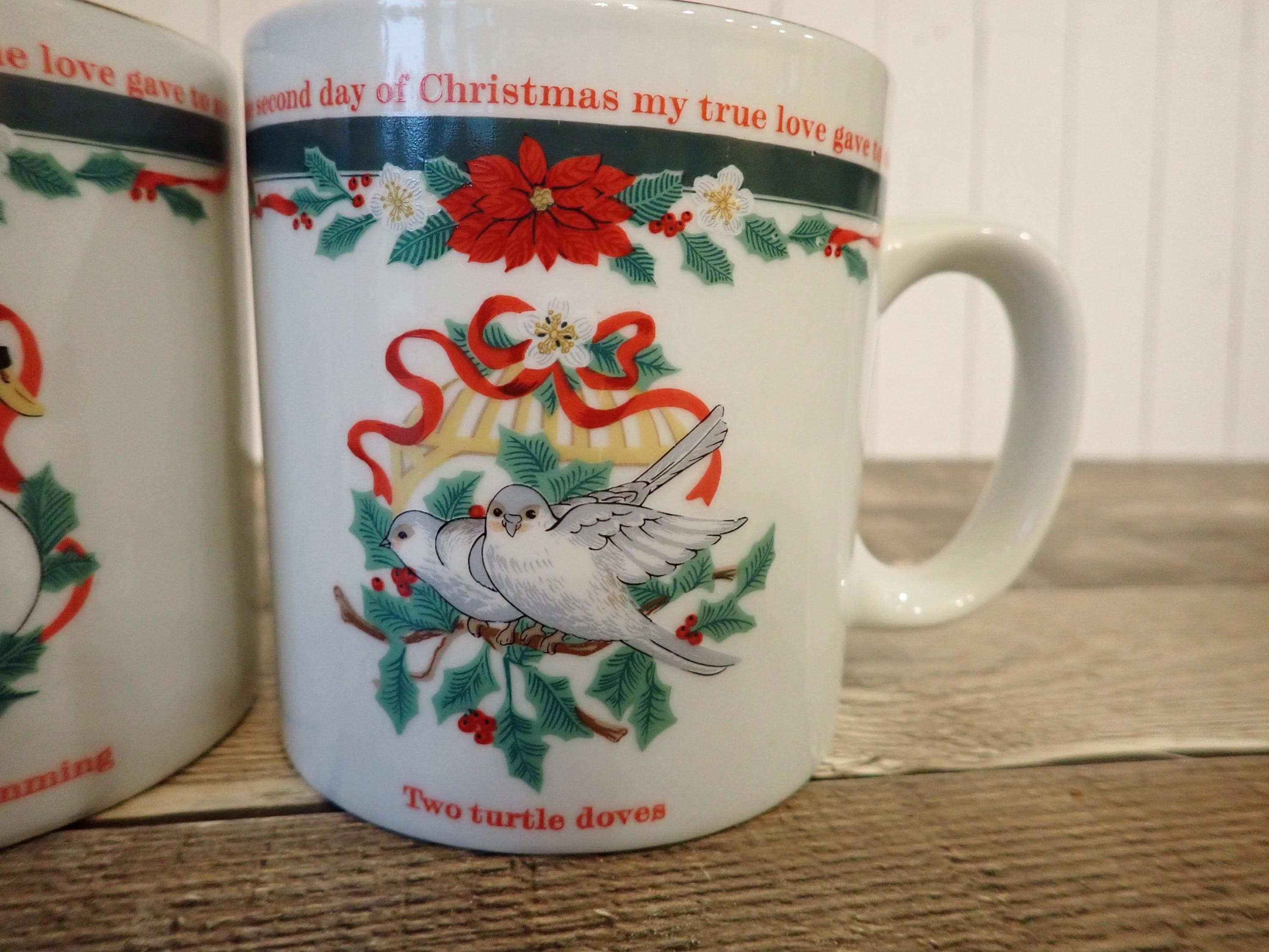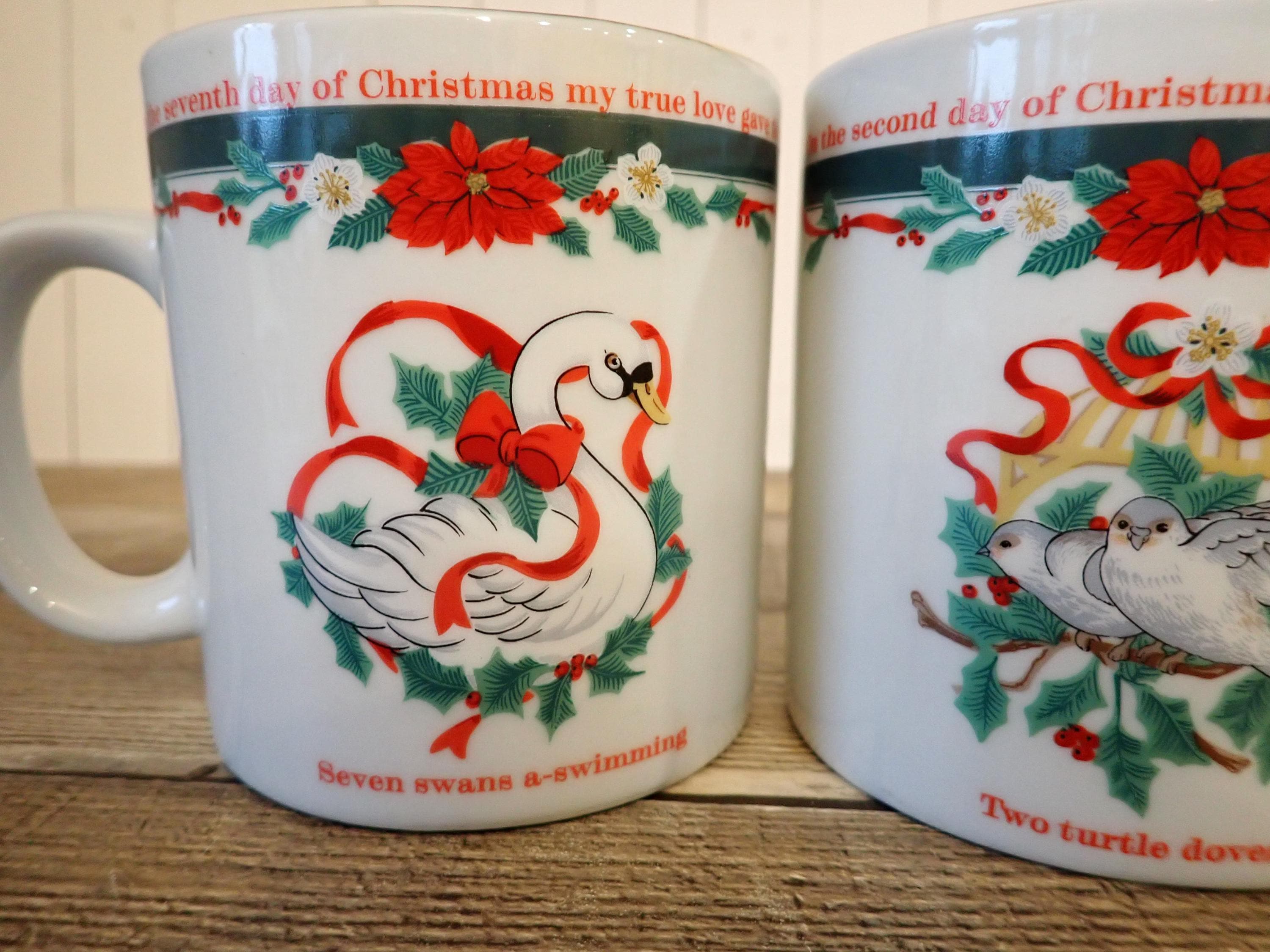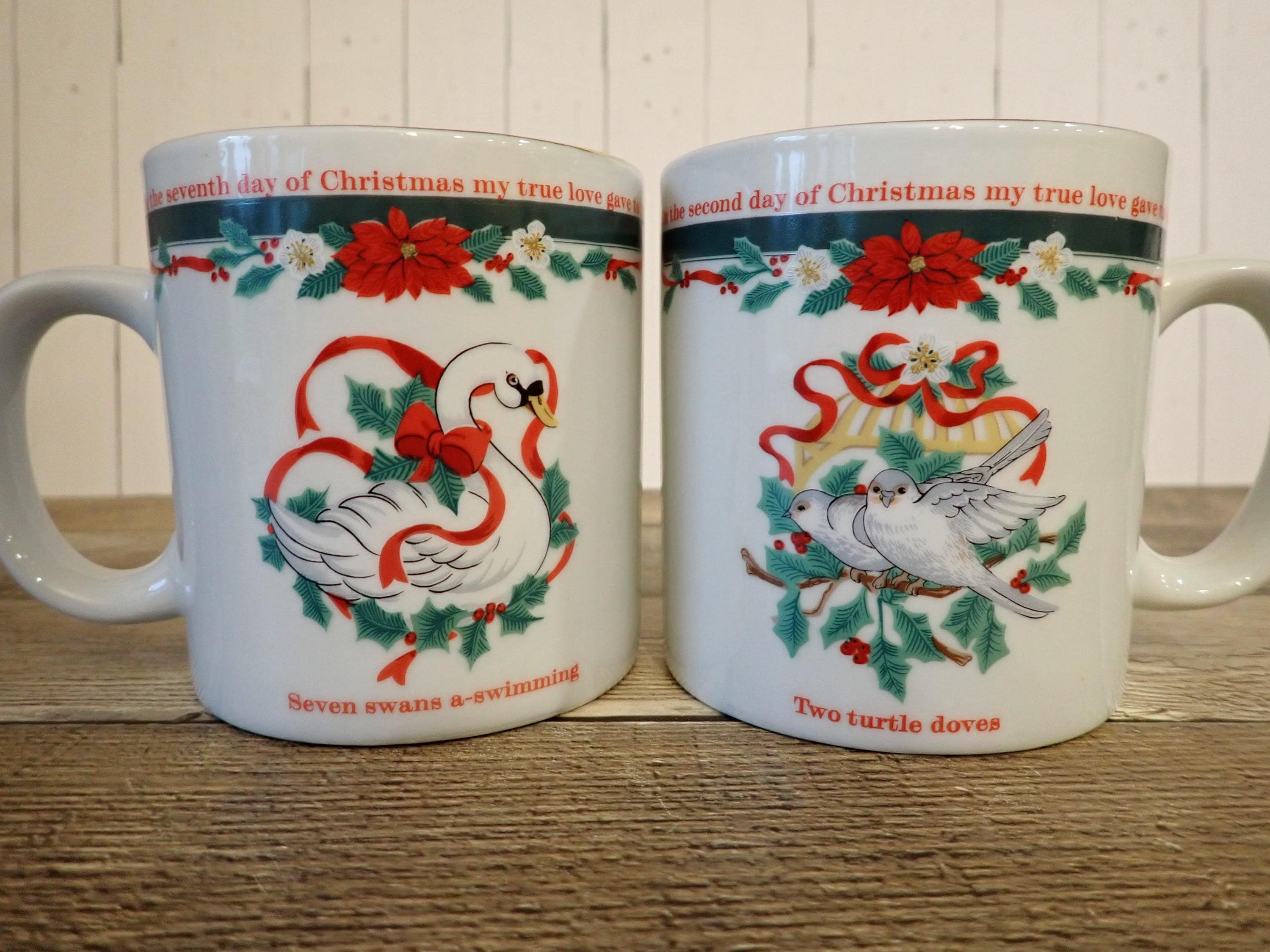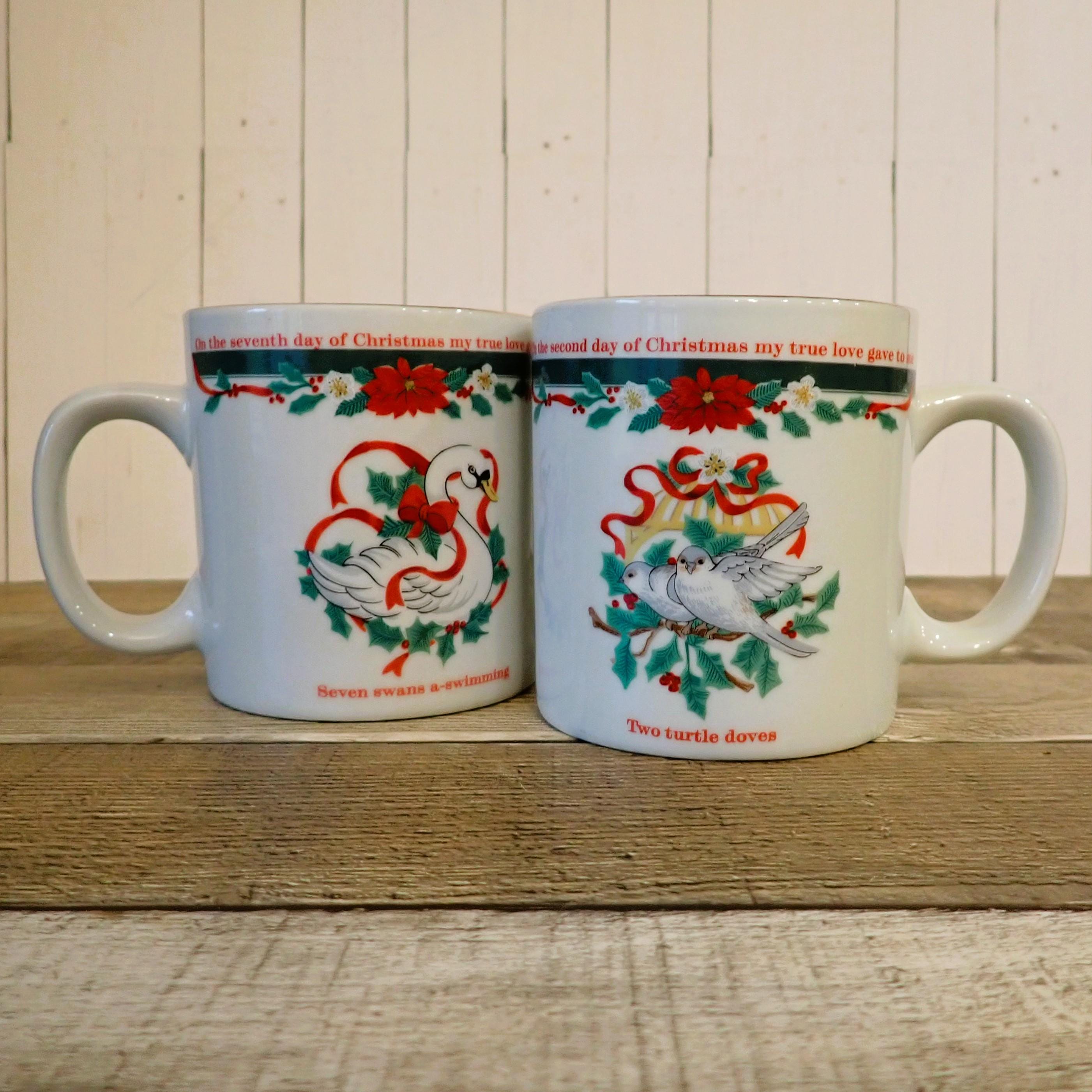 These set of 2 mugs by Tienshan are in the Deck the Halls pattern and are two of the Twelve Days of Christmas mugs - the second and seventh day mugs. Each mug is 4 tall and 3.5" in diameter, and are a white ceramic with a red poinsettia and green holly leaf design around the rim. One mug shows two turtle doves and the other has a swan for the 7 swans a swimming. The bottoms are marked: TIENSHAN / FINE CHINA / DECK THE HALLS / Made in China. Both mugs are in very good condition with no chips or cracks, however one mug dos have a rust stain along the bottom edge as shown in the last photo.