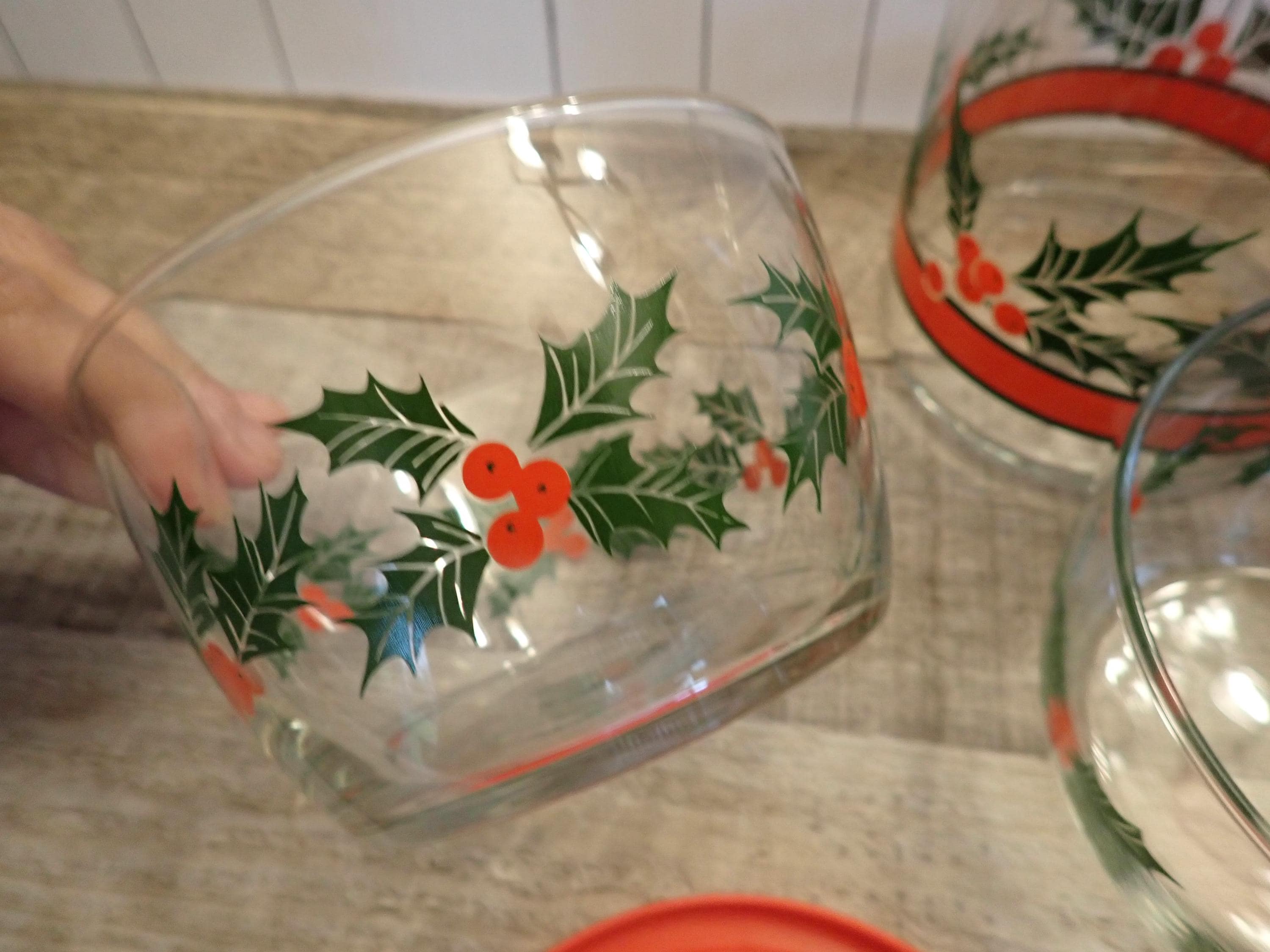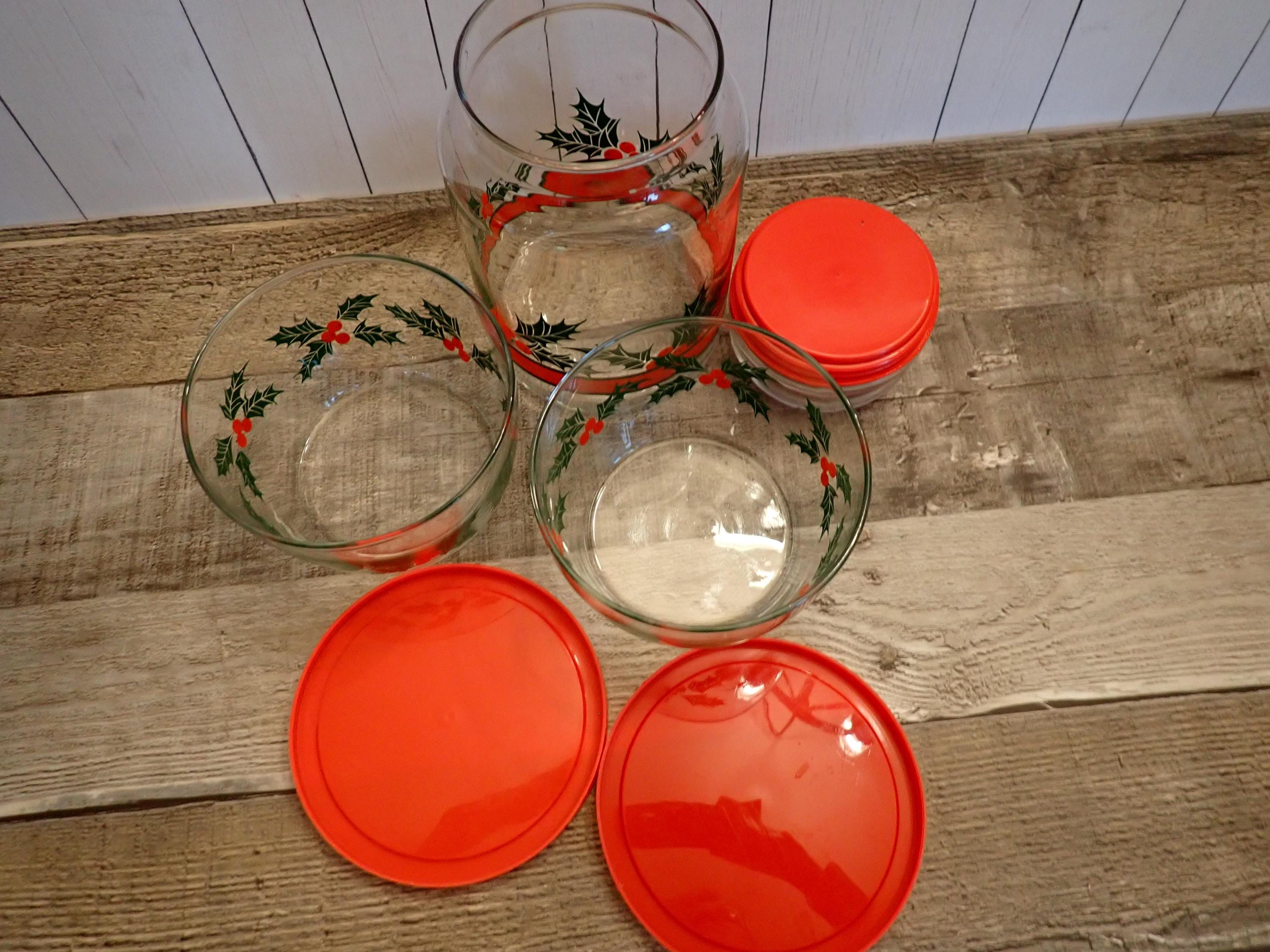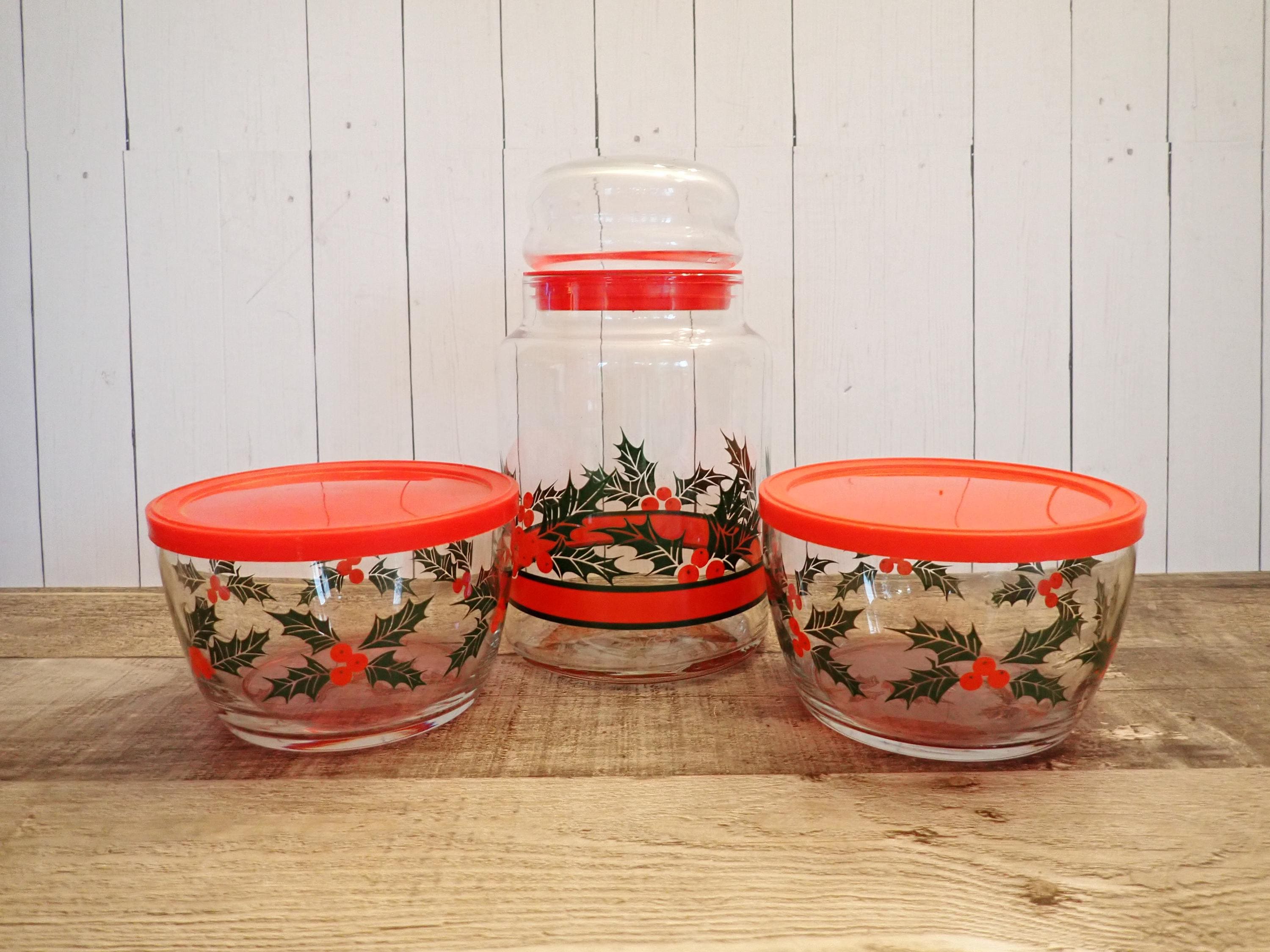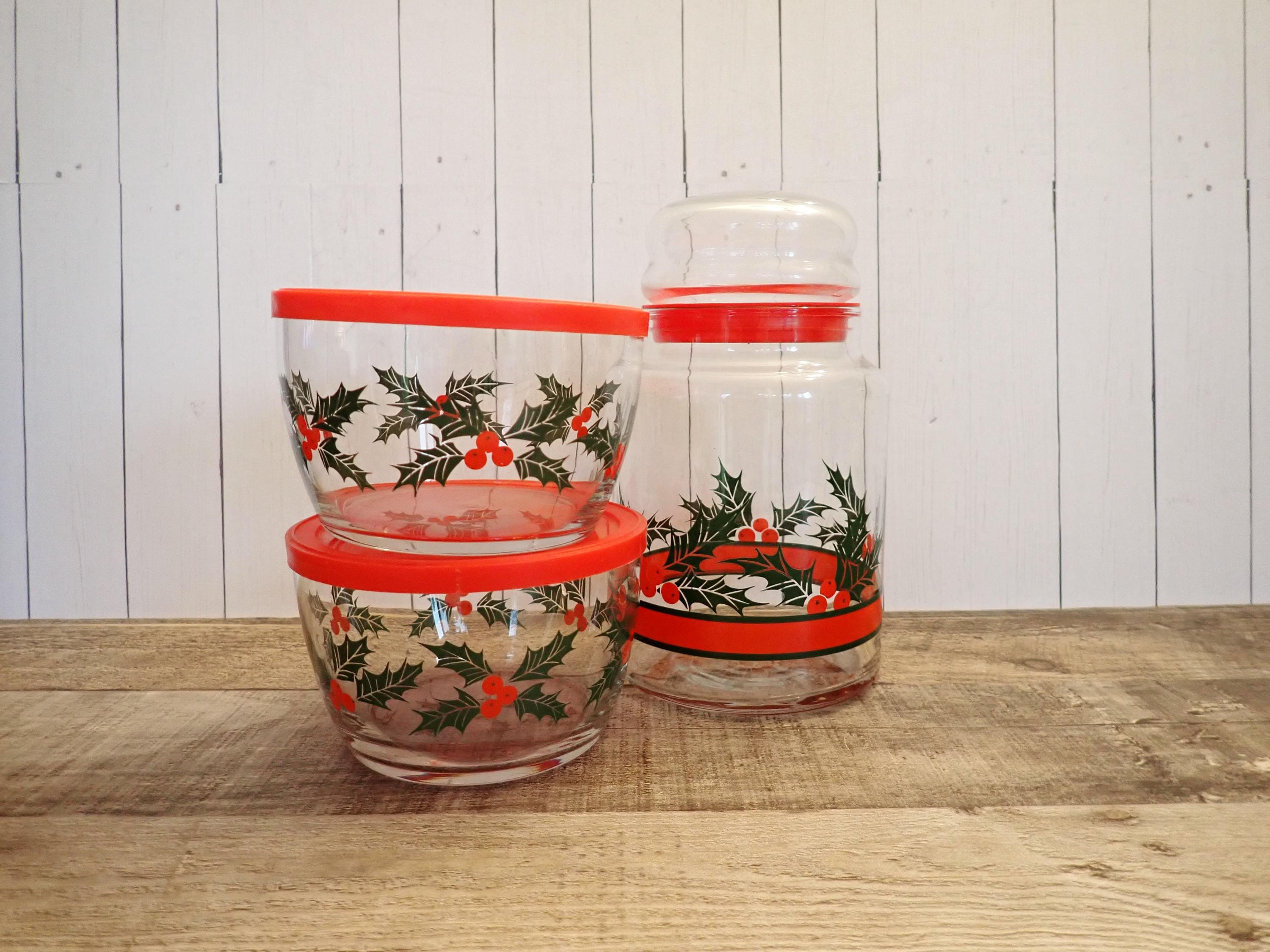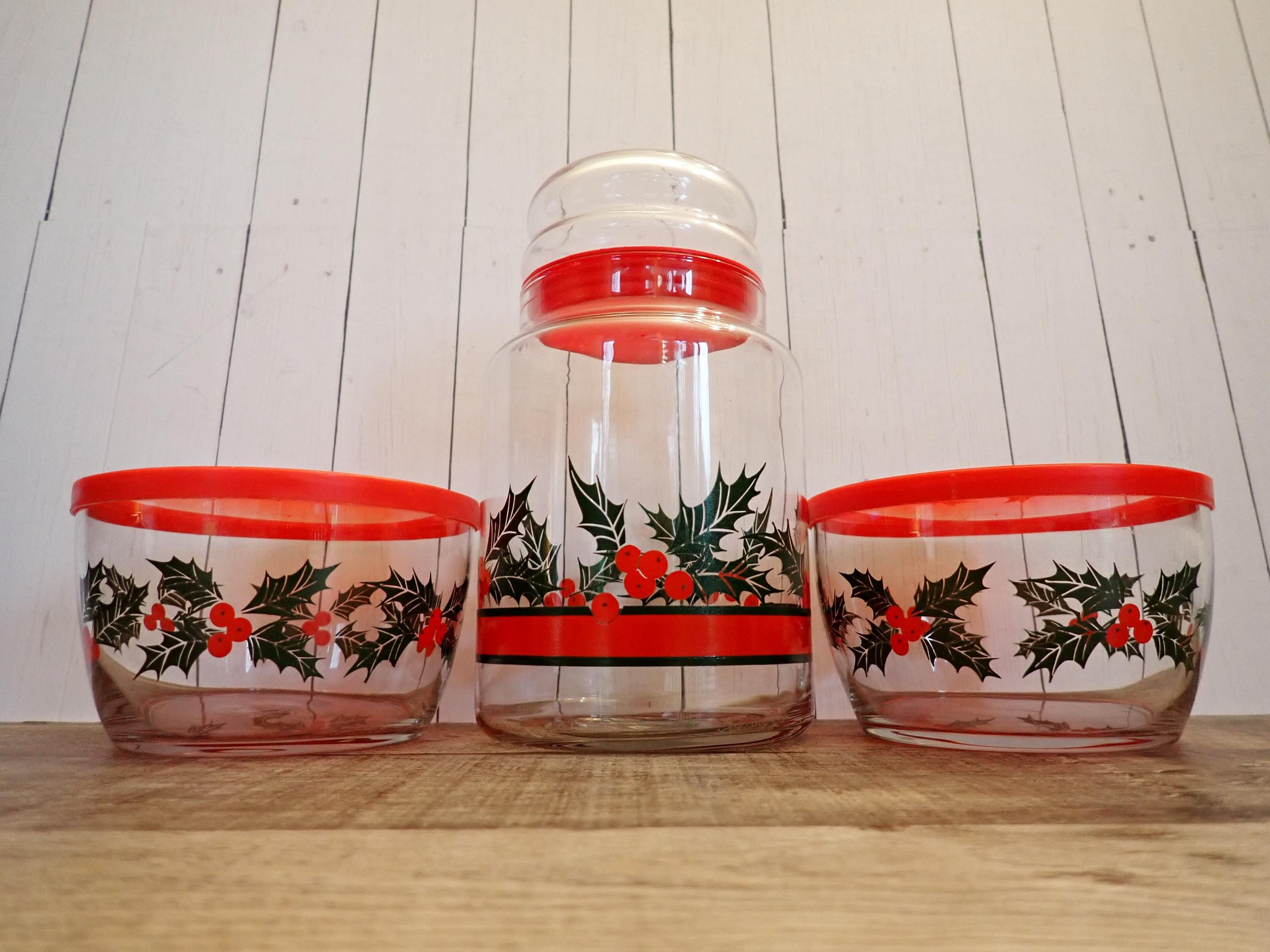 This fun glass canister and bowl set includes a matching canister and 2 candy bowls with plastic lids. The glass canister is 4" in diameter and 7" tall with the lid on. The canister is a clear glass and has a red and green holly and berry design around the canister. The candy bowls are 4.25" in diameter and 3" tall and have the same holly and berry pattern. The canister lid has a red plastic seal around the bottom for a snug fit. The bowls included red plastic lids as well. The canister and bowls are all in very good condition with no chips or cracks. All of the graphics are bright and clear. Great little canister and bowl set for Christmas candy!