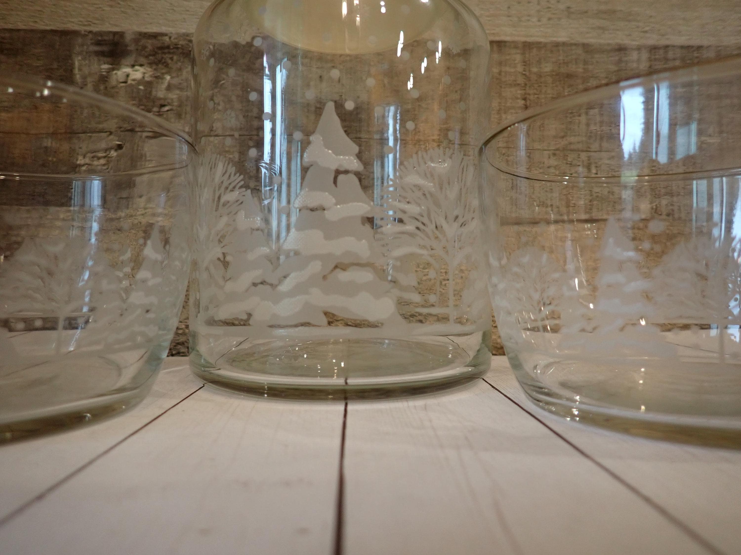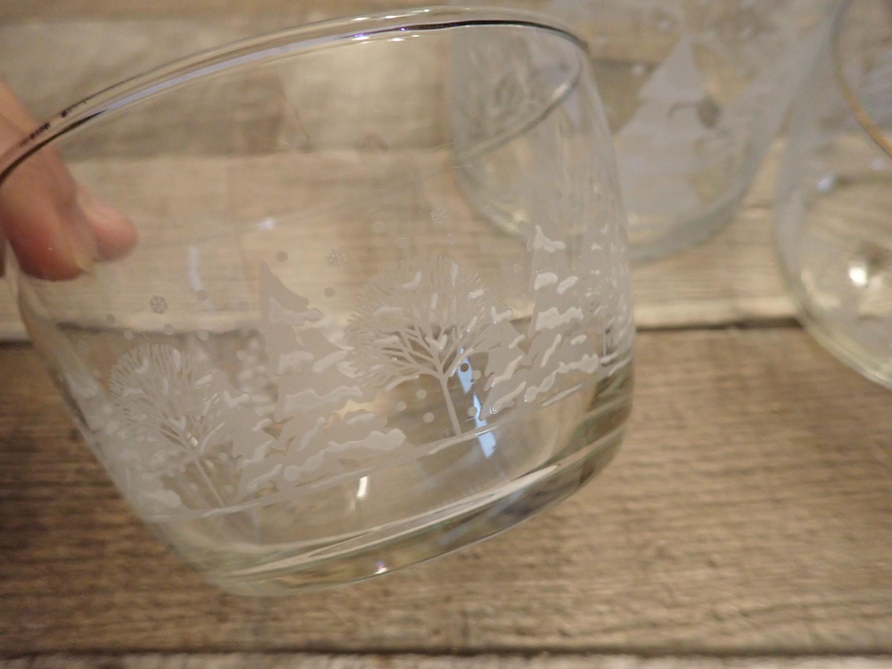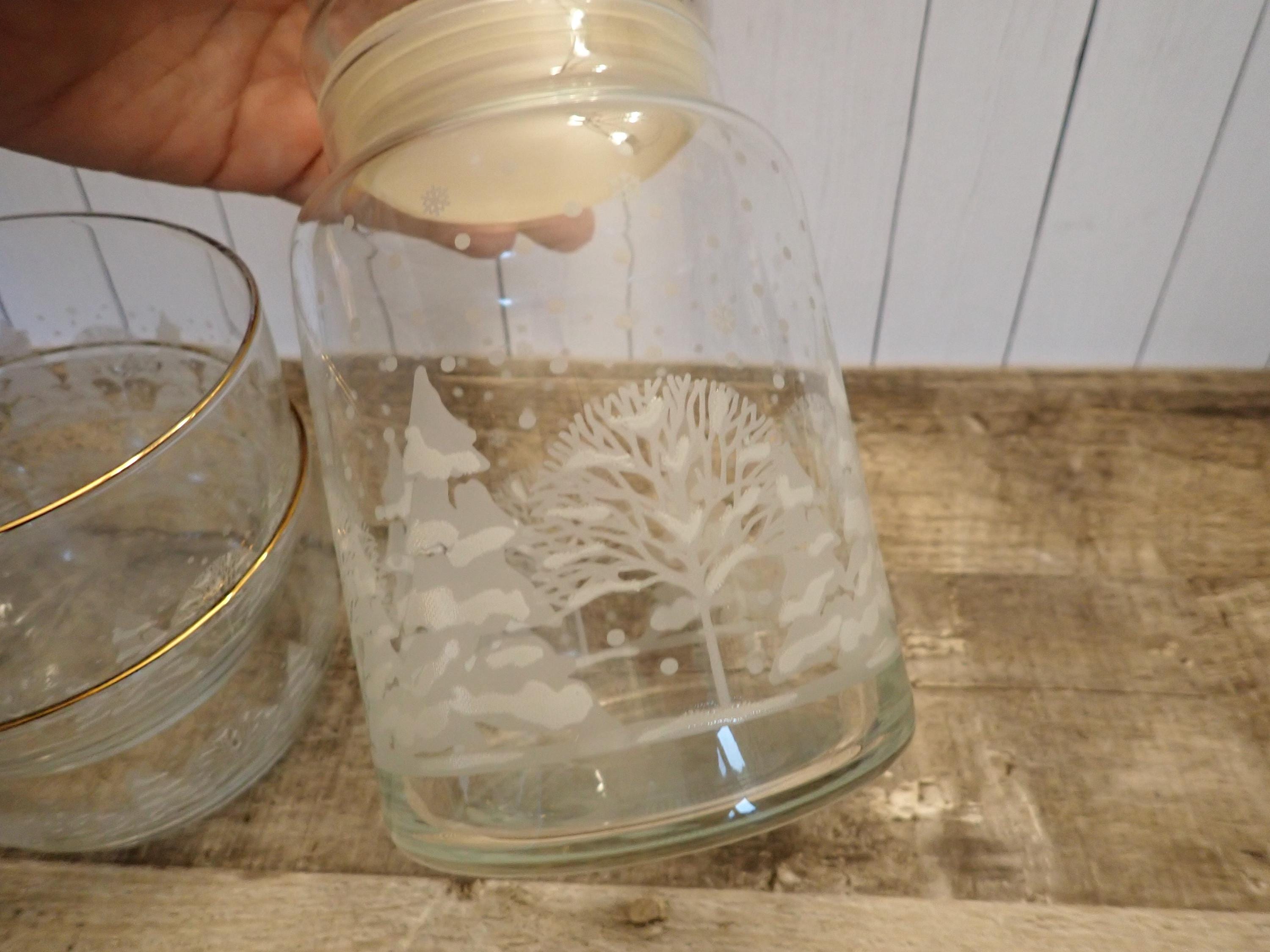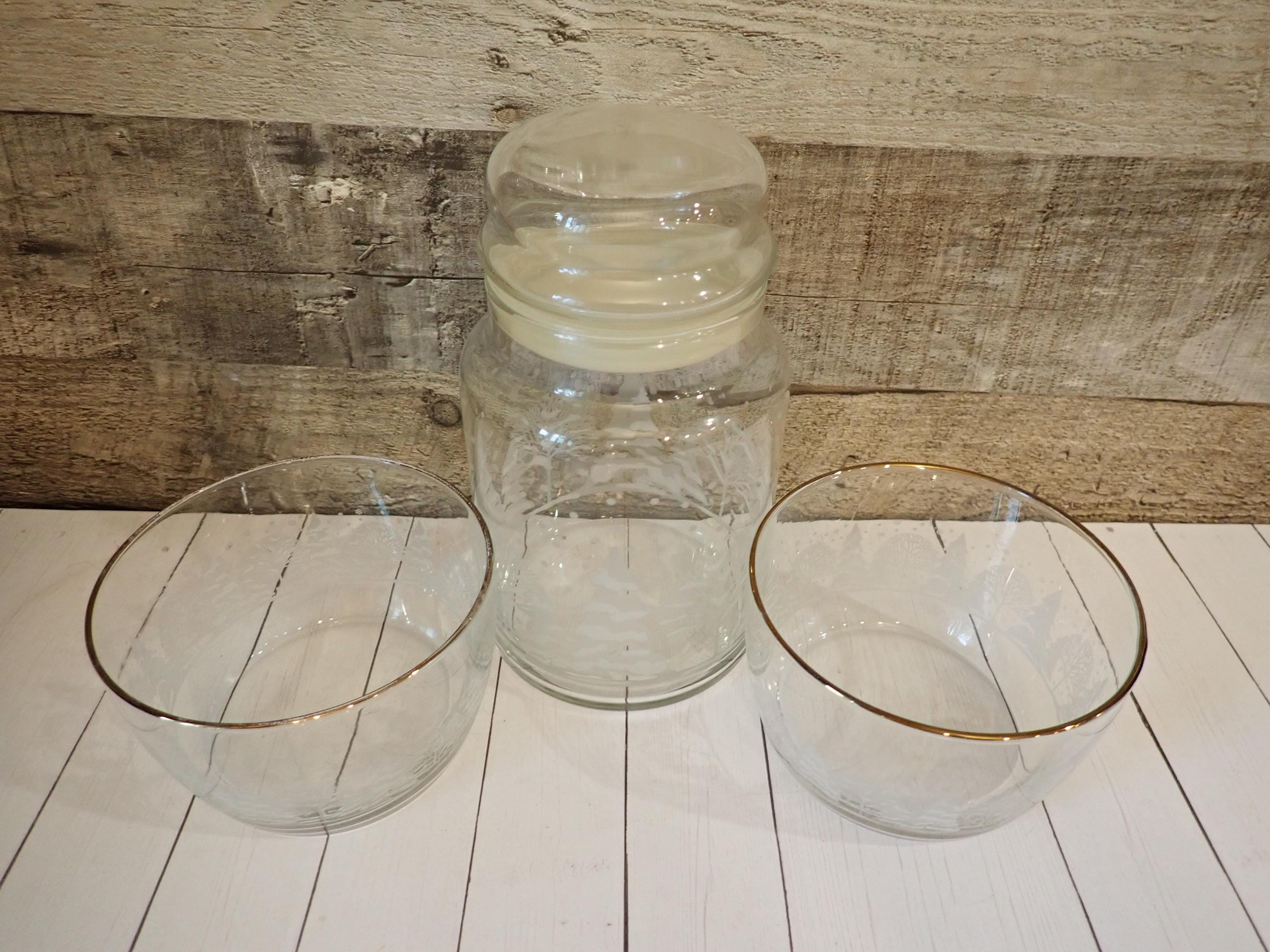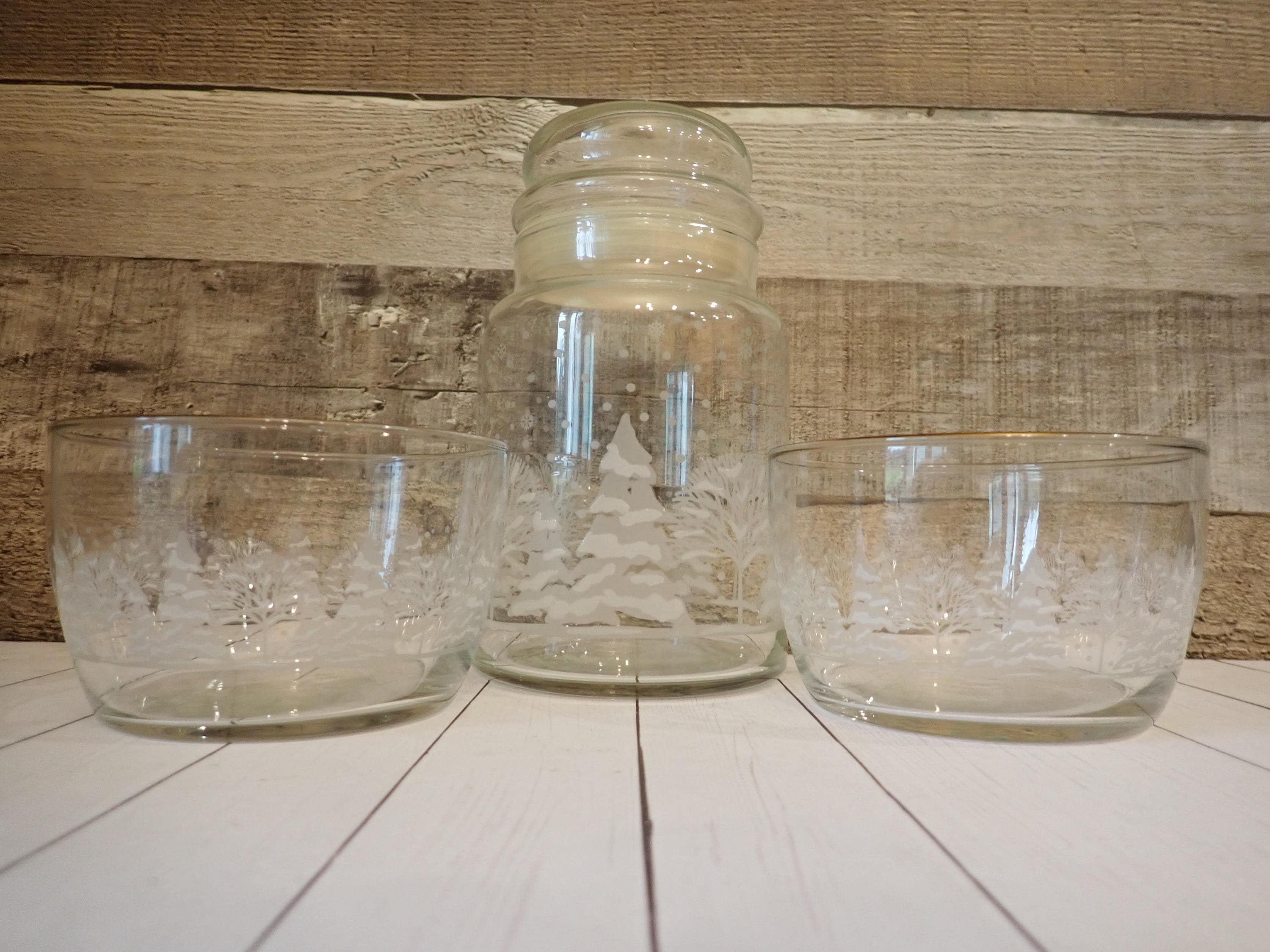 This fun glass canister and bowl set includes a matching canister and 2 candy bowls. The glass canister is 4" in diameter and 7" tall with the lid on. The canister is a clear glass and has a frosted tree design around the canister. The candy bowls are 4.25" in diameter and 3" tall and have the same frosted tree pattern. The canister lid has a clear plastic seal around the bottom for a snug fit. The canister and bowls are all in very good condition with no chips or cracks. All of the graphics are bright and clear. Great little canister and bowl set for Christmas candy!