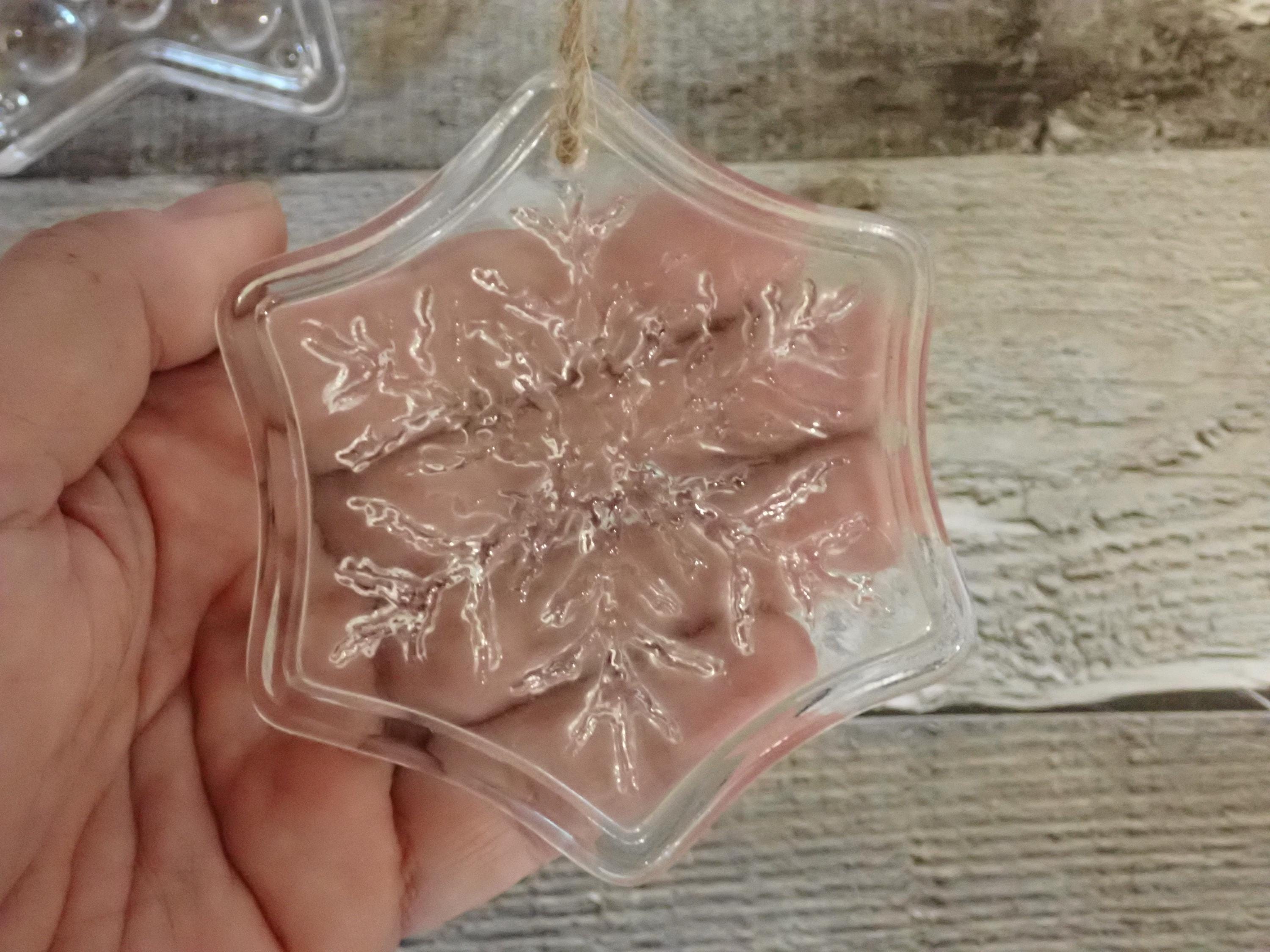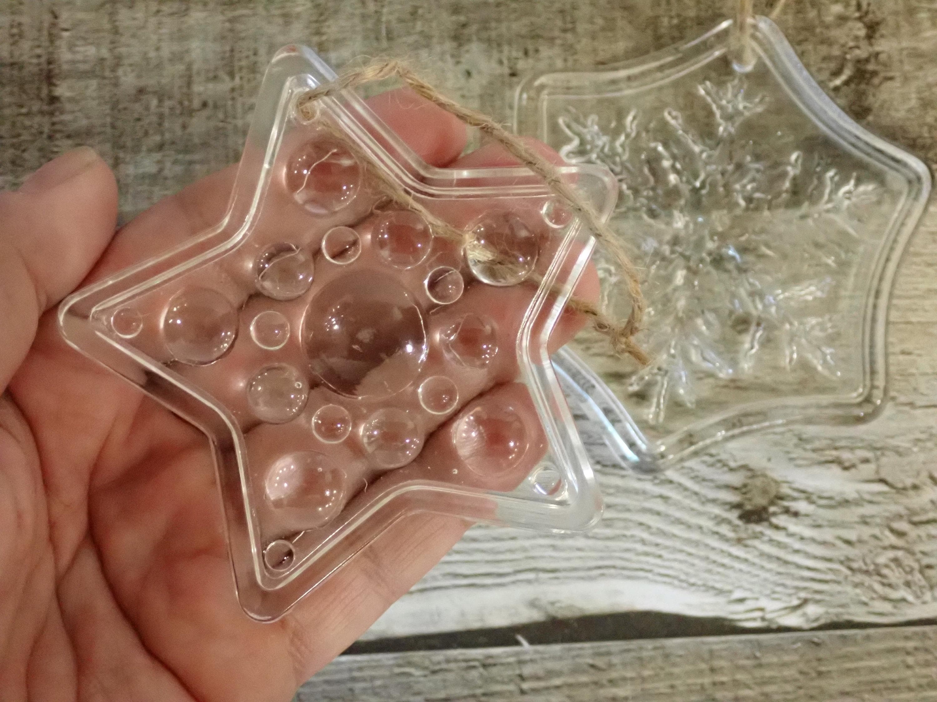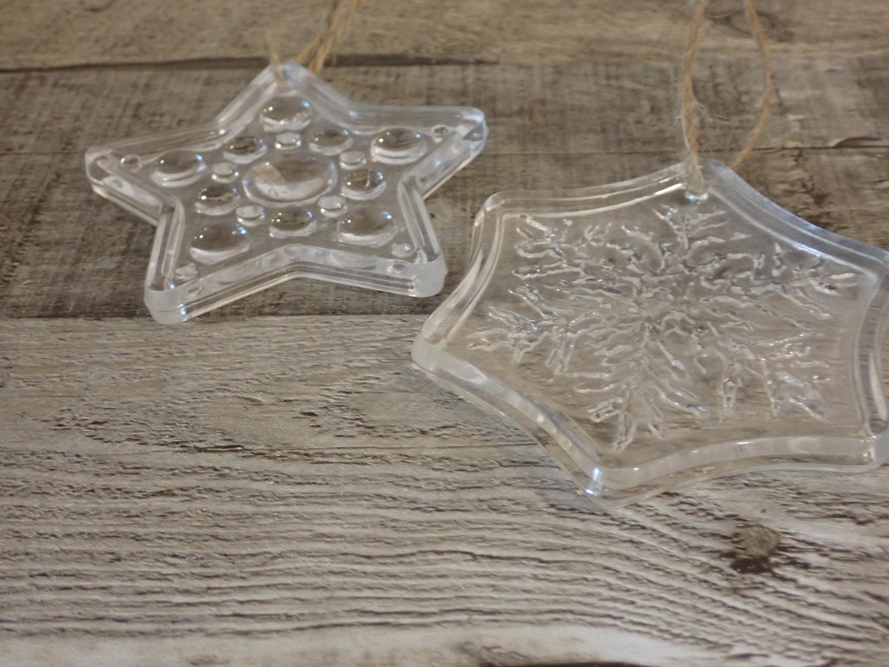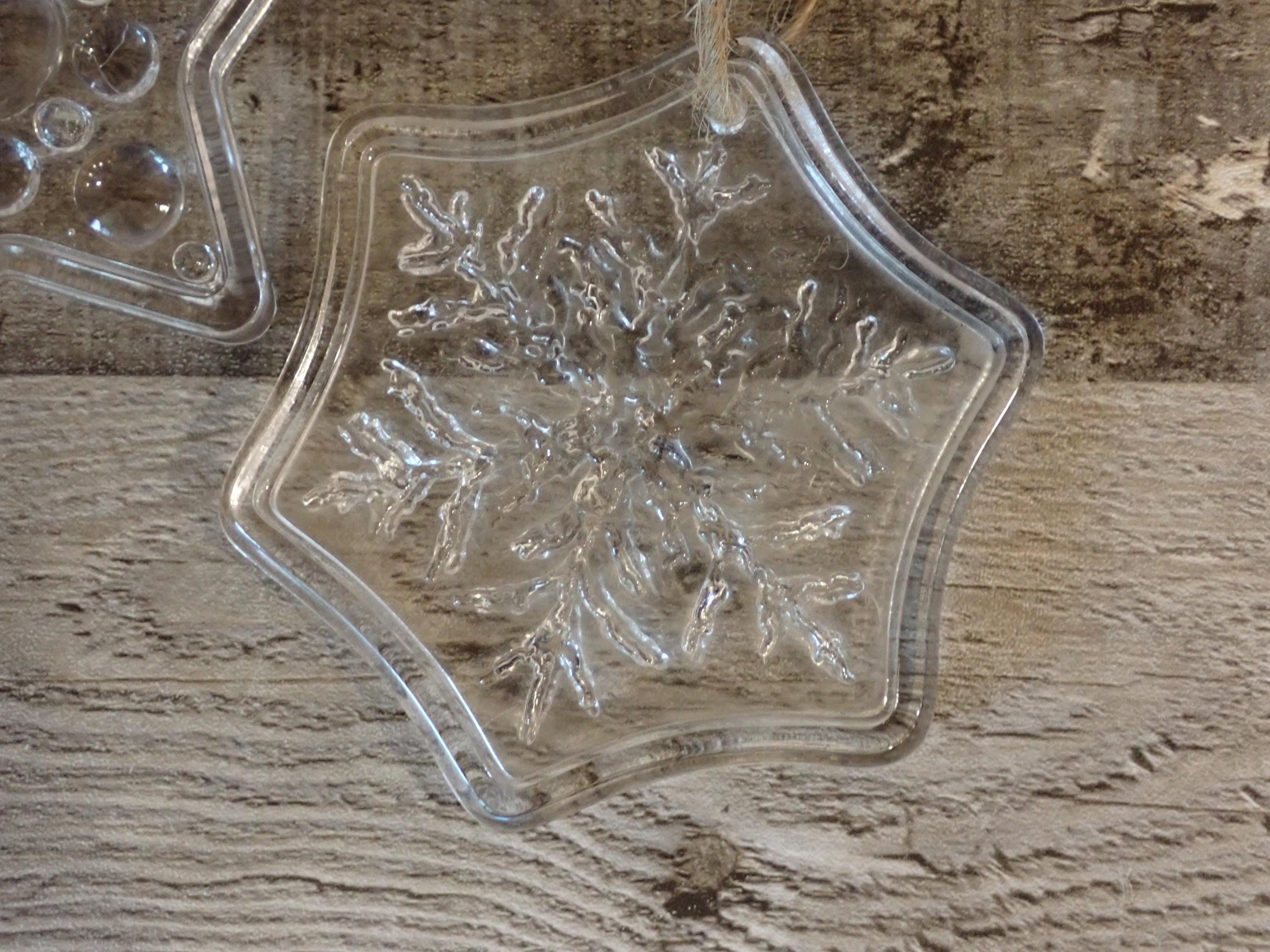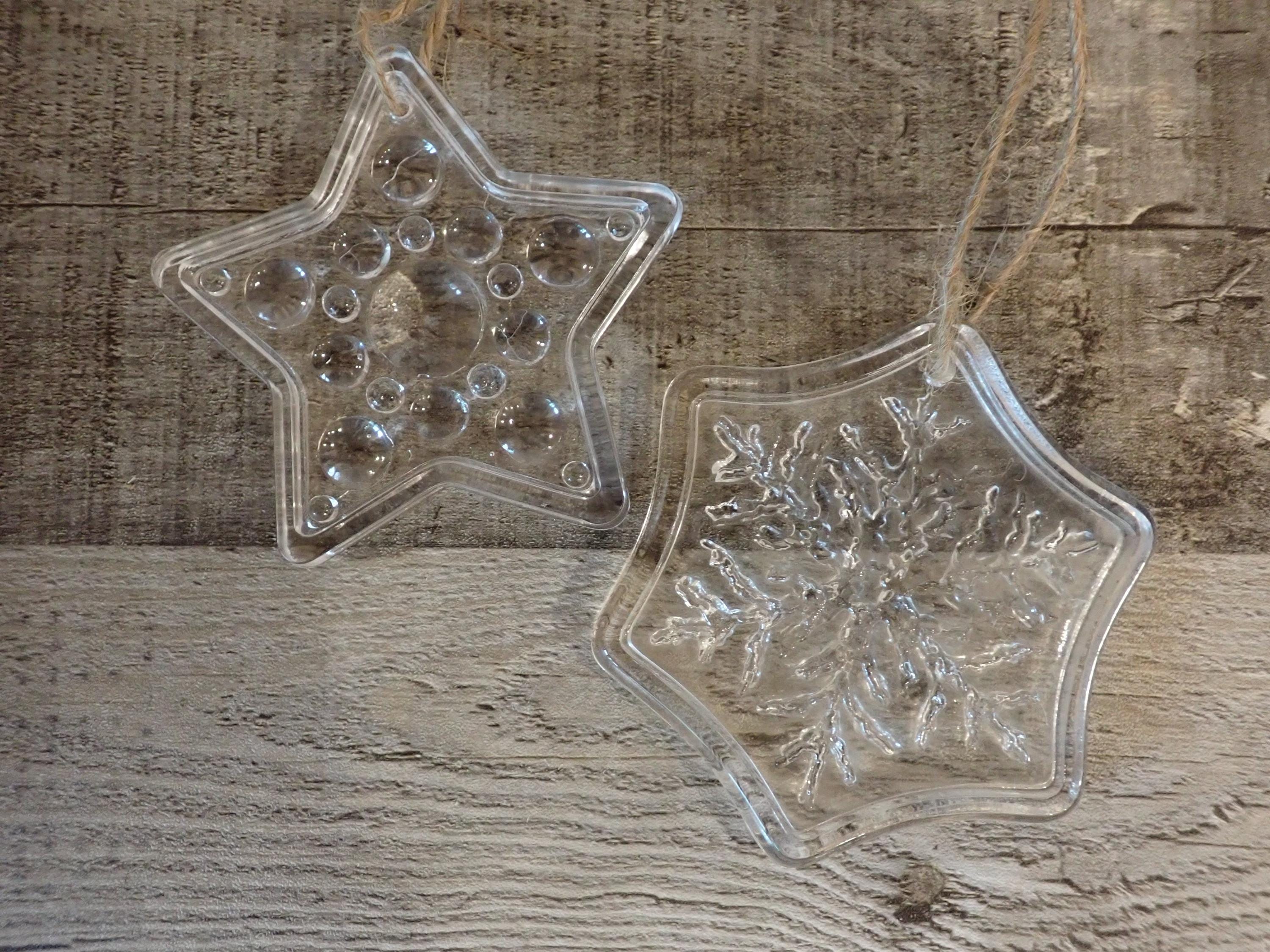 This set of ornaments includes 2 coordinating clear glass star shaped ornament. They are both about 3" wide and high, and each has a 2" twine hanger. One of the ornaments has a dot design and the other has a snowflake design. These ornaments is made of thick glass - the edge of the ornaments is over .25" thick. Both are in excellent condition with no chips or cracks. Very pretty as a suncatchers or as ornaments on your tree!