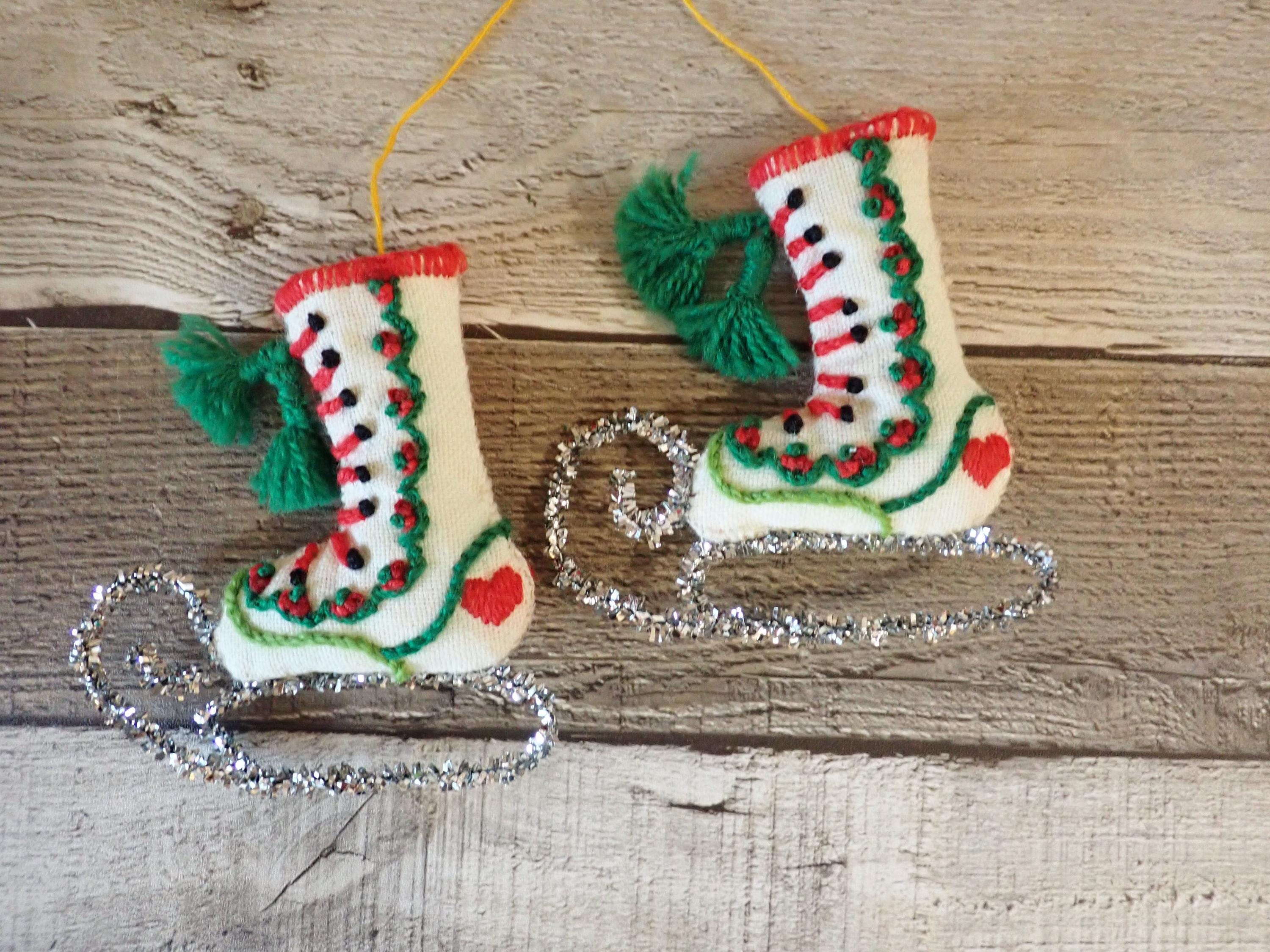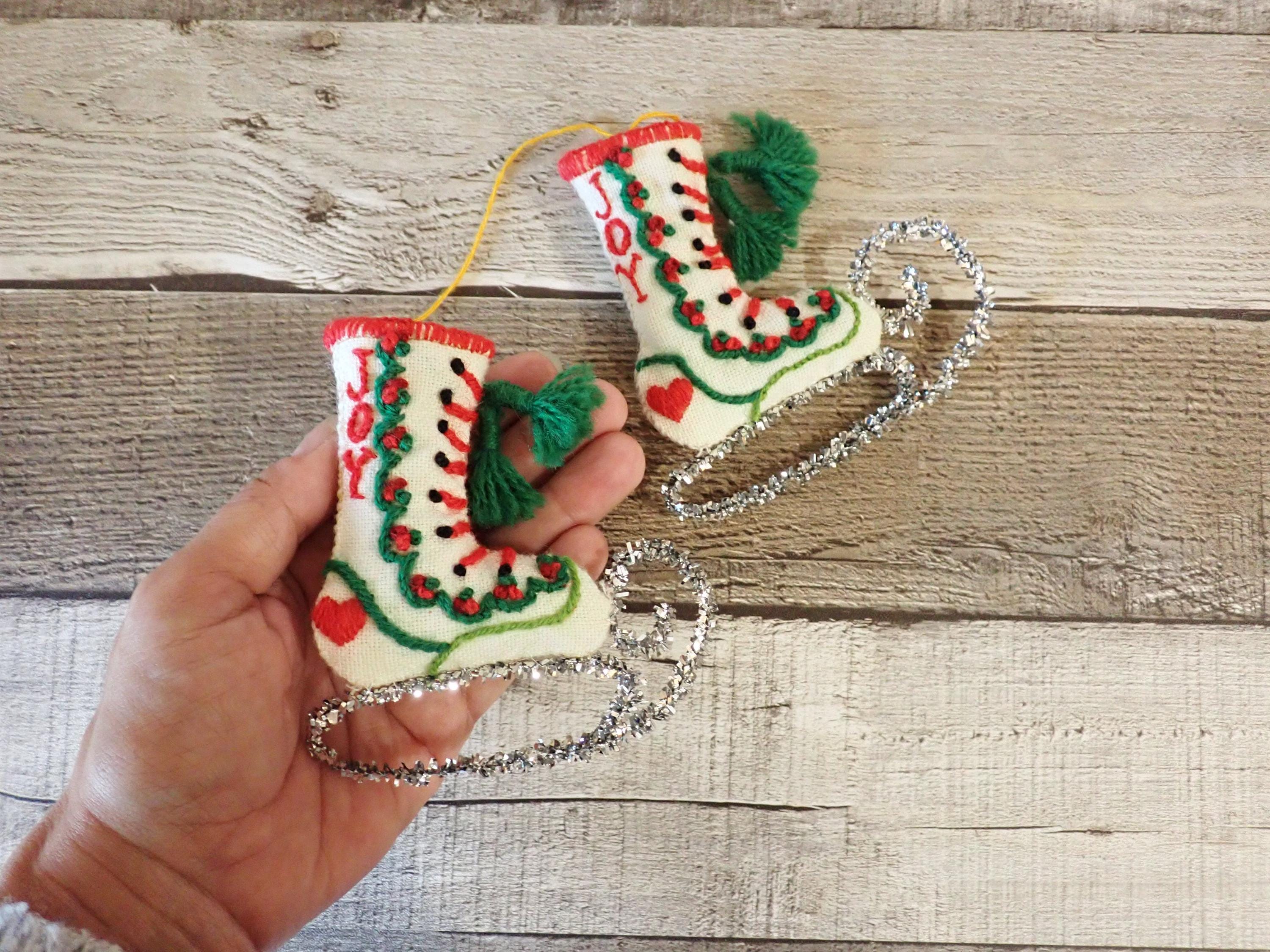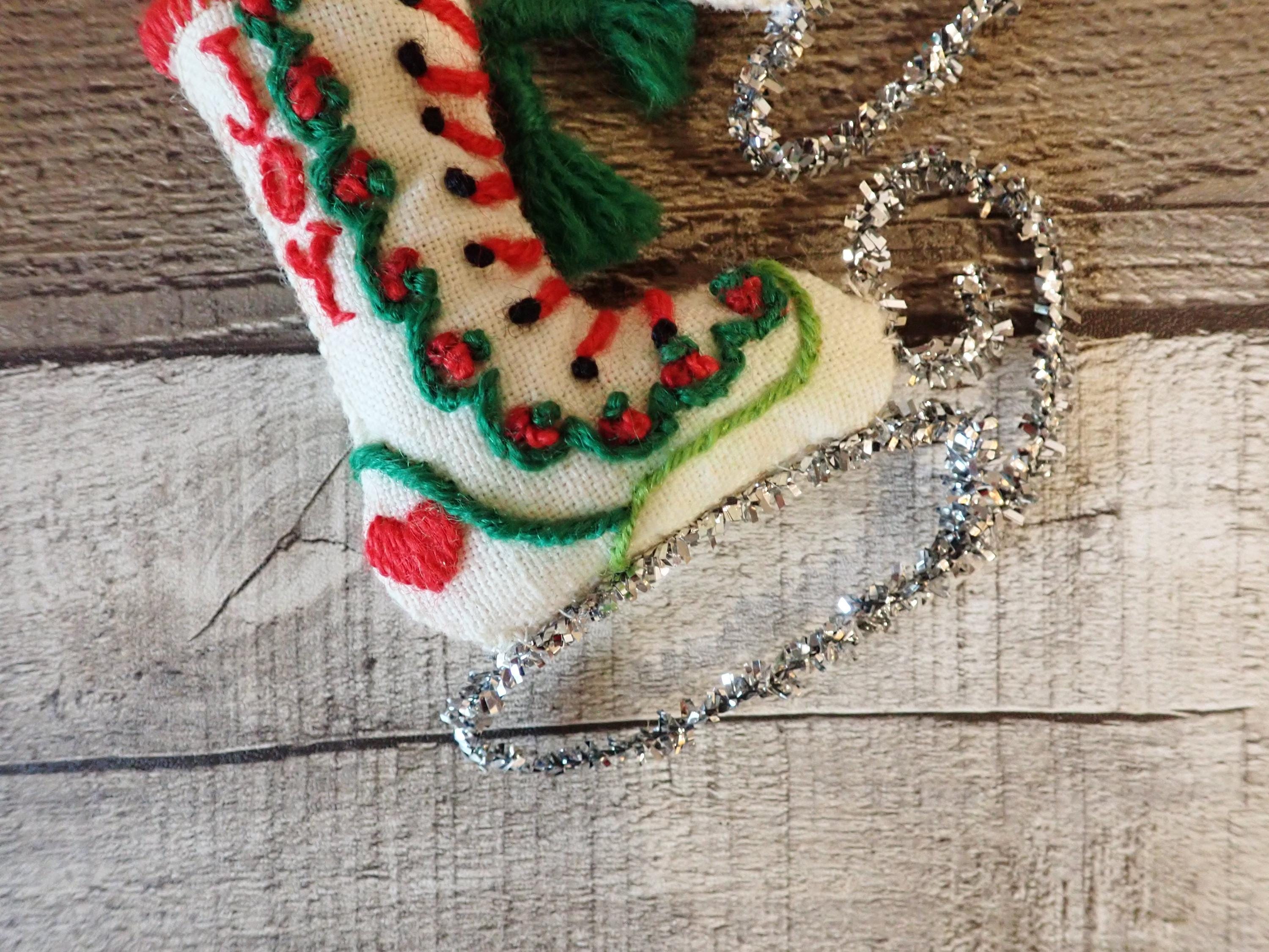 This pair of ice skate ornaments are hand stitched vintage ornaments. They measure 4" tall and 4" wide. They are a white fabric with red and green stitching and decorative accents, and silver glitter skate blade. The ornaments are attached to each other and hang by a gold thread. The ornaments are in very good condition.