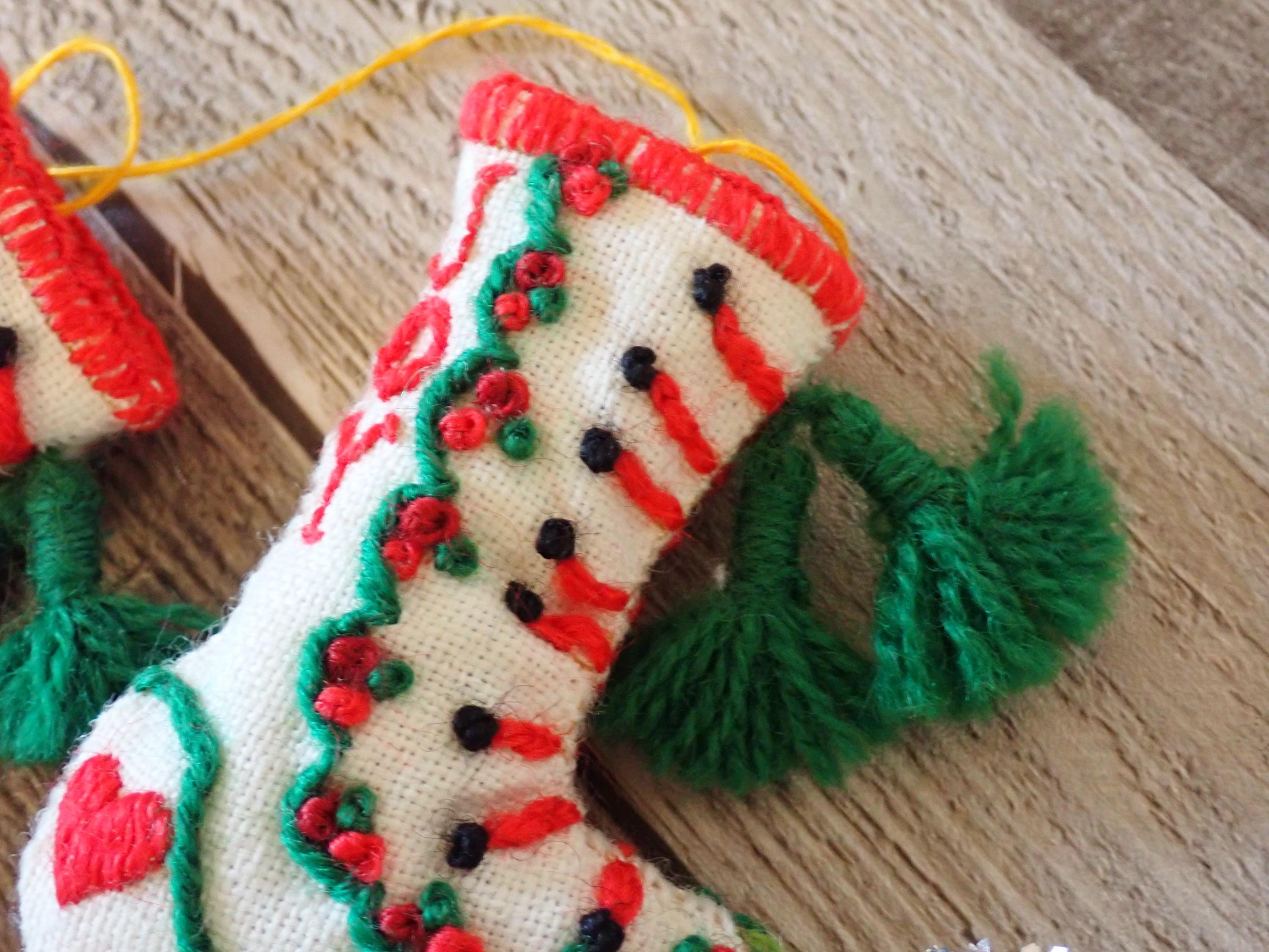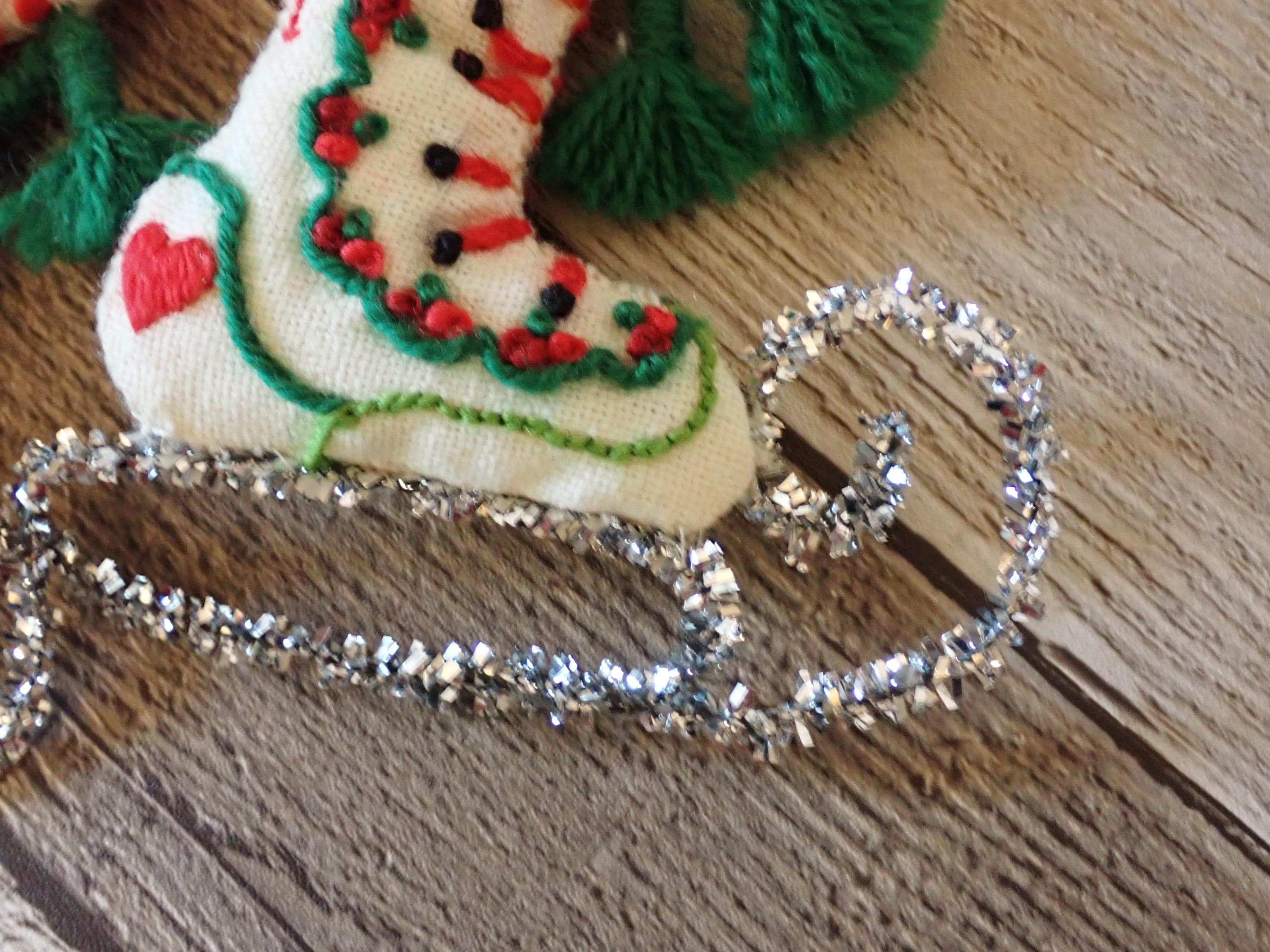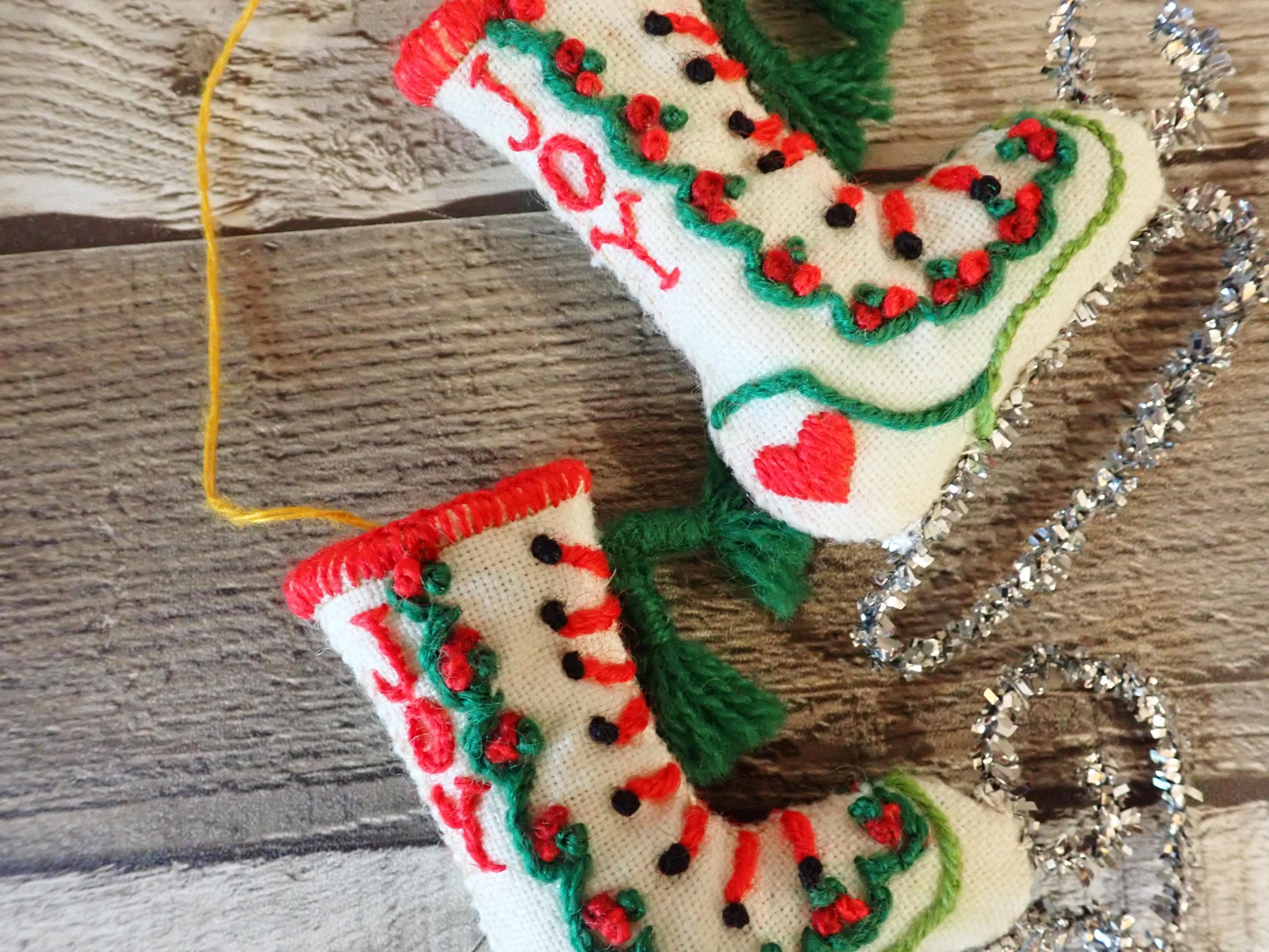 This pair of ice skate ornaments are hand stitched vintage ornaments. They measure 4" tall and 4" wide. They are a white fabric with red and green stitching and decorative accents, and silver glitter skate blade. The ornaments are attached to each other and hang by a gold thread. The ornaments are in very good condition.