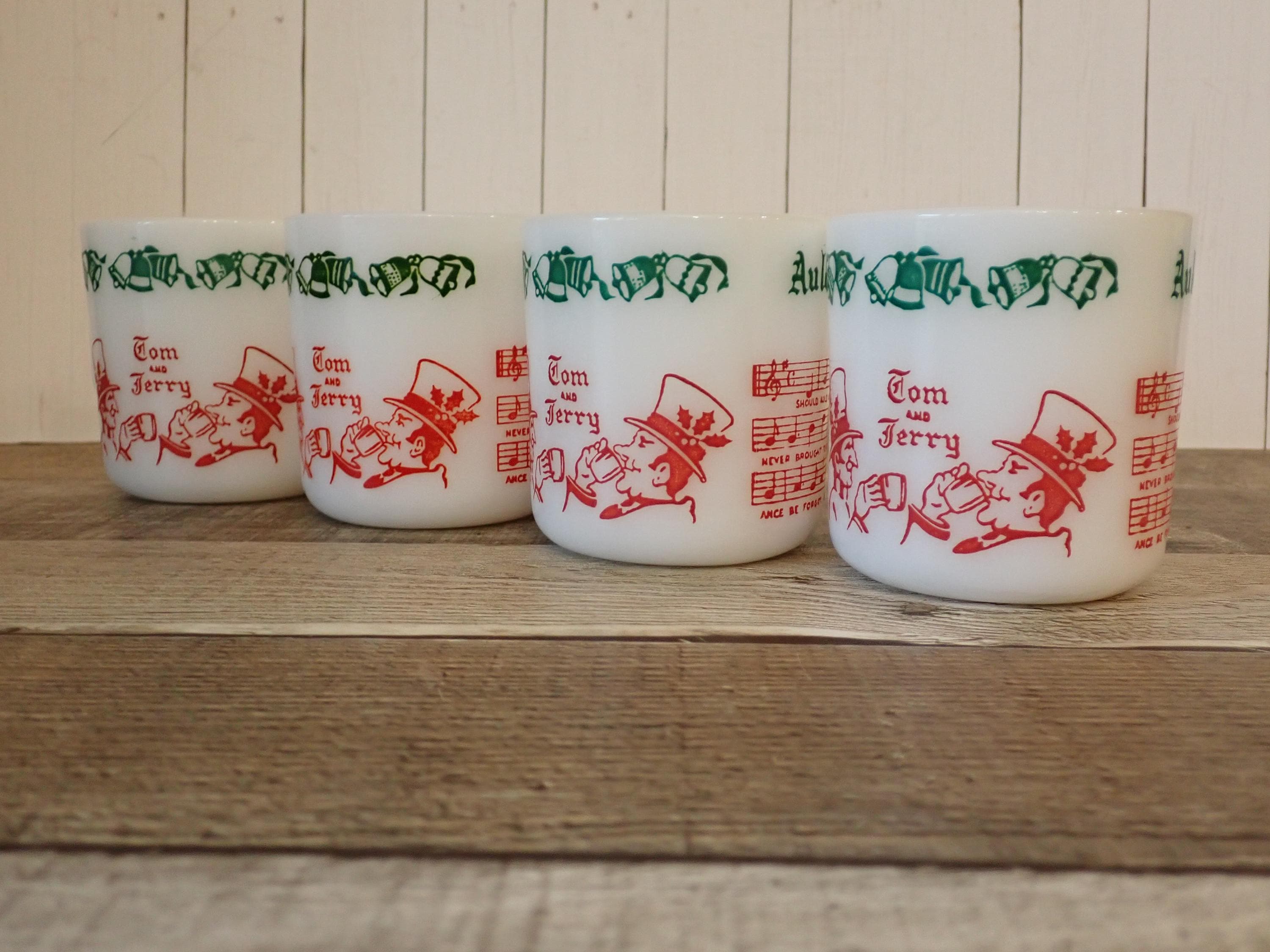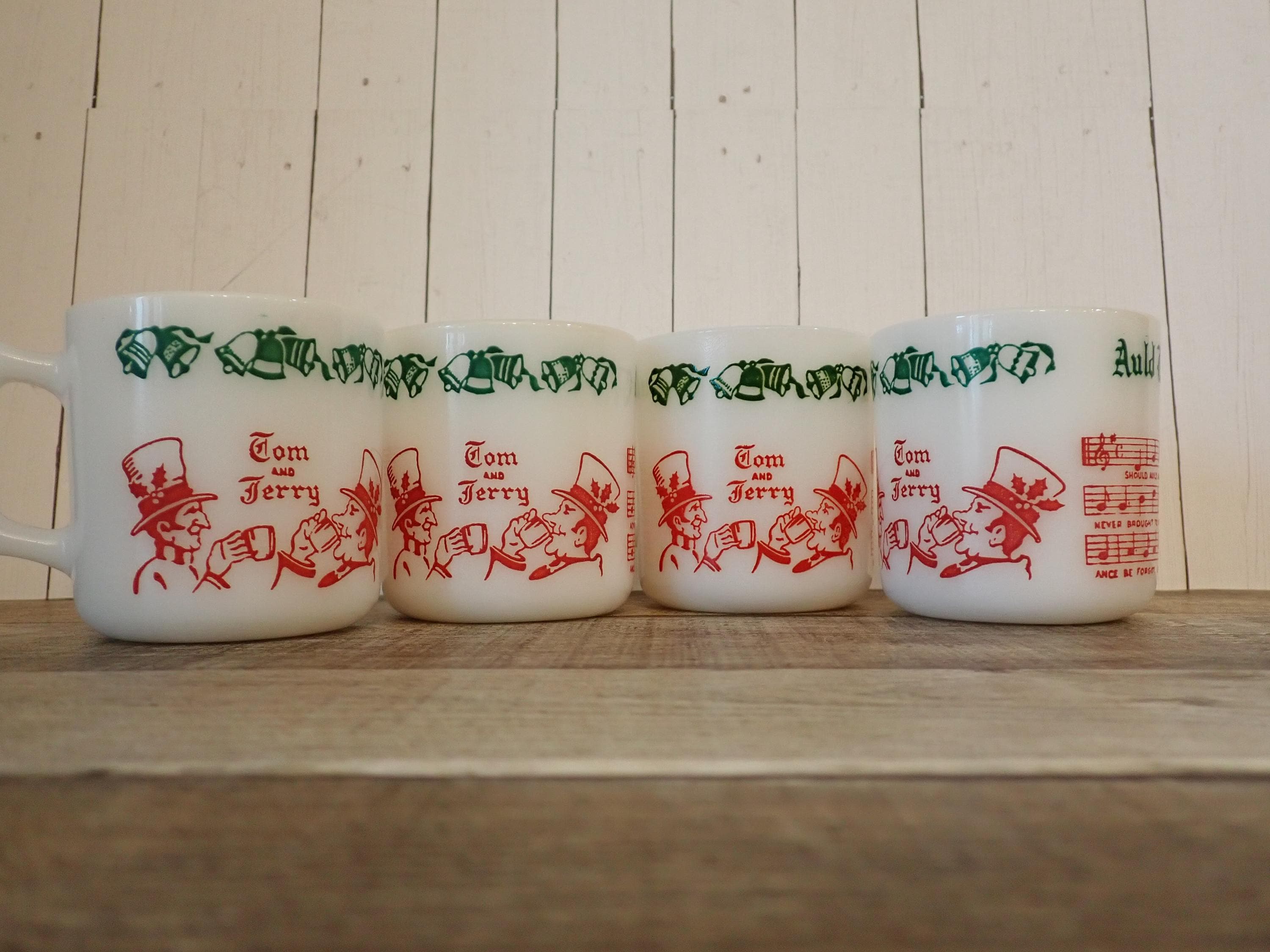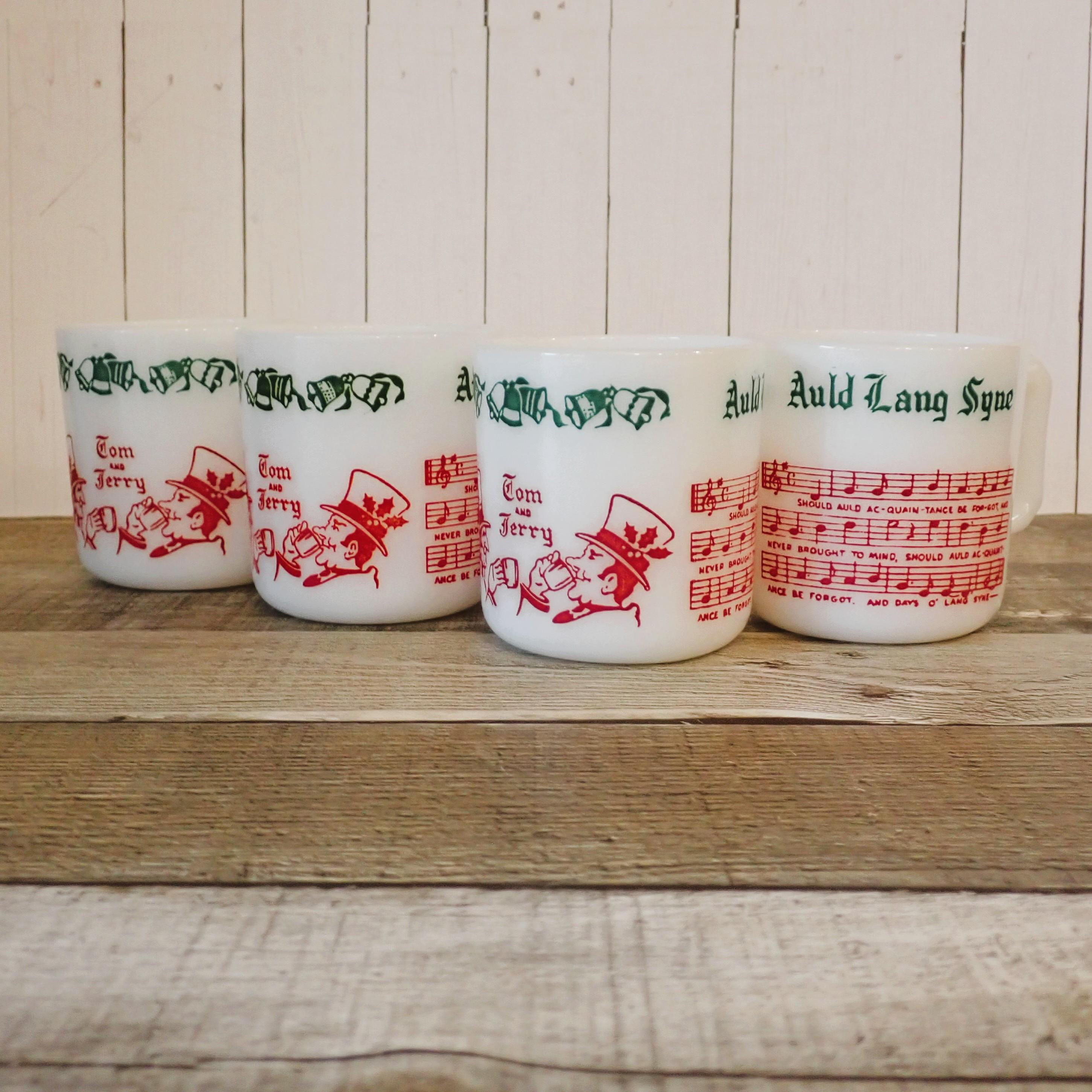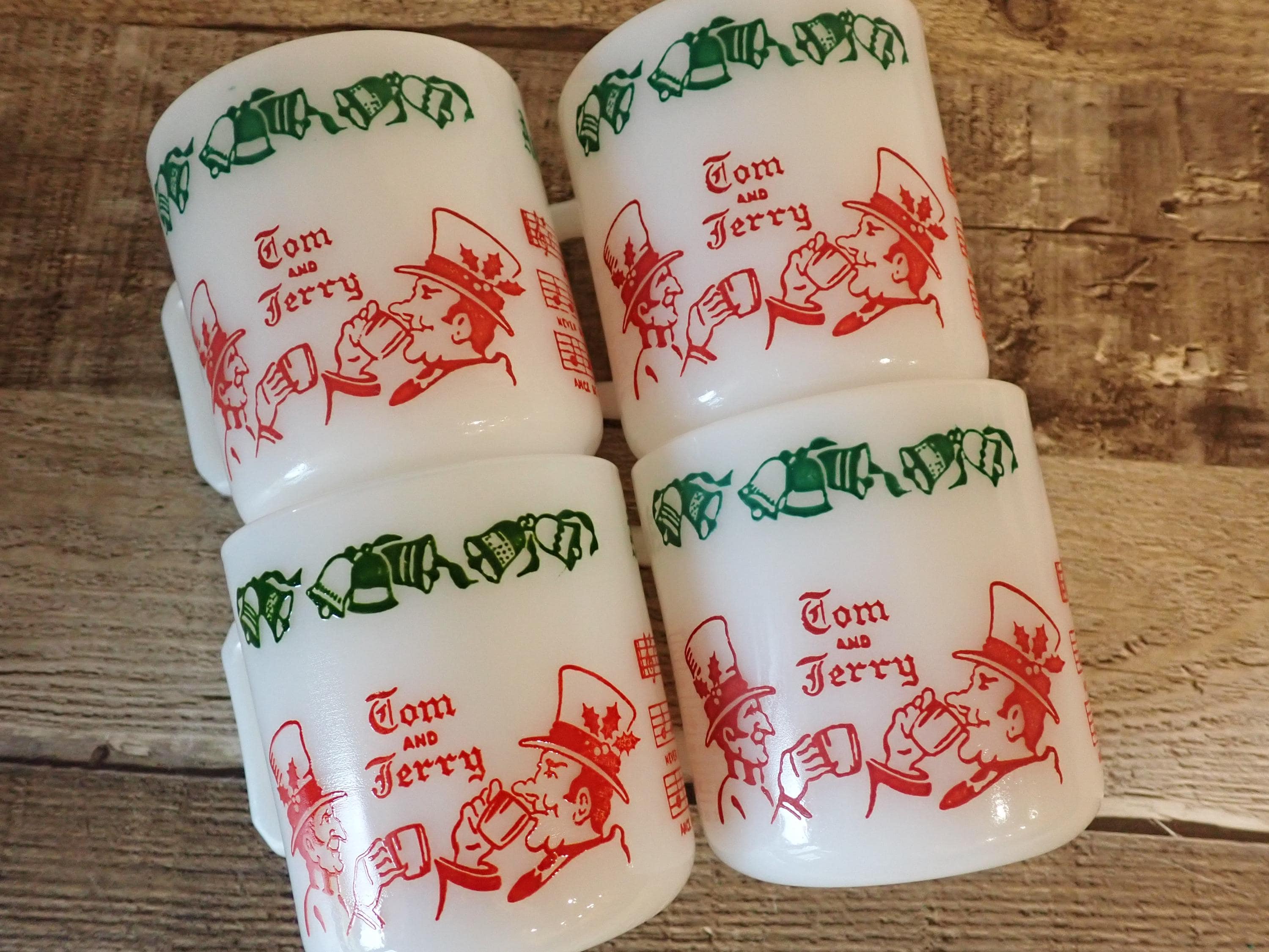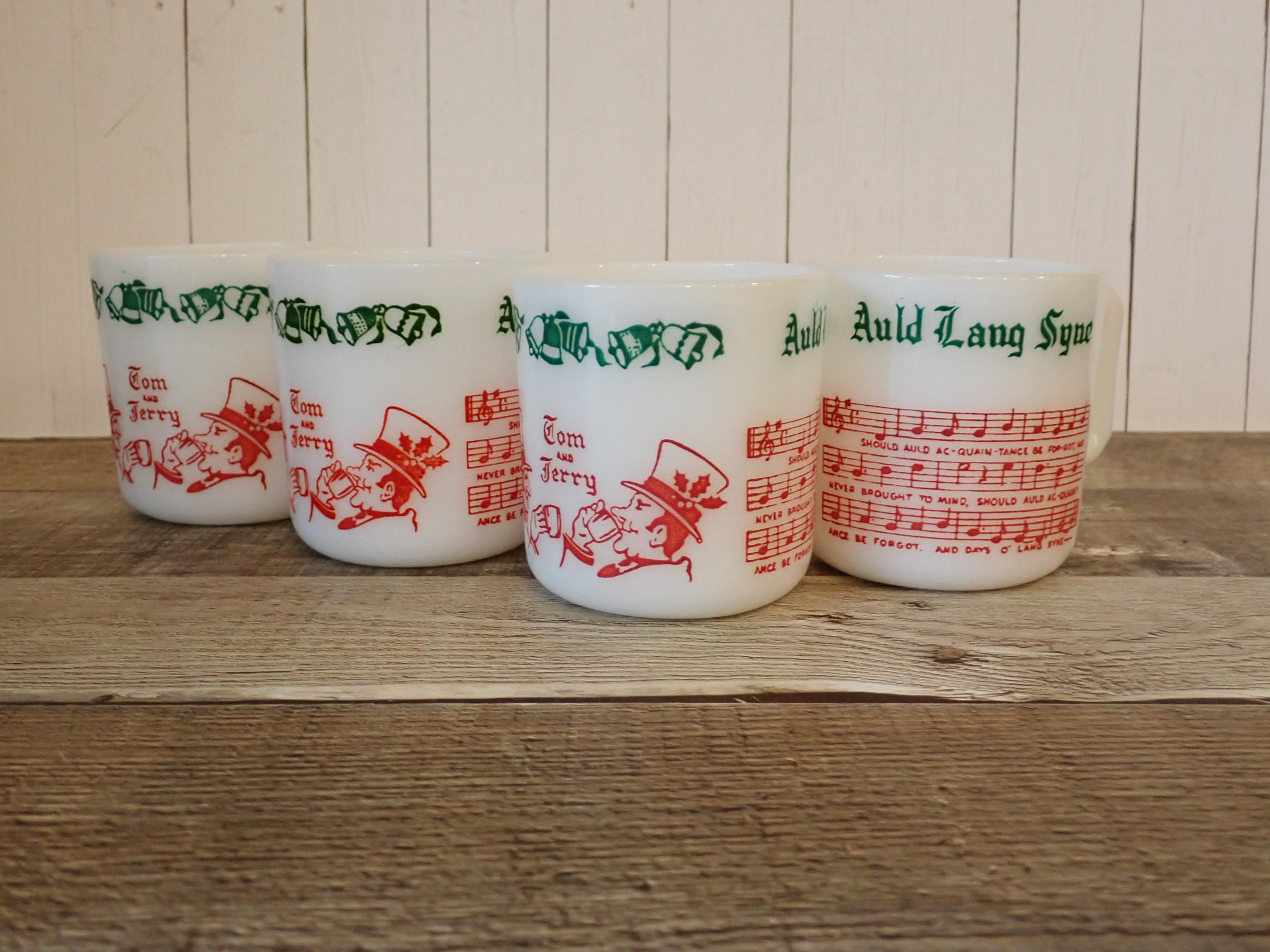 This great vintage set of Tom and Jerry mugs by Hazel Atlas includes 4 matching small mugs. This set is a white milk glass that is decorated with a red design of music and 2 men in hats. The mugs all say TOM AND JERRY on one side and AULD LANG SYNE on the other. Each mug measures 3" tall and 2.75" in diameter. They are all marked with the Hazel Atlas HA logo. This set is in very good condition with no chips or cracks. The colors are intact however there is the beginnings of a little bit of fading on the red areas. Great vintage Tom and Jerry set!