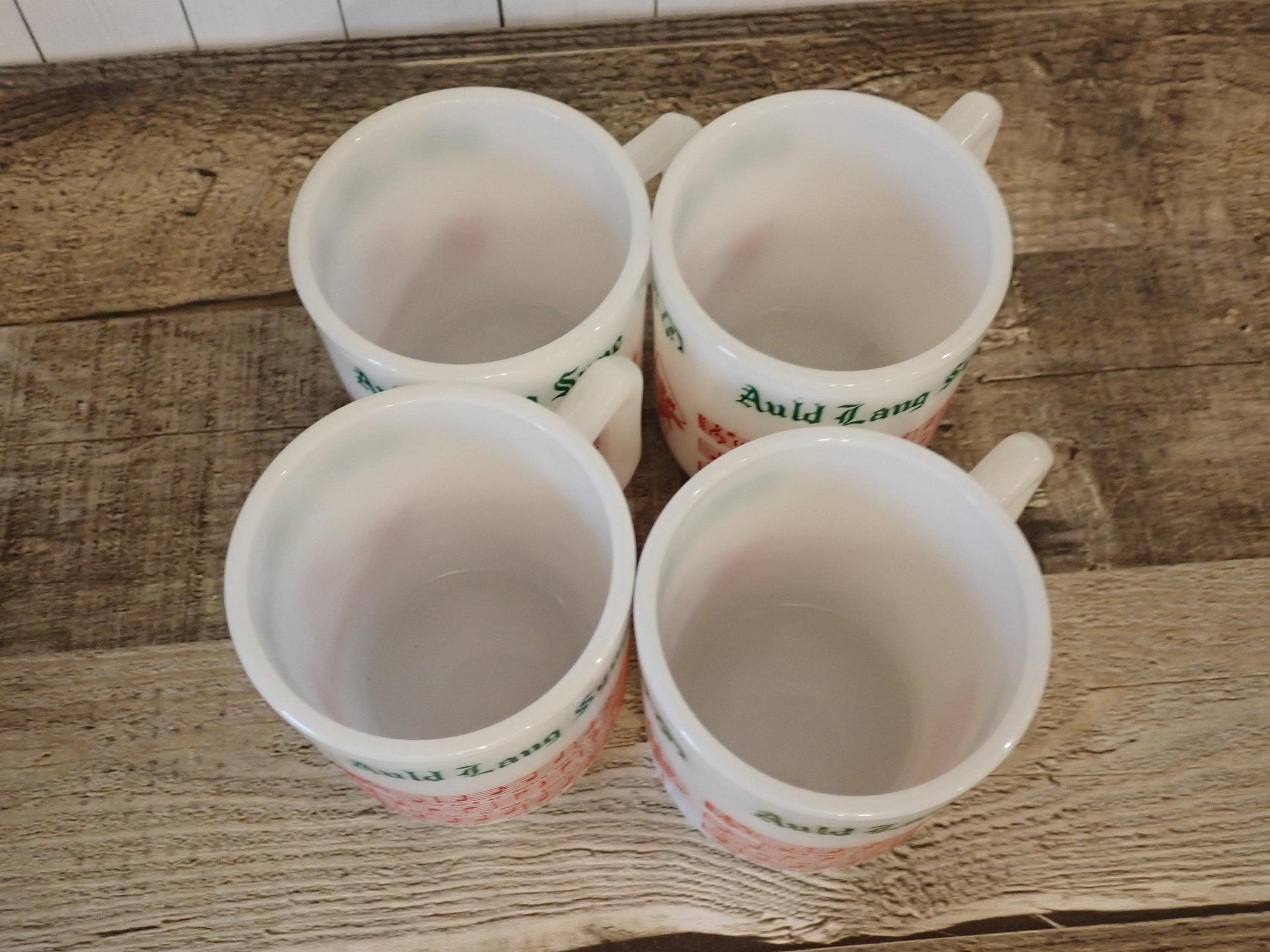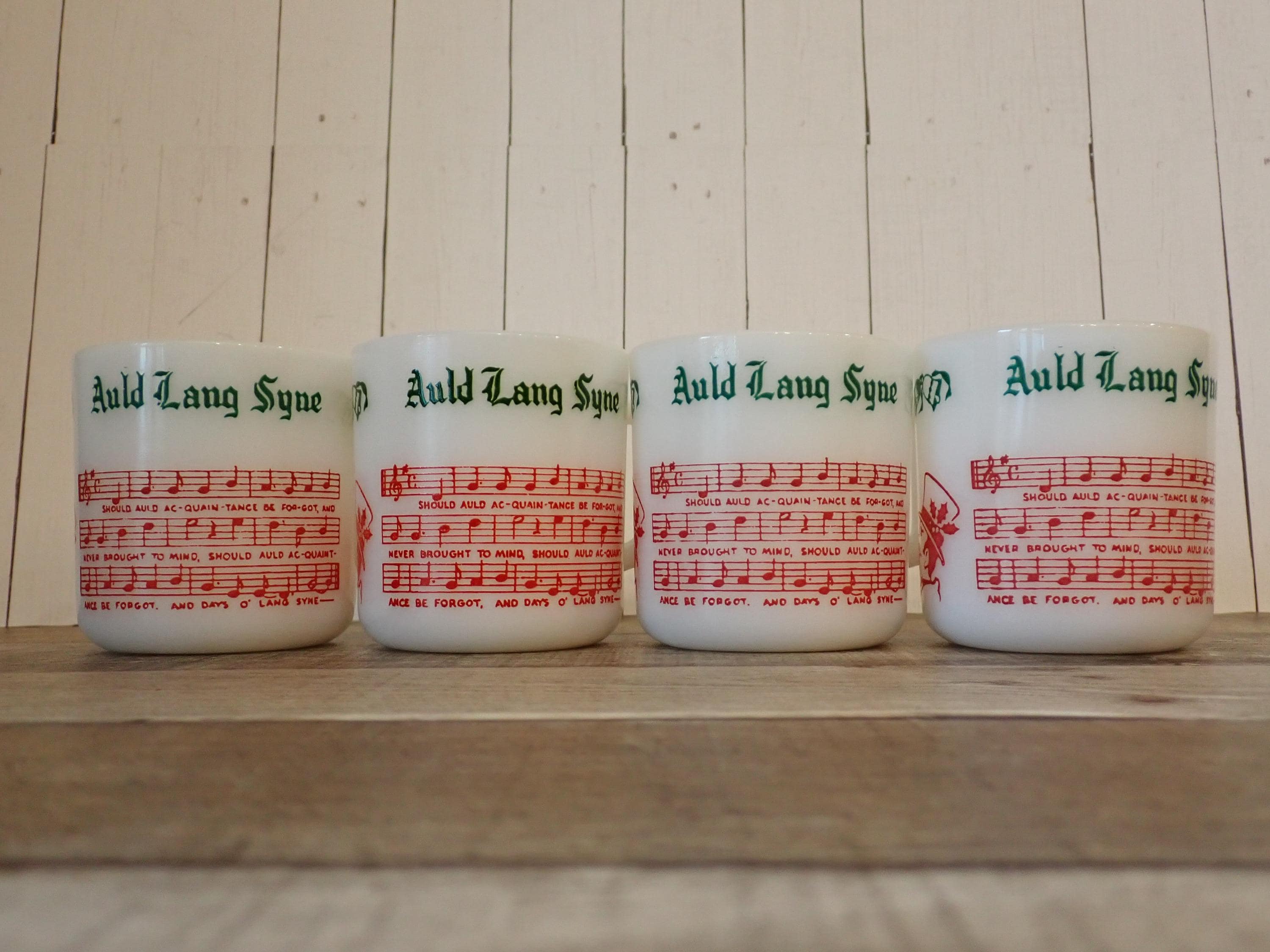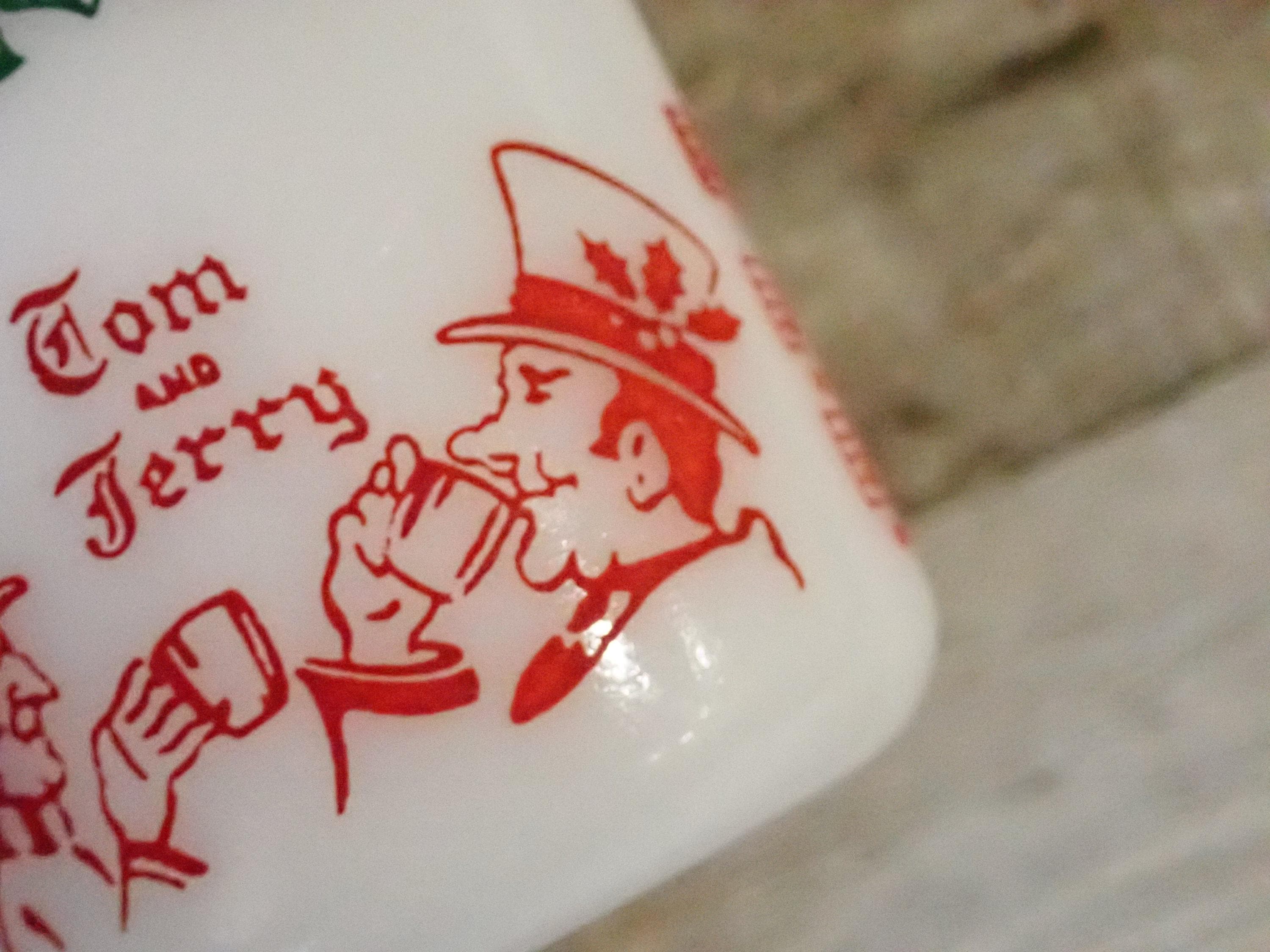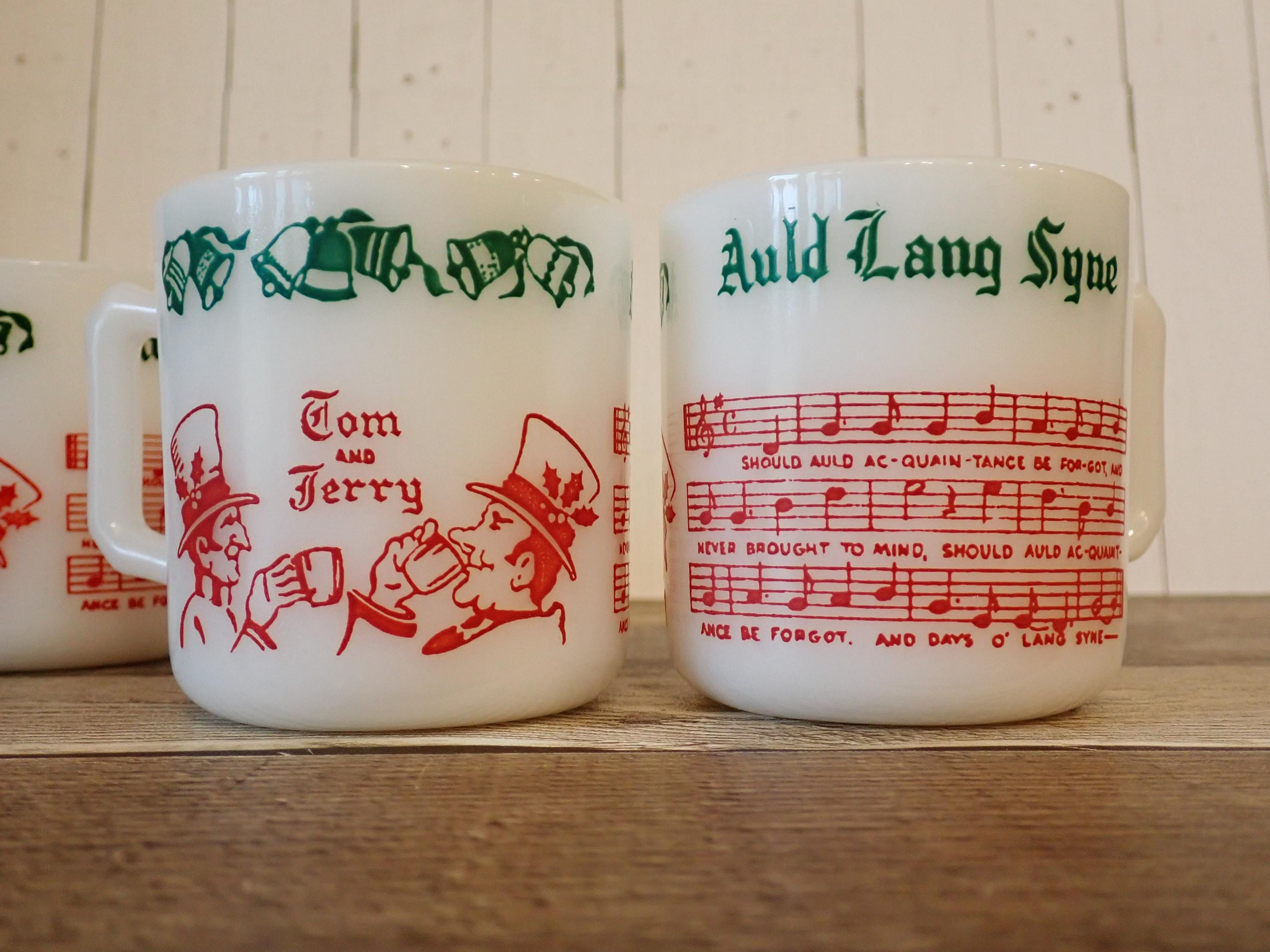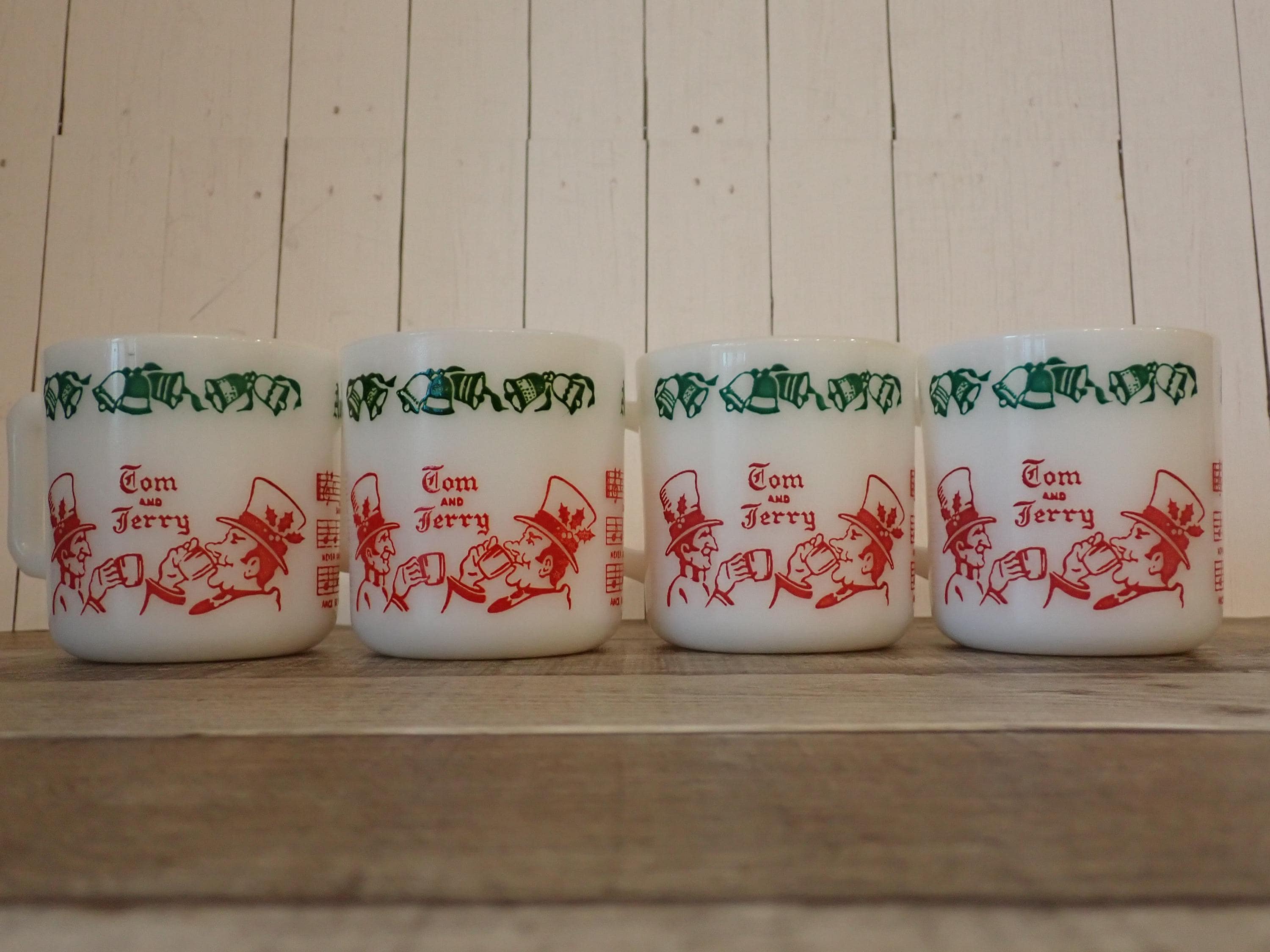 This great vintage set of Tom and Jerry mugs by Hazel Atlas includes 4 matching small mugs. This set is a white milk glass that is decorated with a red design of music and 2 men in hats. The mugs all say TOM AND JERRY on one side and AULD LANG SYNE on the other. Each mug measures 3" tall and 2.75" in diameter. They are all marked with the Hazel Atlas HA logo. This set is in very good condition with no chips or cracks. The colors are intact however there is the beginnings of a little bit of fading on the red areas. Great vintage Tom and Jerry set!