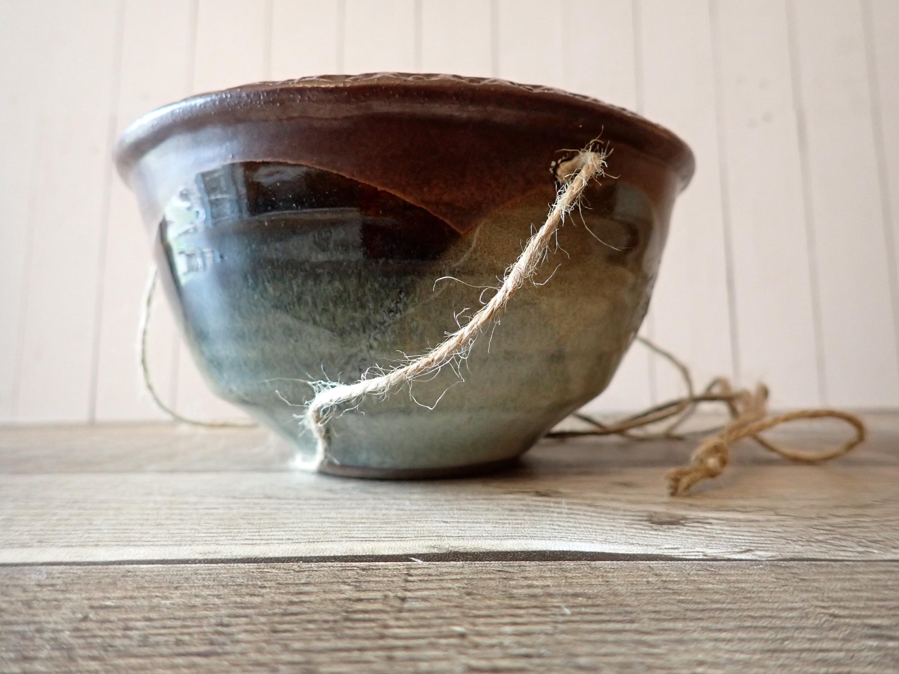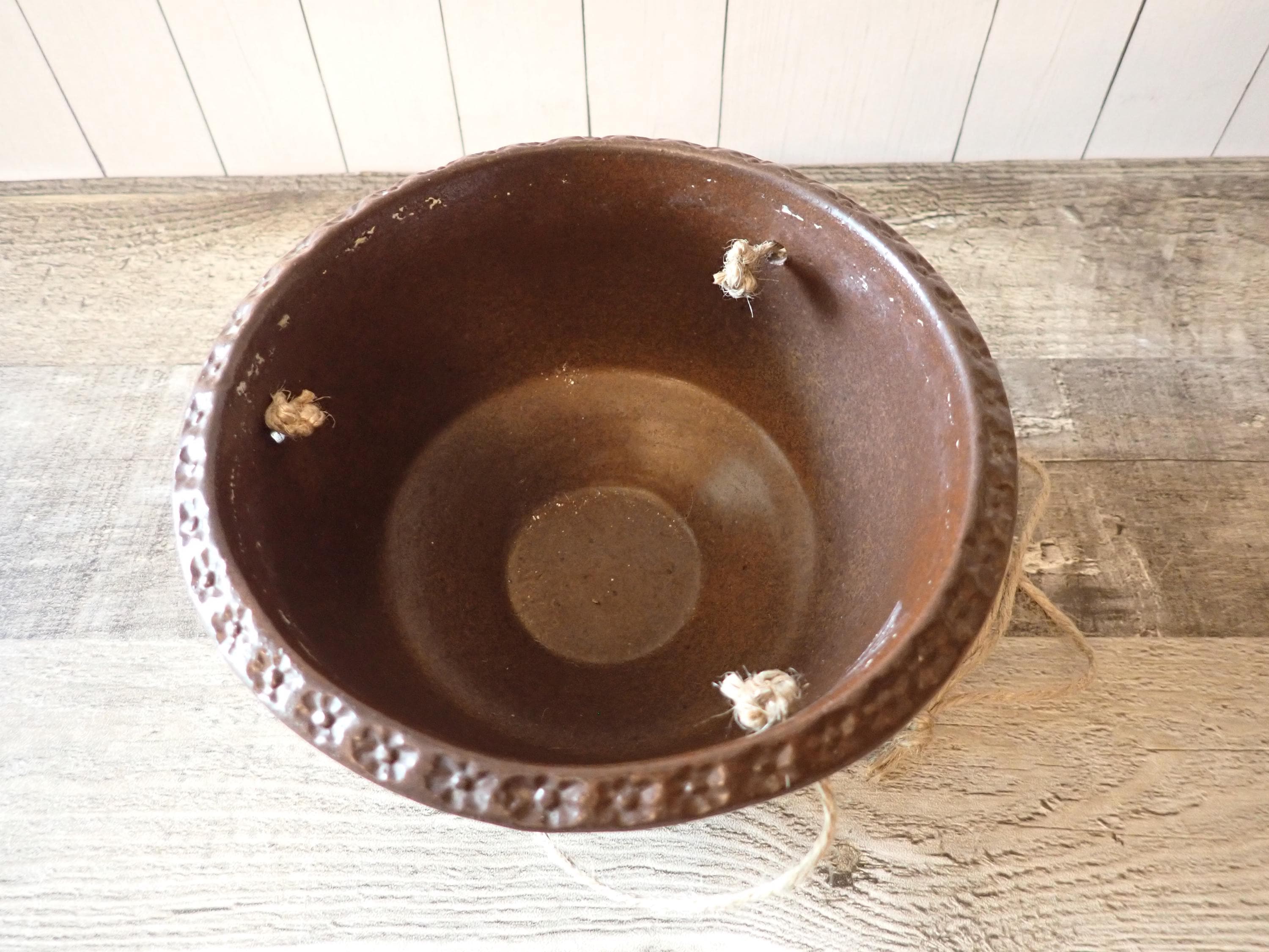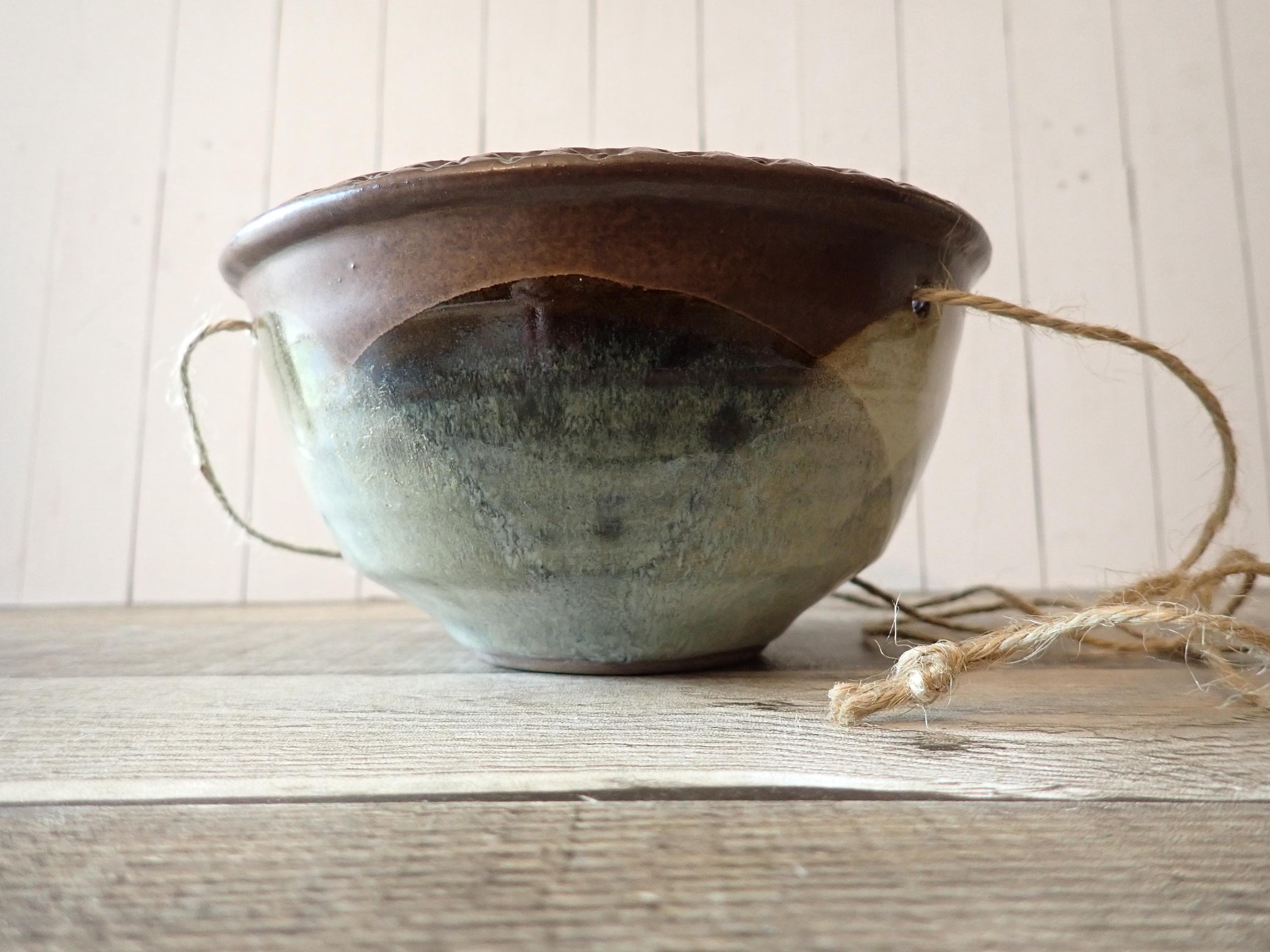 This lovely hanging planter by Pottery Craft USA is 3.5' tall and 6.25" in diameter. It is a round bowl with brown, tan, and blue glaze design. The bowl has a textured floral design around the piece. The bottom of the bowl is marked: POTTERY CRAFT #101 MADE IN USA. There is a 15" twine cord hanger on the planter. The planter is in very good condition with no chips or cracks, however there is some light mineral deposits on the inner rim of the planter.