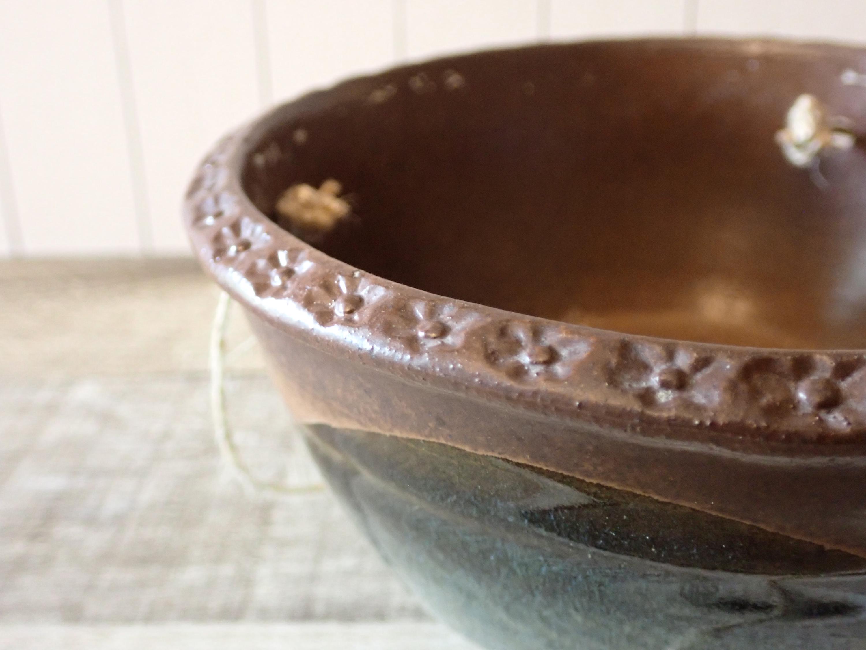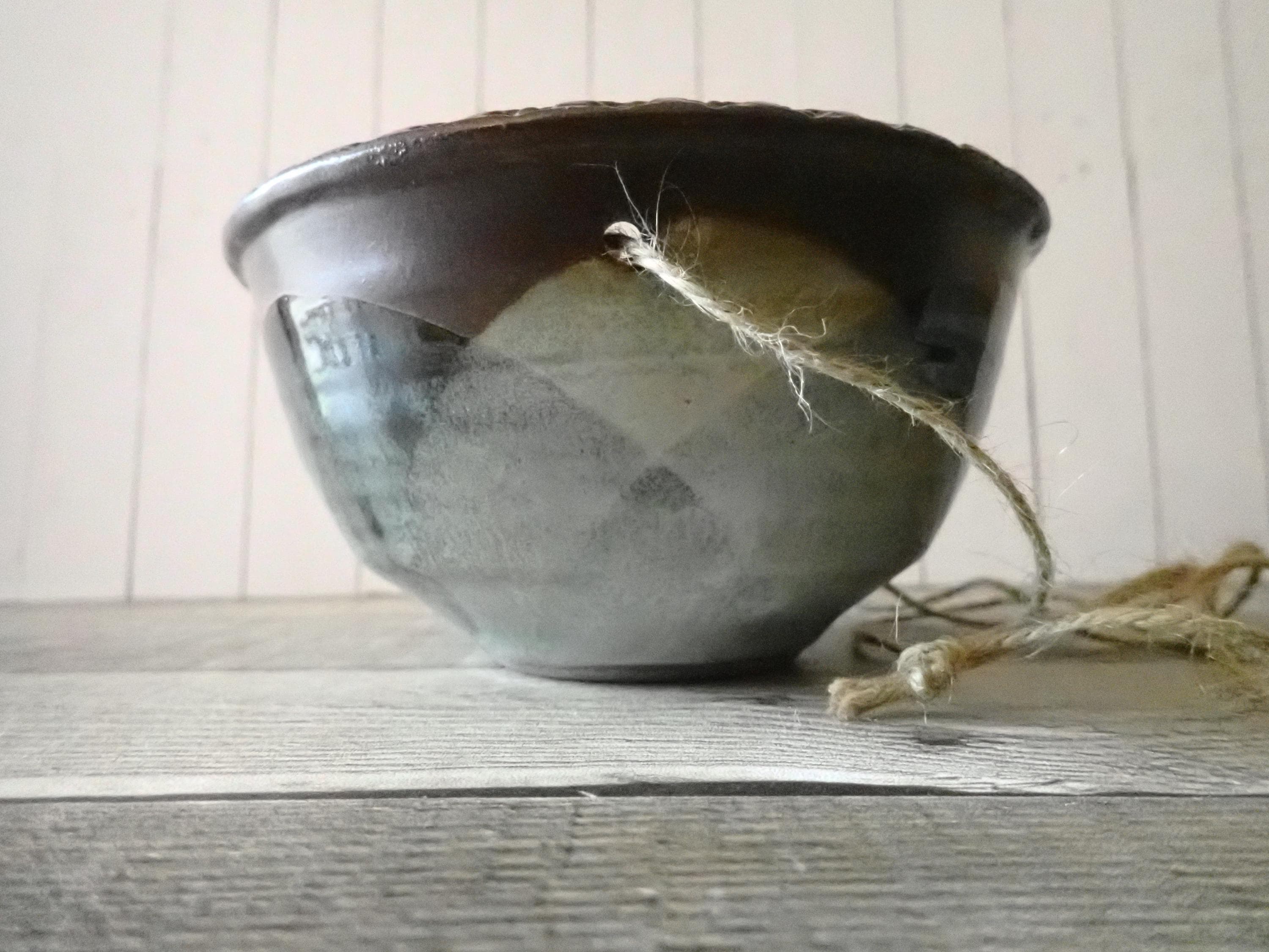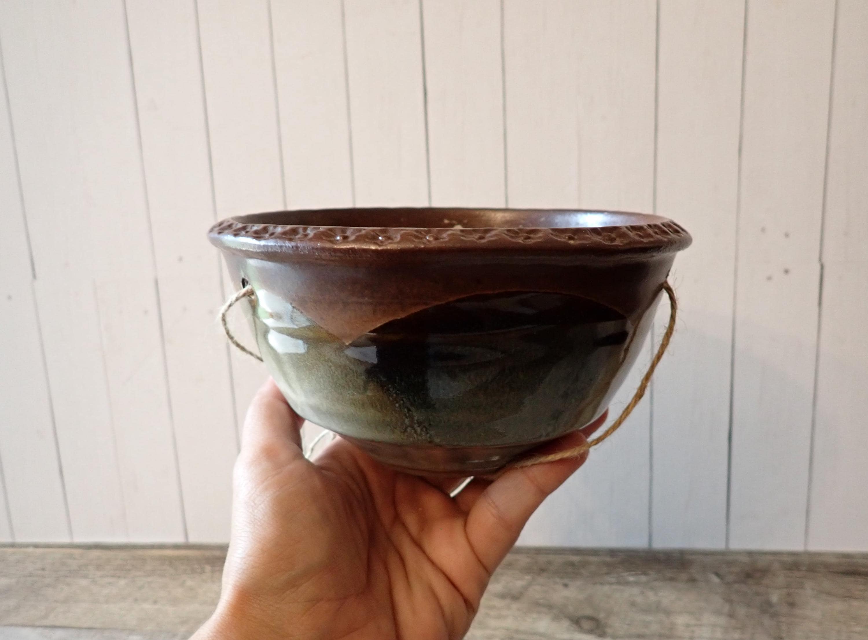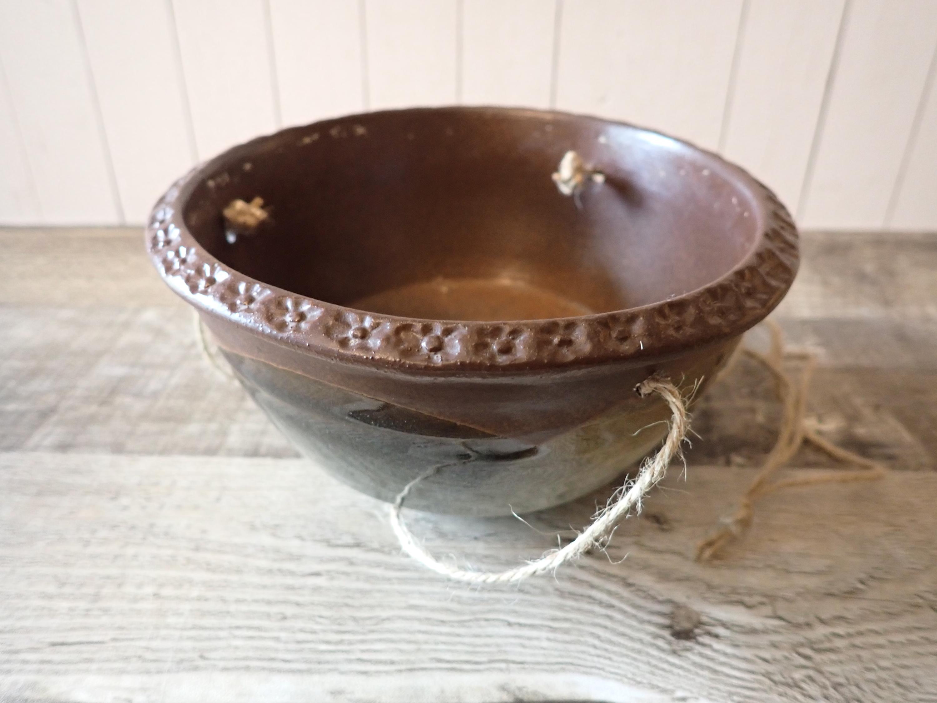 This lovely hanging planter by Pottery Craft USA is 3.5' tall and 6.25" in diameter. It is a round bowl with brown, tan, and blue glaze design. The bowl has a textured floral design around the piece. The bottom of the bowl is marked: POTTERY CRAFT #101 MADE IN USA. There is a 15" twine cord hanger on the planter. The planter is in very good condition with no chips or cracks, however there is some light mineral deposits on the inner rim of the planter.