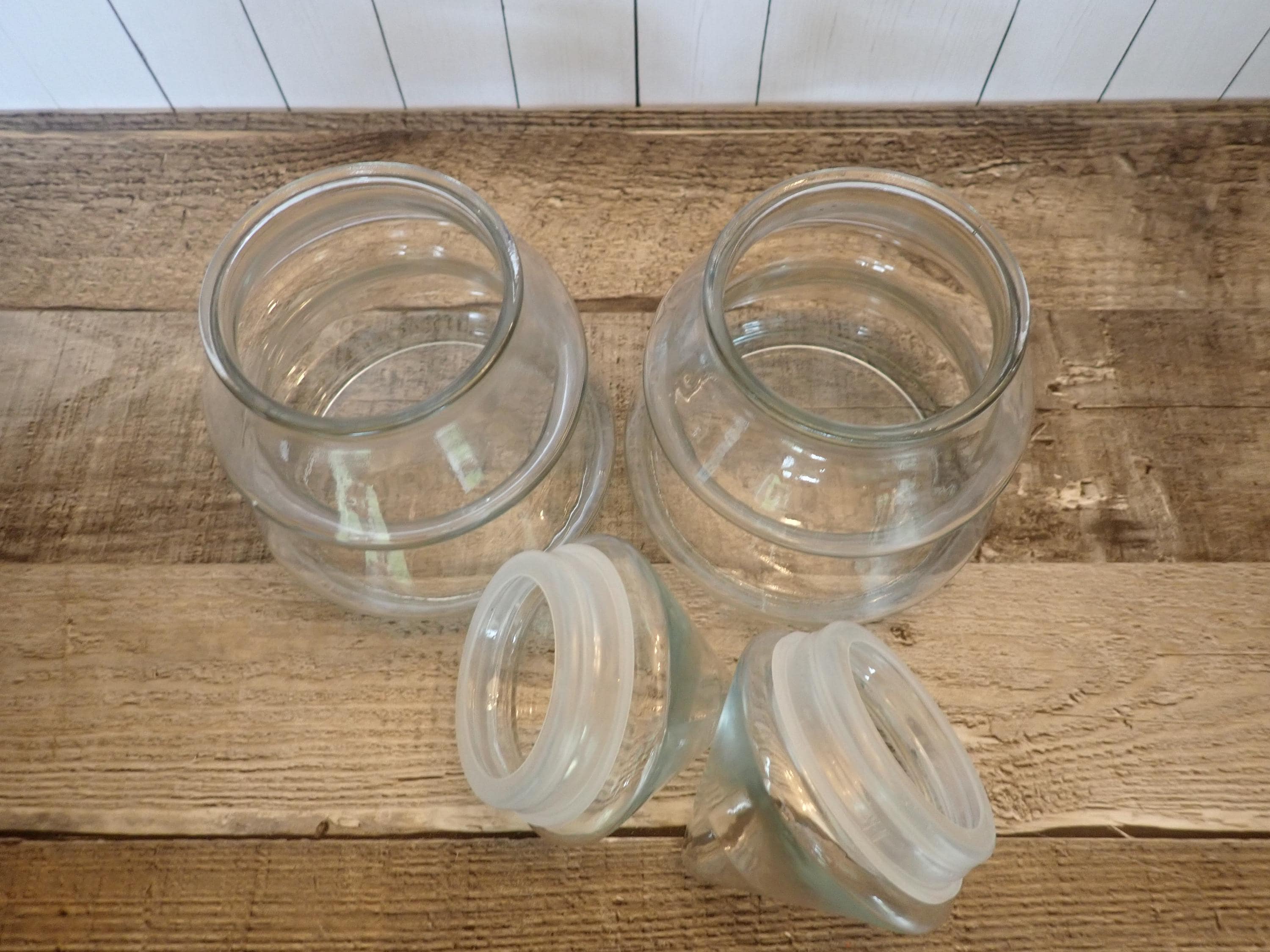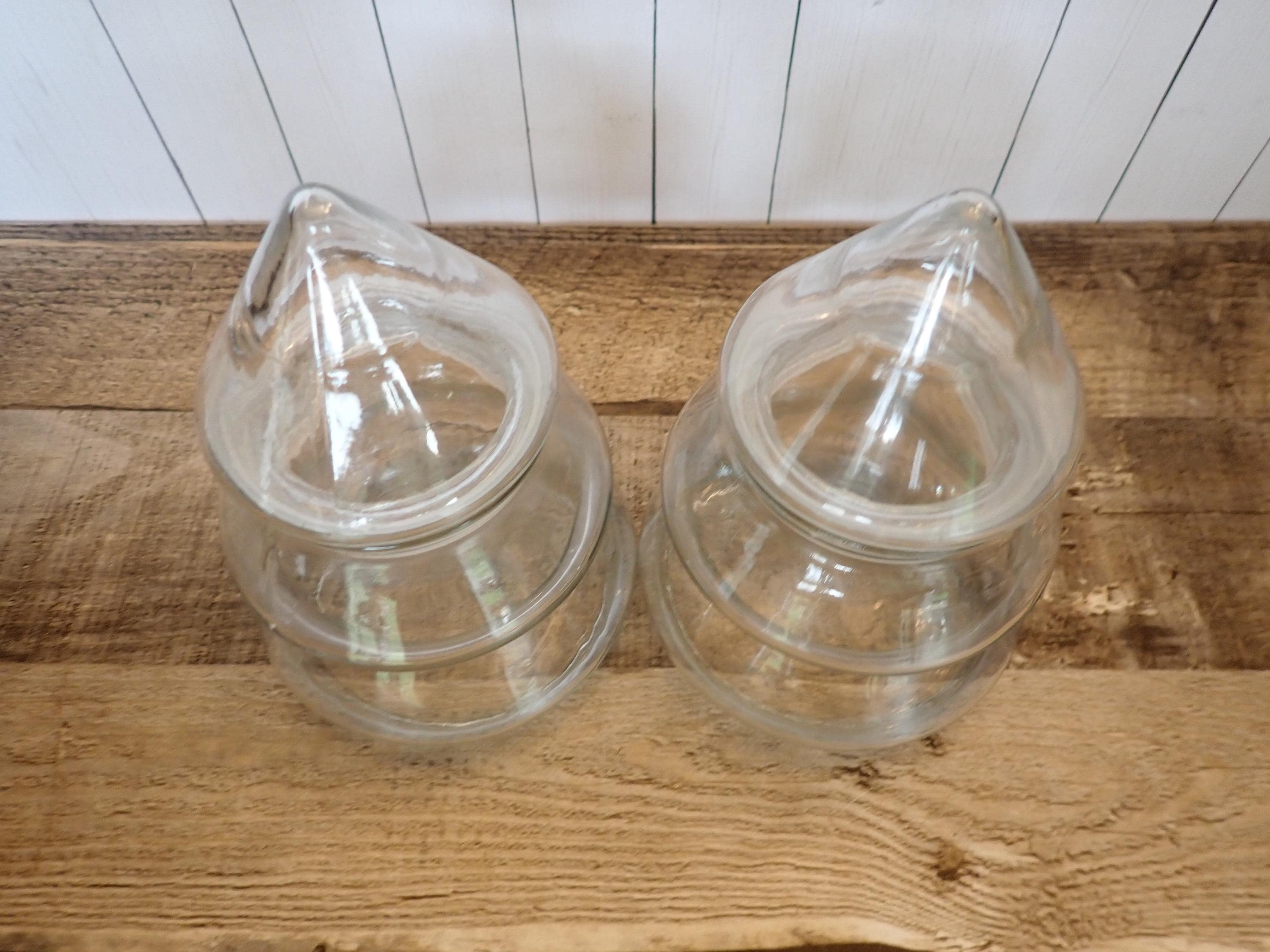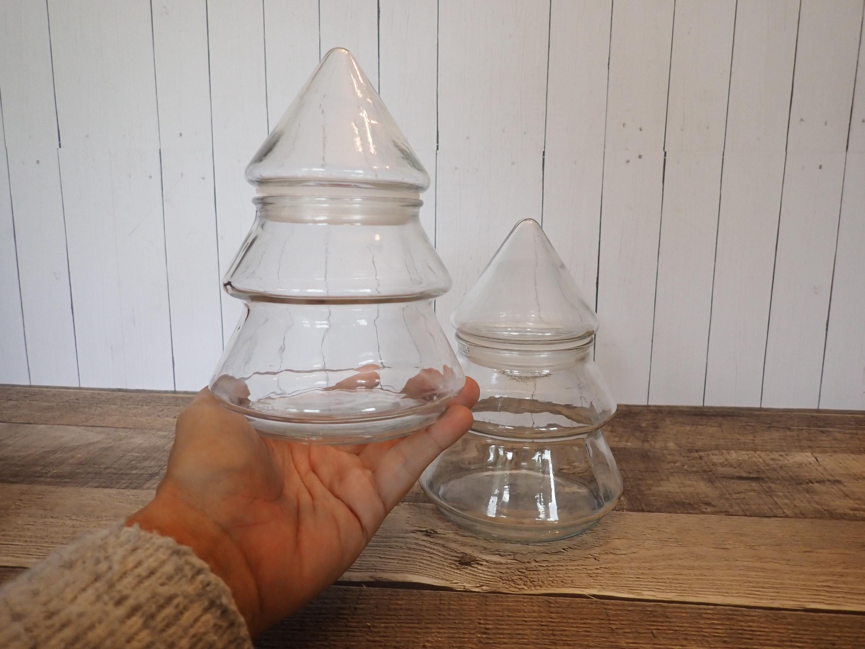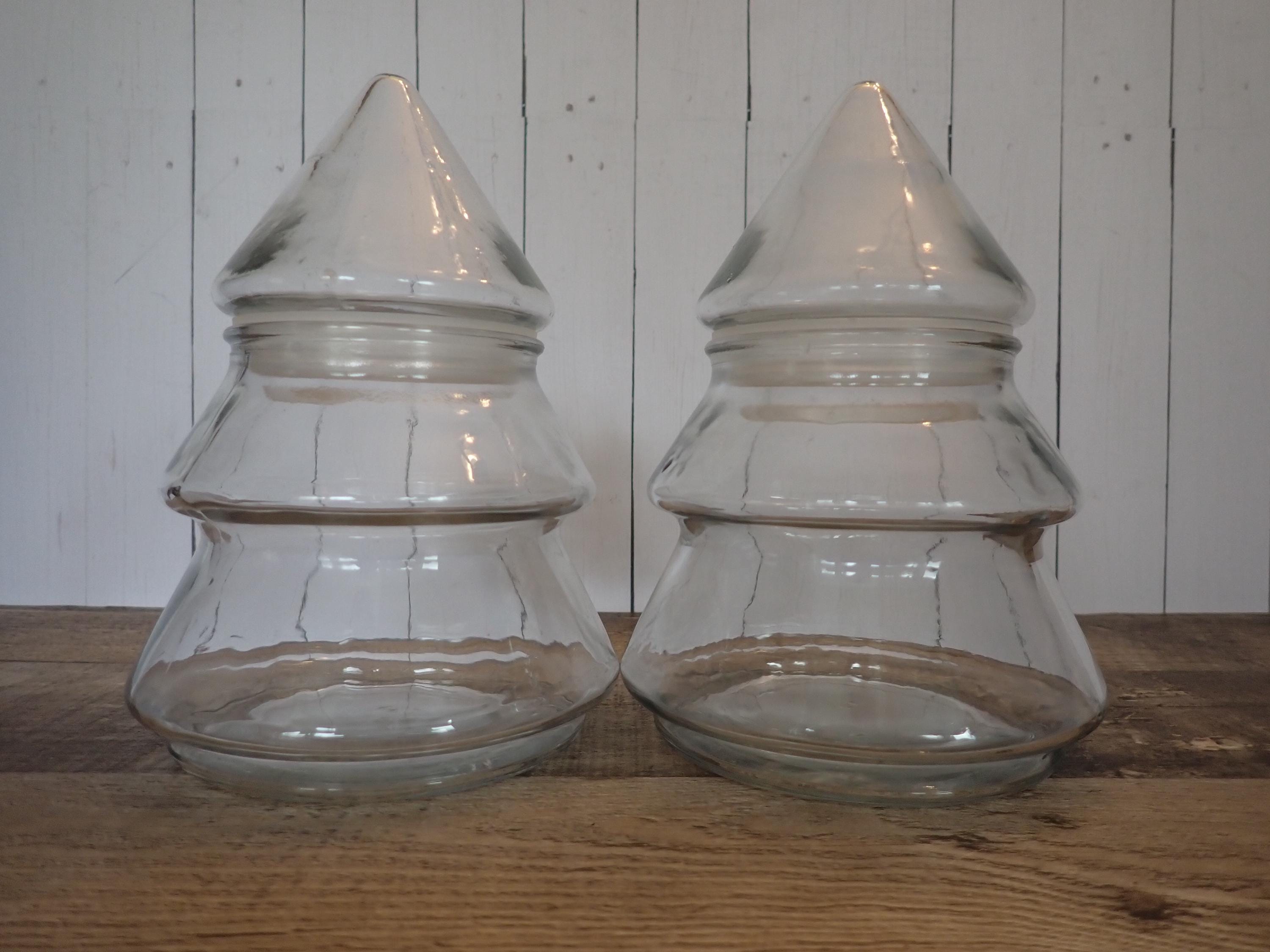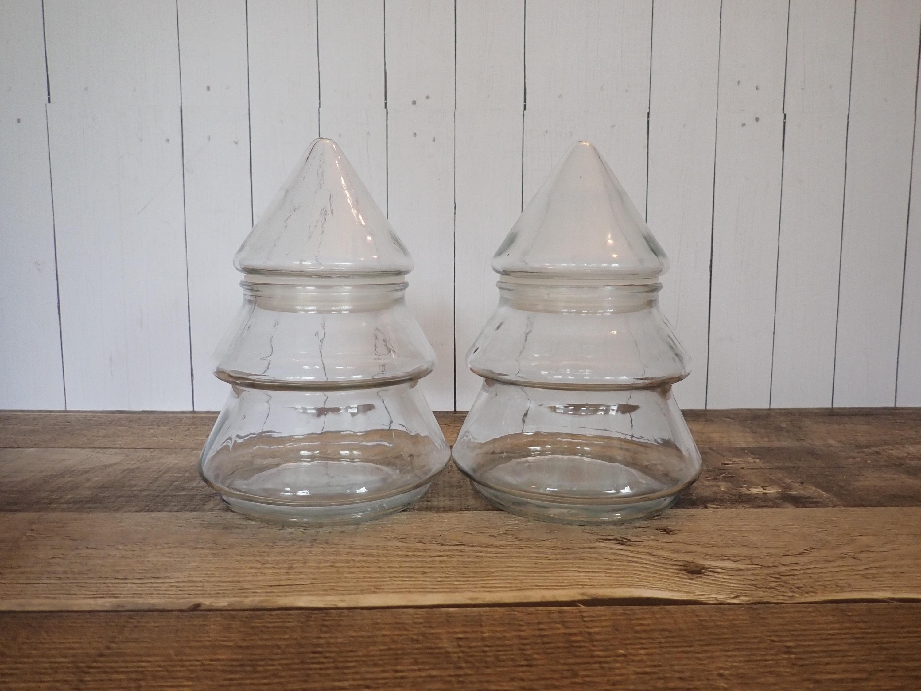 This set of clear glass Christmas tree jars includes 2 jars in the same size and style. The jars are all 6.5" tall and 4.5" in diameter at the base. The top of the jar lifts off about 1/3 of the way down and the opening on the jar is 2.5" in diameter. There are no makers marks on these jars. Both jars are in very good condition with no chips or cracks. Great for candy or snacks, or fill with tinsel, garland, or potpourri!