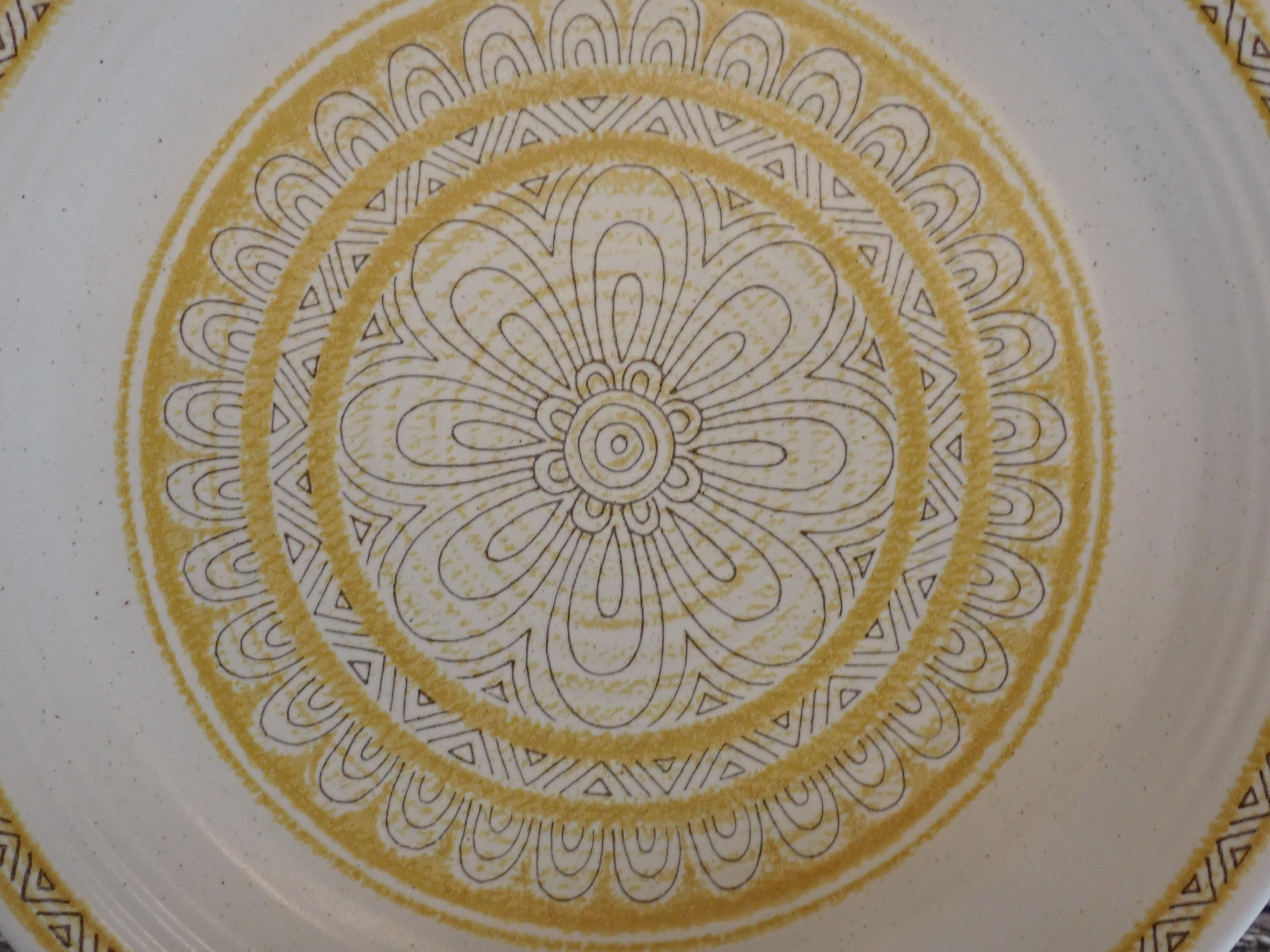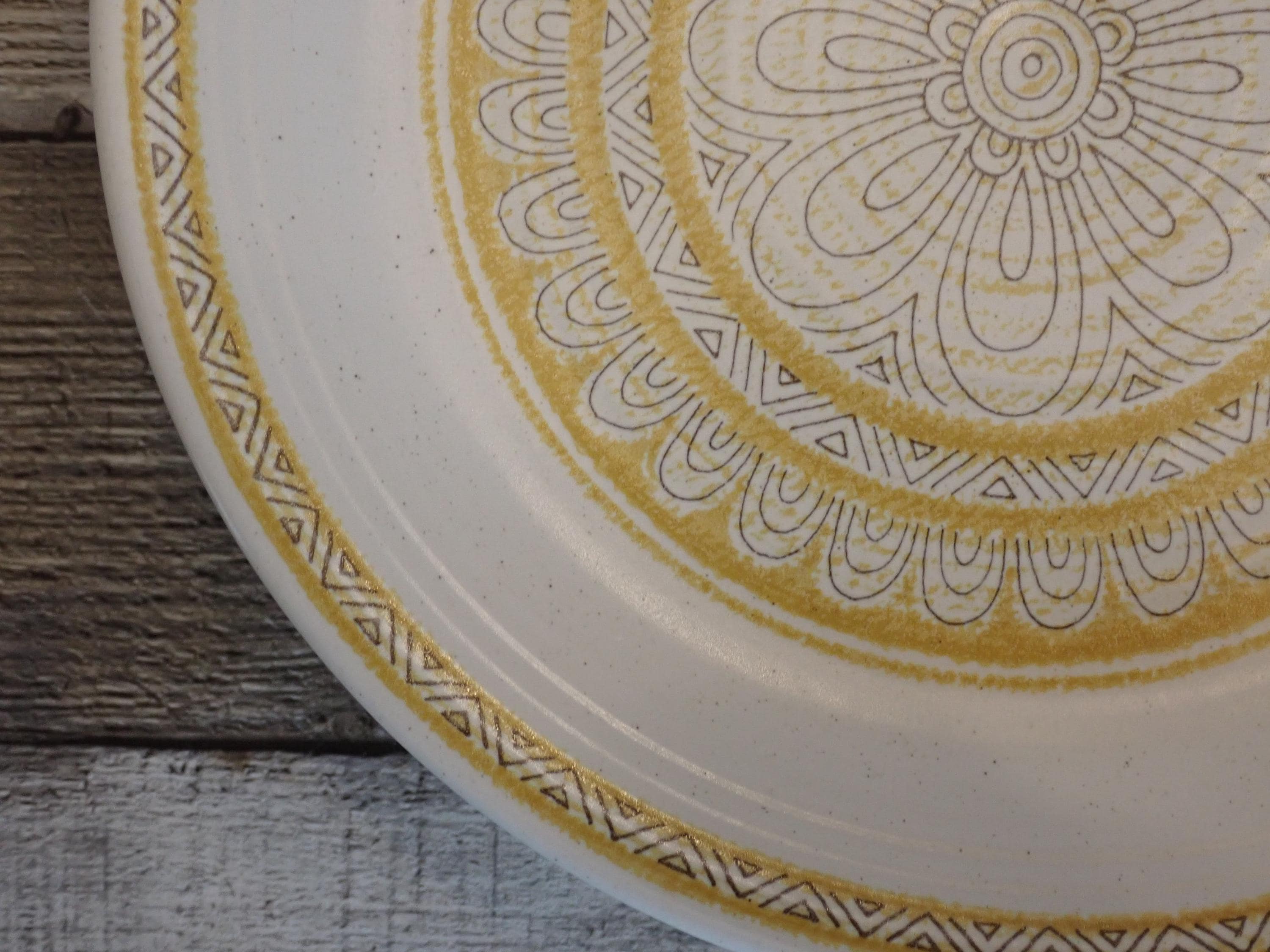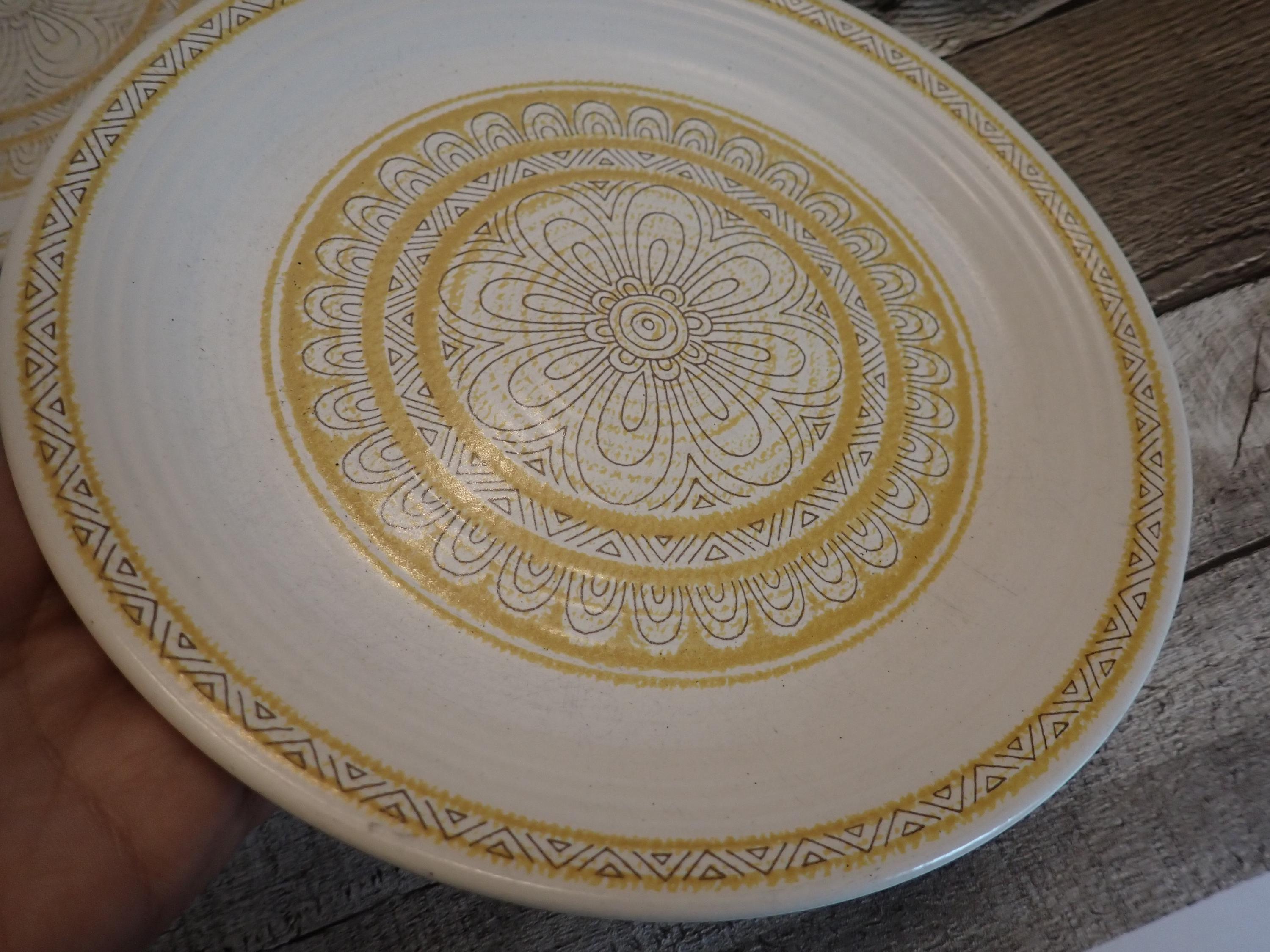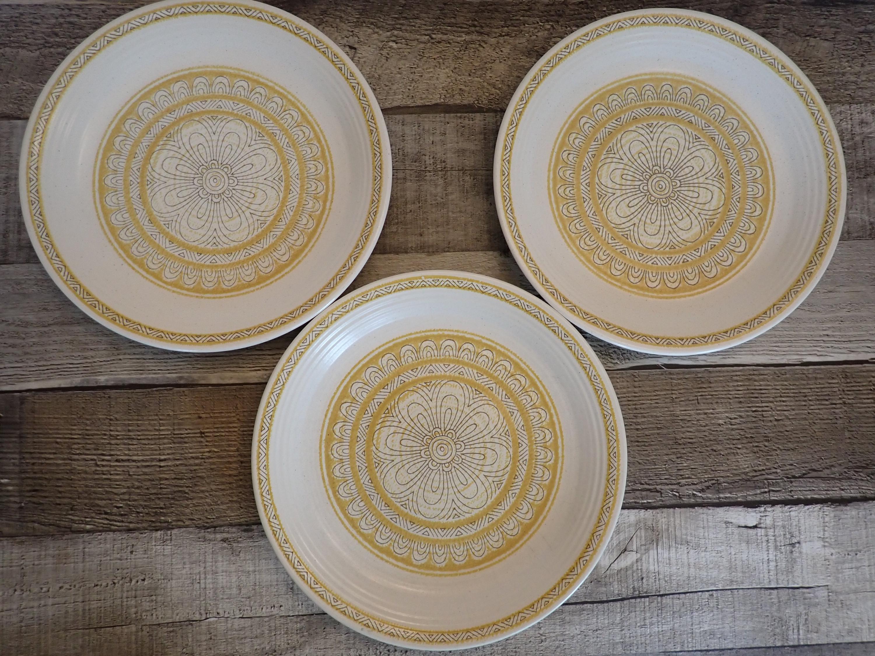 This set of 3 plates by Franciscan are in the Hacienda Gold pattern and are the 8" salad Plates. They are a white ceramic with light brown flecking, and are accented with a yellow and white floral design on the plate. The plates are 8.25" in diameter, and 1" tall at the rim. The bottoms are marked with the Franciscan logo. All 3 plates are in very good condition with no chips or cracks, and very few surface scratches.