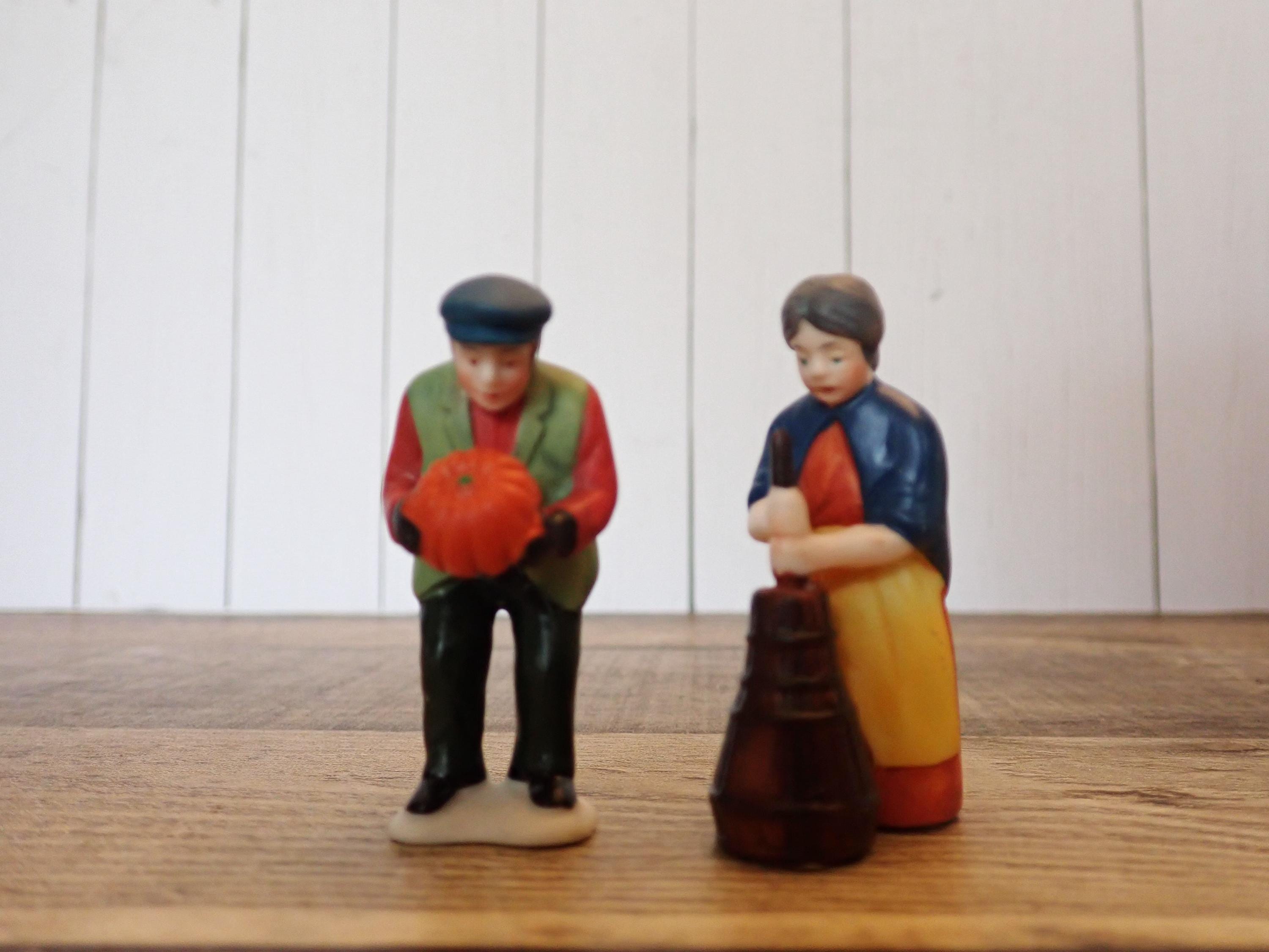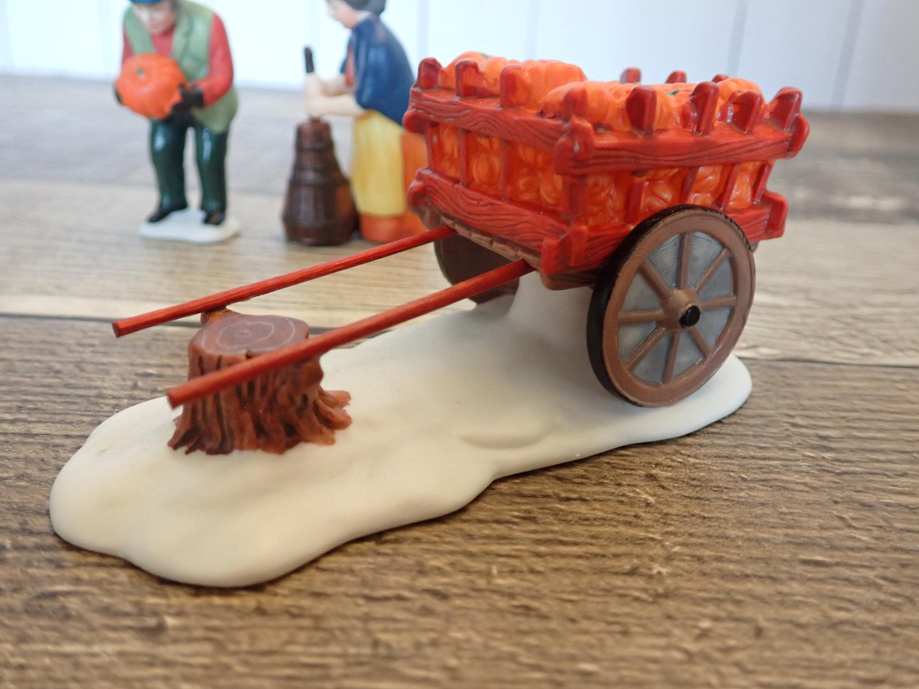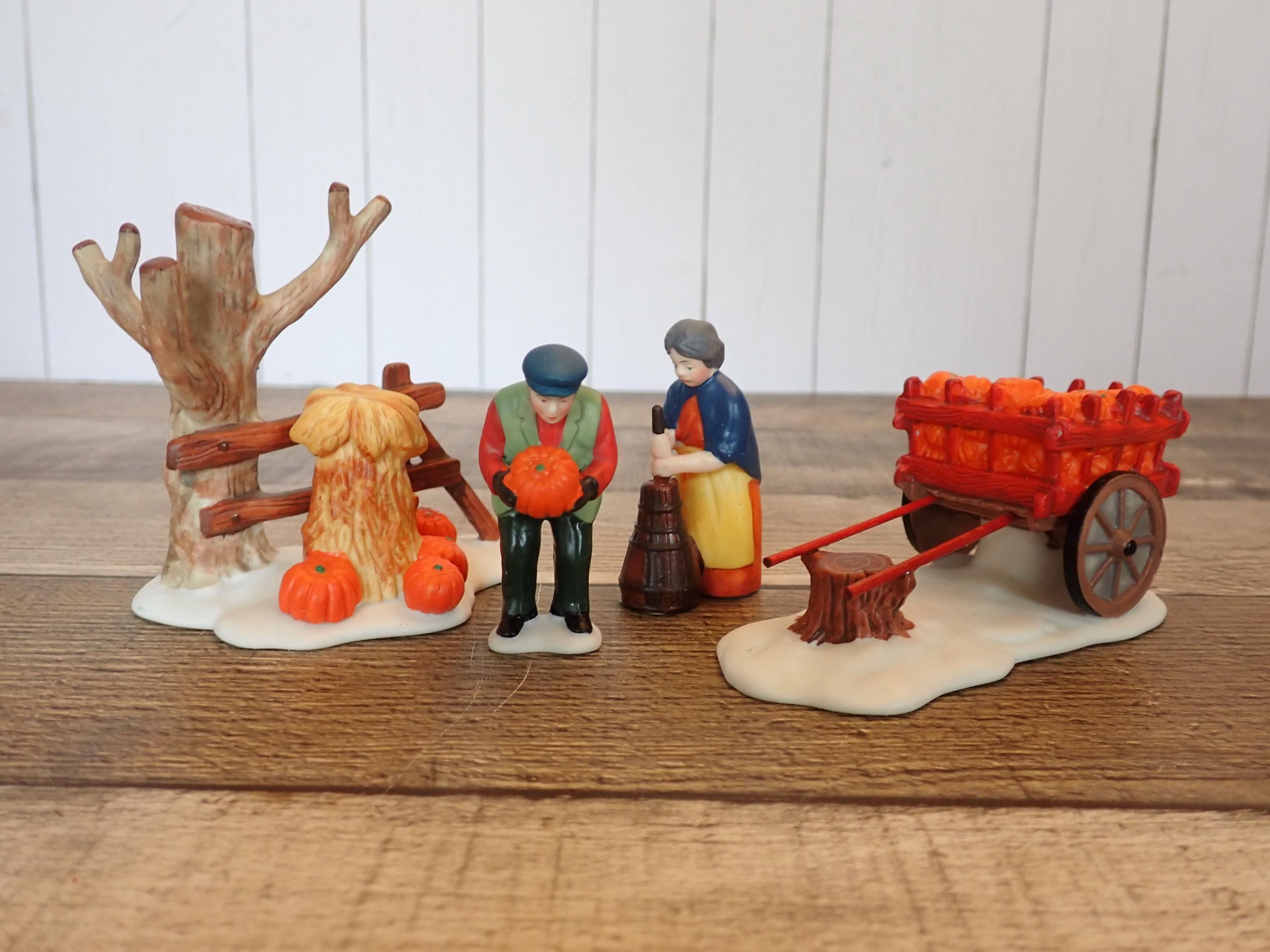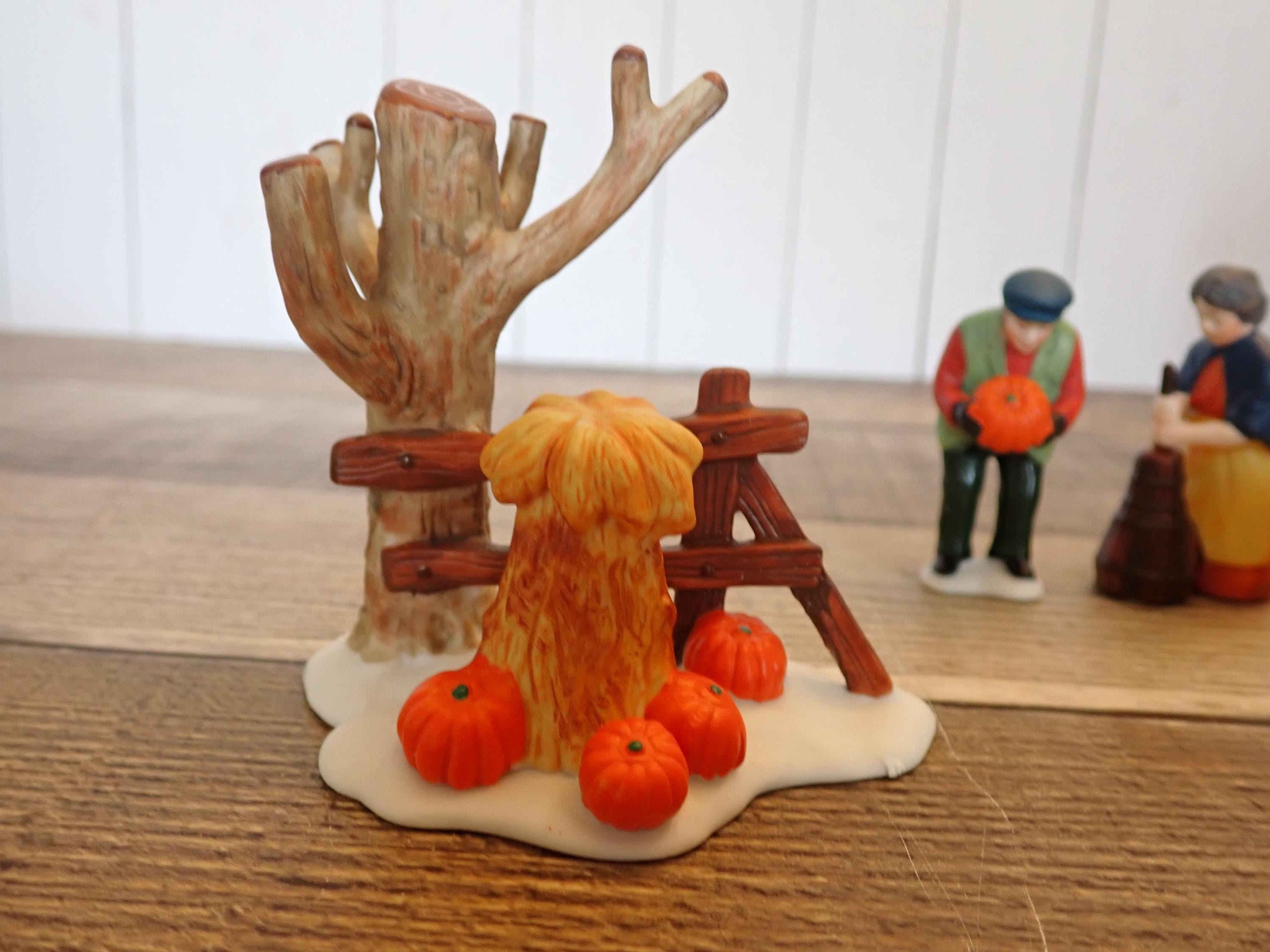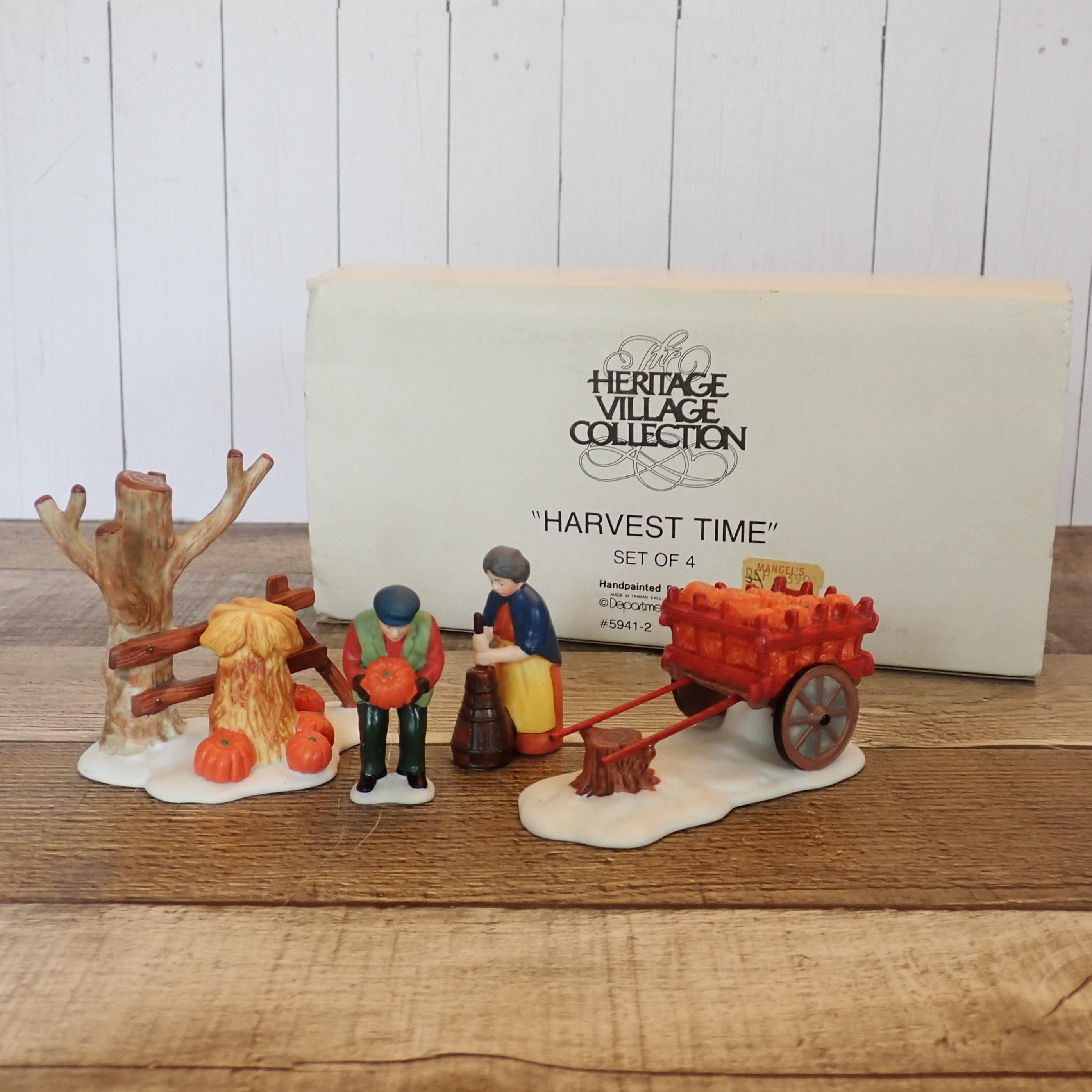 This Dept 56 figurine set is the Harvest Time 5941-2 set of 4 figurines. They are hand painted porcelain accessories, and includes 2 people, a wagon, and a tree and fence section. All of the pieces are in very good condition with no chips or cracks. Includes the original box and sleeve.