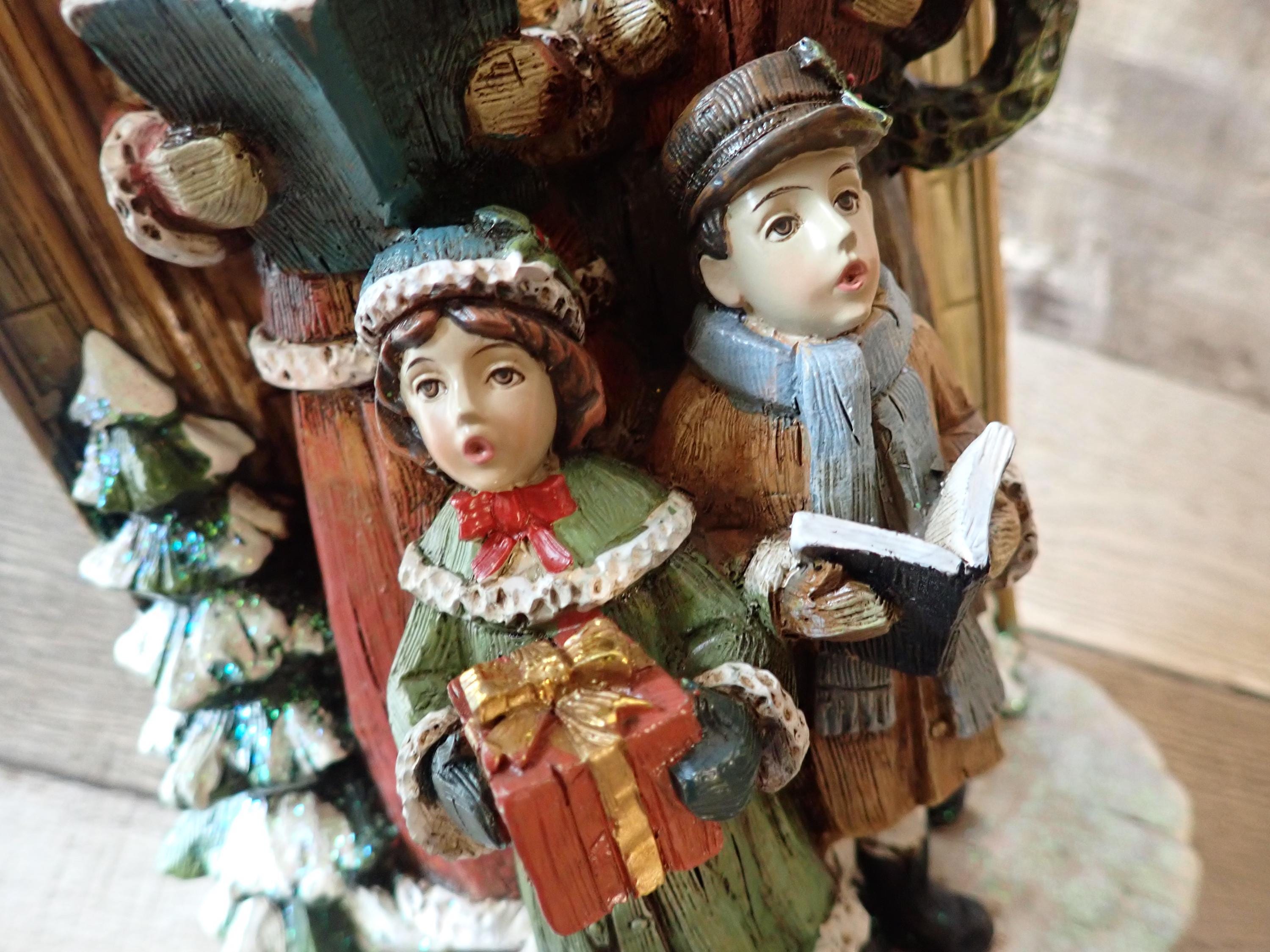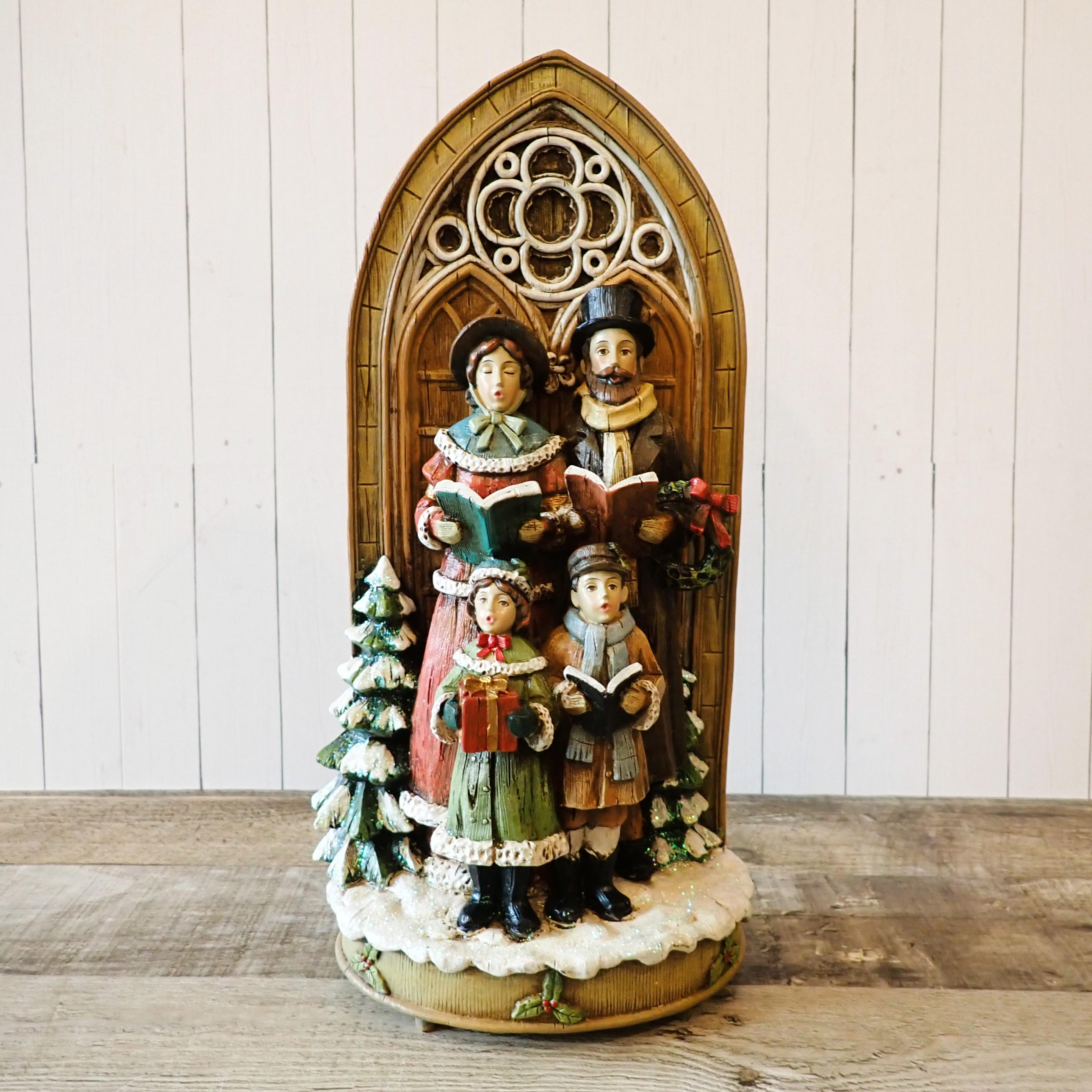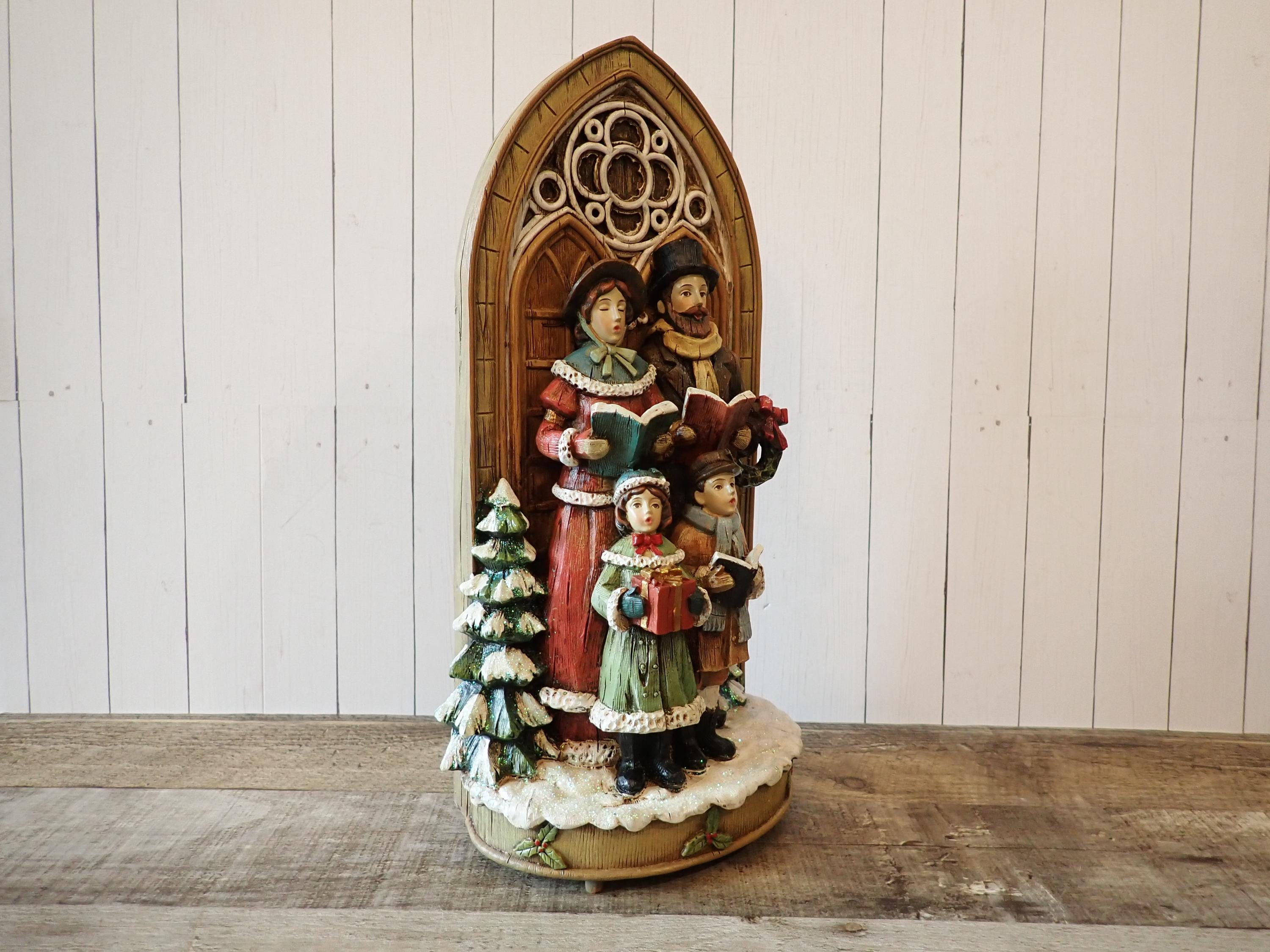 This lovely caroler figurine includes a man, woman, and 2 children standing in front of a church door. The figurine is 13.5" tall, and 6.5" tall. The figurine is made of a plastic/resin material that is made to look like carved wood, and is painted with natural, earthy colors. Each person holds a book or present in their hands, and they stand in front of an ornate church door with pine trees on the sides. There is glittery snow on the trees and on the base. The base of the piece is a music box. There are no makers marks on the piece. The figurine is in very good condition with no damage.