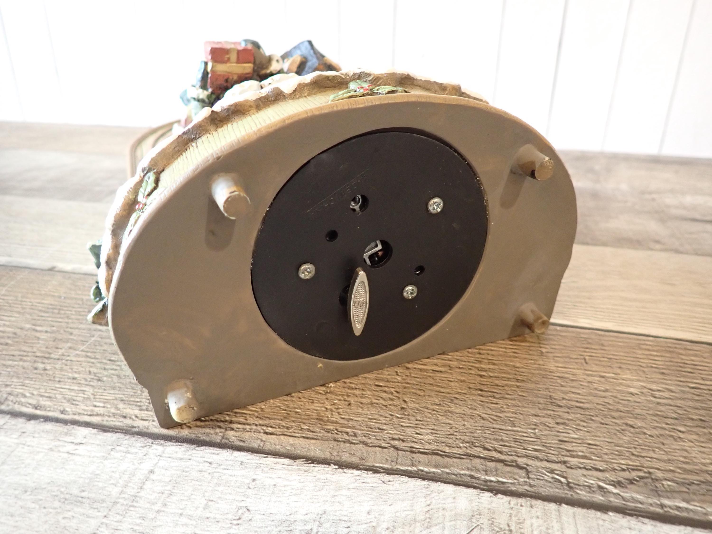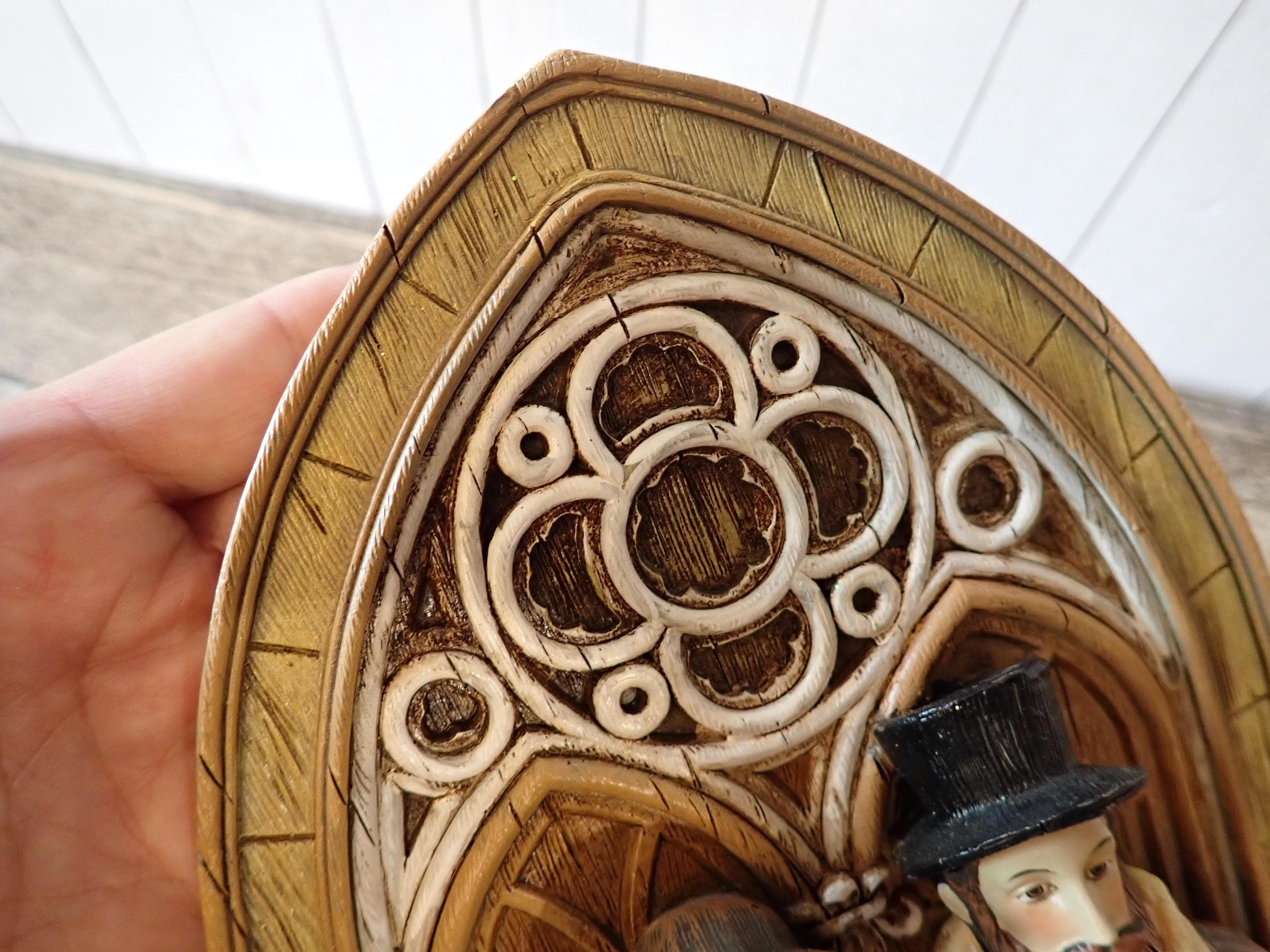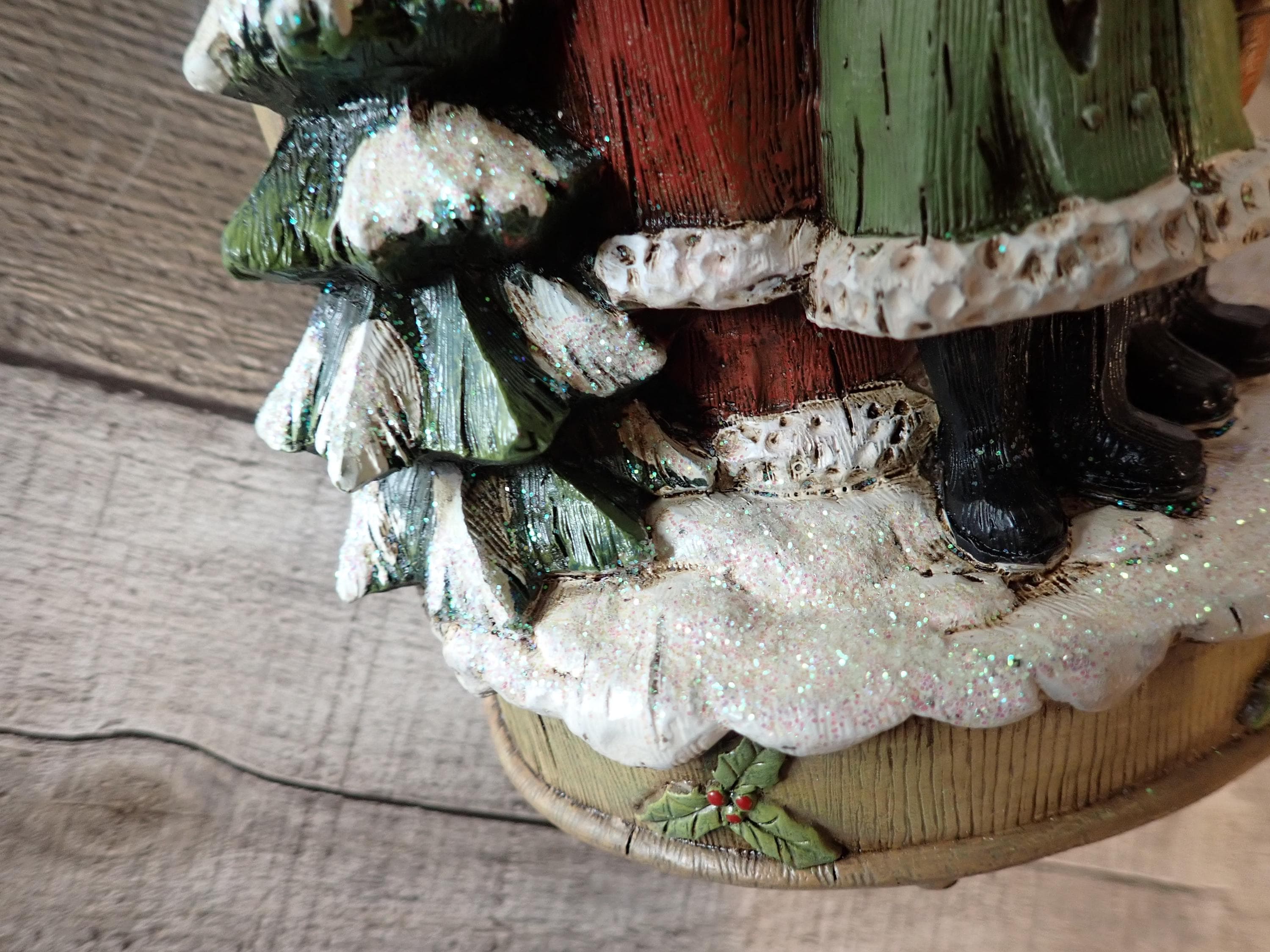 This lovely caroler figurine includes a man, woman, and 2 children standing in front of a church door. The figurine is 13.5" tall, and 6.5" tall. The figurine is made of a plastic/resin material that is made to look like carved wood, and is painted with natural, earthy colors. Each person holds a book or present in their hands, and they stand in front of an ornate church door with pine trees on the sides. There is glittery snow on the trees and on the base. The base of the piece is a music box. There are no makers marks on the piece. The figurine is in very good condition with no damage.