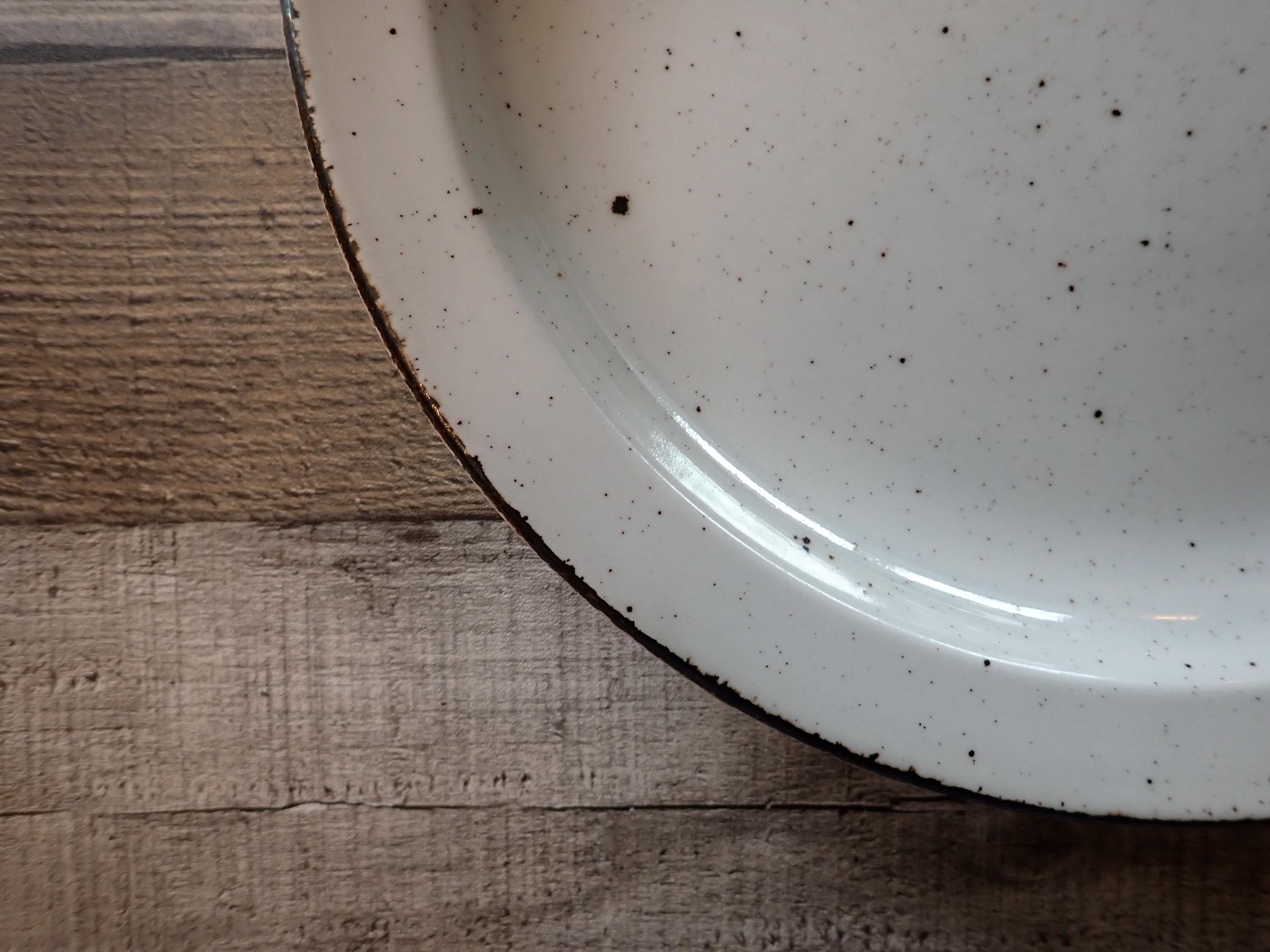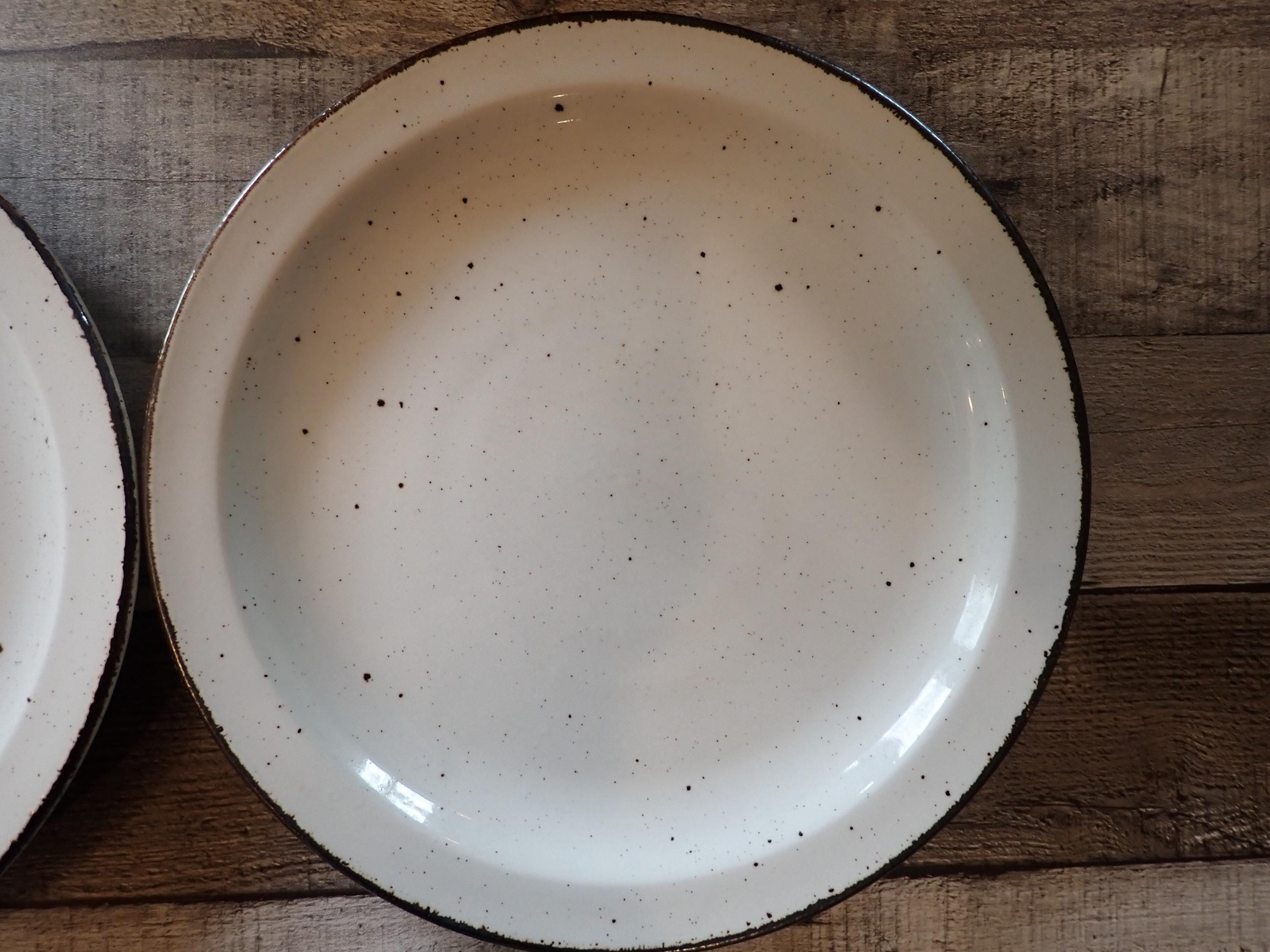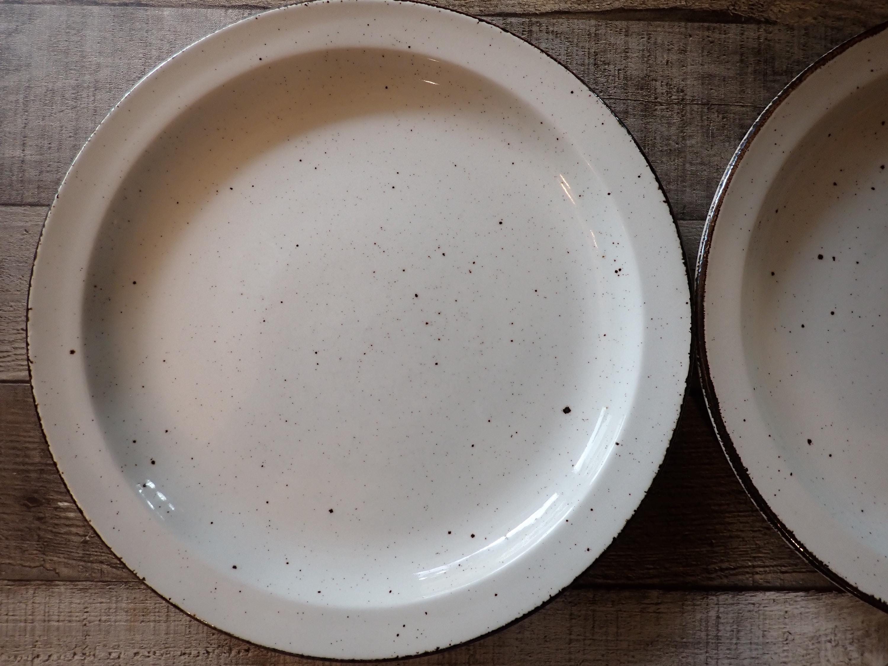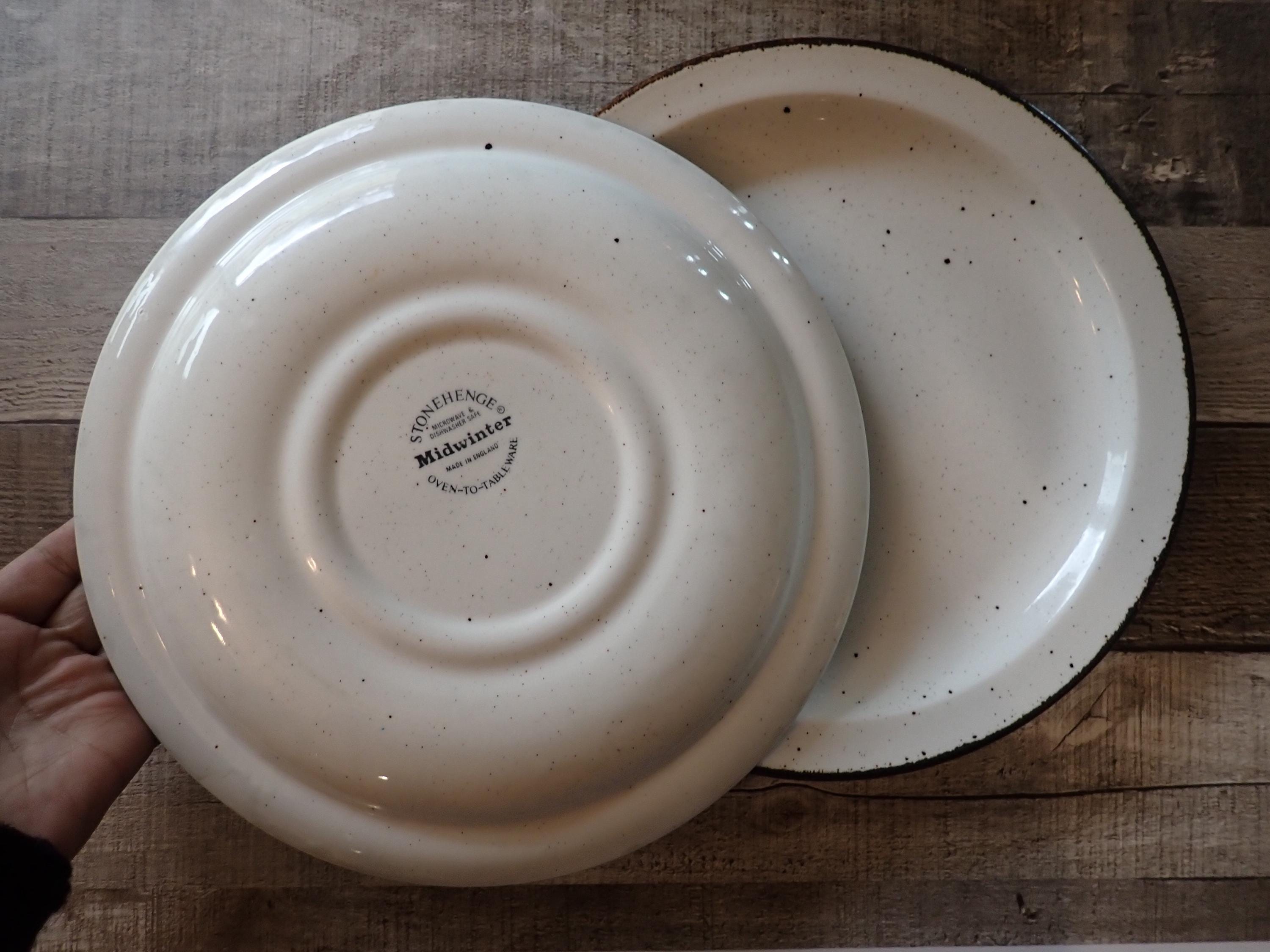 This set of 2 dinner plates by Midwinter are in the Creation Pattern. They are 10 1/4" in diameter and 1" high. They are a white ceramic with a brown speckled pattern on the plate, and a brown band around the rim. The back of each plate is marked: STONEHENGE / MICROWAVE & DISHWASHER SAFE / MIDWINTER / MADE IN ENGLAND / OVEN TO TABLEWARE. Both plates are in very good condition with no chips or cracks. There are some light surface scratches from use.