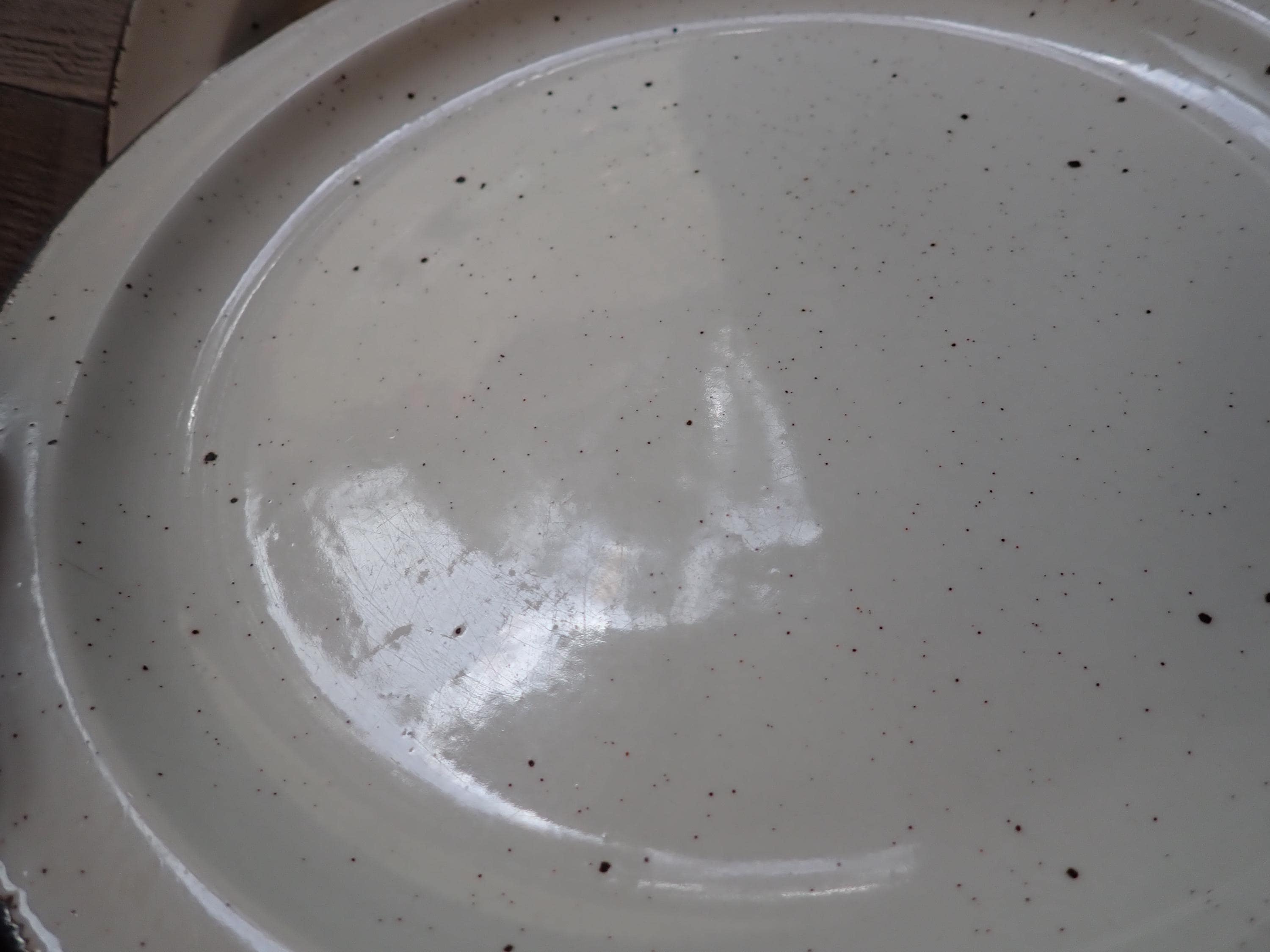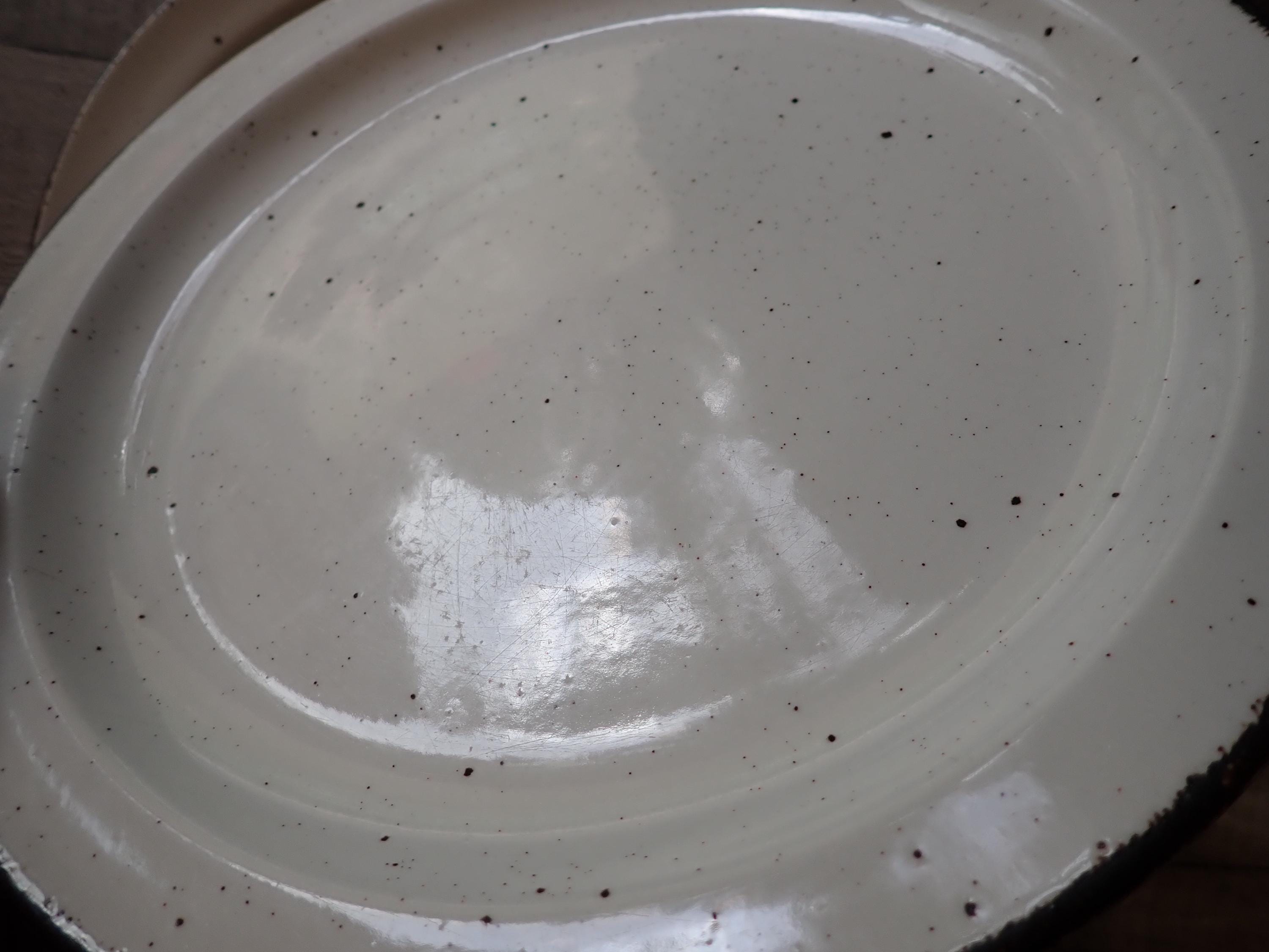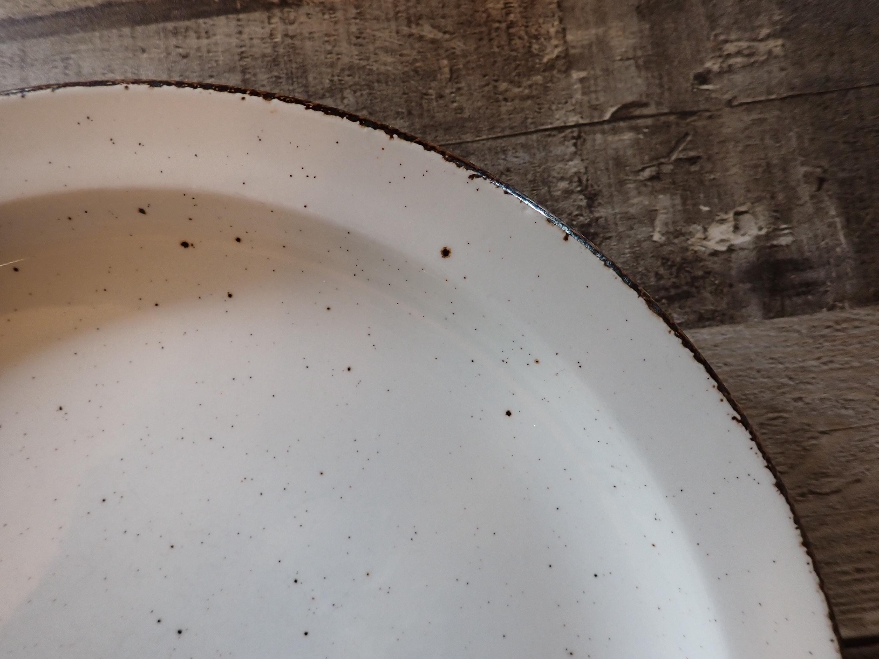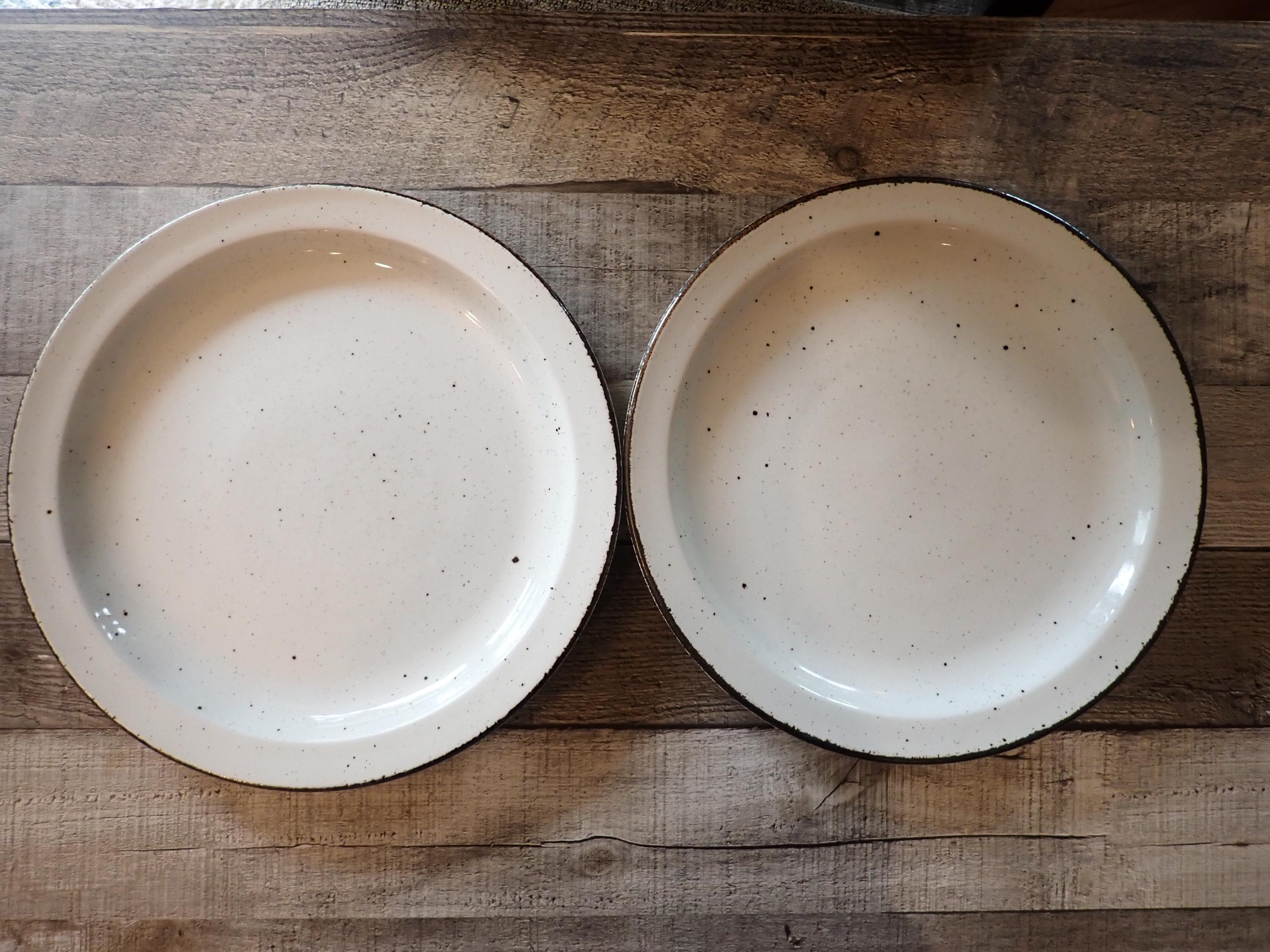 This set of 2 dinner plates by Midwinter are in the Creation Pattern. They are 10 1/4" in diameter and 1" high. They are a white ceramic with a brown speckled pattern on the plate, and a brown band around the rim. The back of each plate is marked: STONEHENGE / MICROWAVE & DISHWASHER SAFE / MIDWINTER / MADE IN ENGLAND / OVEN TO TABLEWARE. Both plates are in very good condition with no chips or cracks. There are some light surface scratches from use.