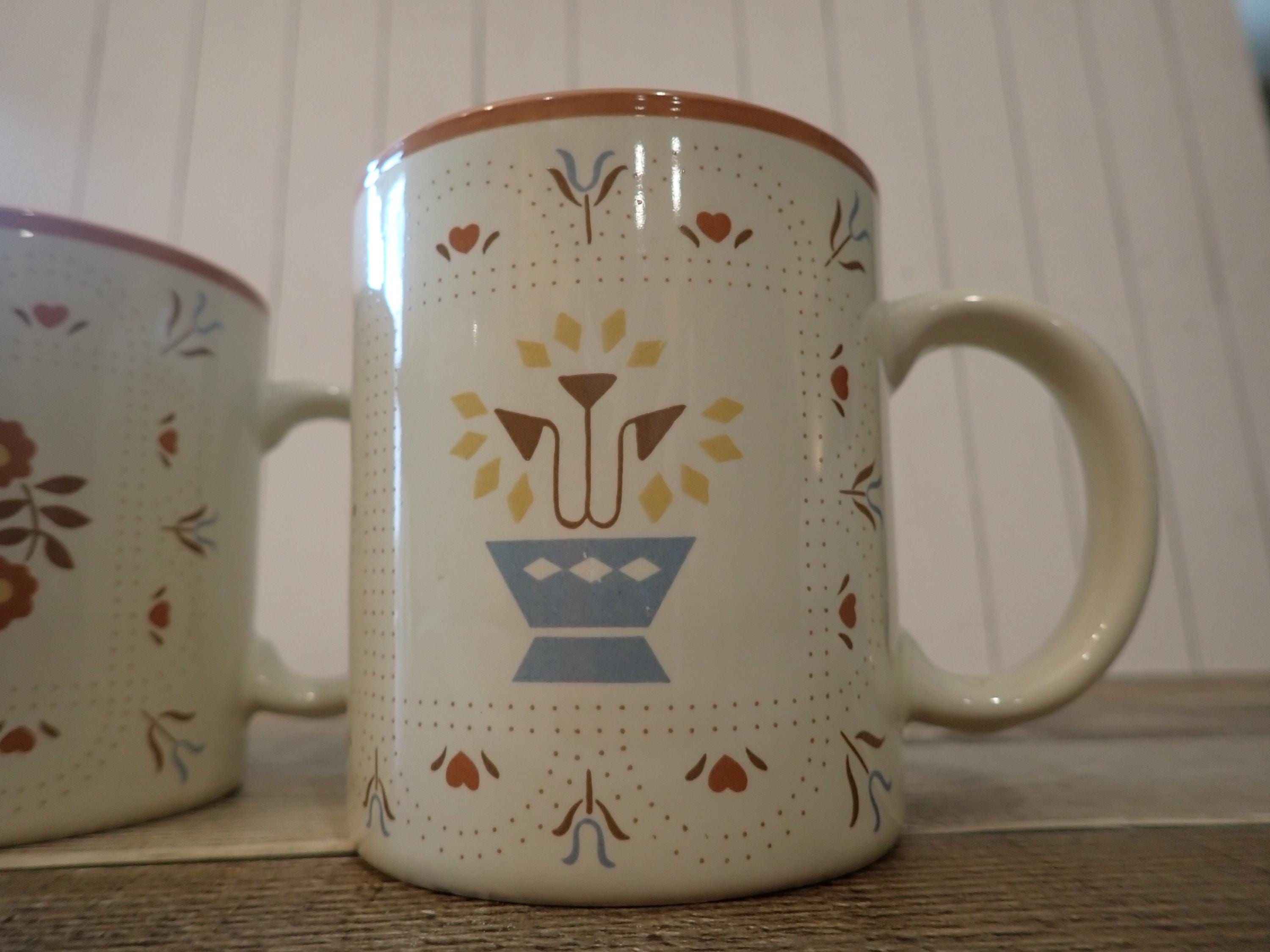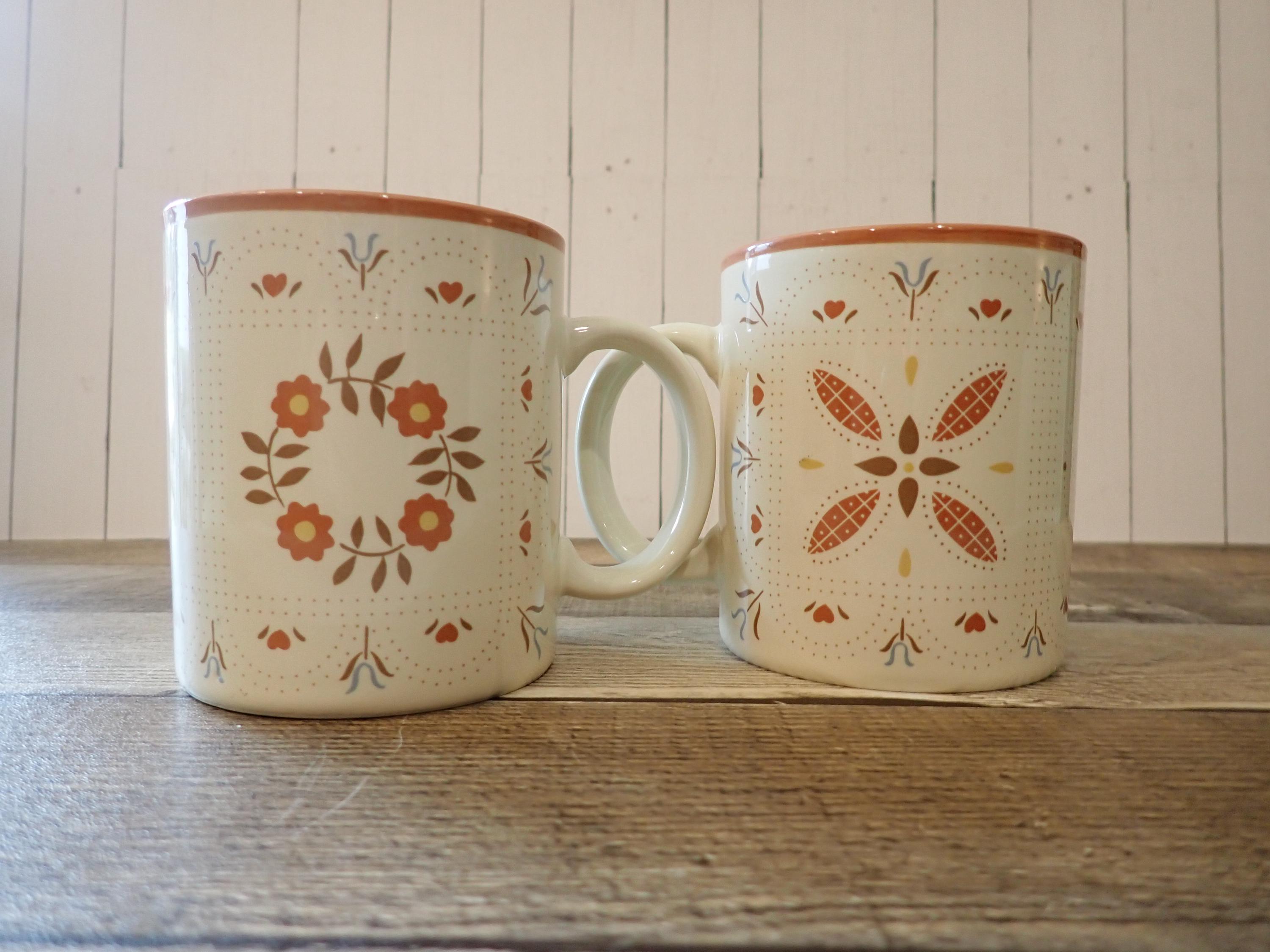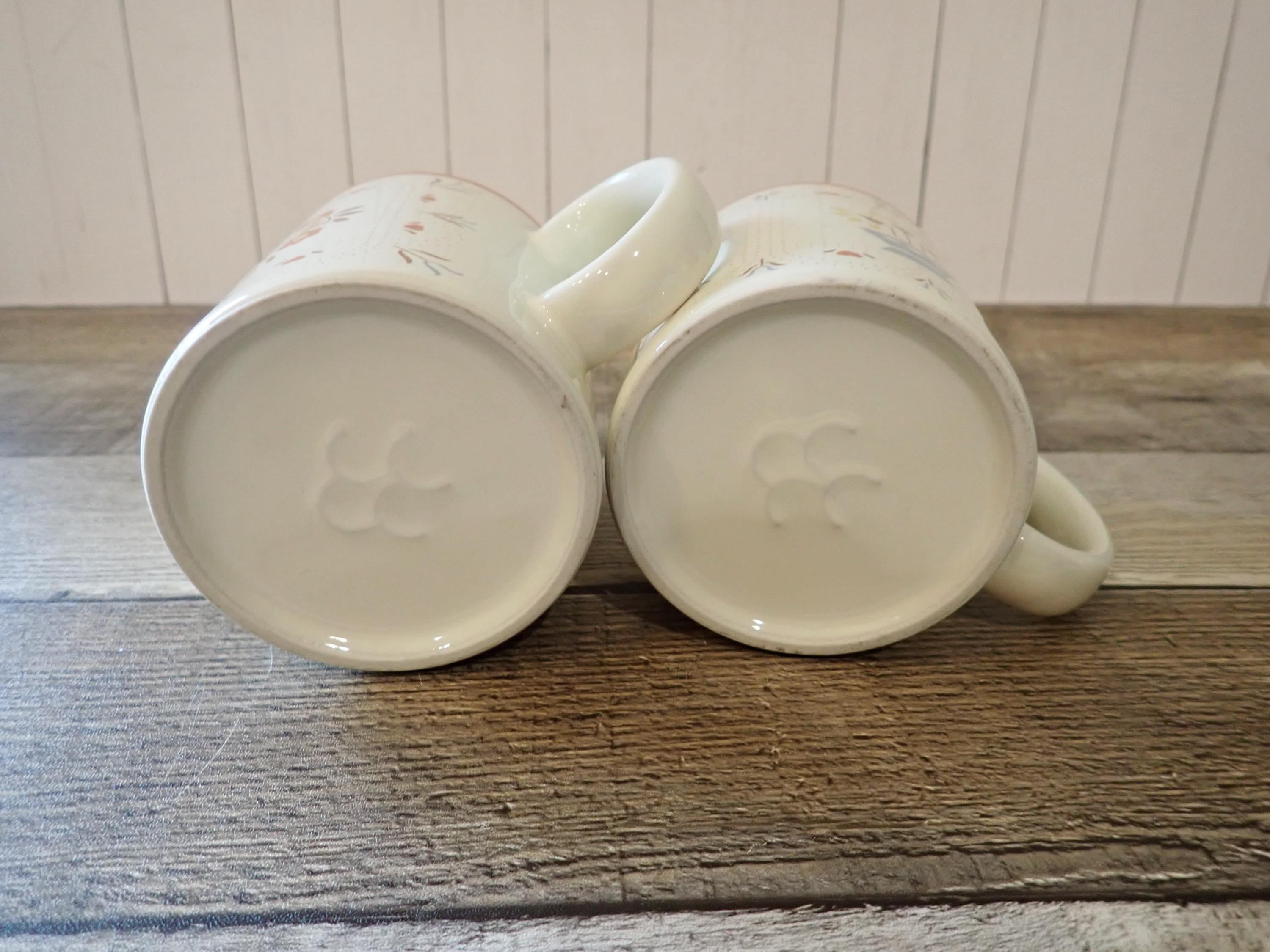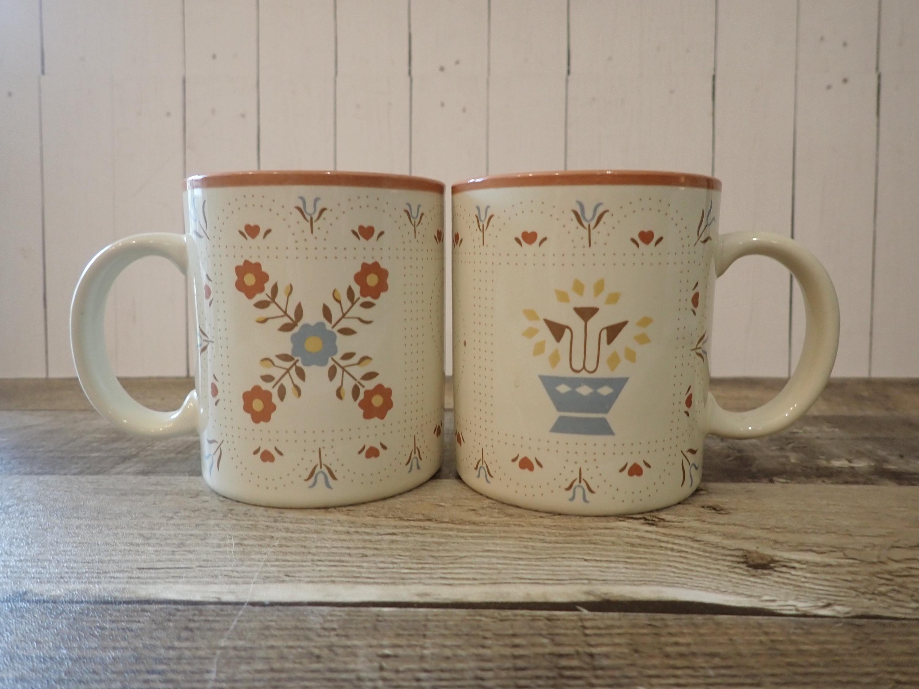 This set of 2 stoneware mugs includes coordinating cream-colored mugs with floral designs. They are each 3.75" tall and 3" in diameter. With the handles, they are 4.5" wide. Both mugs are marked on the bottom: CCCC. They can hold 10 oz. Both mugs are in very good condition with no chips or cracks. Great set of rustic mid century stoneware mugs!