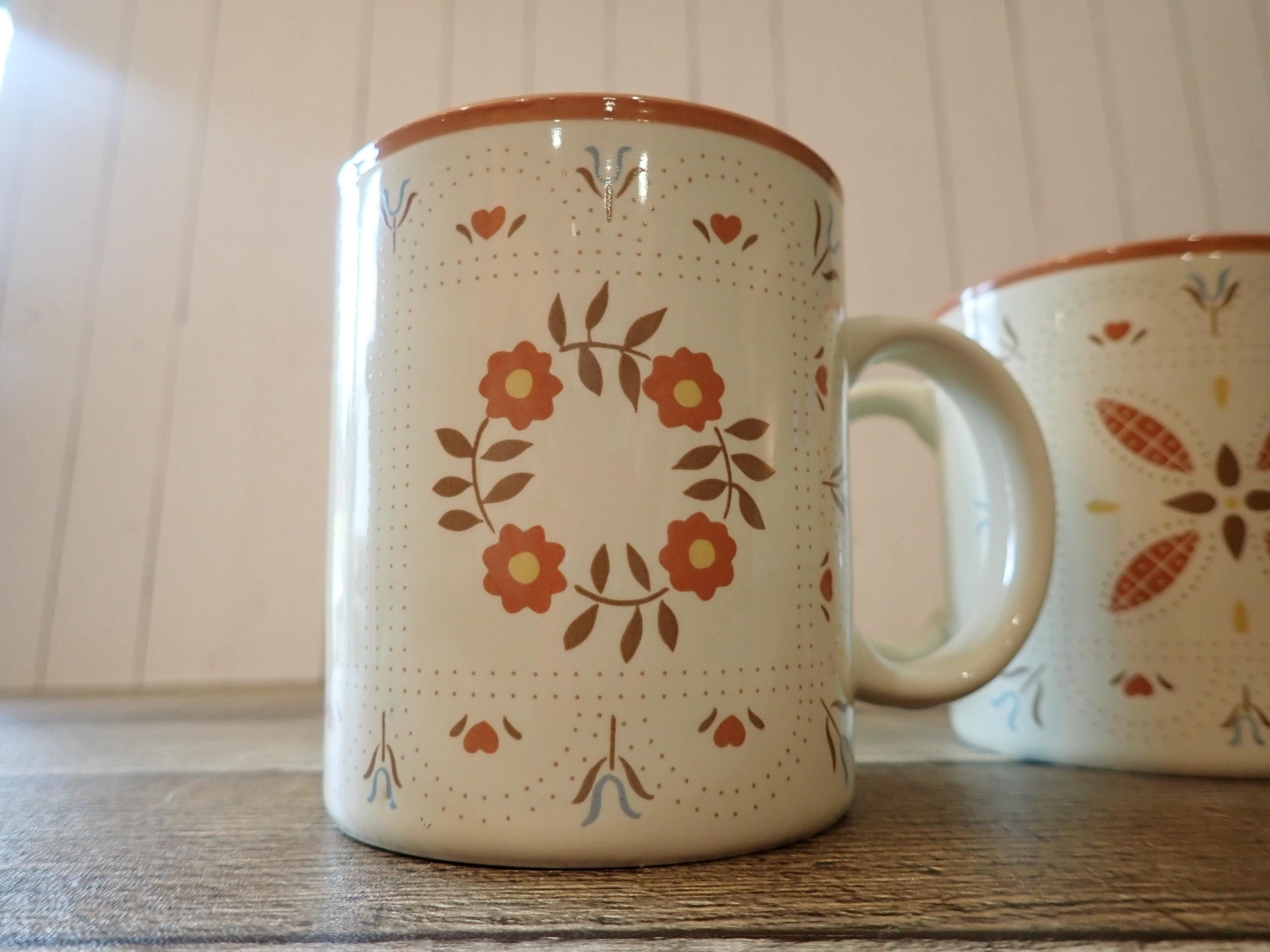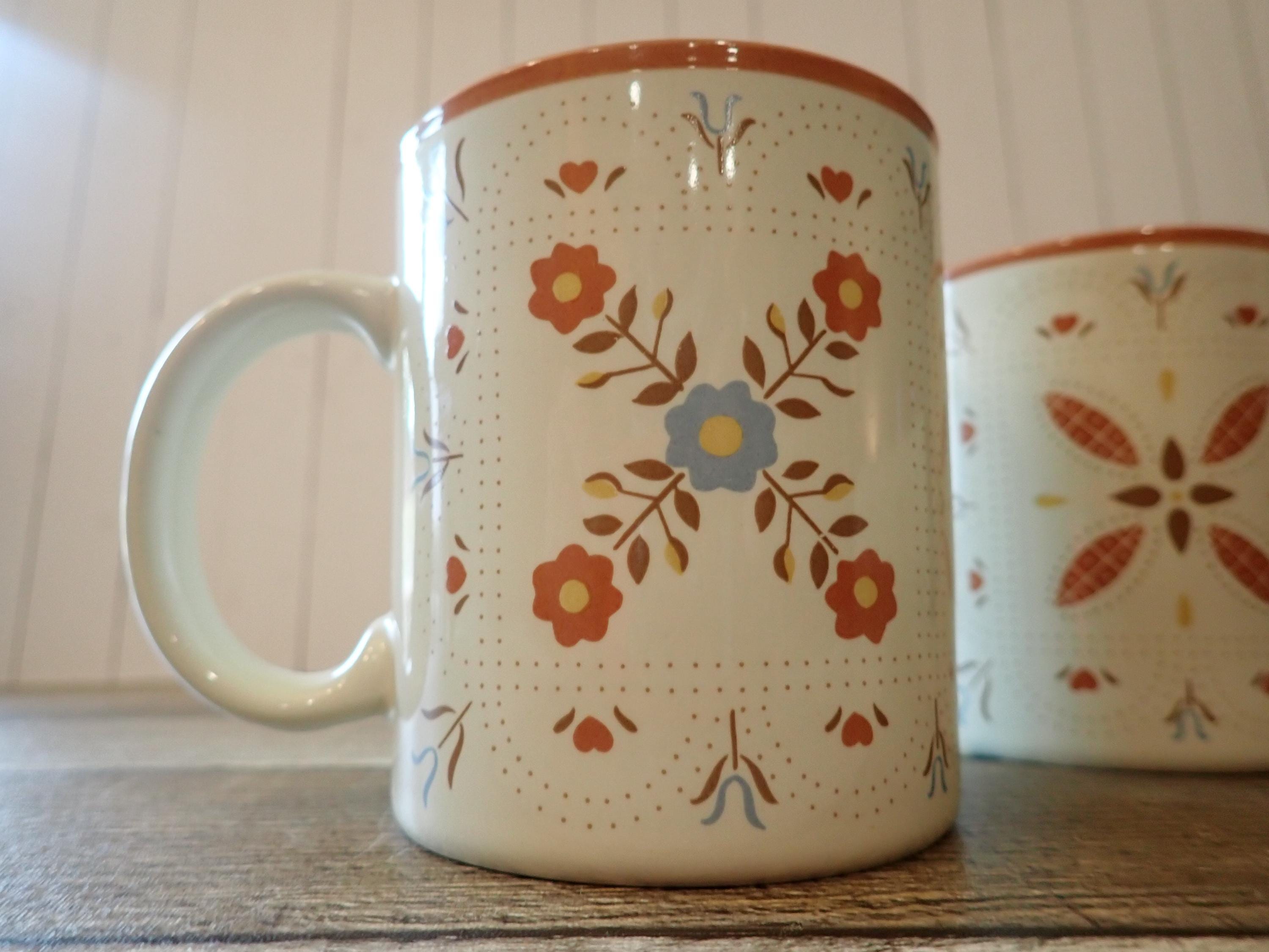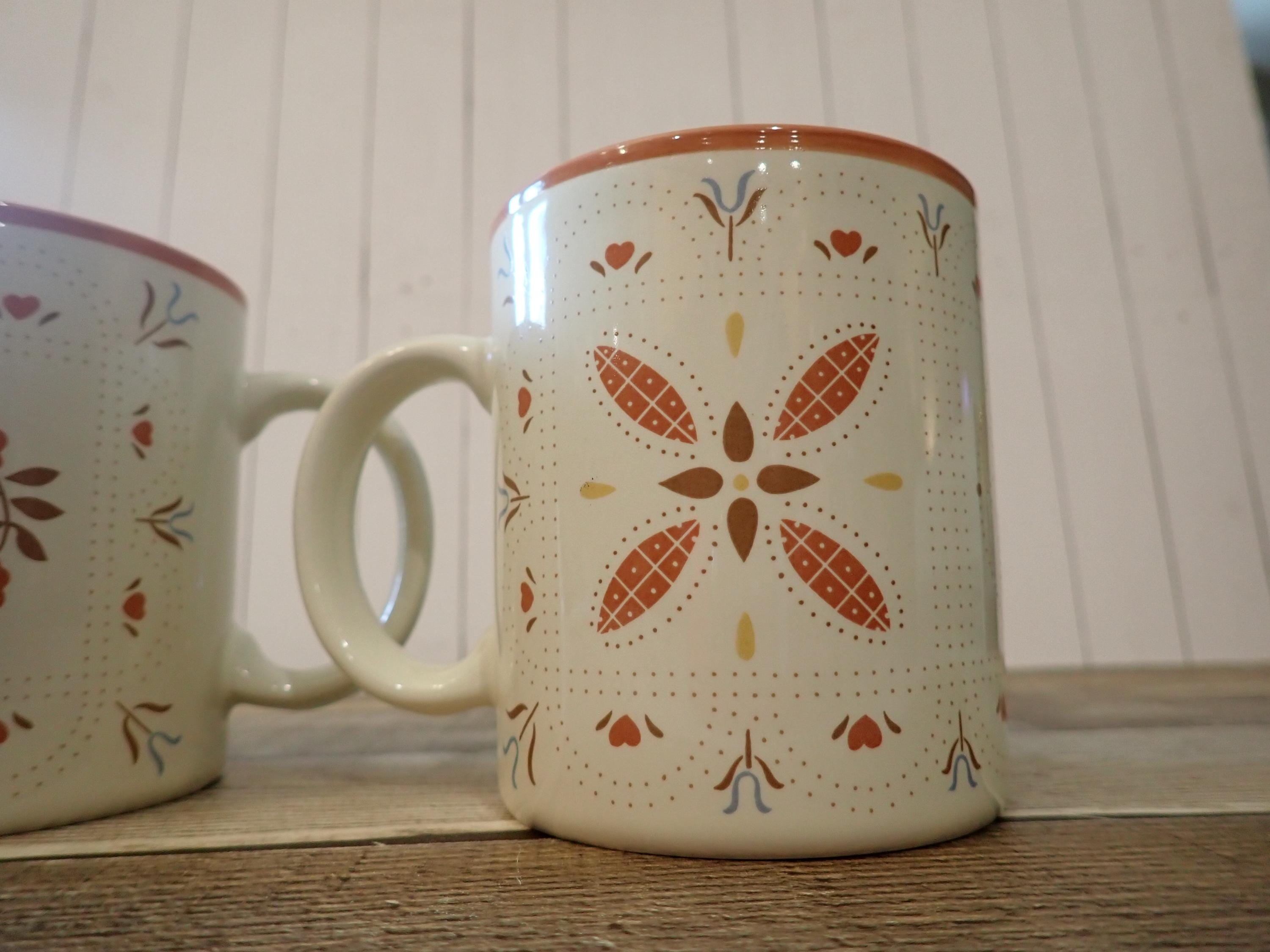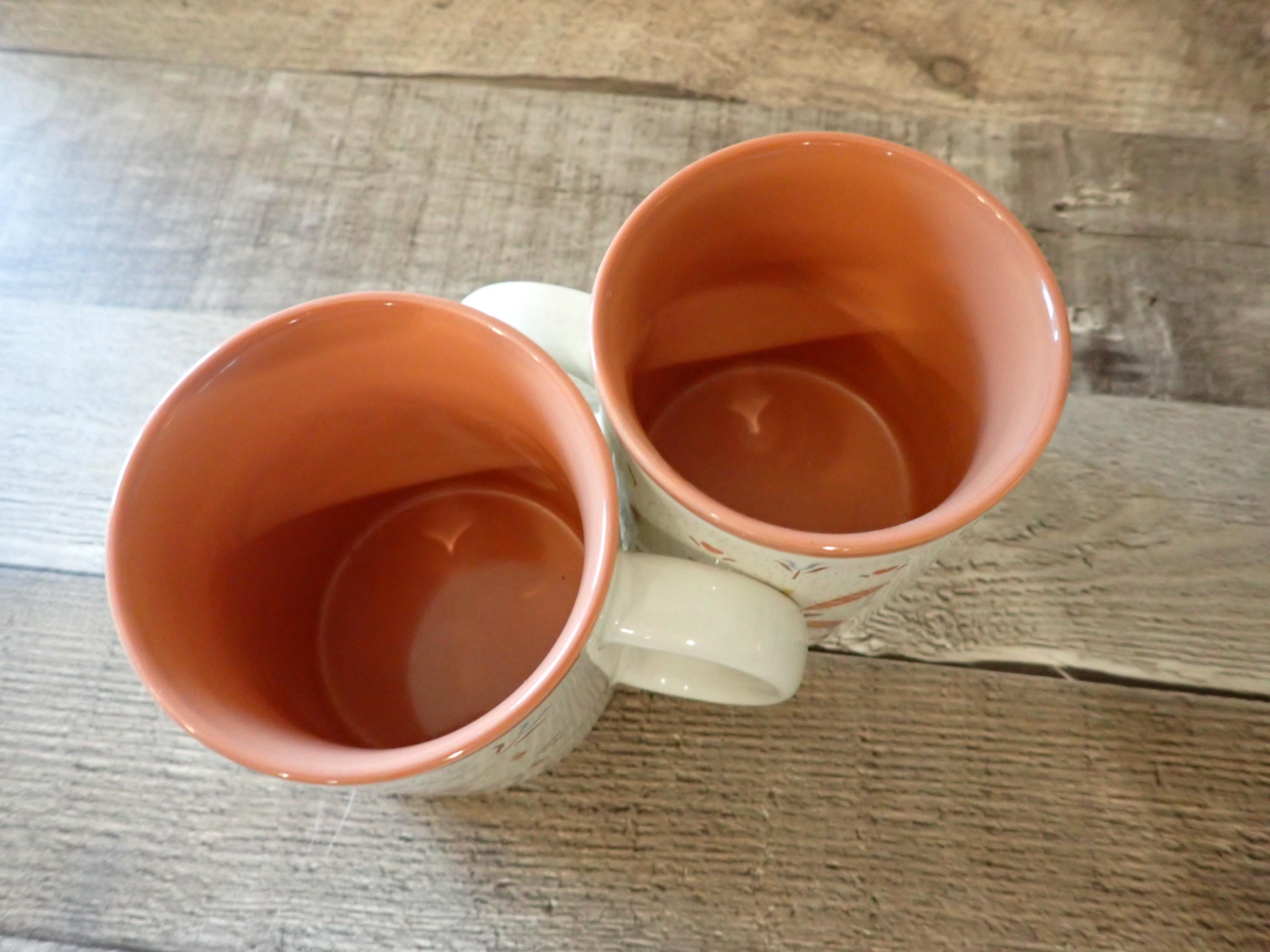 This set of 2 stoneware mugs includes coordinating cream-colored mugs with floral designs. They are each 3.75" tall and 3" in diameter. With the handles, they are 4.5" wide. Both mugs are marked on the bottom: CCCC. They can hold 10 oz. Both mugs are in very good condition with no chips or cracks. Great set of rustic mid century stoneware mugs!