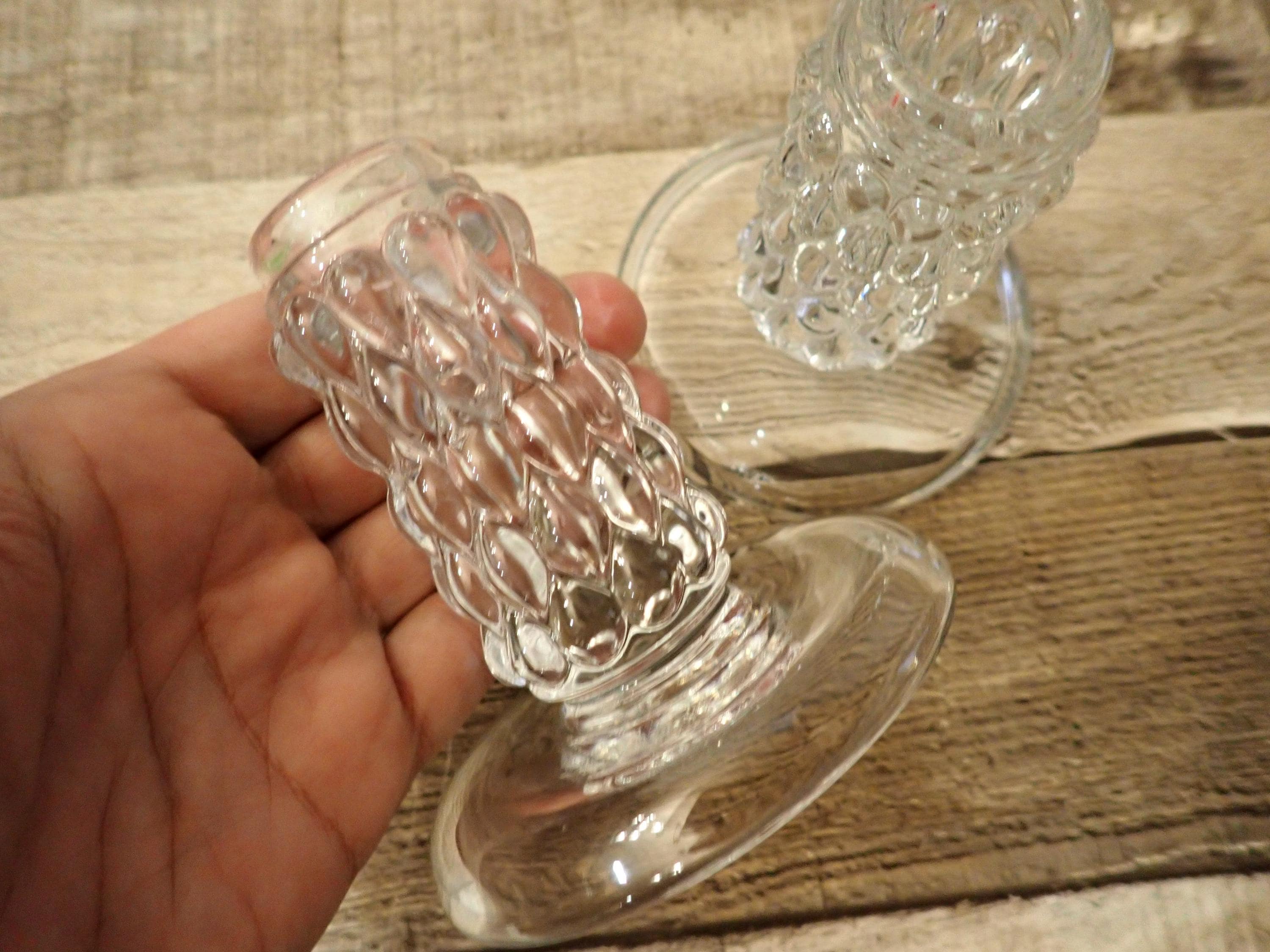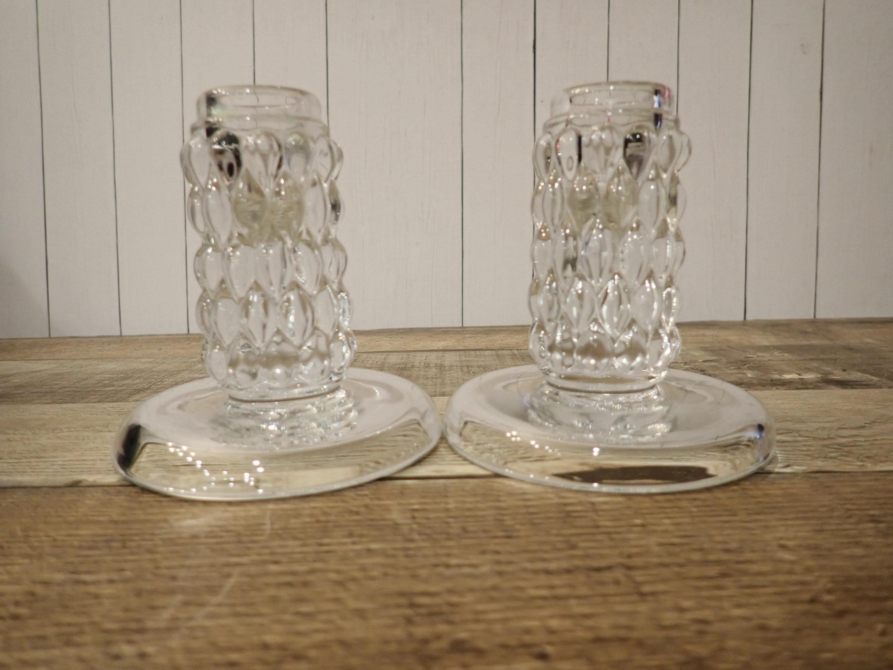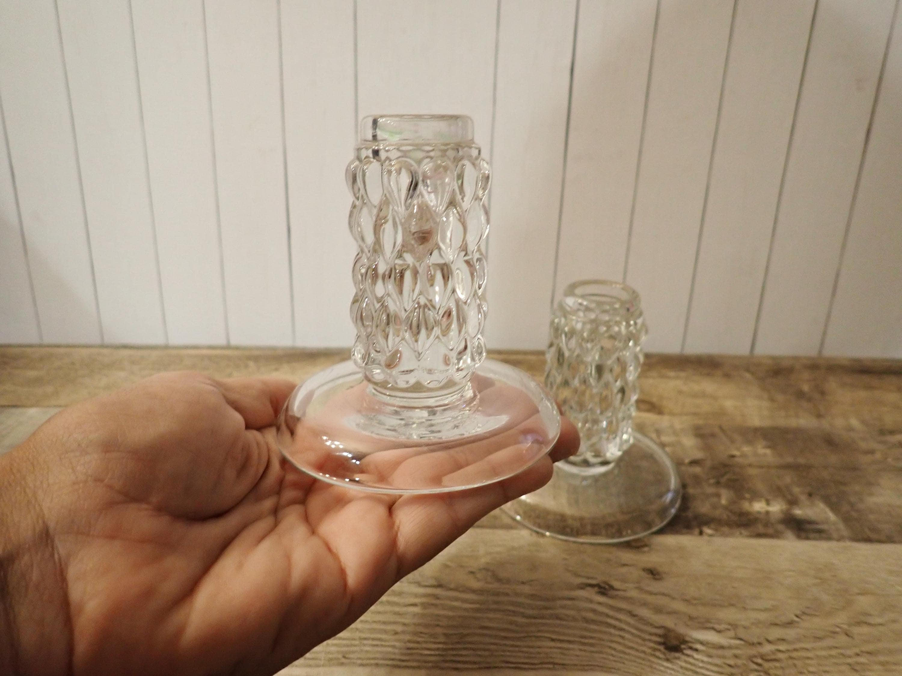 This set of clear glass candlestick includes 2 smaller sized matching candlesticks in the Myriad pattern by Fostoria. This pattern was produced from 1941 to 1945. They are each 3.75" tall, and 3.5" in diameter at the base. They have a round base and rounded stem with a raided bubble design. The candlesticks can each hold one taper candle and have a 3/4" opening at the top. Both candlesticks are in very good condition with no chips or cracks.