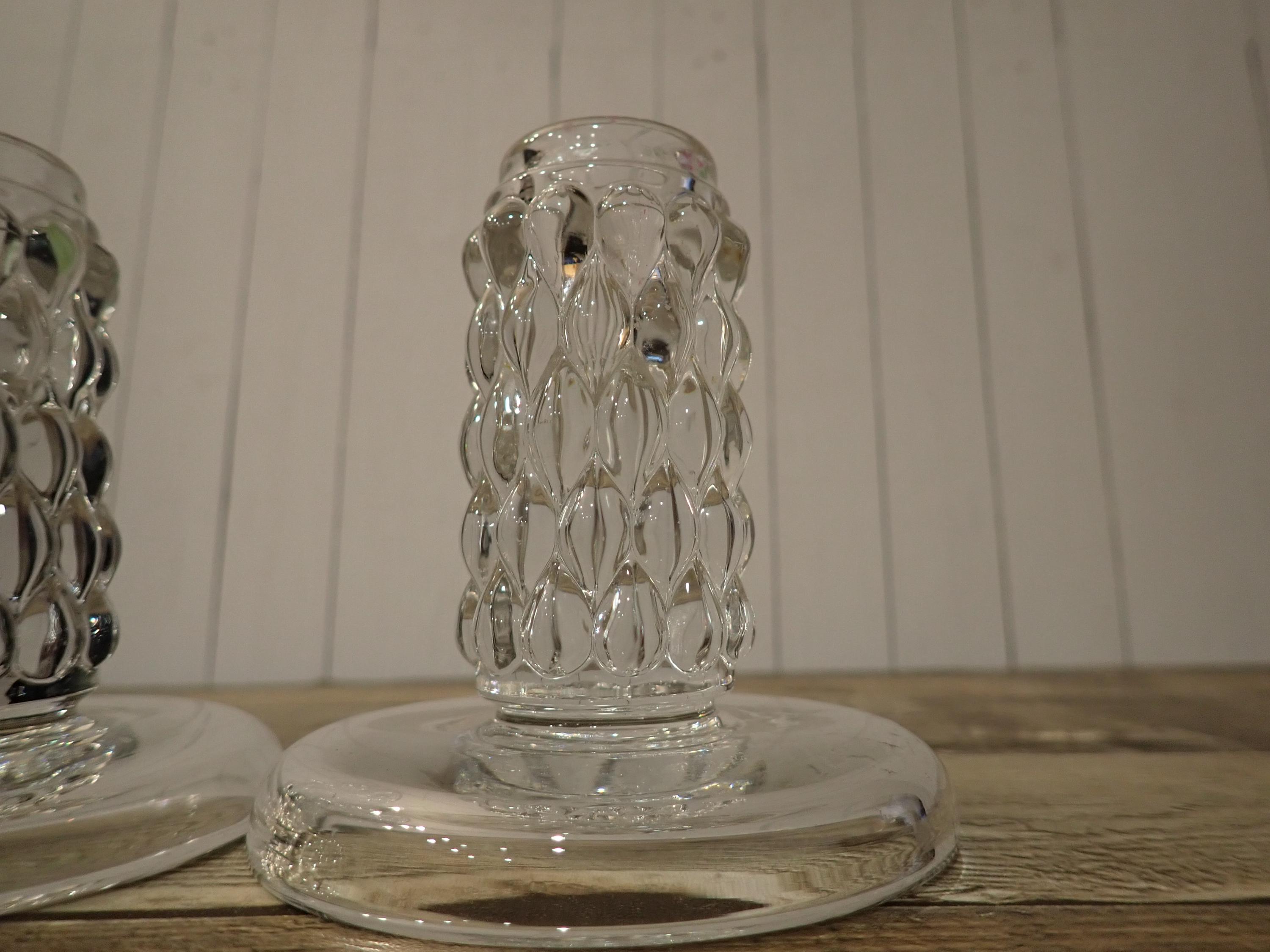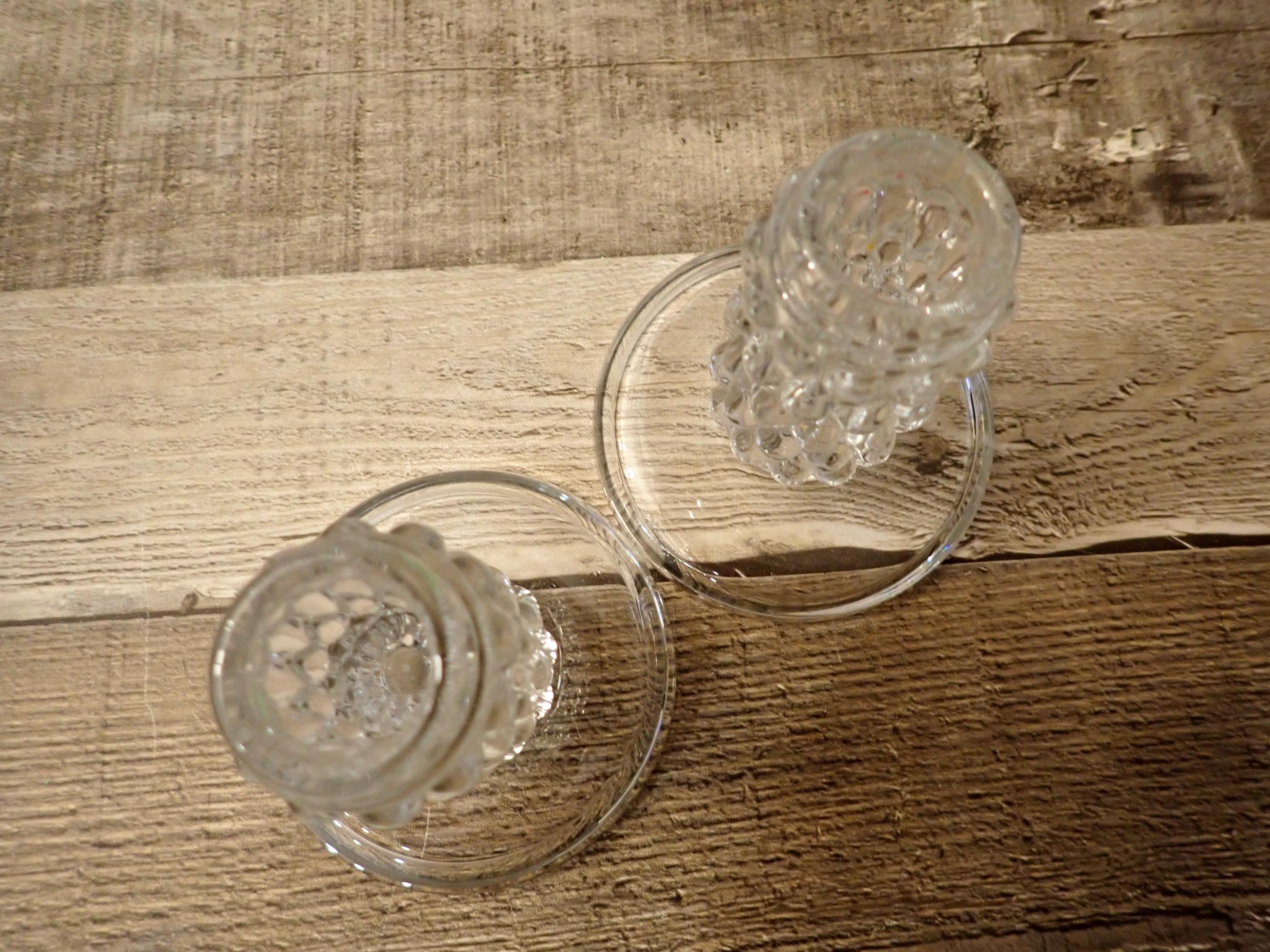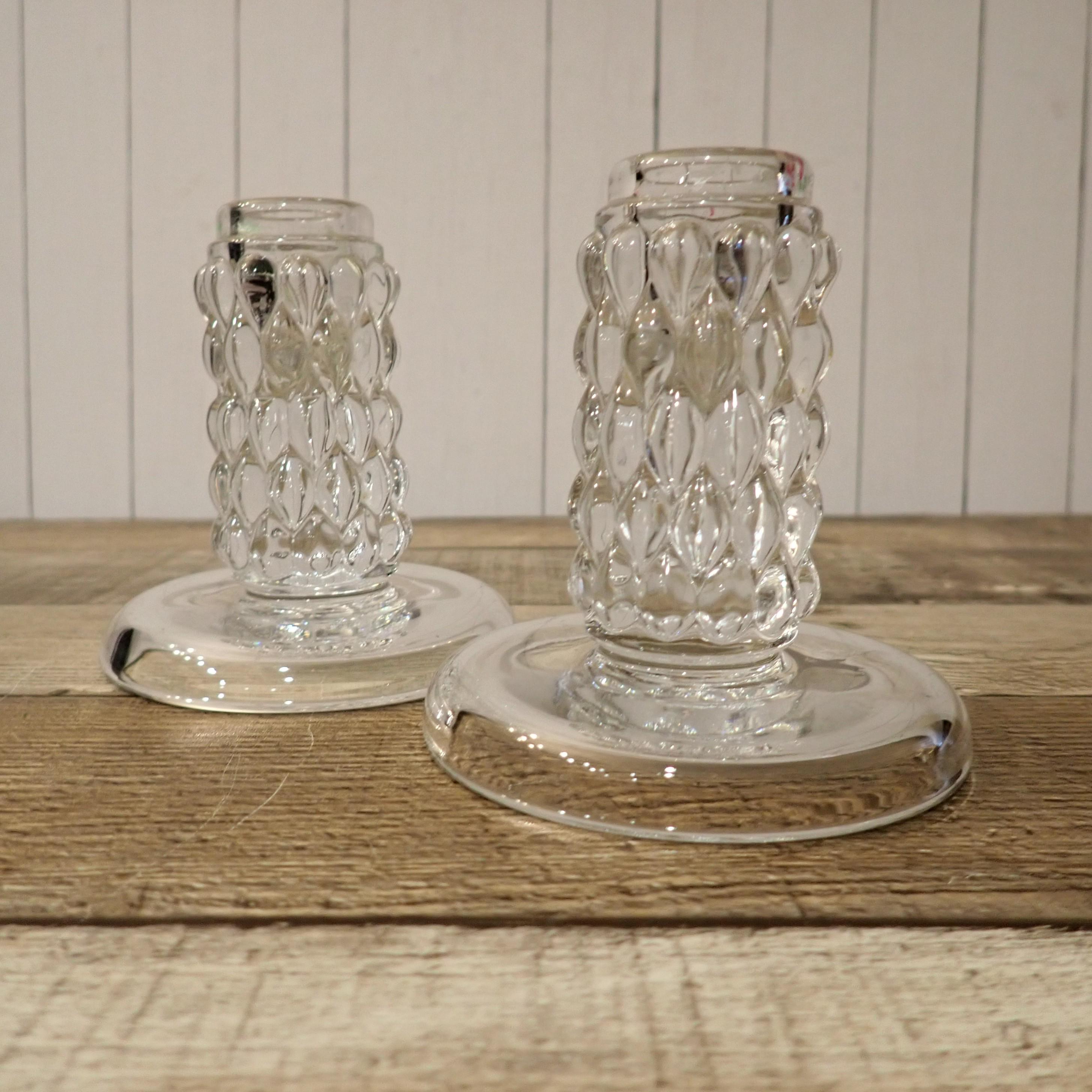 This set of clear glass candlestick includes 2 smaller sized matching candlesticks in the Myriad pattern by Fostoria. This pattern was produced from 1941 to 1945. They are each 3.75" tall, and 3.5" in diameter at the base. They have a round base and rounded stem with a raided bubble design. The candlesticks can each hold one taper candle and have a 3/4" opening at the top. Both candlesticks are in very good condition with no chips or cracks.