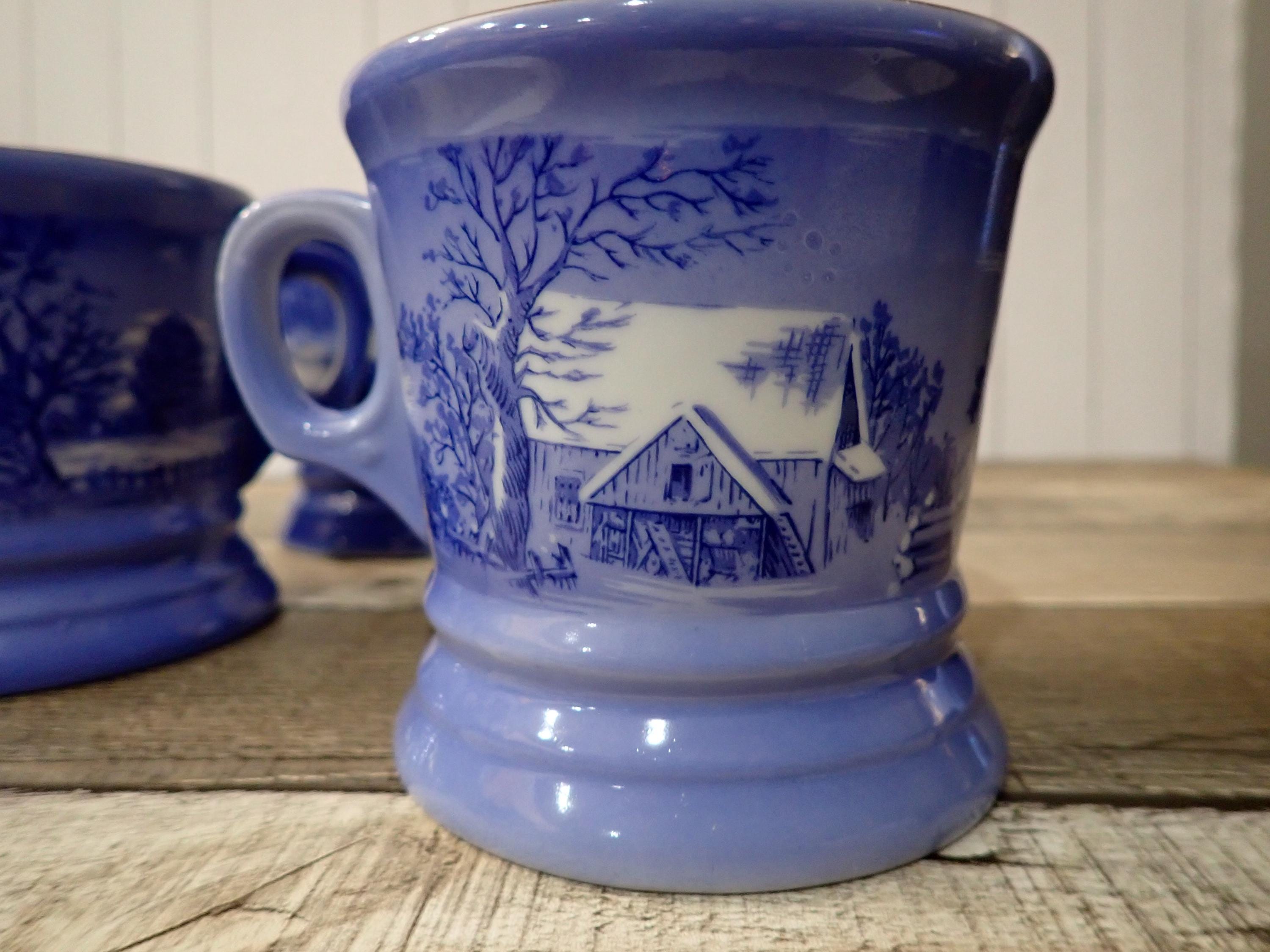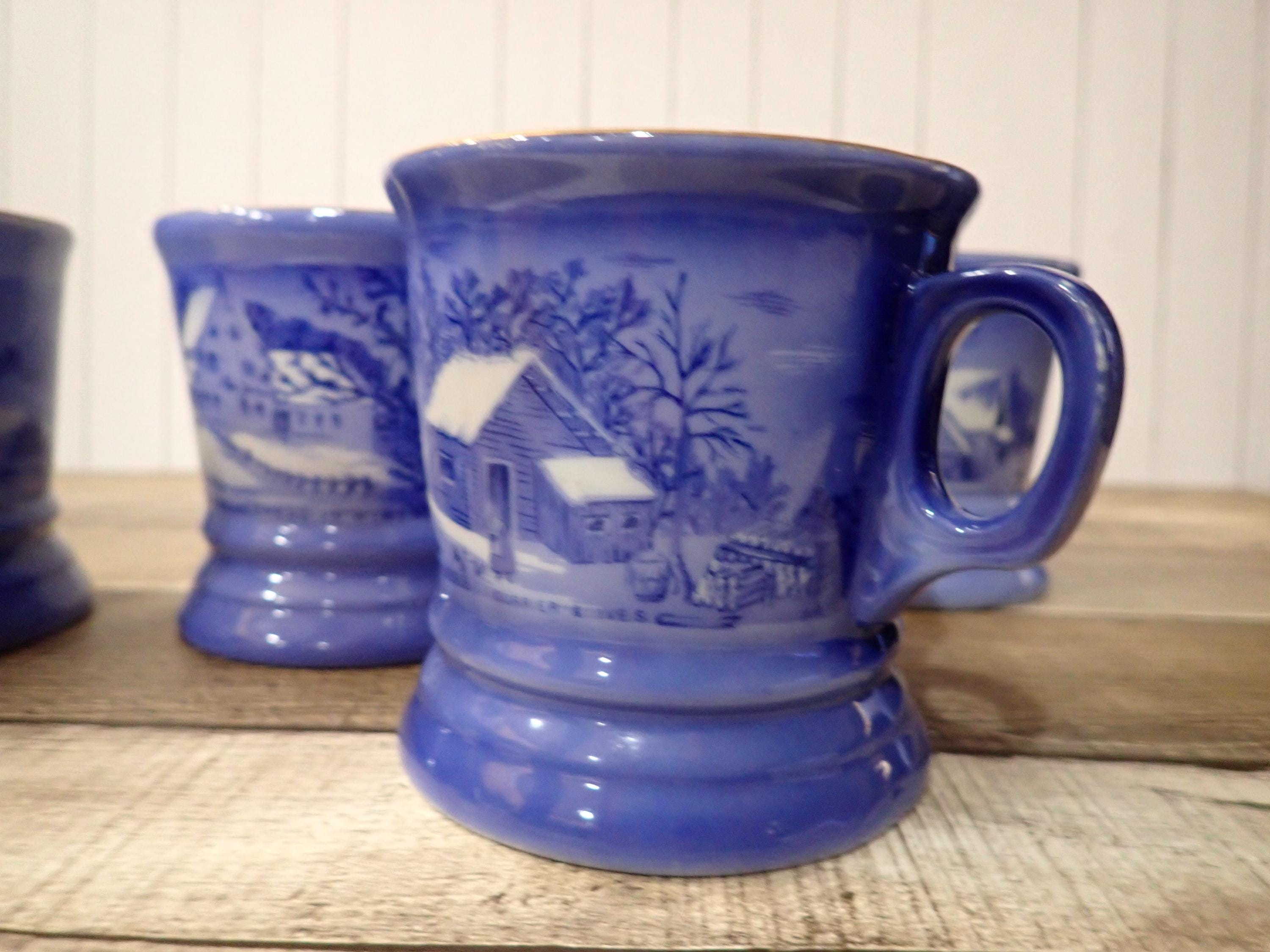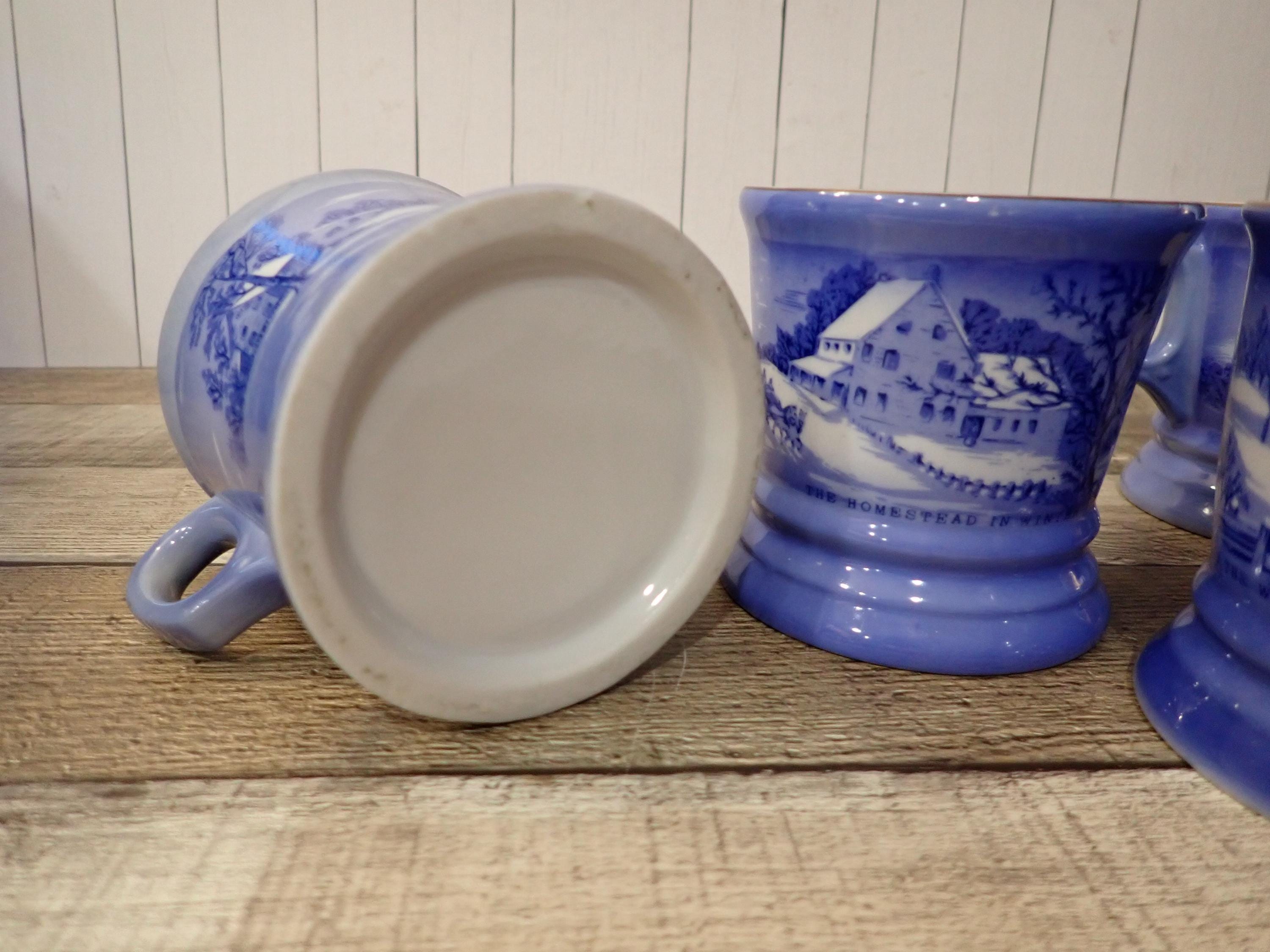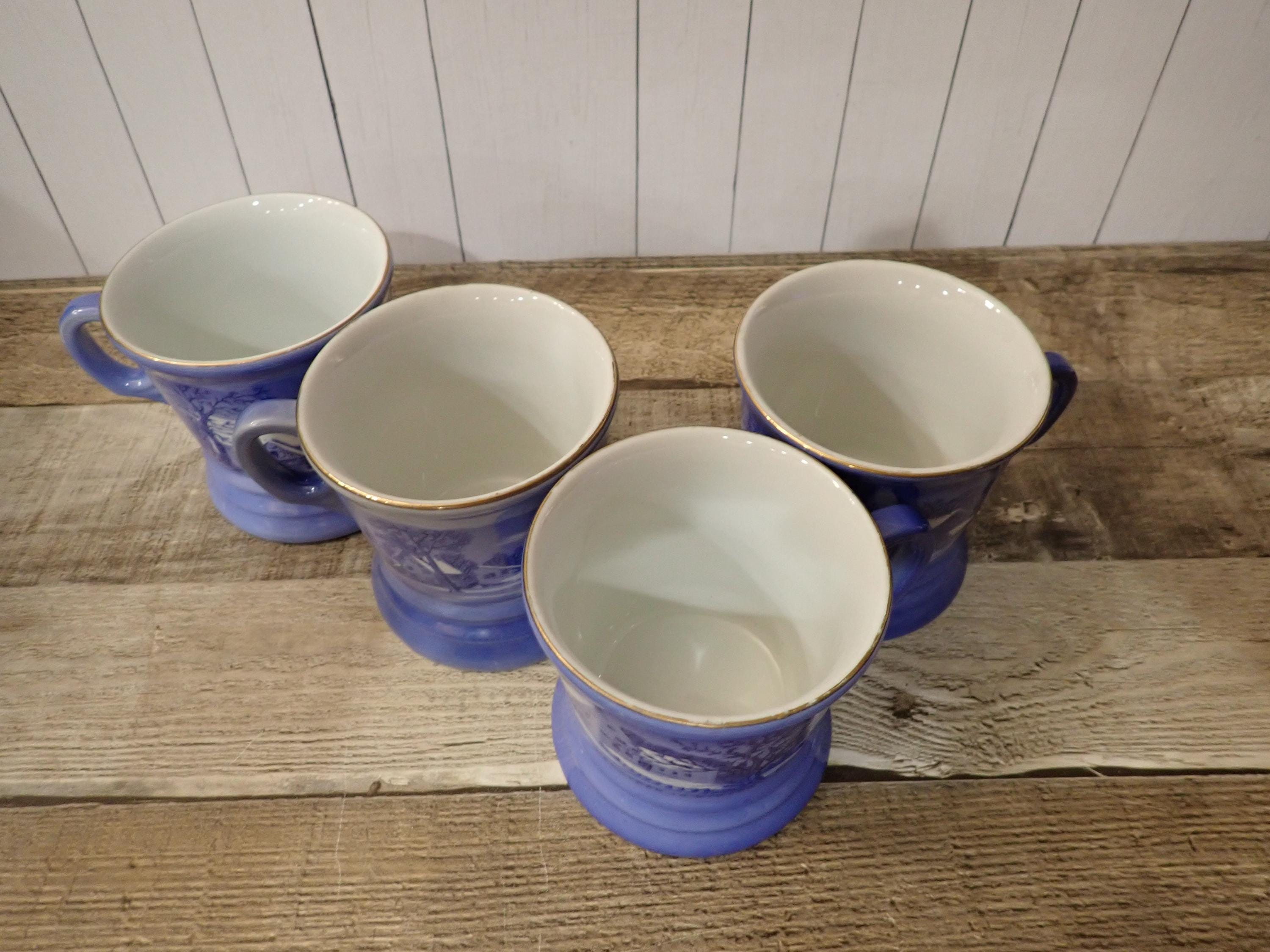 This set of ceramic mugs are in a Currier and Ives pattern and includes 4 coordinating mugs with different patterns. The mugs are 3.5" tall and are 3.5" in diameter at the rim. They are a white ceramic with blue and white winter scenes around the mugs. They are accented with a gold band around the rim. All 4 mugs are in very good condition with no chips or cracks, and the graphics are bright and clear.