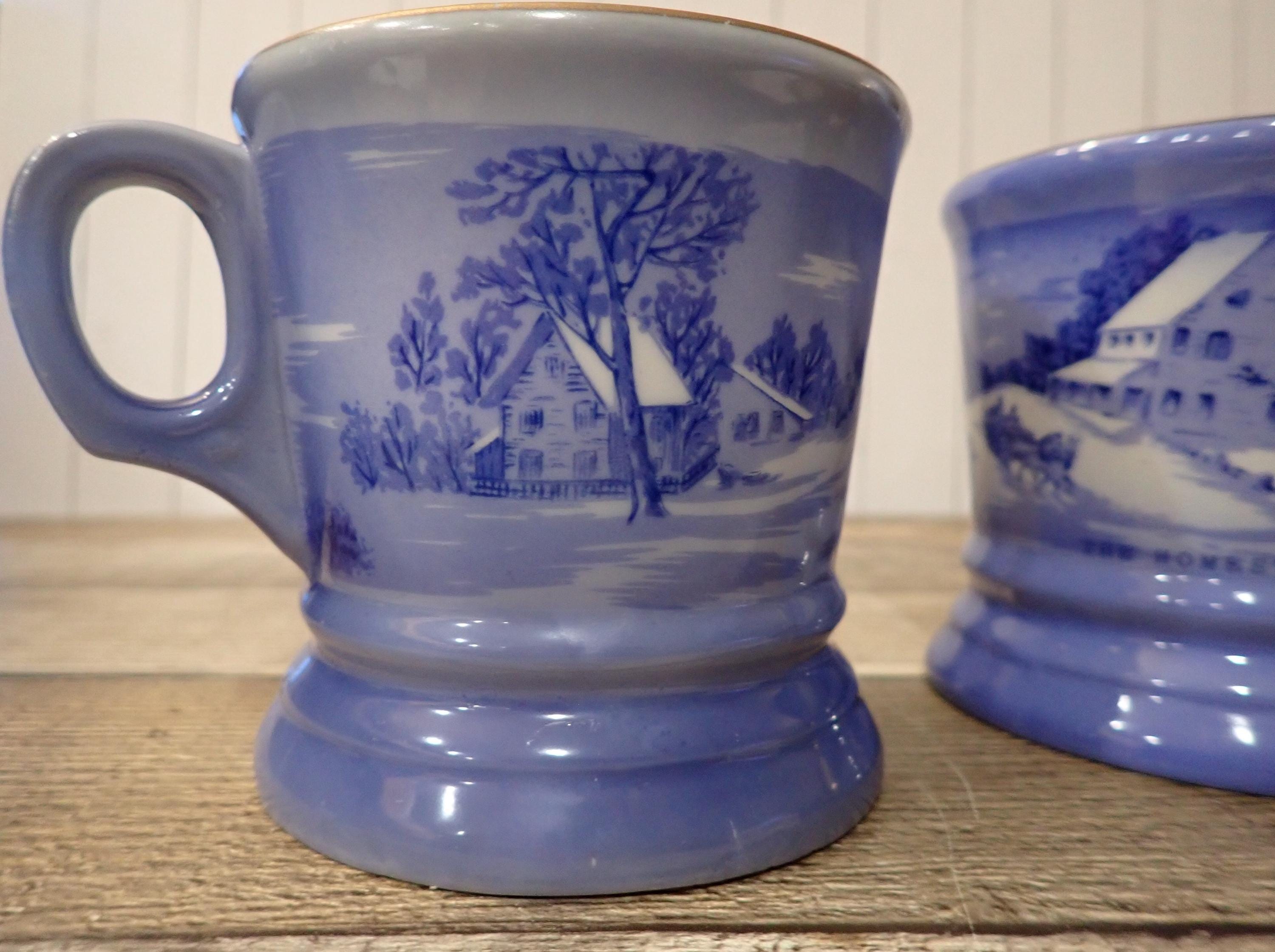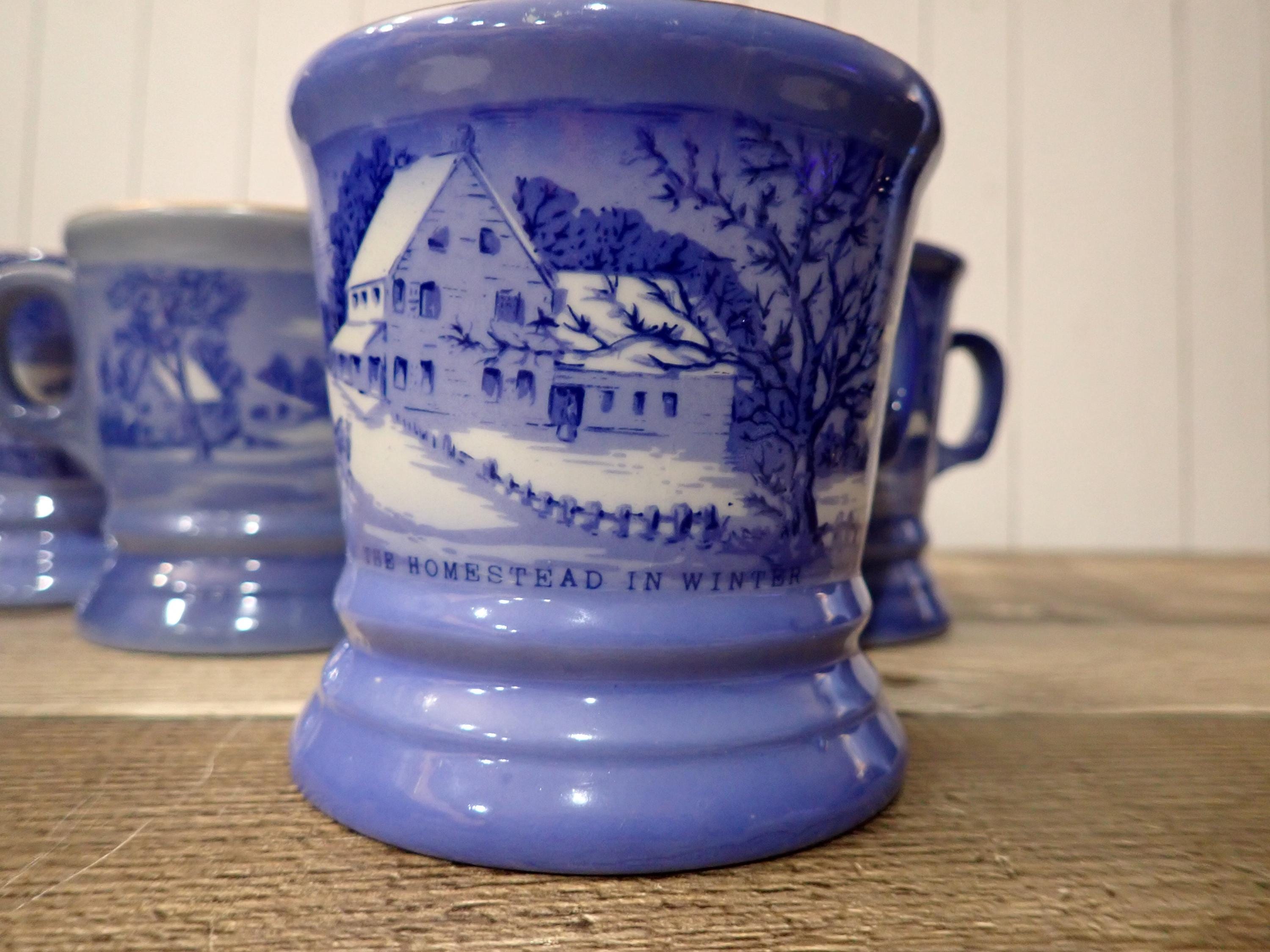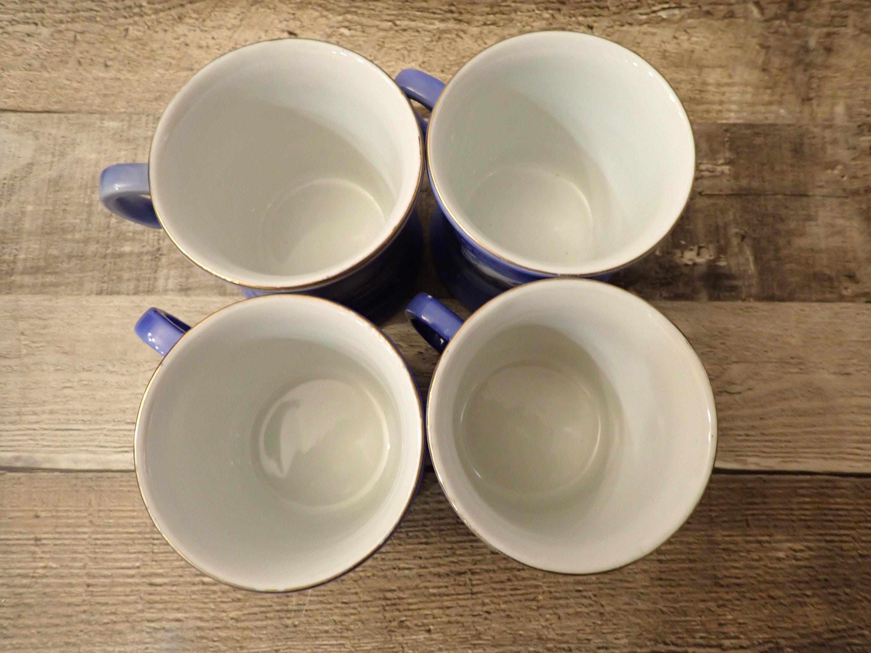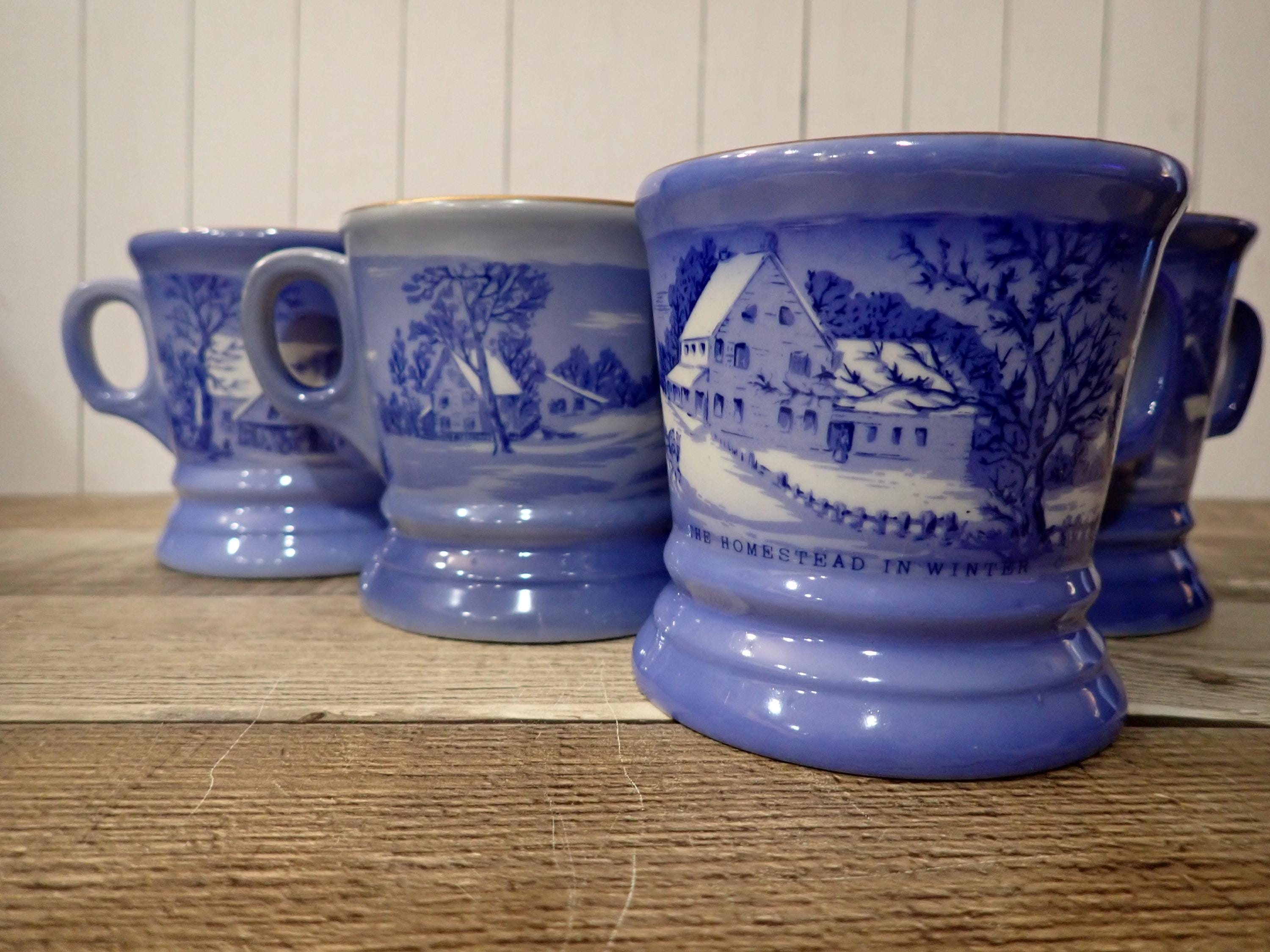 This set of ceramic mugs are in a Currier and Ives pattern and includes 4 coordinating mugs with different patterns. The mugs are 3.5" tall and are 3.5" in diameter at the rim. They are a white ceramic with blue and white winter scenes around the mugs. They are accented with a gold band around the rim. All 4 mugs are in very good condition with no chips or cracks, and the graphics are bright and clear.
