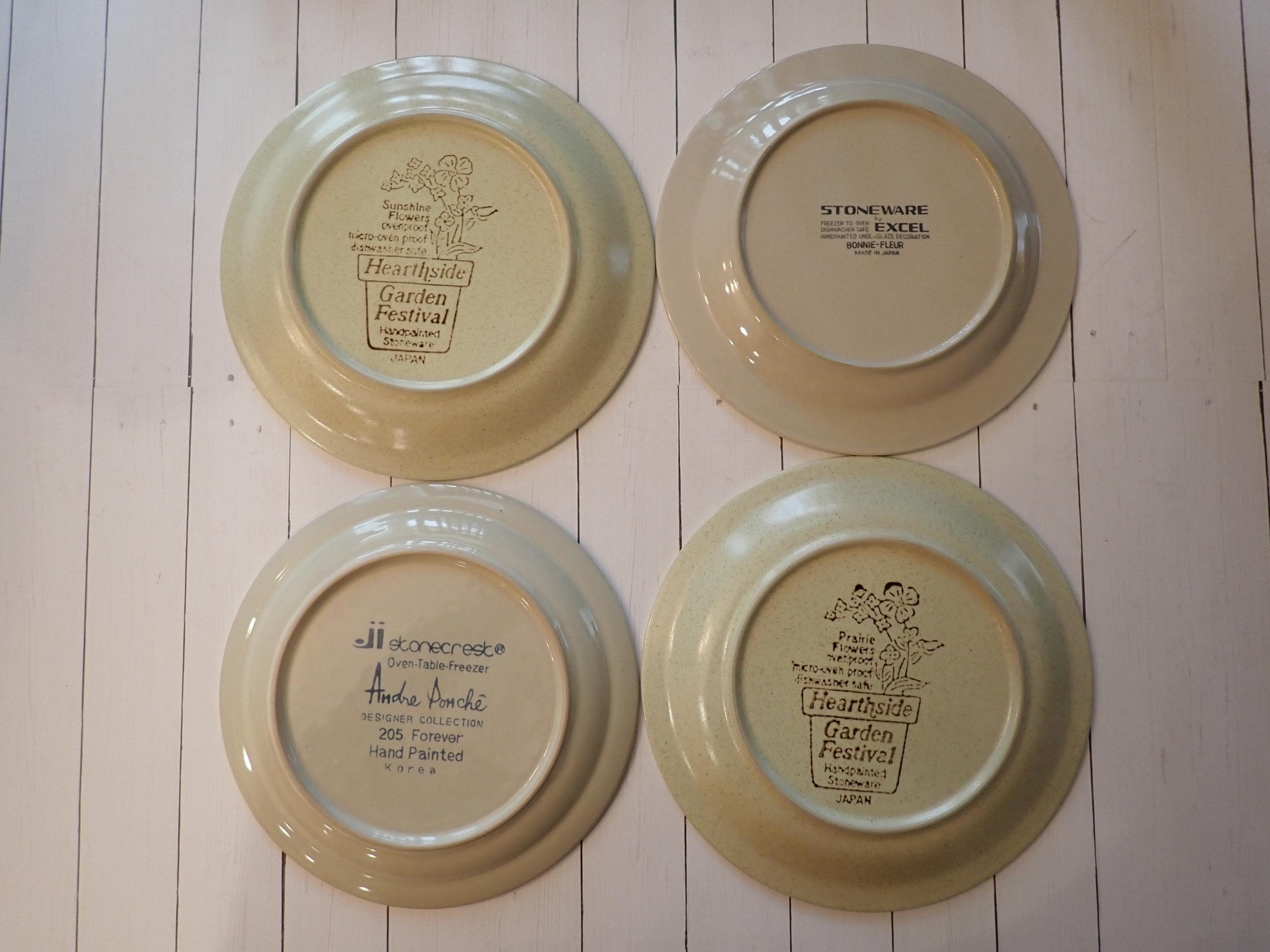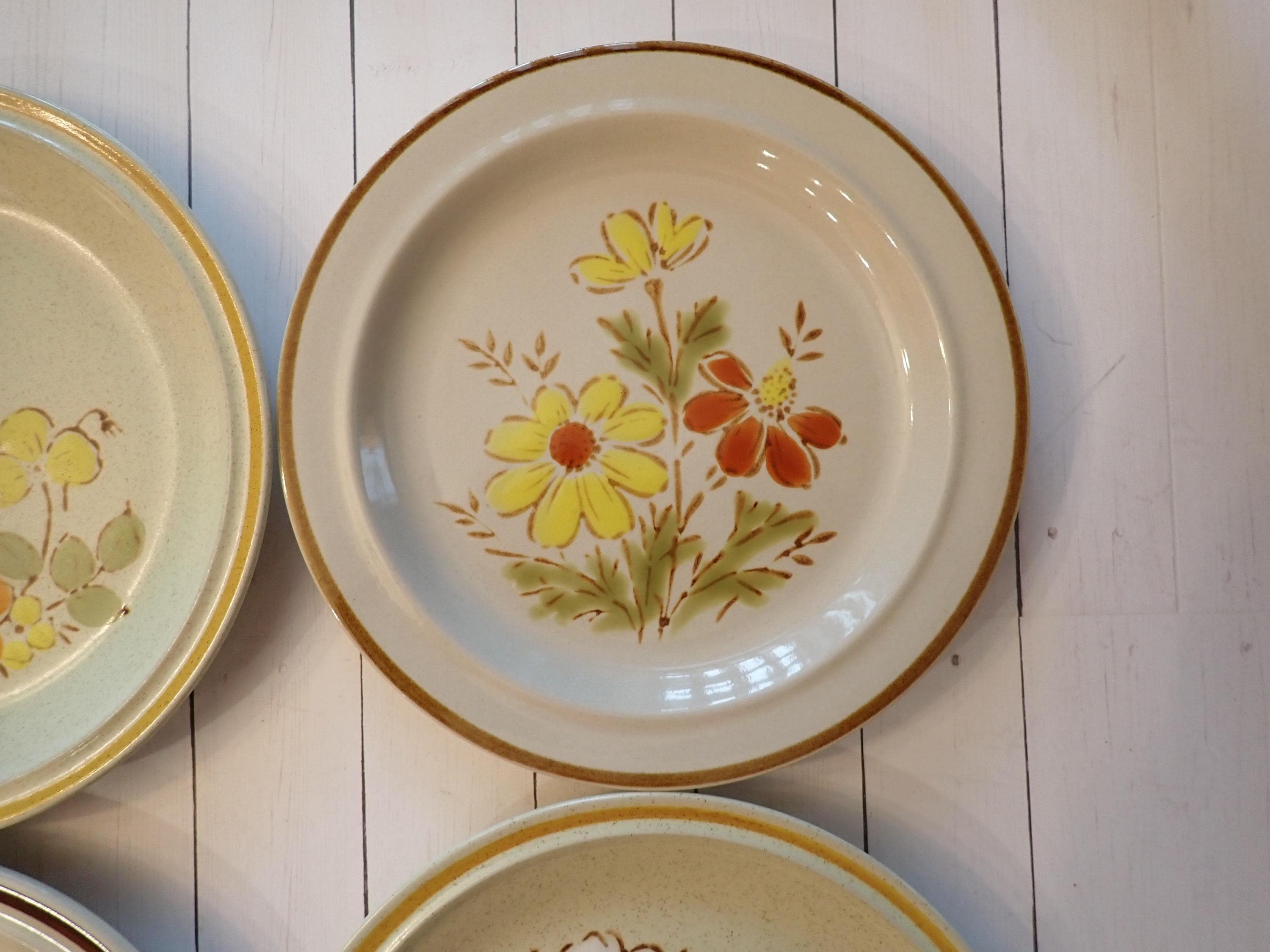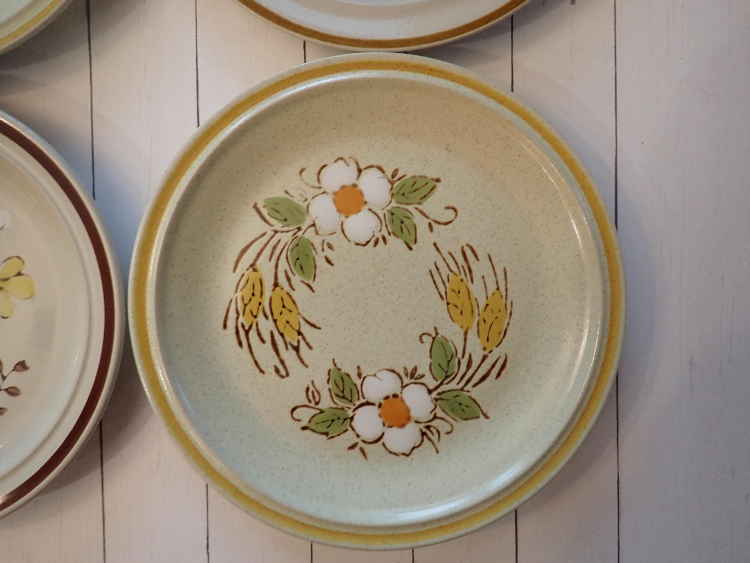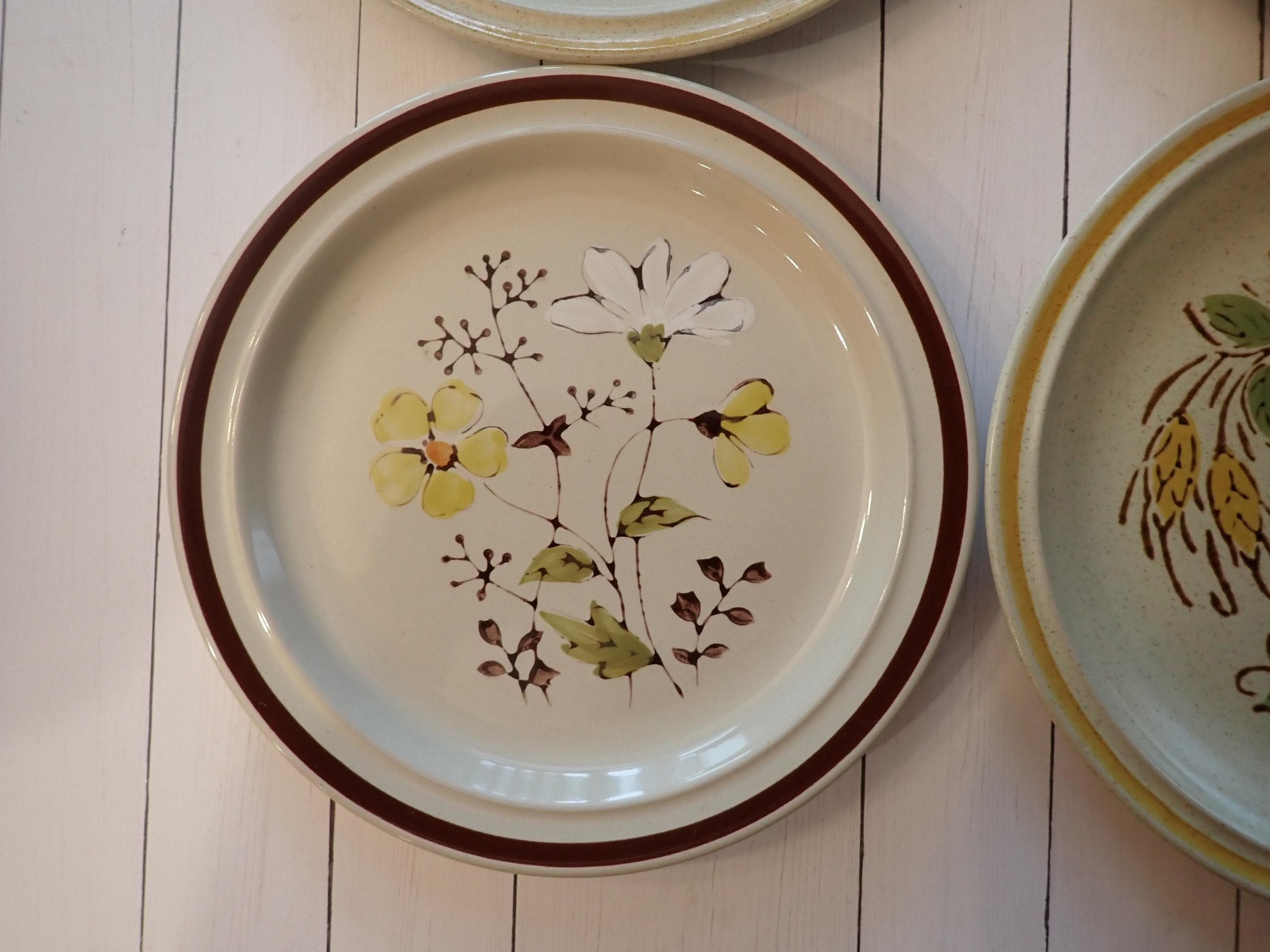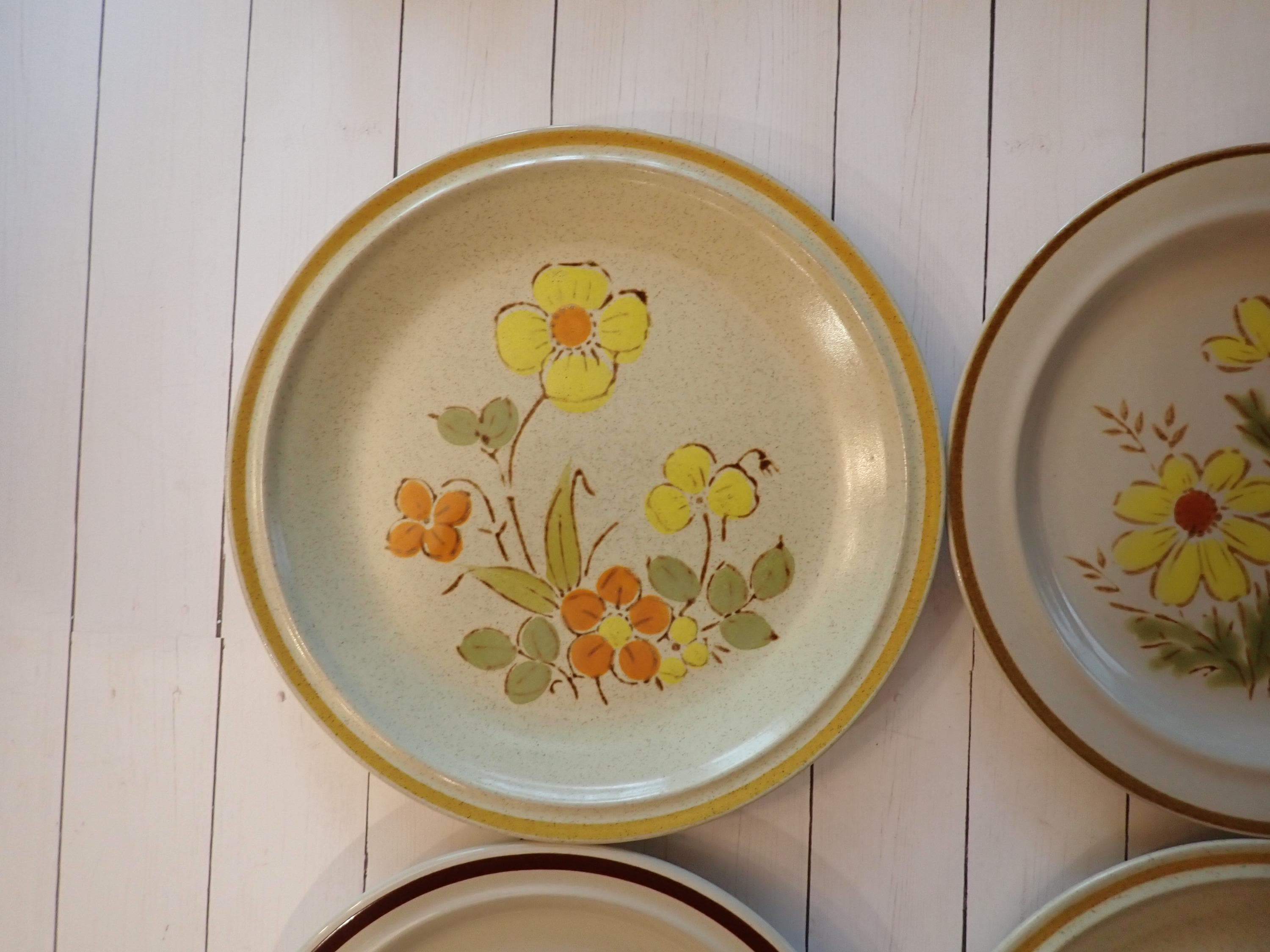This set of 4 salad plates is a mismatched set of coordinating stoneware plates from the 1970s. The plates are 7.75" in diameter and 1" high at the rim. They are all a light tan stoneware with various orange, yellow, and brown floral designs. All 4 of the plates are in very good condition with no chips or cracks. There are some light surface scratches from use. Fun set of earthy 70s stoneware floral salad plates!