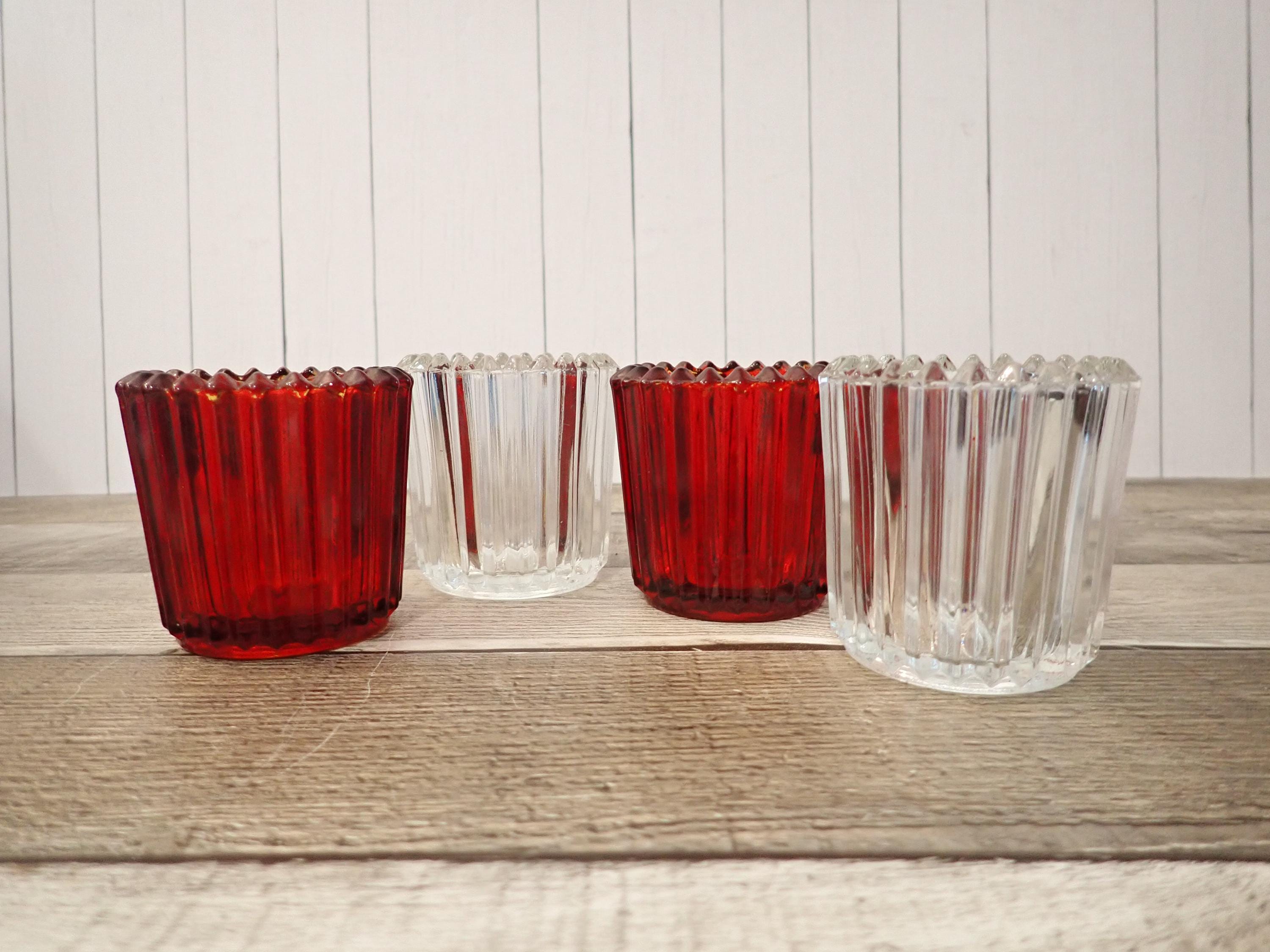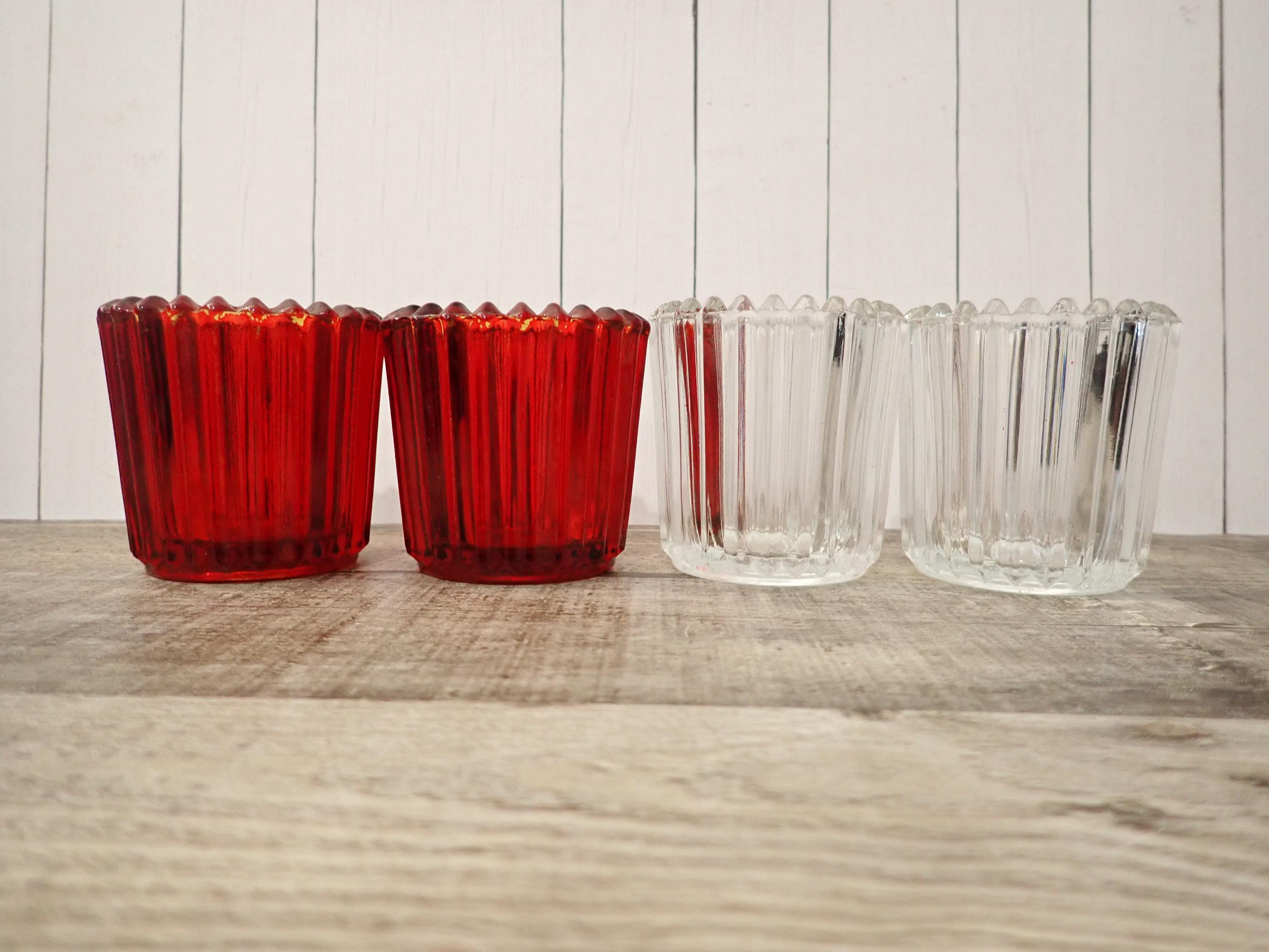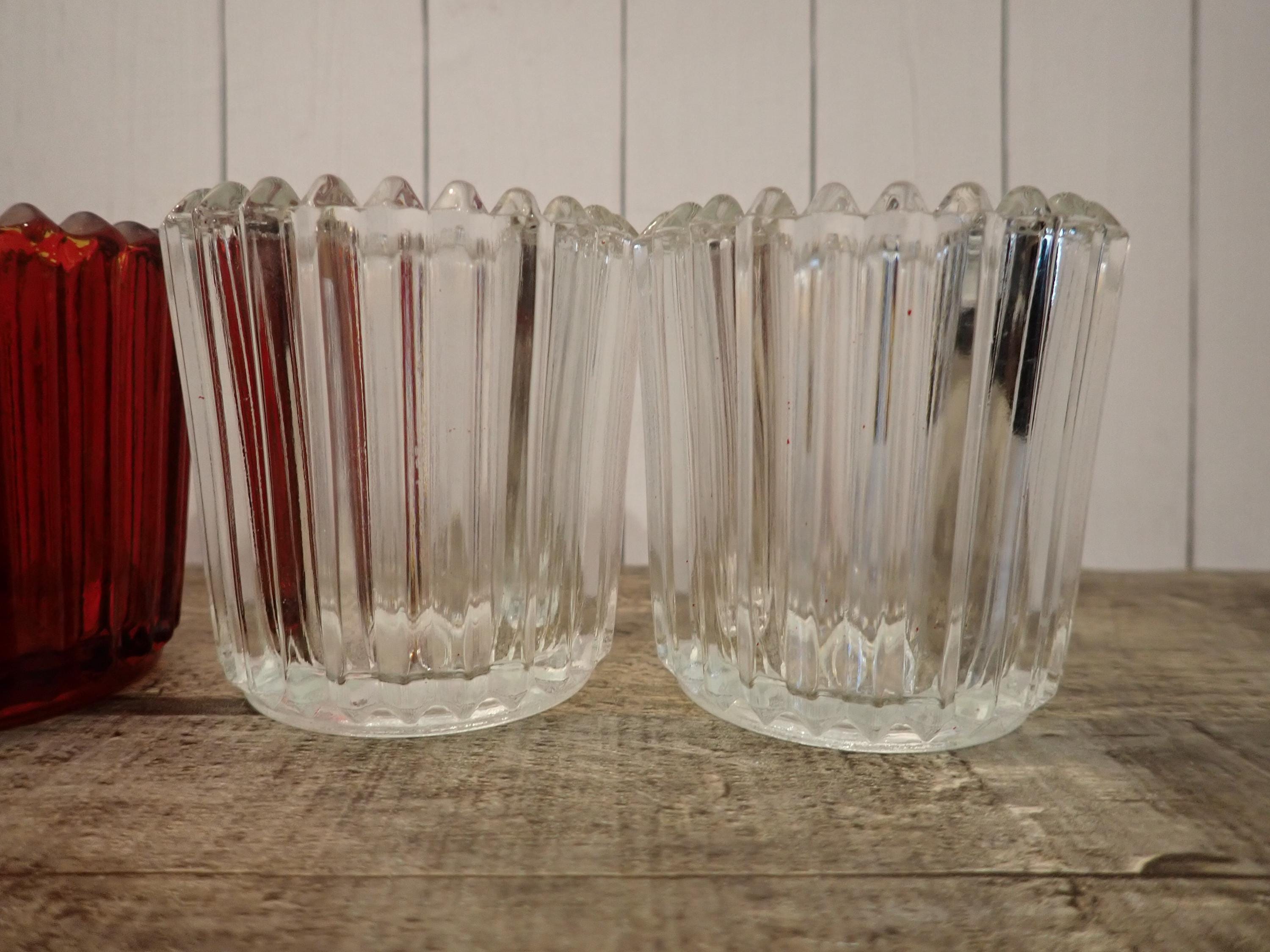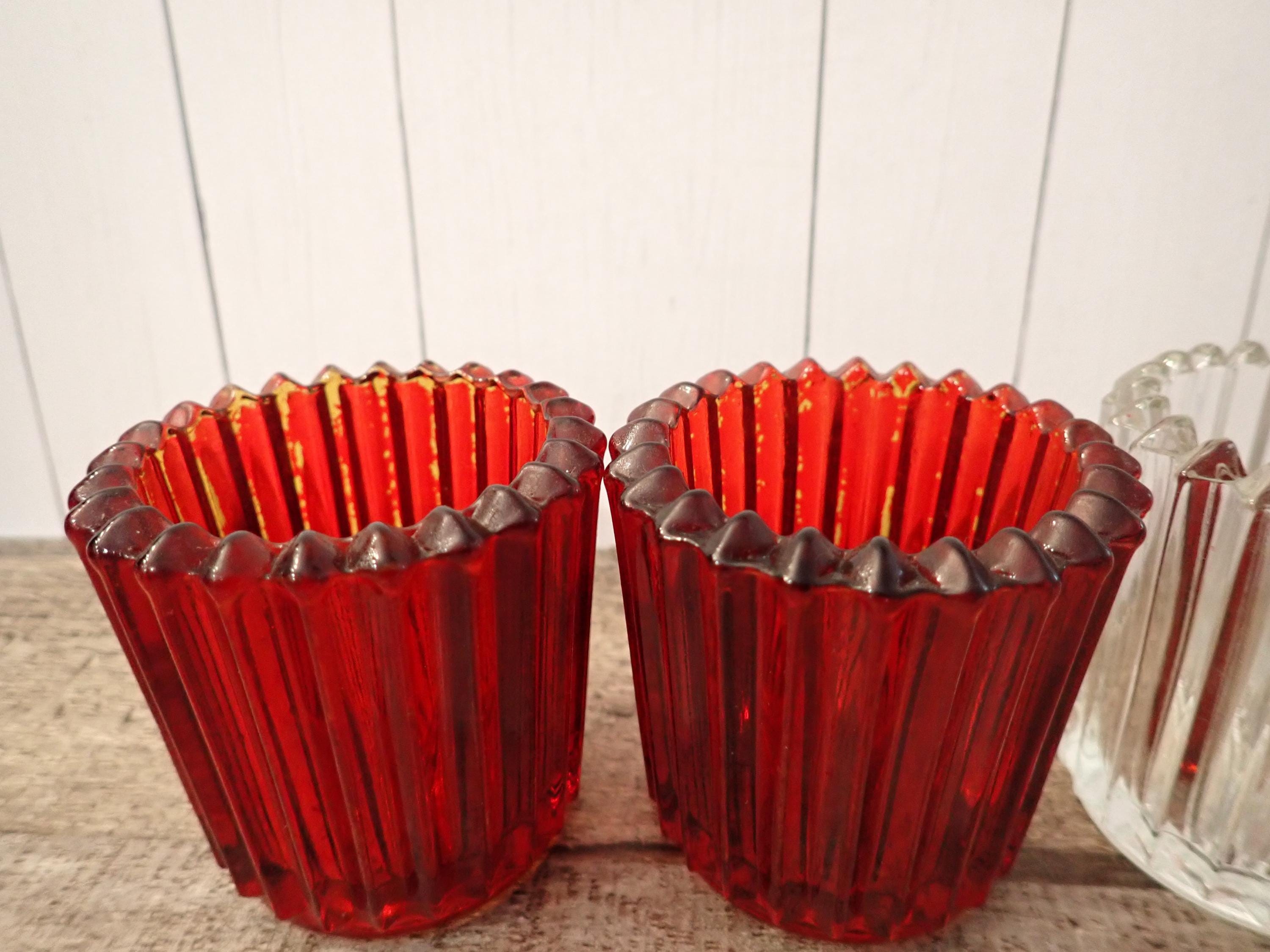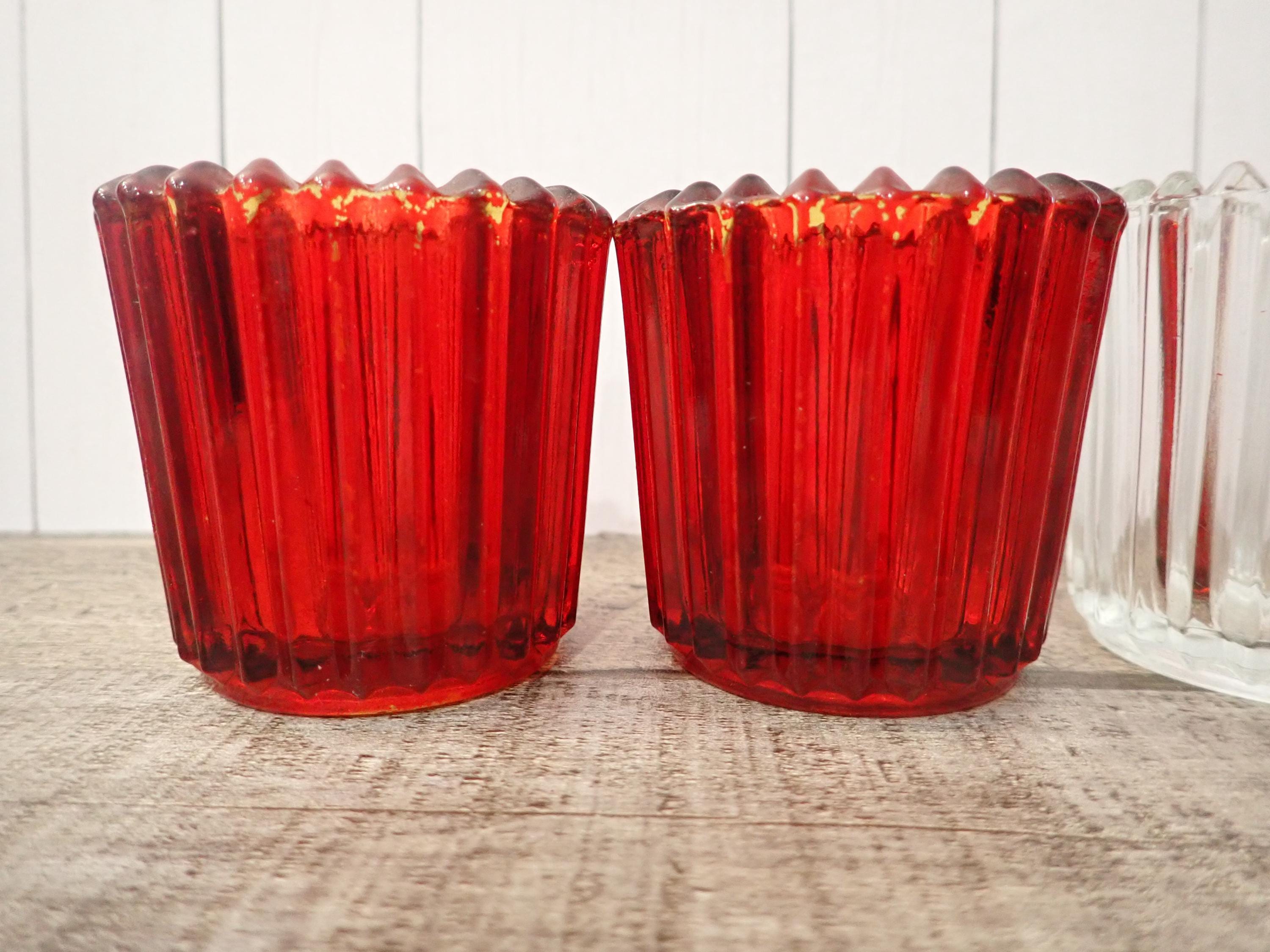 This set of glass candle holders includes 4 holders in 2 different colors - red and clear. This mix and match set includes 2 green and 2 clear holders in the same patterns. The four of the holders are 2.5" tall and 2.5" in diameter and can hold a tealight or small votive candle. All of the candle holders are in very good condition with no chips or cracks. The red candle holders have an applied coating on the outside and there is some wear to this coating as shown in the last photo.