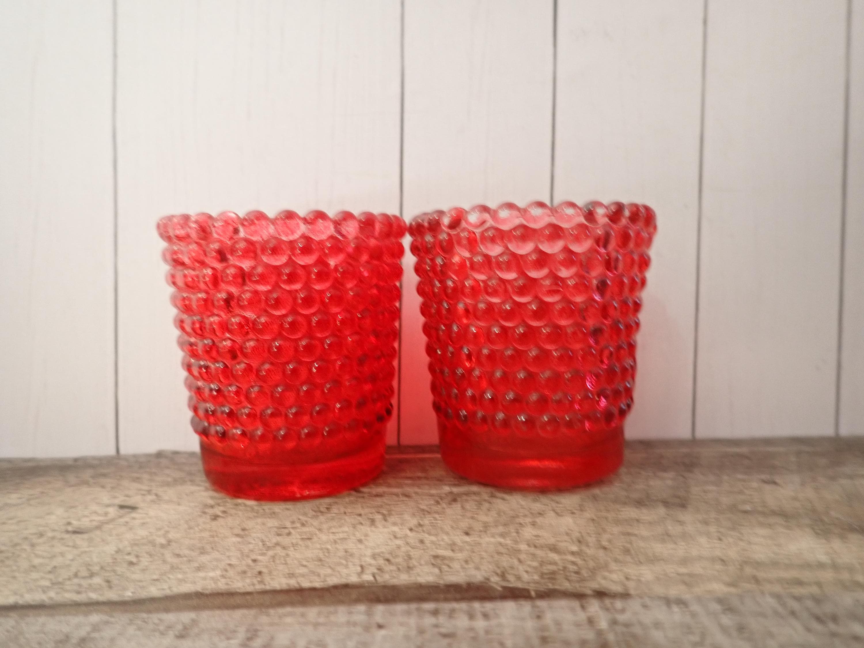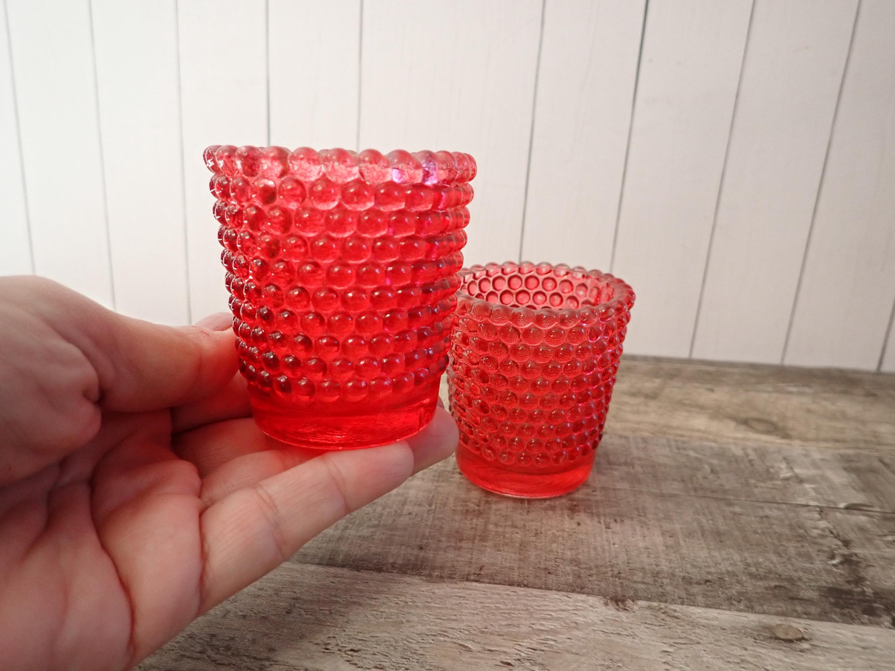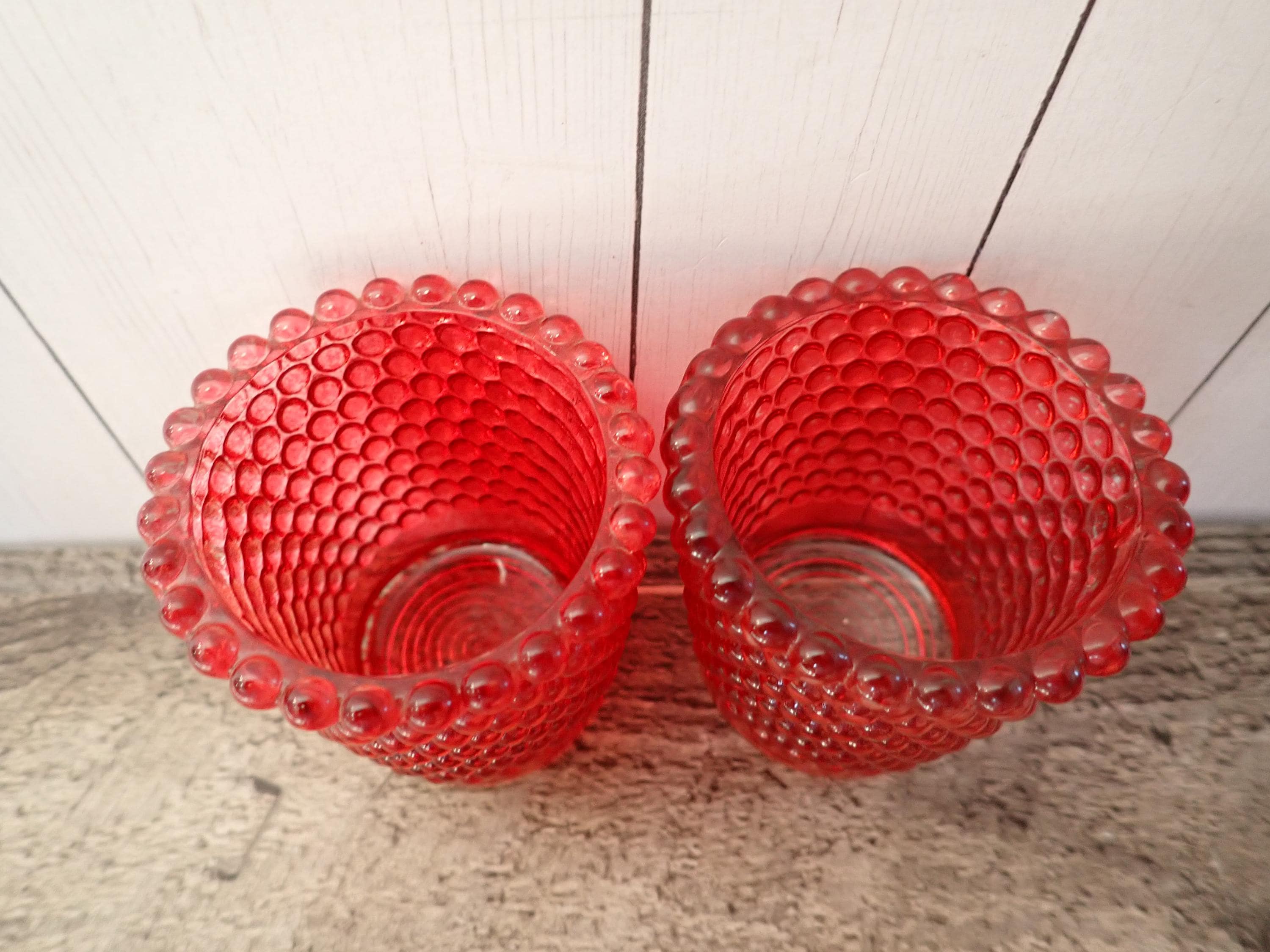 This set of 2 pink glass candle holders measure 2.5" tall and 2.25" in diameter. They have a 1.75" opening at the top to hold a tealight or small votive candle. They are a round shape with hobnail design in the glass. Both of the candle holders are in very good condition with no chips or cracks.