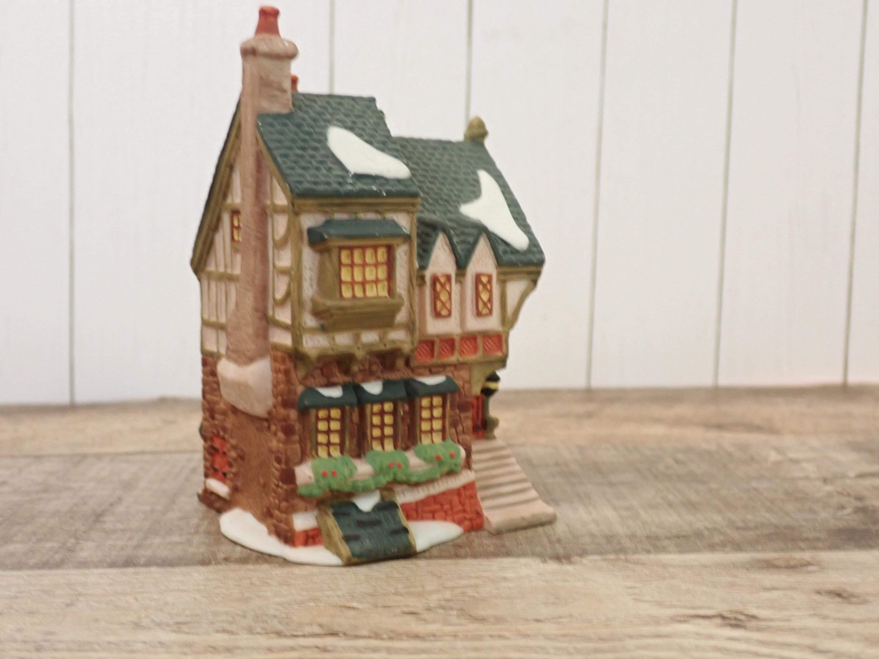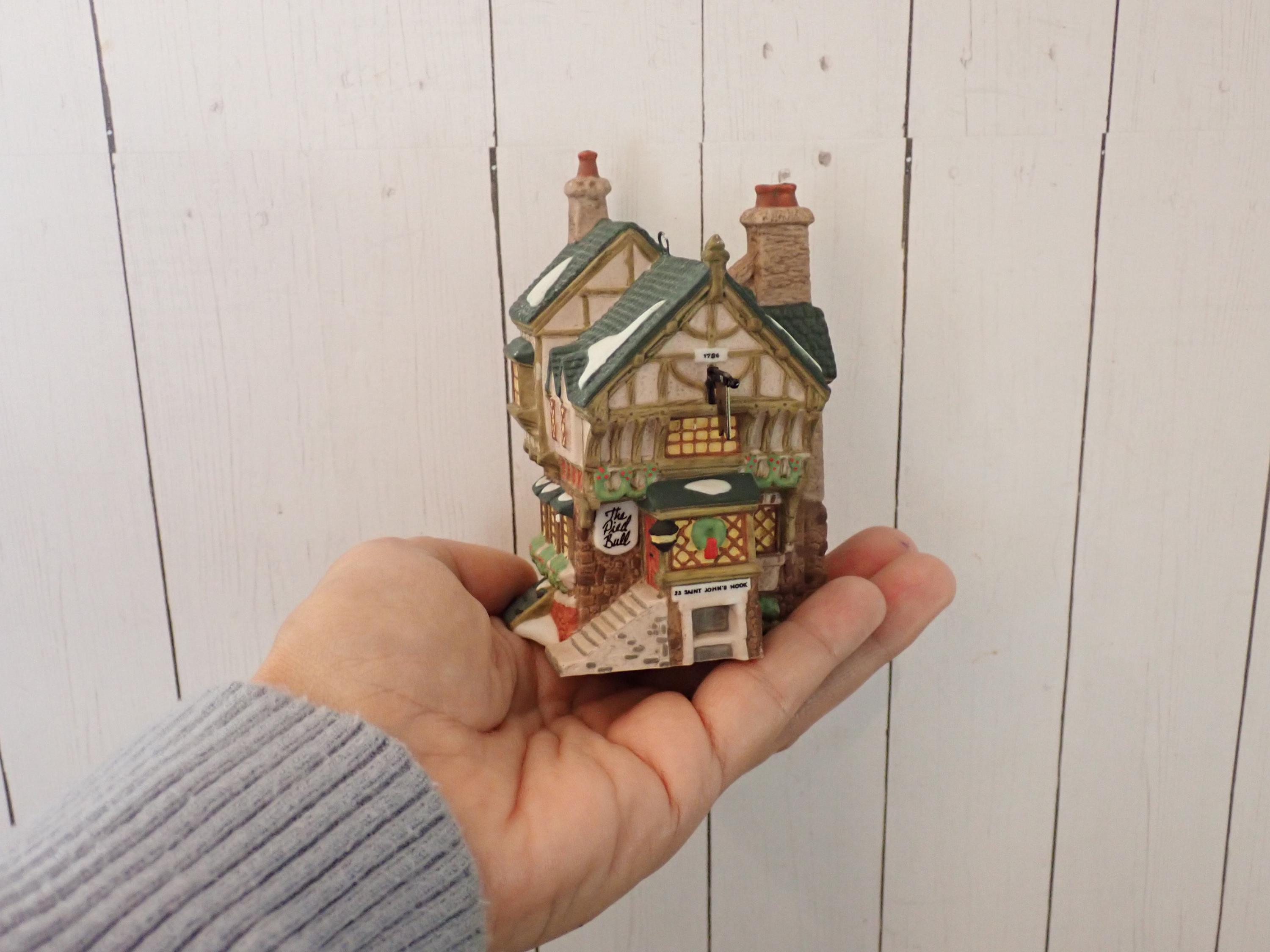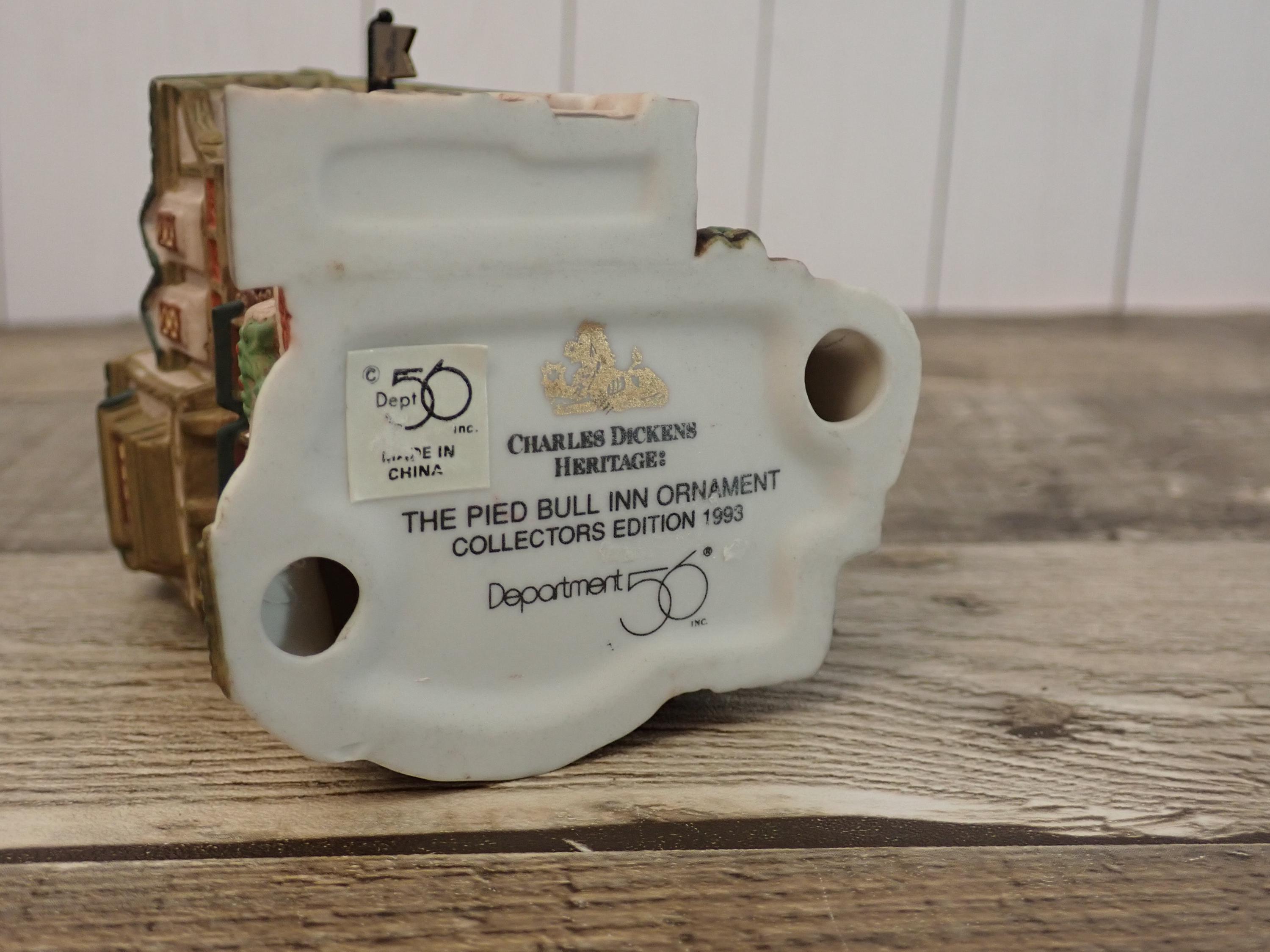 This small ceramic ornament by Dept 56 is the Pied Bull Inn in the Heritage Village ornament set. It is 2.5" wide and deep, and 3.75" tall. It is a ceramic building and is marked Dept 56 on the bottom. There is a small metal loop hanger on the top of the ornament for a ribbon or ornament hanger. The ornament is in very good condition with no chips or cracks. There is no box.