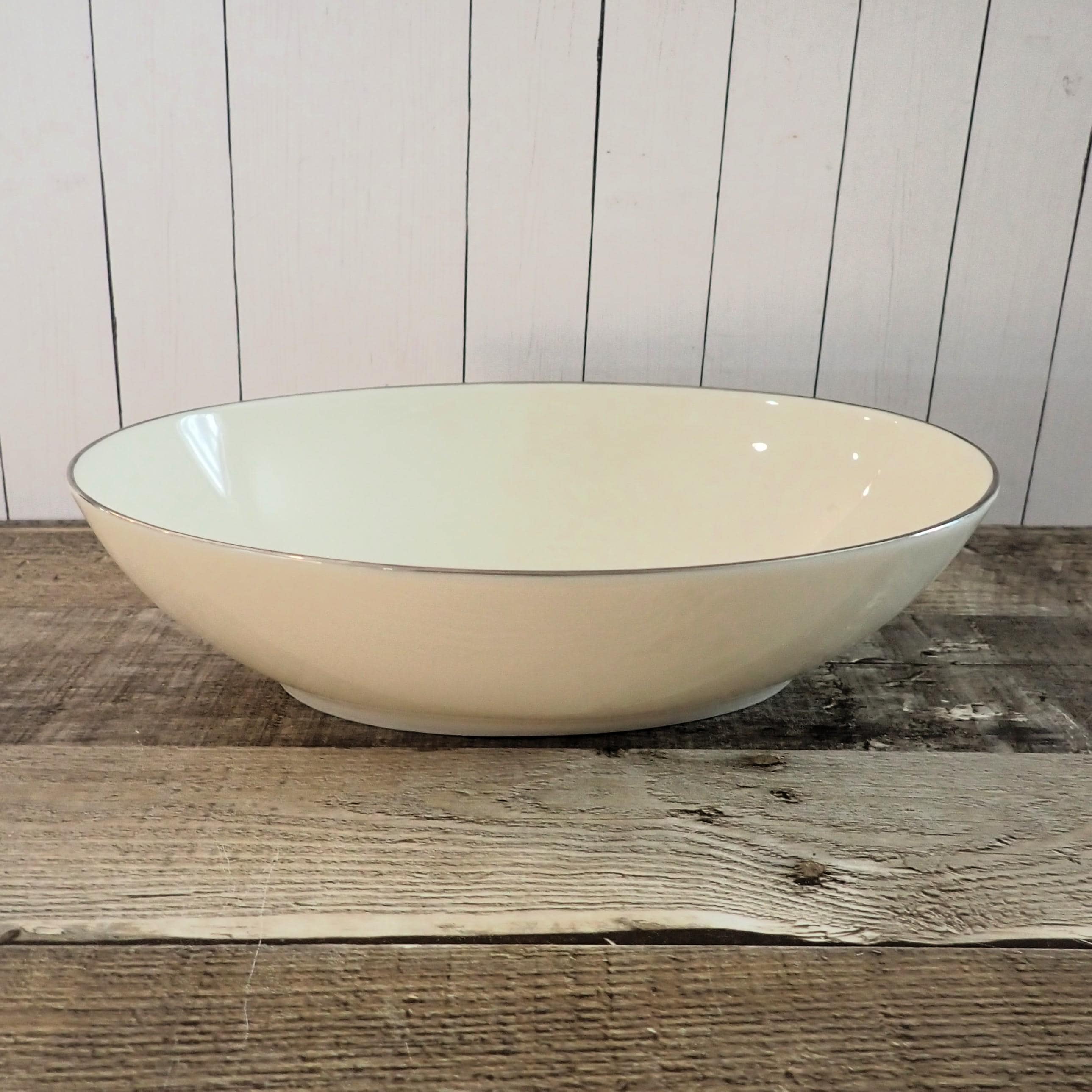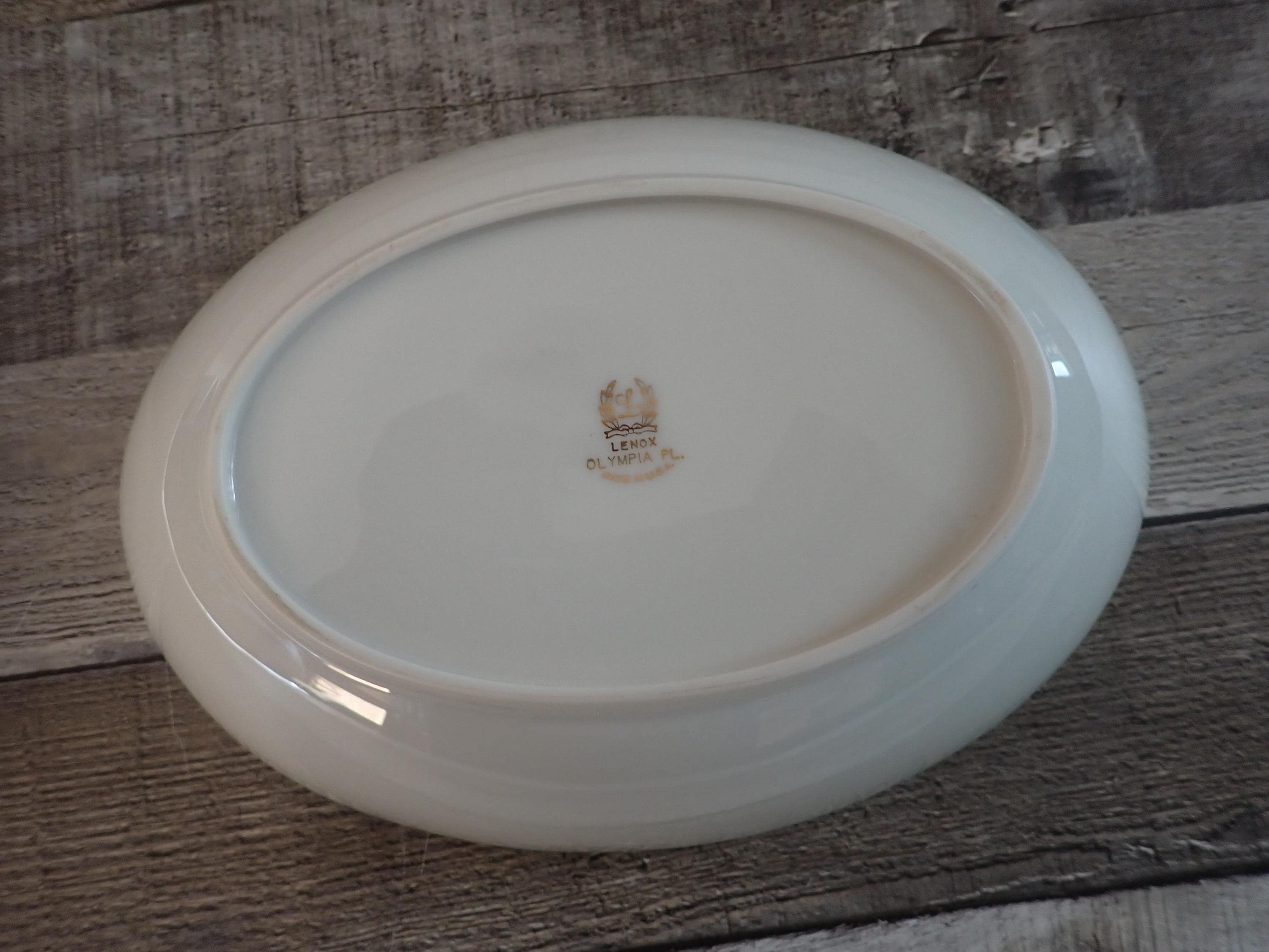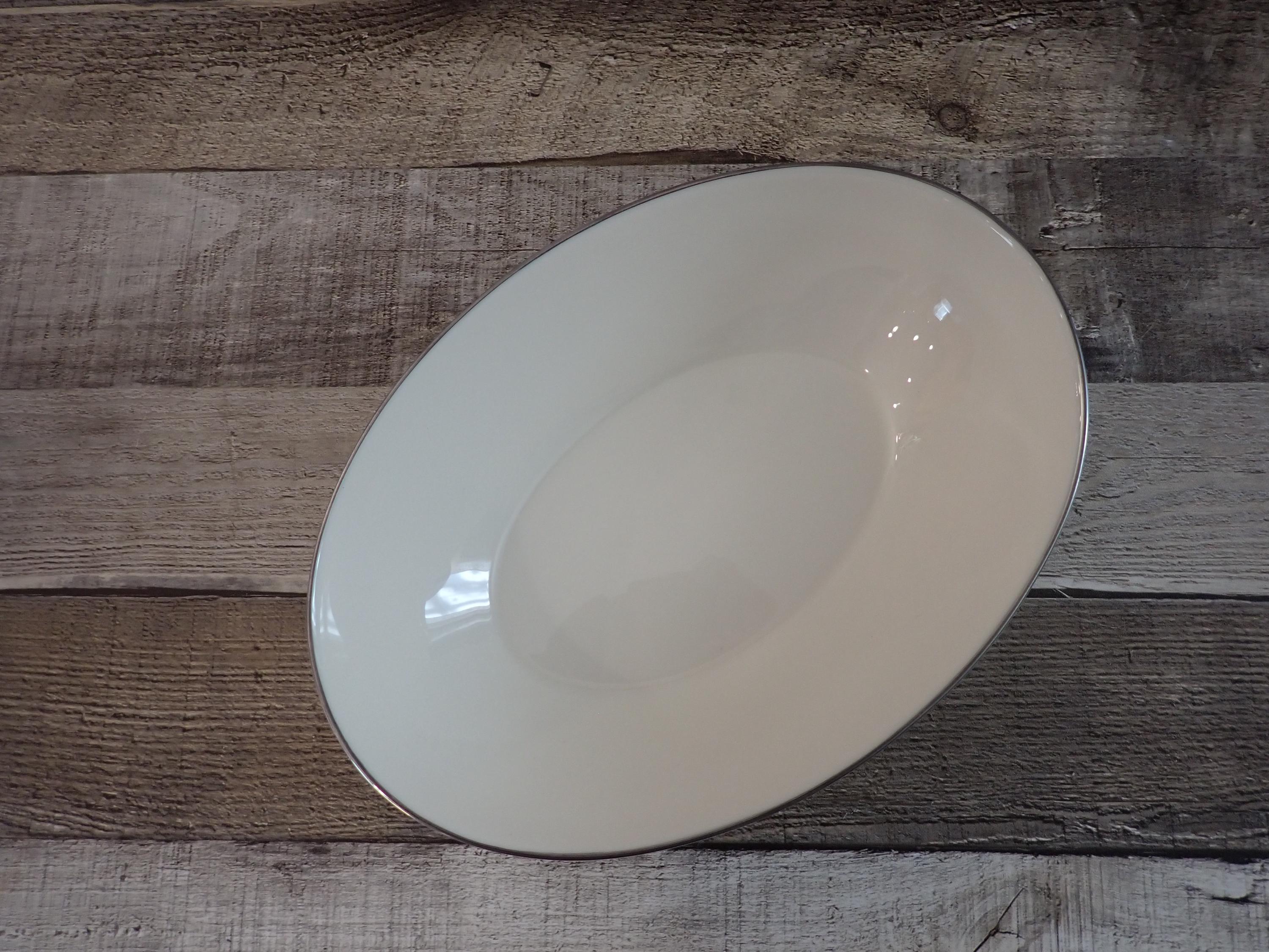 This vegetable bowl by Lenox is in the Olympia Platinum pattern and is the 9" Oval Vegetable Bowl. The bowl is 9.75" long, 7" wide, and 2.5" high. It is an ivory colored ceramic, and has a band a silver around the rim. The bottom is marked: LENOX / OLYMPIA PL. / MADE IN USA. The bowl is in very good condition with no chips or cracks. The silver band around the rim is intact.